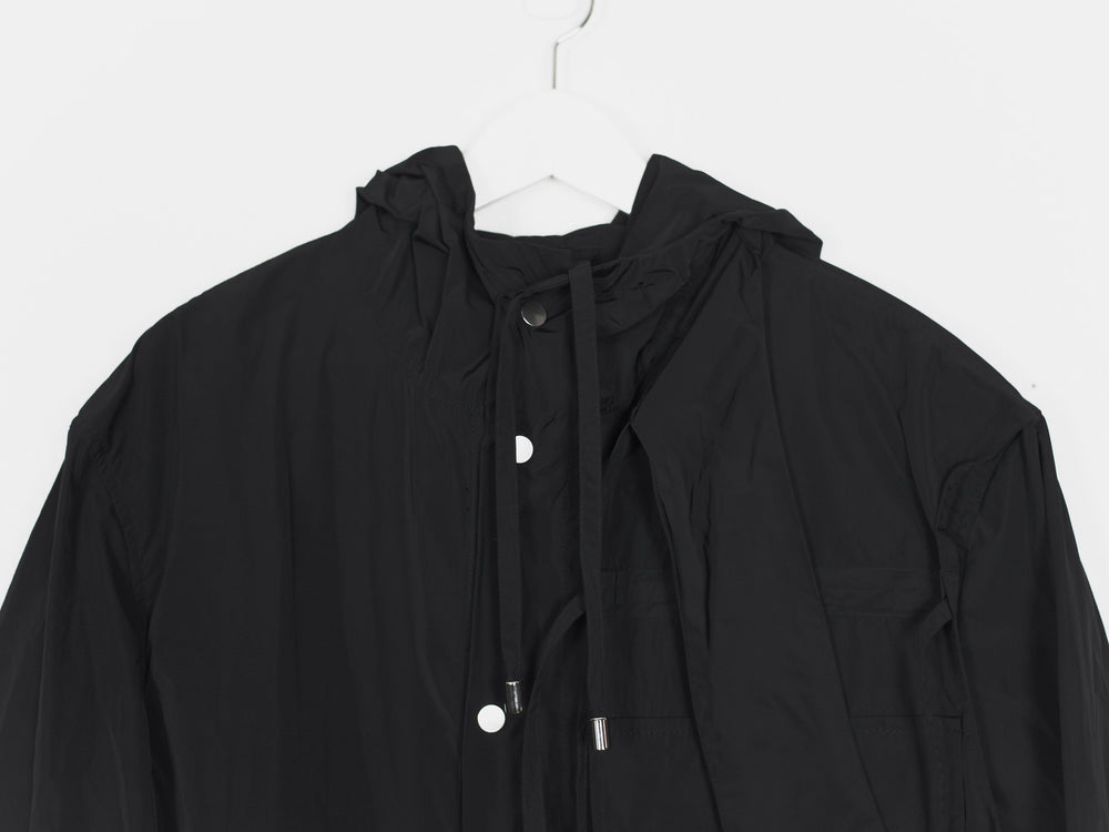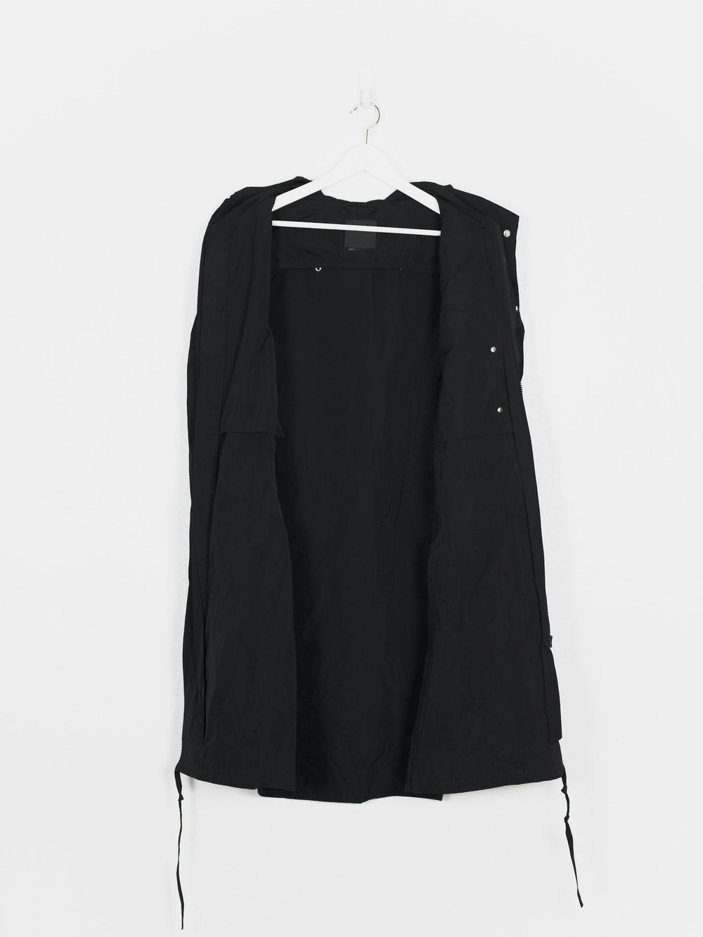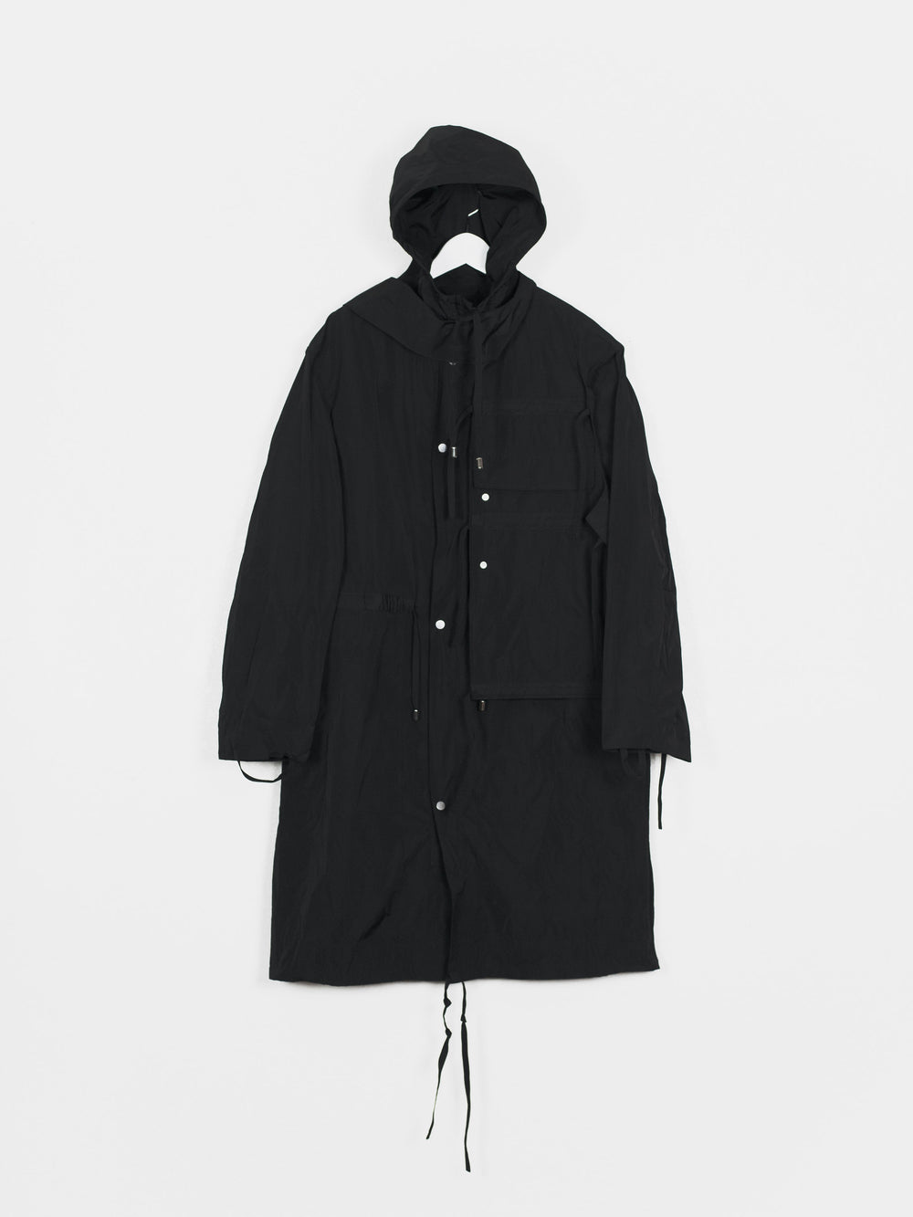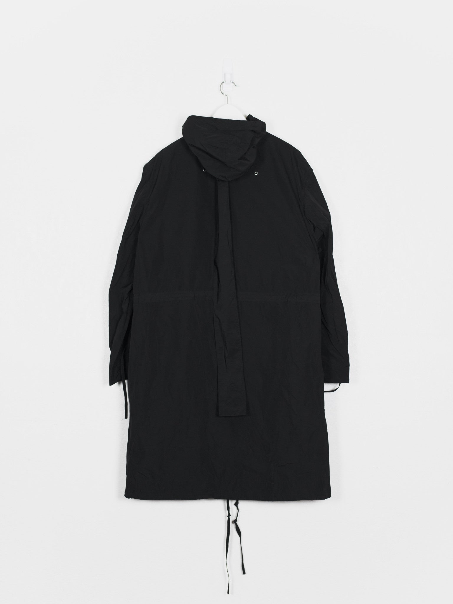 A warm weather long coat from Craig Green in a crinkled and slightly shiny black 100% polyester that he titles 'Sport Black.' This one is cut below the knee and comes equipped with cuff straps, substantial silver hardware that breaks up the fully black coat, and a hood with a thick ribbon that wraps around and can be tied as a scarf. Built into the body on the left side is a levitating front panel that features an oversized zippered top-entry drop in pocket that can be scrunched and tied with Craig Green's signature strings that run through channels at the top and bottom.