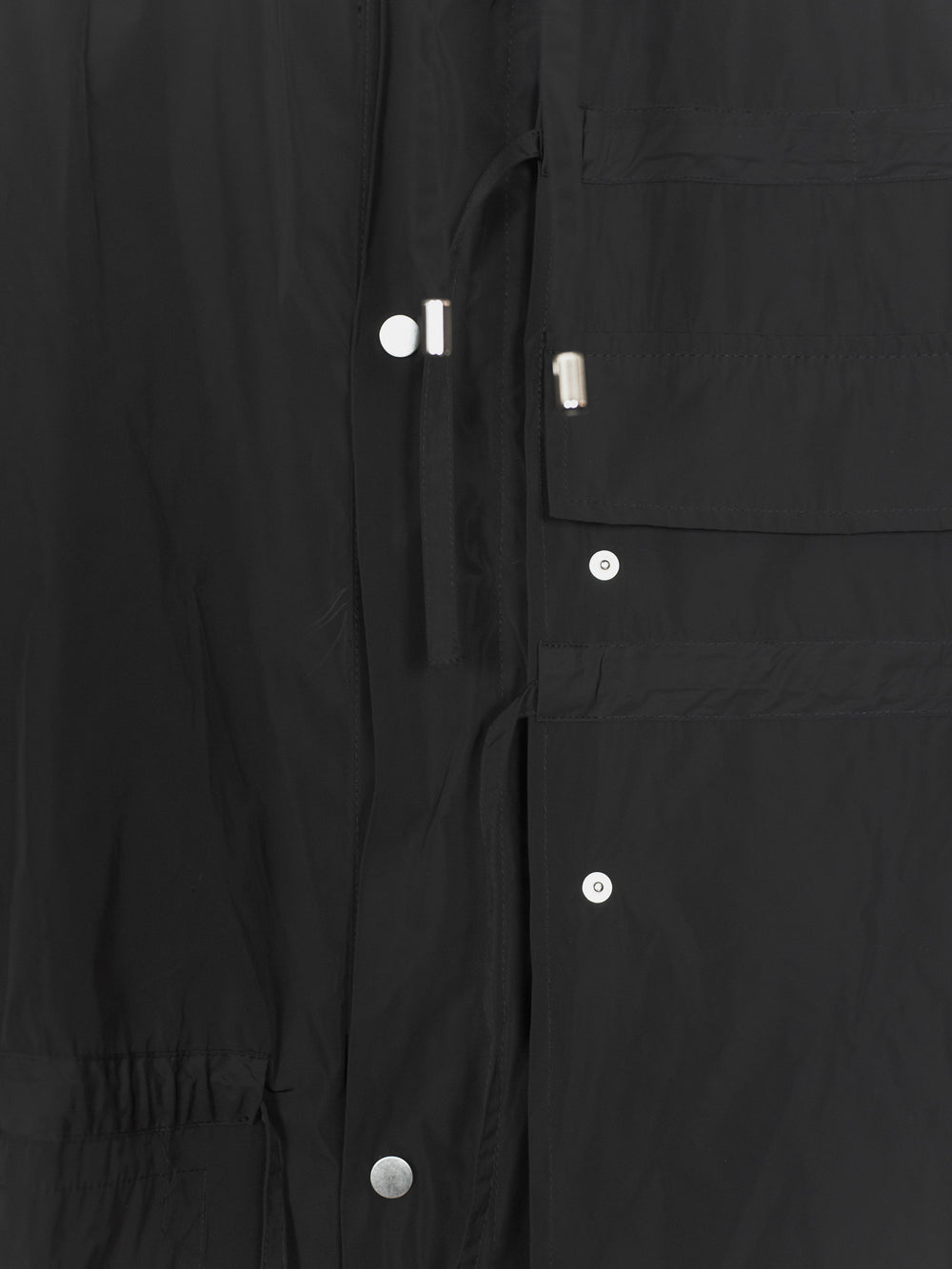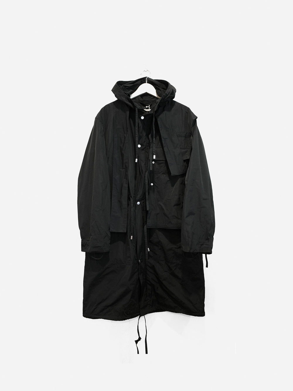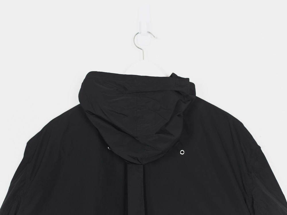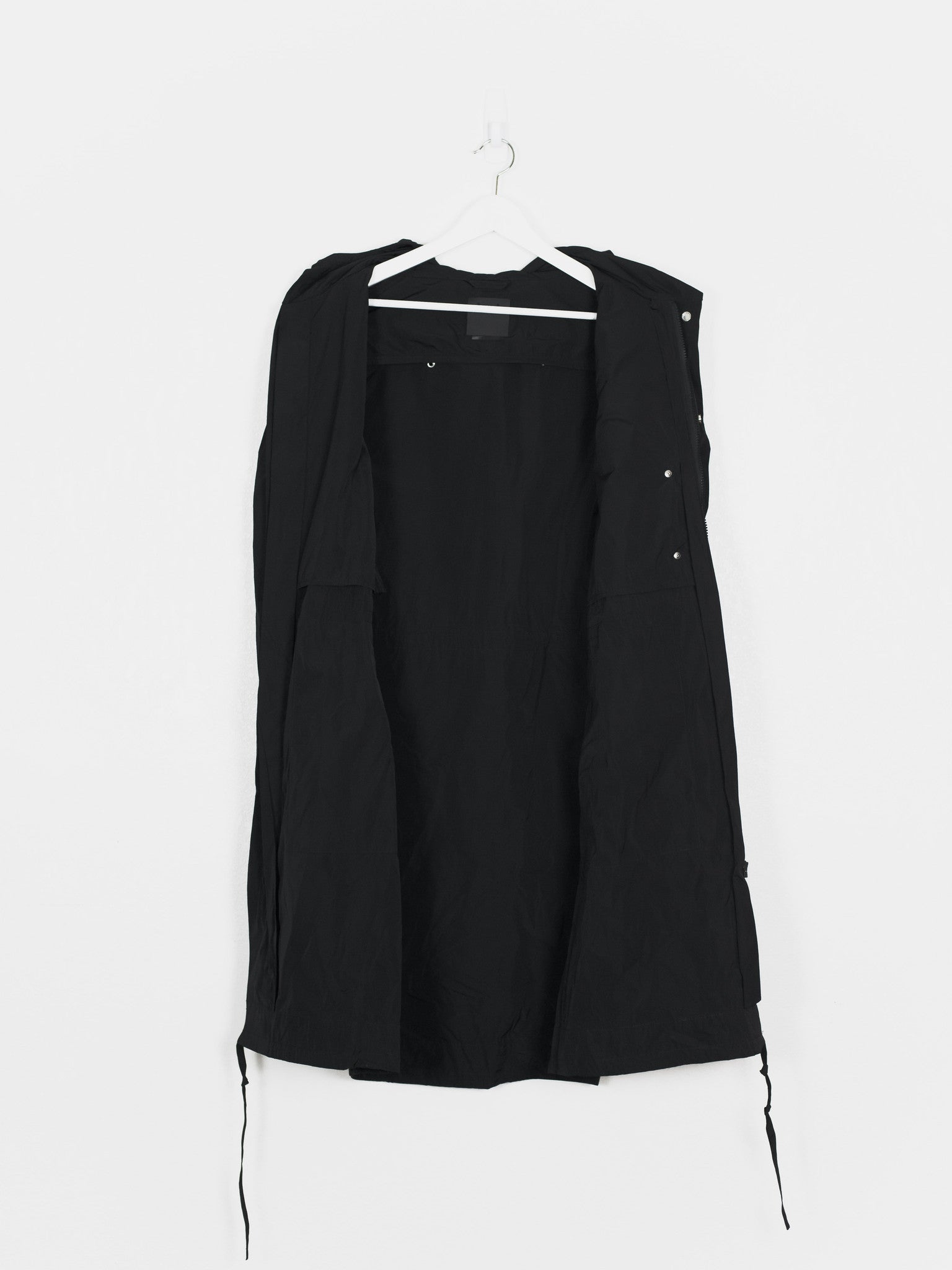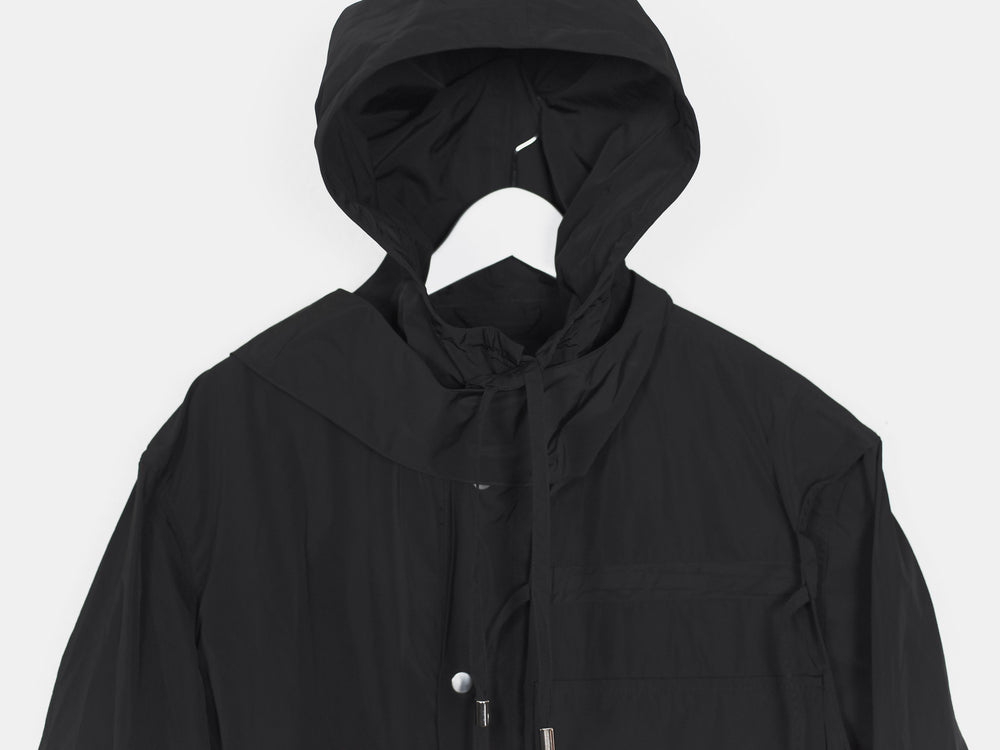 A warm weather long coat from Craig Green in a crinkled and slightly shiny black 100% polyester that he titles 'Sport Black.' This one is cut below the knee and comes equipped with cuff straps, substantial silver hardware that breaks up the fully black coat, and a hood with a thick ribbon that wraps around and can be tied as a scarf. Built into the body on the left side is a levitating front panel that features an oversized zippered top-entry drop in pocket that can be scrunched and tied with Craig Green's signature strings that run through channels at the top and bottom.