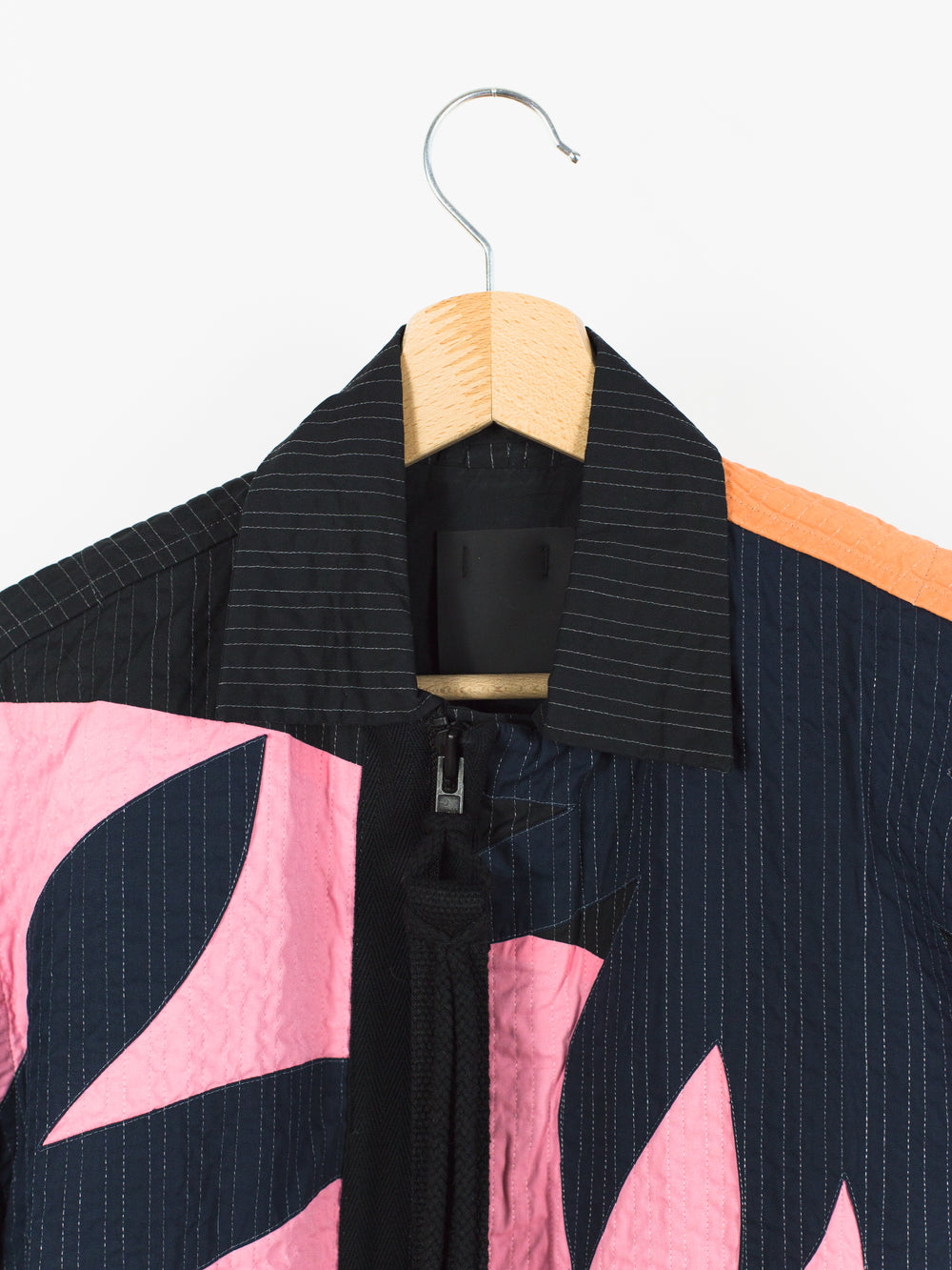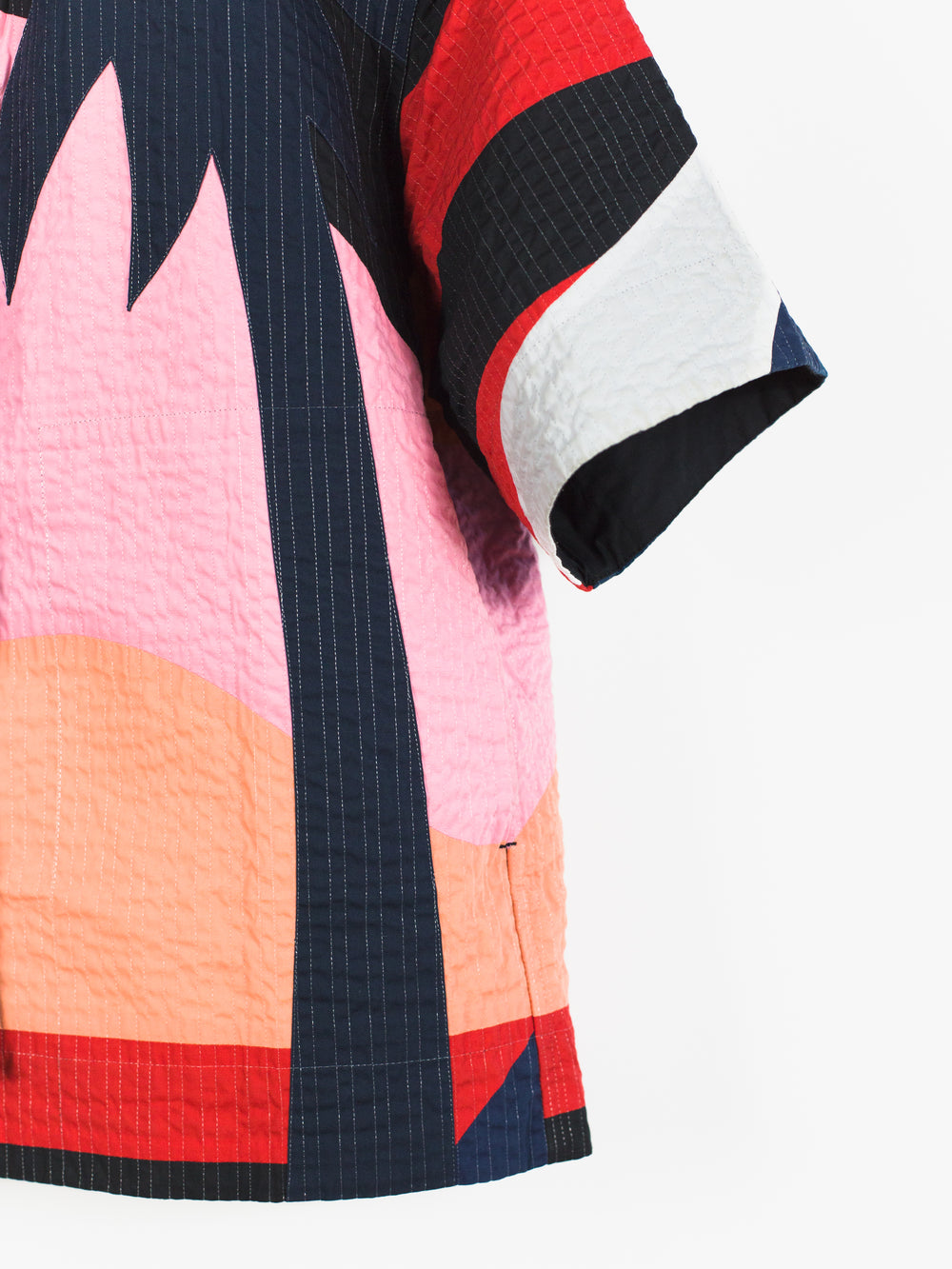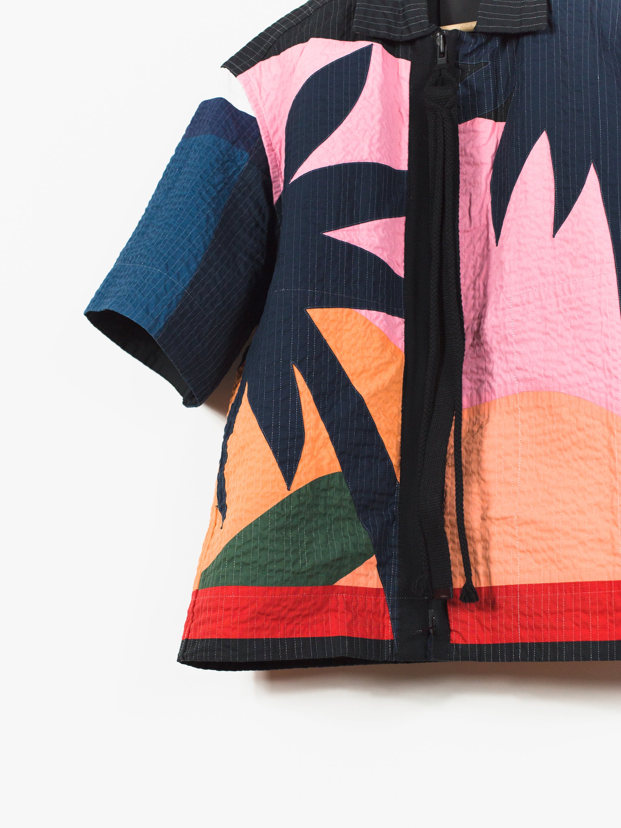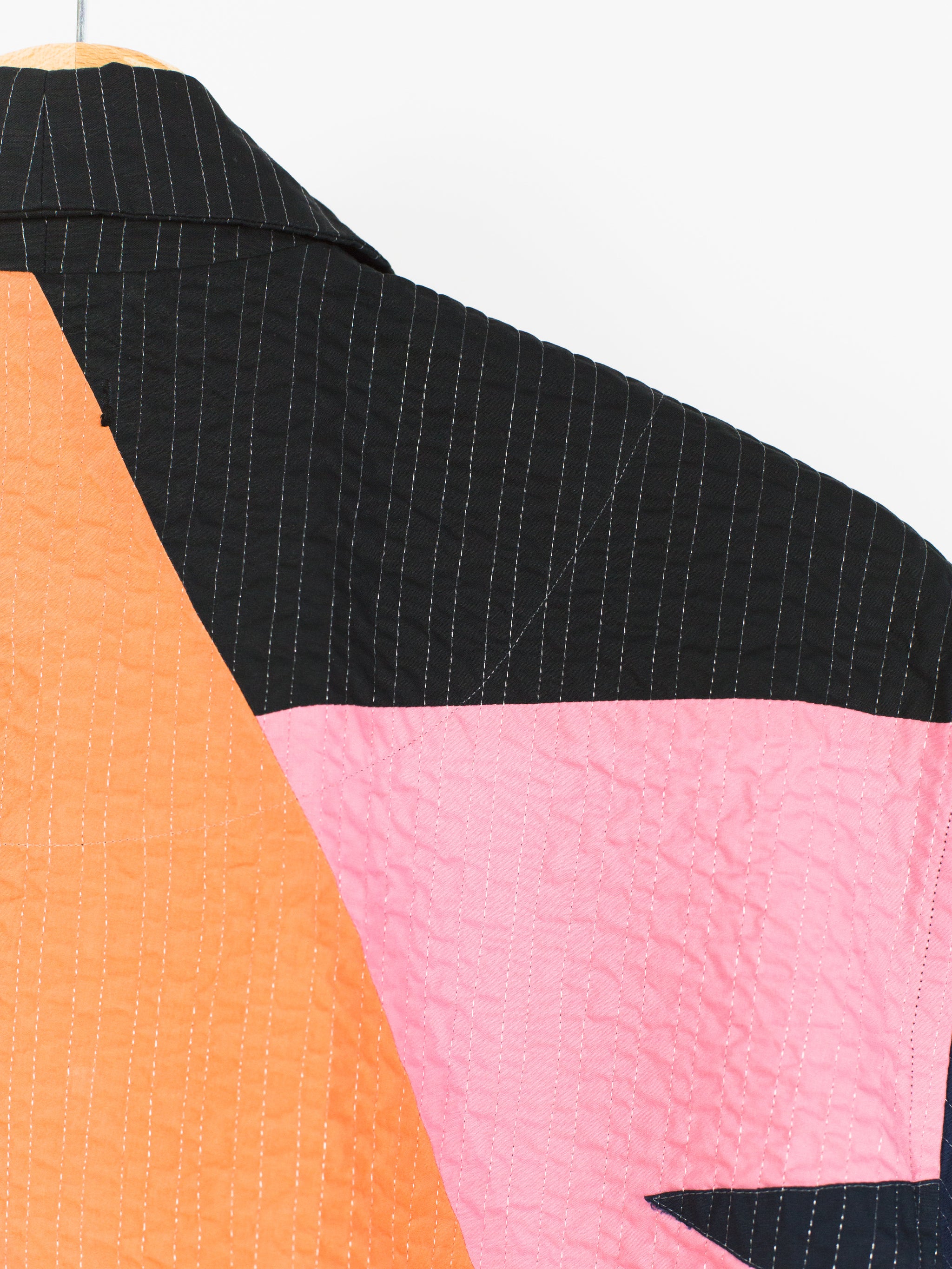 Playful and irreverent as always, Craig Green reinvents traditional summer shirting with this Holiday Shirt. Well, it's labelled as a shirt but it actually has all the makings of a jacket. It's got a chunky center front zip closure, two-layer face fabric, fully constructed facing, and some serious heft, crispness, and structure. With all these qualities and a boxy, casual short sleeve shape, it sits in a novel medium with some excellent uses. Throw it on unzipped as a quick cover-up or use its structure to style it over something with longer sleeves. It captures the ease of a summer shirt but lends all the security and utility of a jacket. The fabrication is immaculate as well. Bright graphic color panels are grafted onto a black cotton backing with dense columns of shiny silver topstitch. Intensely intricate and eye-catching from both far away and close up, the shirt is filled with color, texture, and detail. The high contrast diagonal composition (which has found its way into an IKEA rug collaboration) lends a real dynamism to the piece on both the front and the back. You'll never get bored looking at this shirt. It's finished with two hidden-entry side pockets, an inner zipper pocket built into the facing, bound or felled seams on the interior, and an extra long combination strap + rope zipper pull.