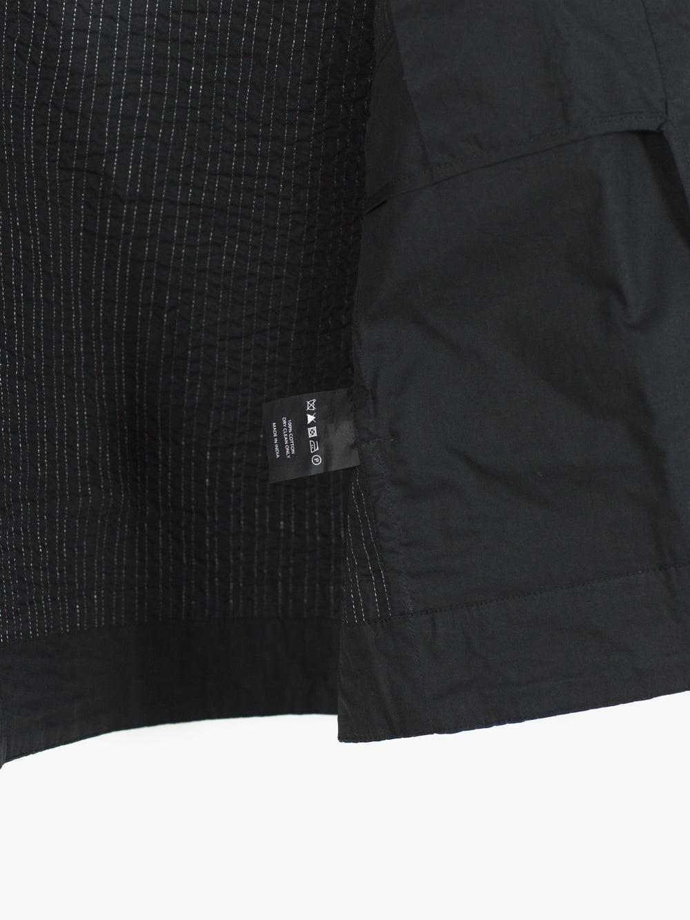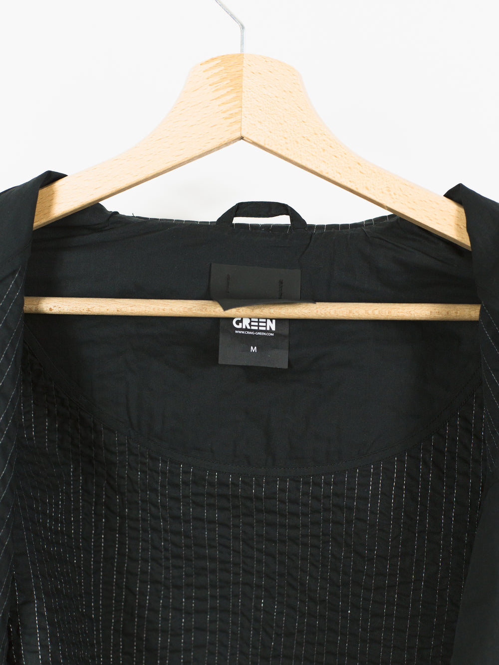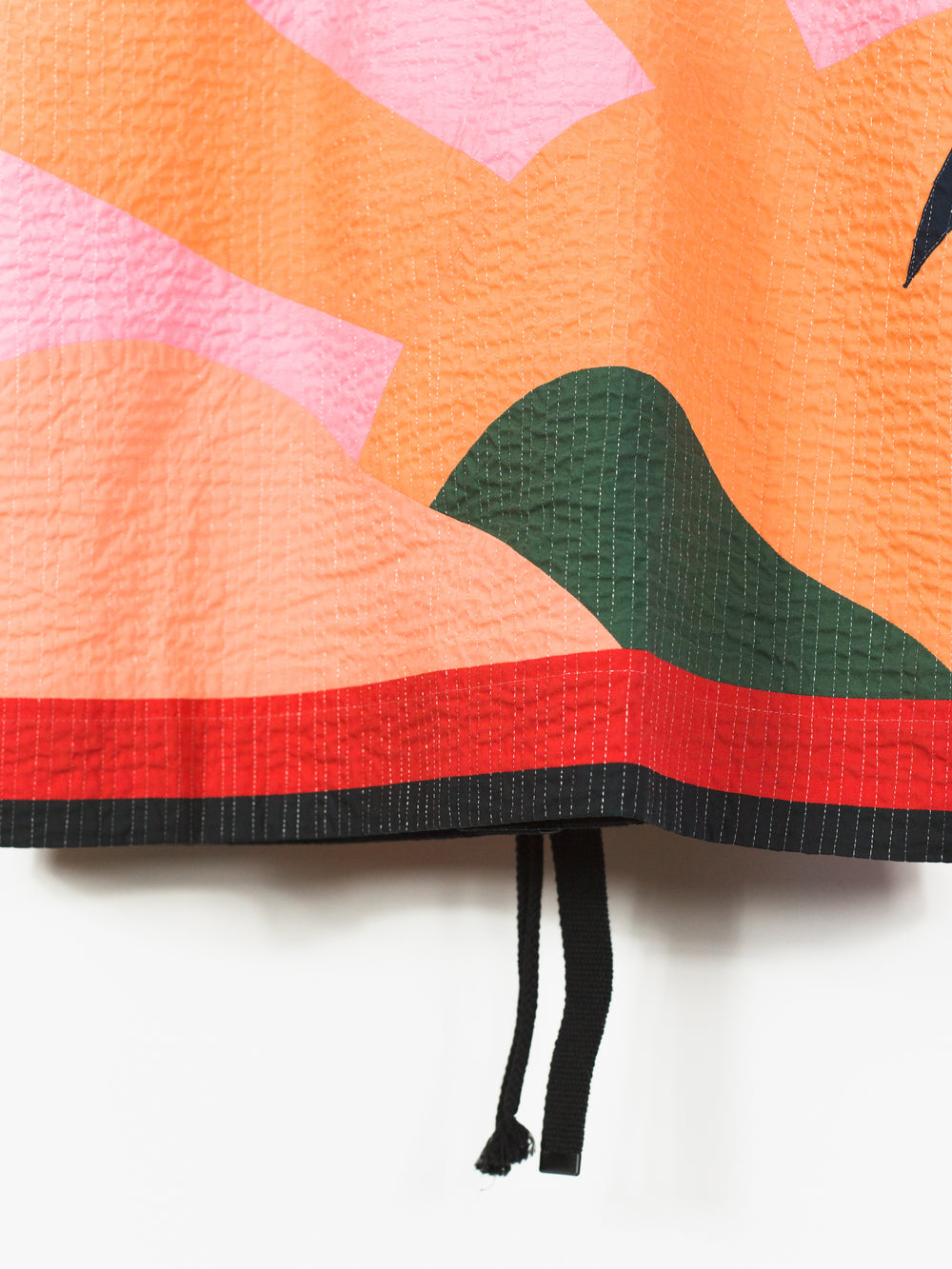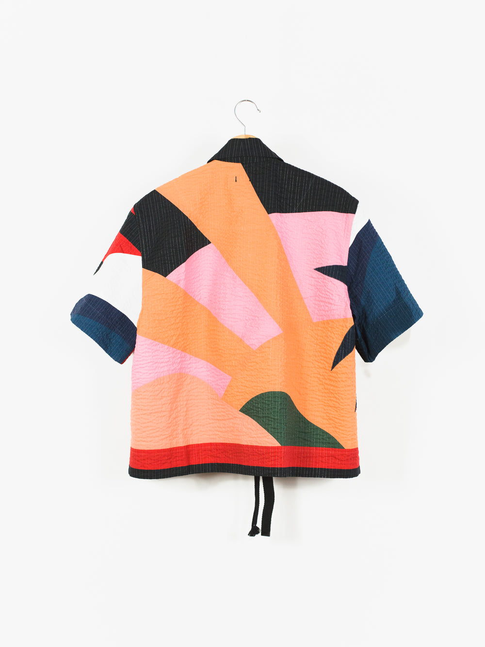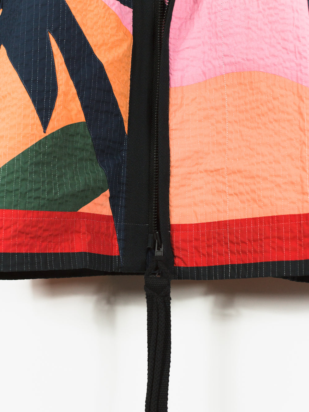 Playful and irreverent as always, Craig Green reinvents traditional summer shirting with this Holiday Shirt. Well, it's labelled as a shirt but it actually has all the makings of a jacket. It's got a chunky center front zip closure, two-layer face fabric, fully constructed facing, and some serious heft, crispness, and structure. With all these qualities and a boxy, casual short sleeve shape, it sits in a novel medium with some excellent uses. Throw it on unzipped as a quick cover-up or use its structure to style it over something with longer sleeves. It captures the ease of a summer shirt but lends all the security and utility of a jacket. The fabrication is immaculate as well. Bright graphic color panels are grafted onto a black cotton backing with dense columns of shiny silver topstitch. Intensely intricate and eye-catching from both far away and close up, the shirt is filled with color, texture, and detail. The high contrast diagonal composition (which has found its way into an IKEA rug collaboration) lends a real dynamism to the piece on both the front and the back. You'll never get bored looking at this shirt. It's finished with two hidden-entry side pockets, an inner zipper pocket built into the facing, bound or felled seams on the interior, and an extra long combination strap + rope zipper pull.