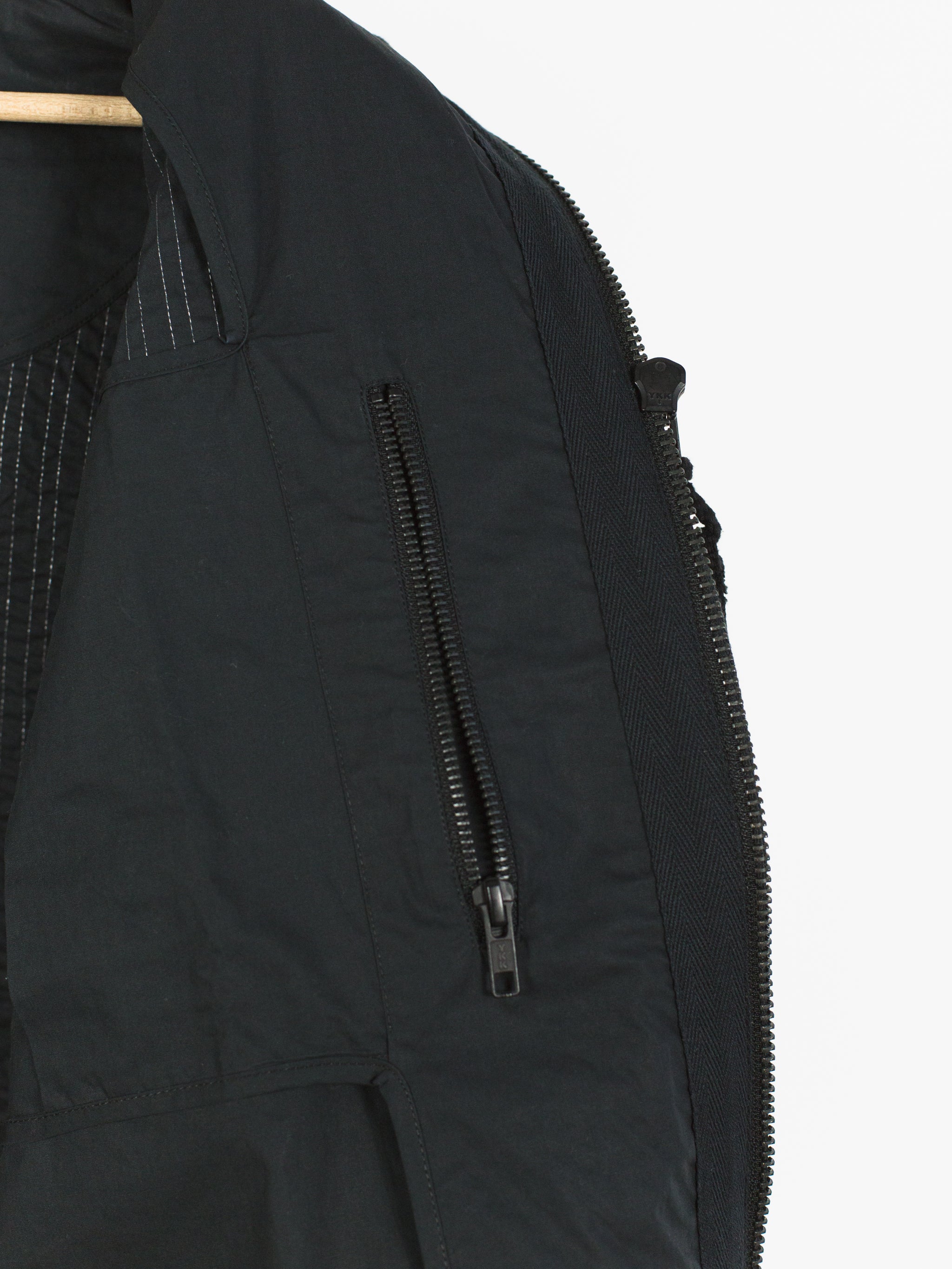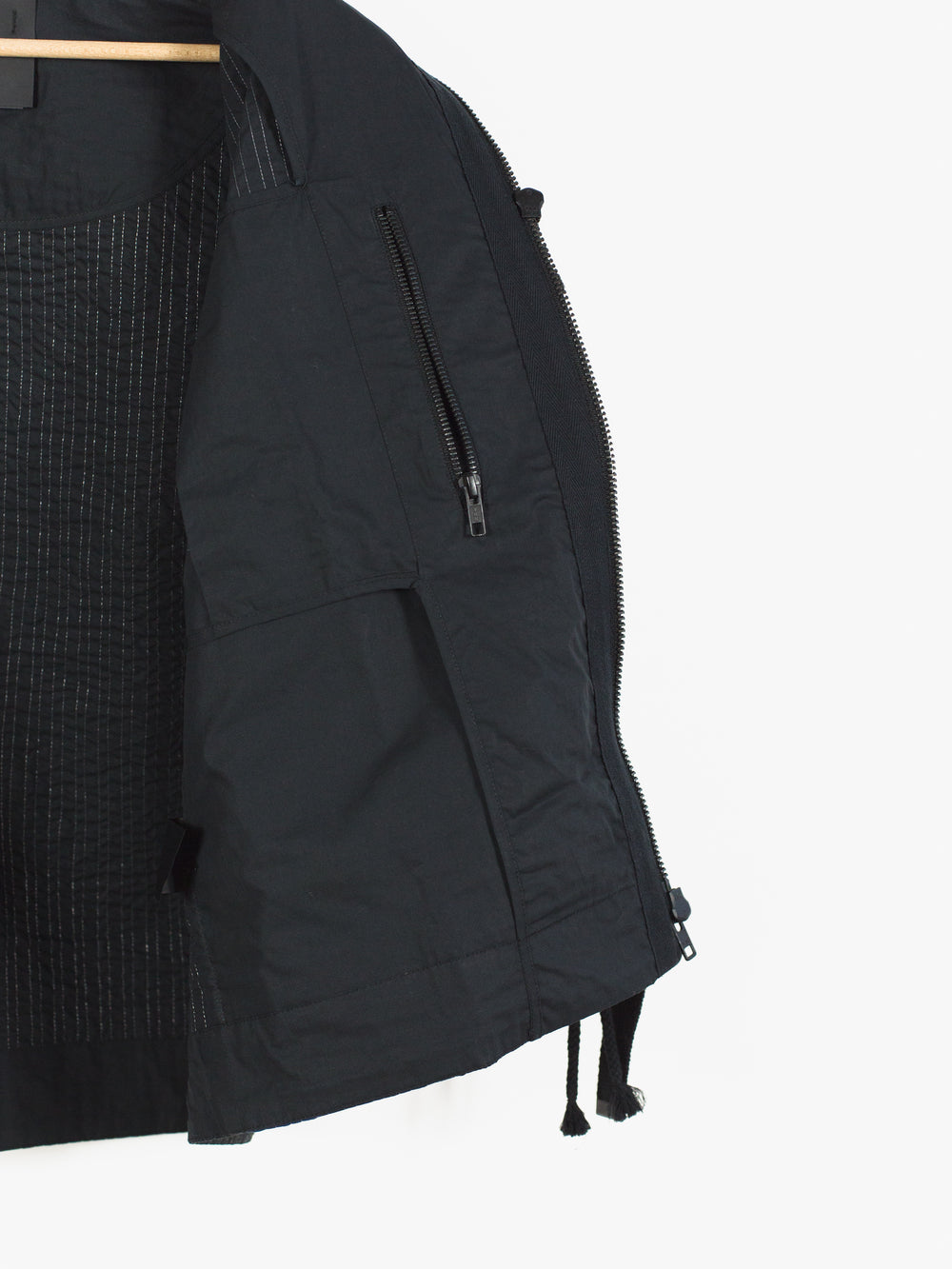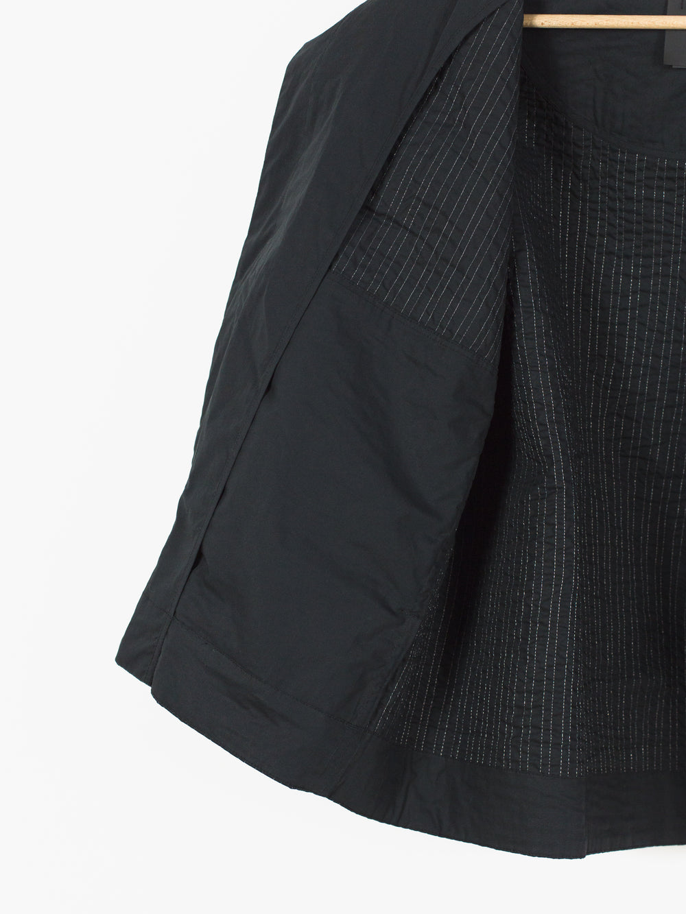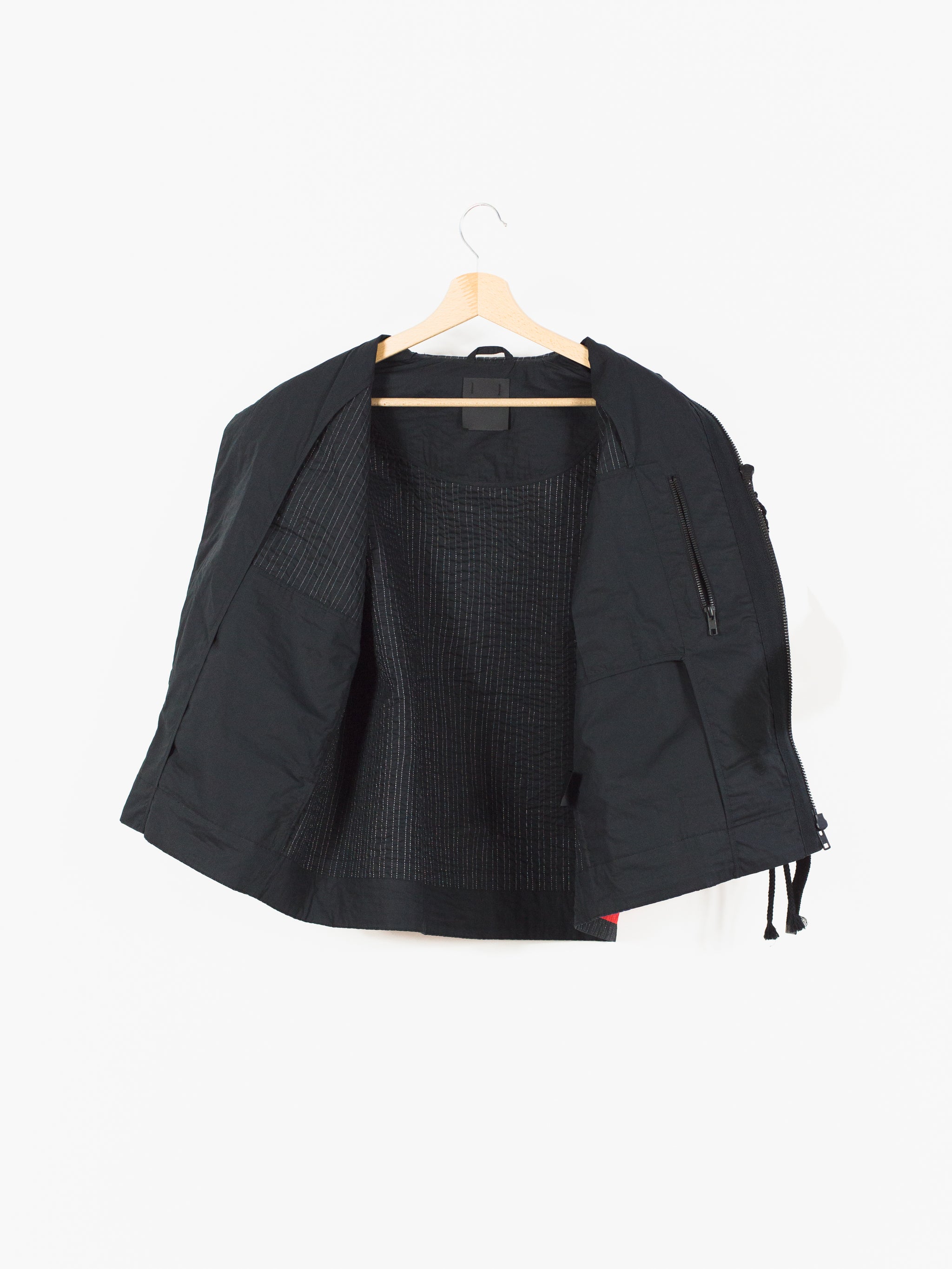 Playful and irreverent as always, Craig Green reinvents traditional summer shirting with this Holiday Shirt. Well, it's labelled as a shirt but it actually has all the makings of a jacket. It's got a chunky center front zip closure, two-layer face fabric, fully constructed facing, and some serious heft, crispness, and structure. With all these qualities and a boxy, casual short sleeve shape, it sits in a novel medium with some excellent uses. Throw it on unzipped as a quick cover-up or use its structure to style it over something with longer sleeves. It captures the ease of a summer shirt but lends all the security and utility of a jacket. The fabrication is immaculate as well. Bright graphic color panels are grafted onto a black cotton backing with dense columns of shiny silver topstitch. Intensely intricate and eye-catching from both far away and close up, the shirt is filled with color, texture, and detail. The high contrast diagonal composition (which has found its way into an IKEA rug collaboration) lends a real dynamism to the piece on both the front and the back. You'll never get bored looking at this shirt. It's finished with two hidden-entry side pockets, an inner zipper pocket built into the facing, bound or felled seams on the interior, and an extra long combination strap + rope zipper pull.