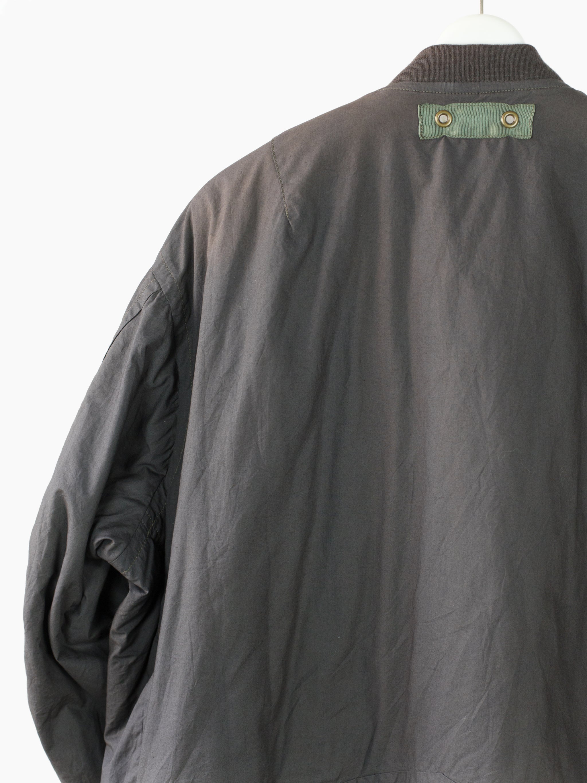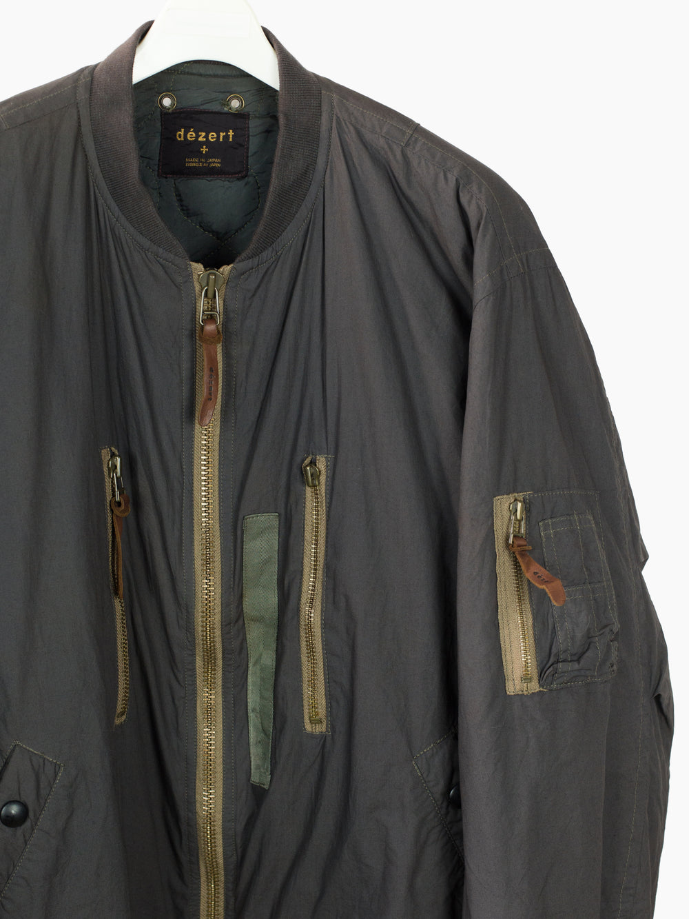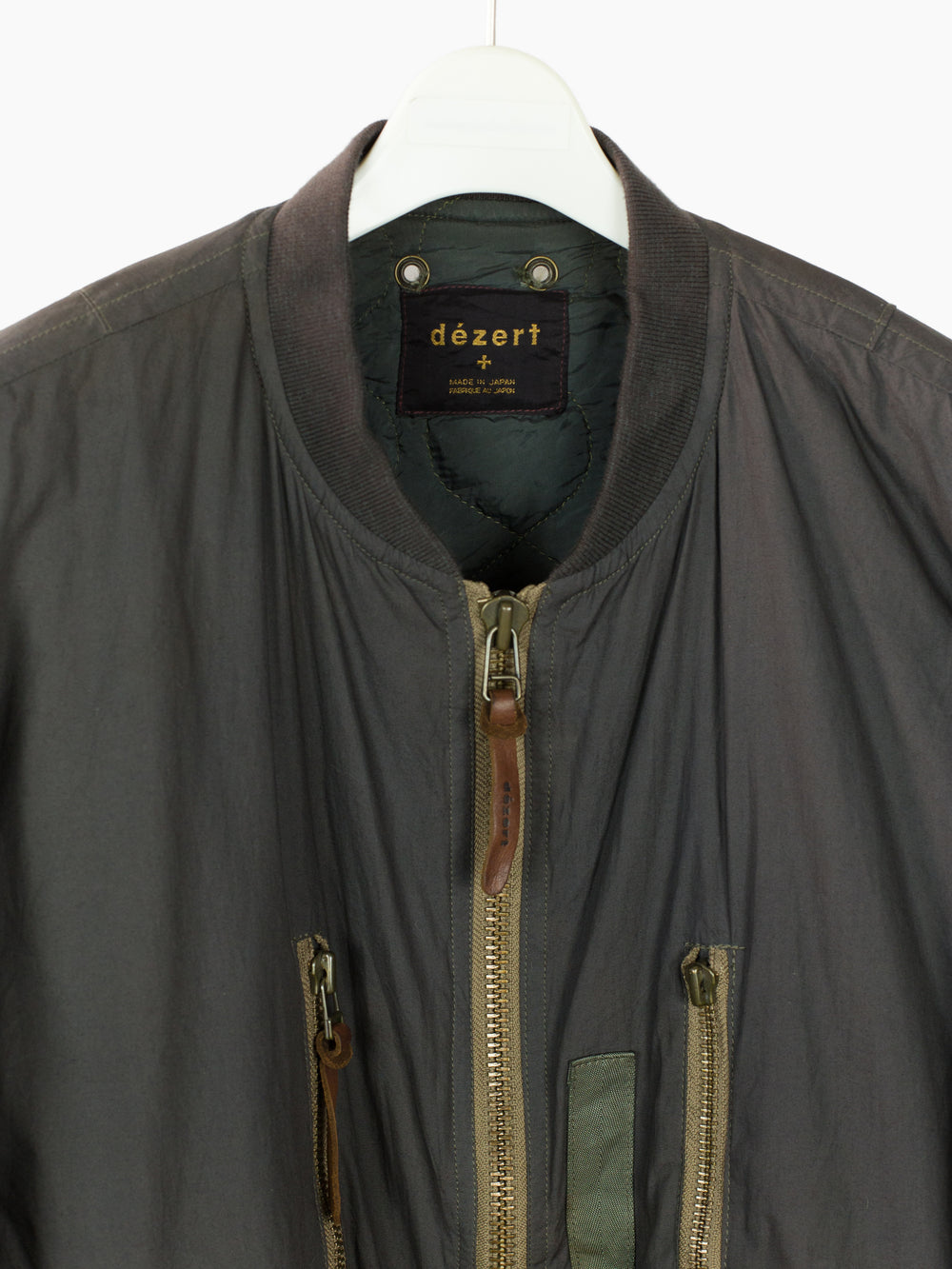 Hybrid bomber from 80s/90s Japanese menswear brand Dézert, featuring the typical bomber details like center front zip closure, rib collar, and left bicep pocket, combined with other archetypical menswear details such as pleated articulated sleeves, biker-jacket style cuffs and back waist yoke. At center front are two statement vertically zippered Napoleon chest pockets that form an artful graphic composition in tandem with the elongated bomber nylon webbing and center zip. The entire garment is executed in a bouncy and crisp cotton poplin with extremely lightweight quilted interior lining. The material package creates the perfect balance of warmth and lightness.
