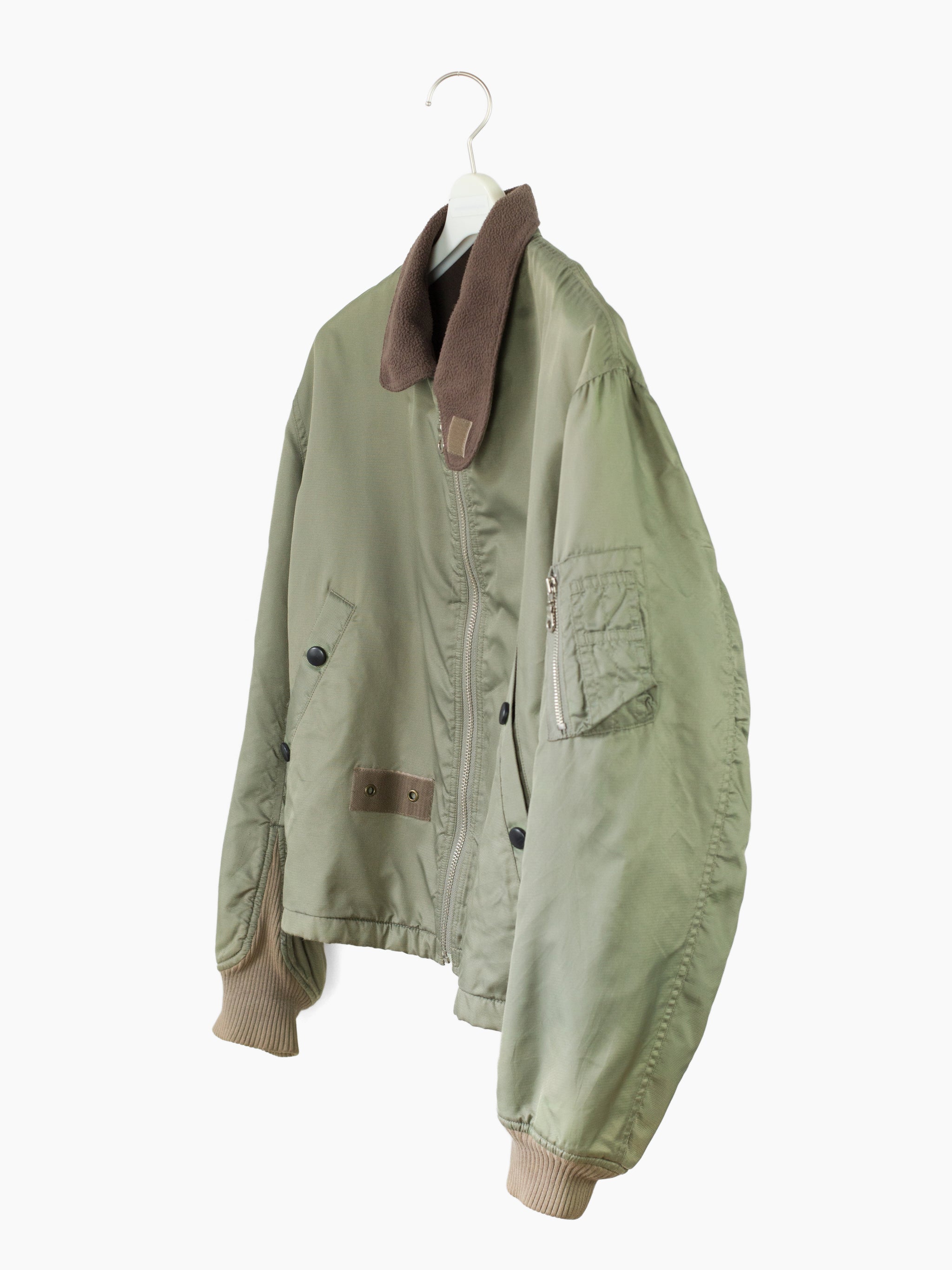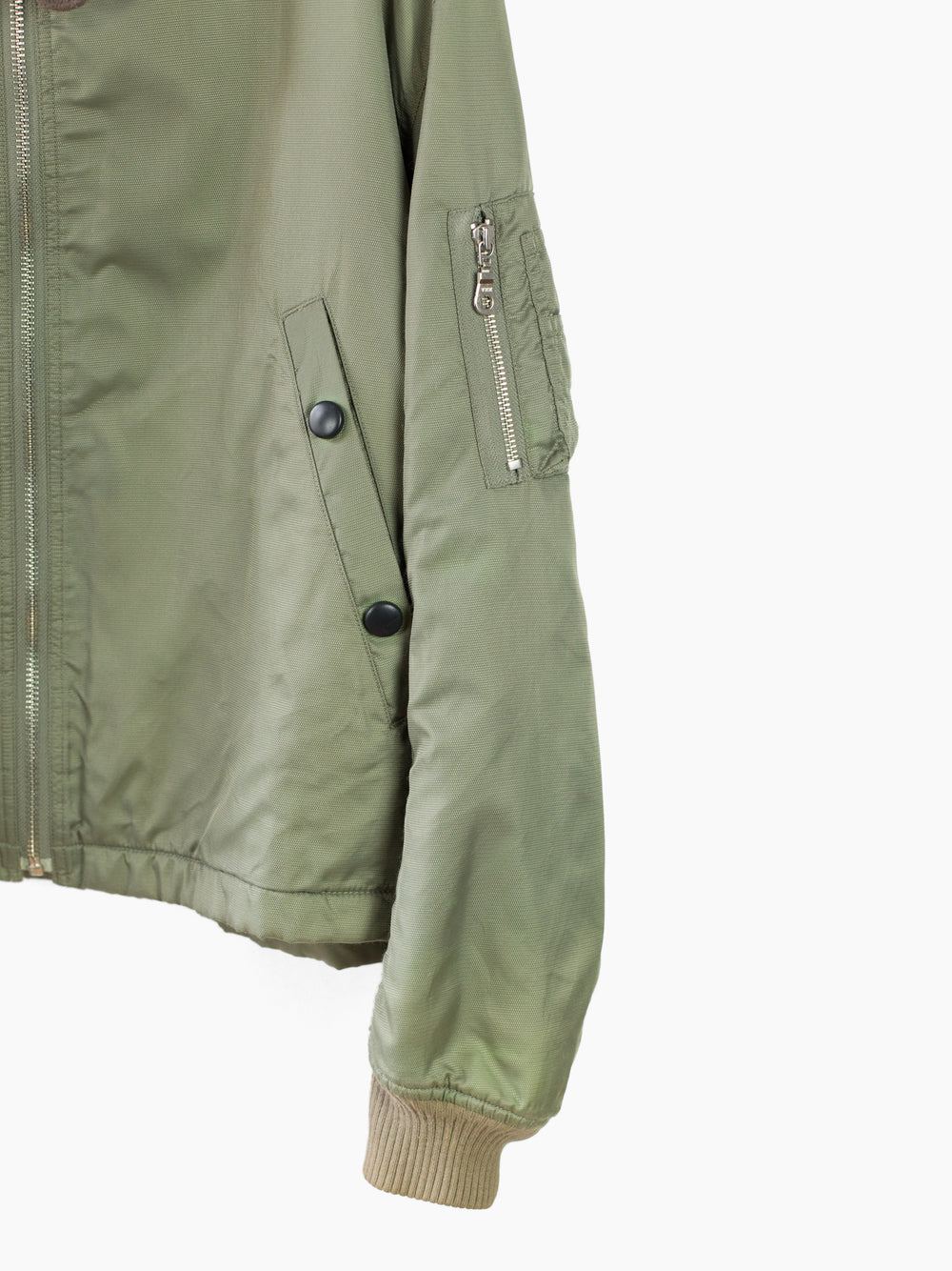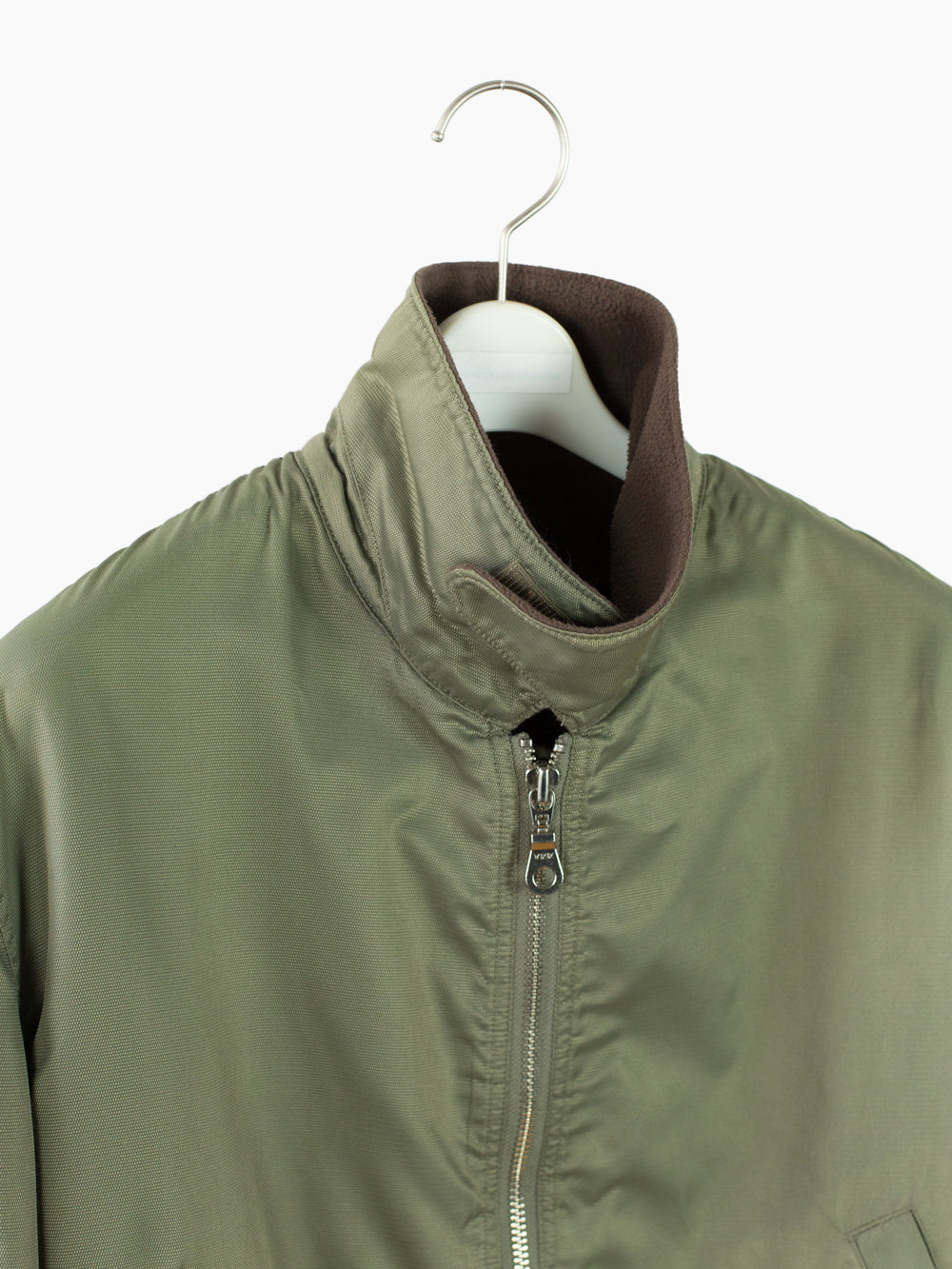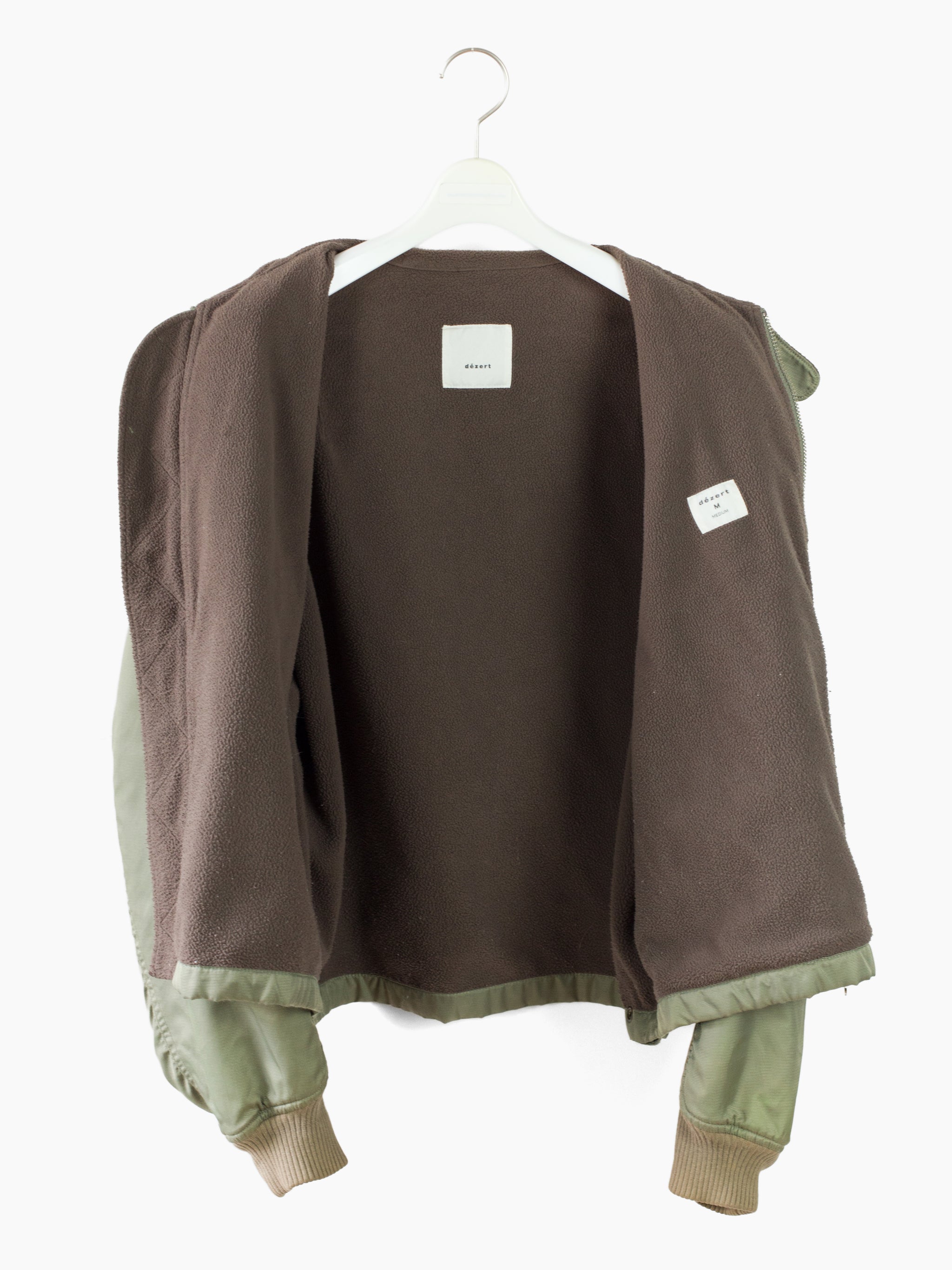 This bomber from 80s/90s Japanese menswear brand Dézert features a cropped, boxy cut through the body and sleek 2-piece sleeves for a contemporary take on a military staple. The jacket rearranges classic military detailing into a modern configuration, with MA-1 sleeve pocket, shifted MA-1 eyelet panel at the waist, and inset rib cuffs with articulated construction around the wrist. The piece is fully lined in lightweight fleece for perfect spring/fall coziness and is cut with convertible collar that alternates between asymmetrical club collar and high-neck styling. The jacket is finished with two snap-closed waist pockets, silver-toned chunky center zip closure, and two back waist adjusters that bring in the hem for more of a blouson shape if desired.