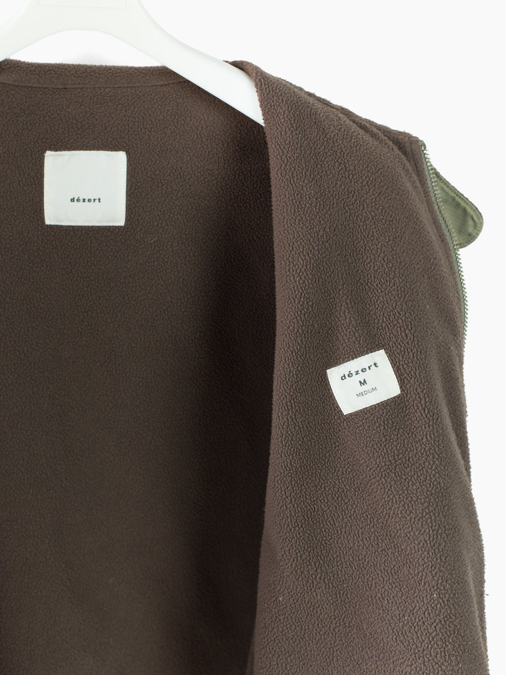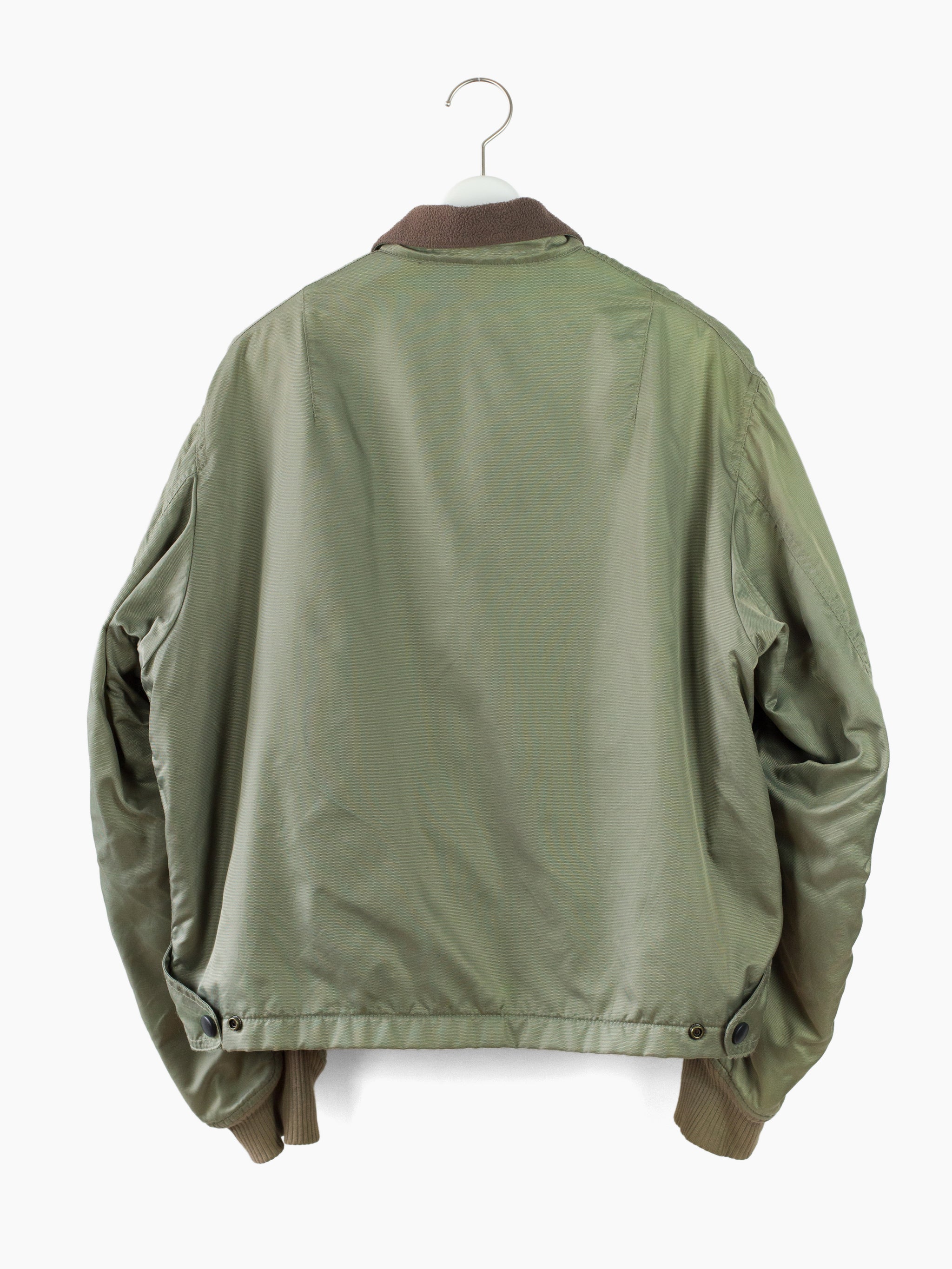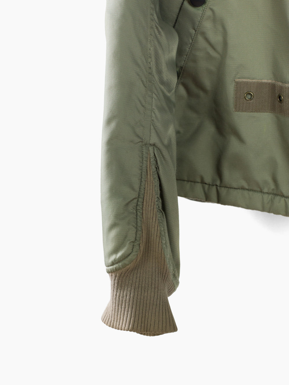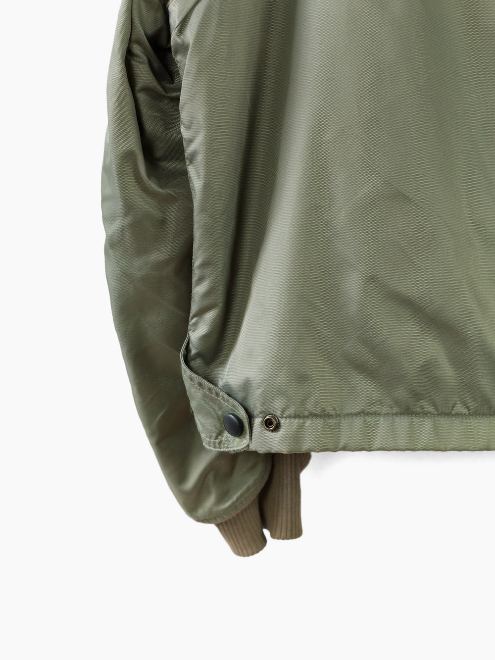This bomber from 80s/90s Japanese menswear brand Dézert features a cropped, boxy cut through the body and sleek 2-piece sleeves for a contemporary take on a military staple. The jacket rearranges classic military detailing into a modern configuration, with MA-1 sleeve pocket, shifted MA-1 eyelet panel at the waist, and inset rib cuffs with articulated construction around the wrist. The piece is fully lined in lightweight fleece for perfect spring/fall coziness and is cut with convertible collar that alternates between asymmetrical club collar and high-neck styling. The jacket is finished with two snap-closed waist pockets, silver-toned chunky center zip closure, and two back waist adjusters that bring in the hem for more of a blouson shape if desired.