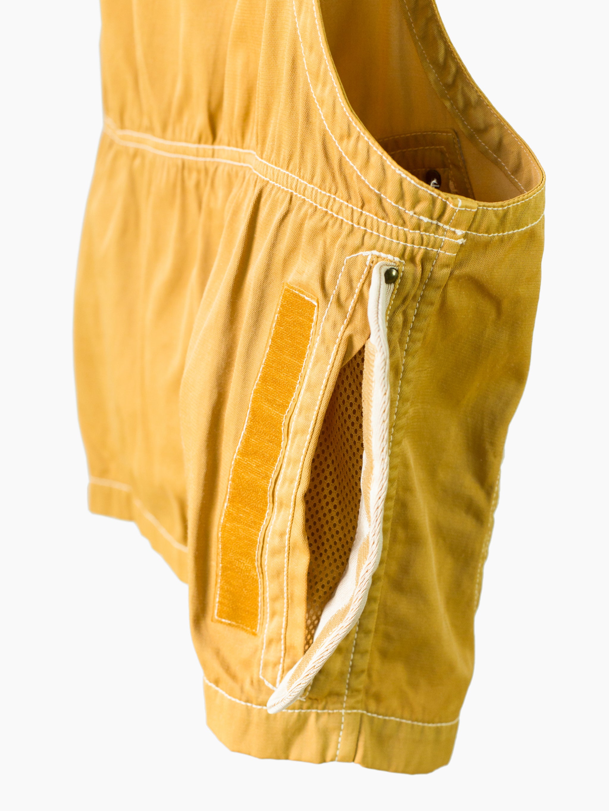 Military cargo vest from Japanese menswear brand Dézert. Cut from soft supple cotton blend face fabric with rayon blend beige contrast panels. Features angled top and side entry pockets layered atop one another for a total of 4 different compartments on the front body. Back features double sided velcro-flap-closed entry to a voluminous mesh-lined compartment near the hem. Finished with partial mesh lining, and center zip + snap front closure.