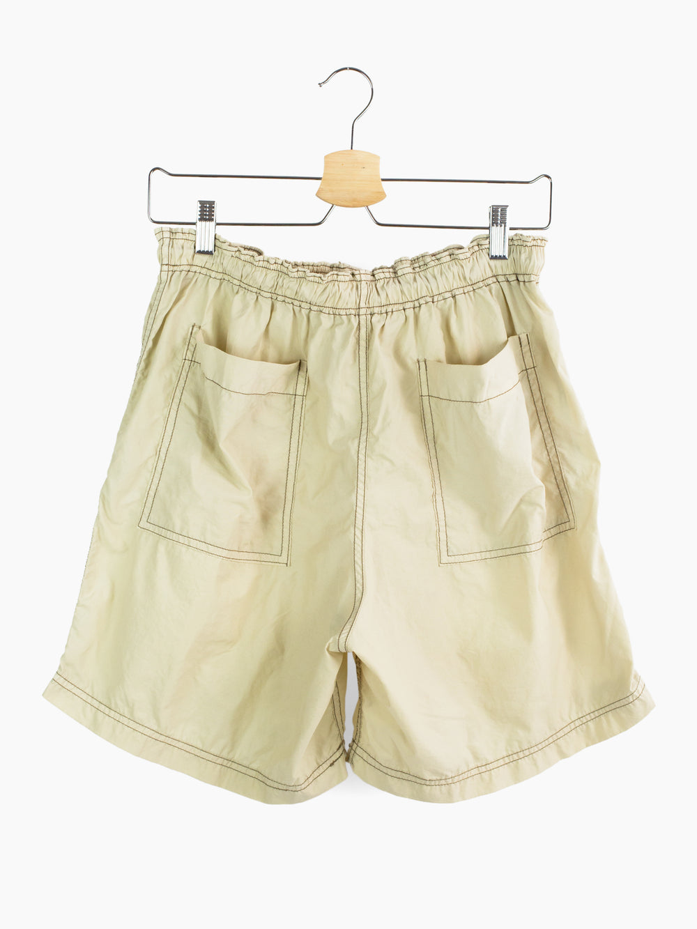 Simple everyday cream nylon shorts from Dezert, incredibly wearable and flexible, cut in a semitranslucent nylon that brings an ephemeral, airy quality. Elastic drawcord waist expands or ties down to fit a range of body shapes and sizes, with 4 pockets providing plenty of storage space.