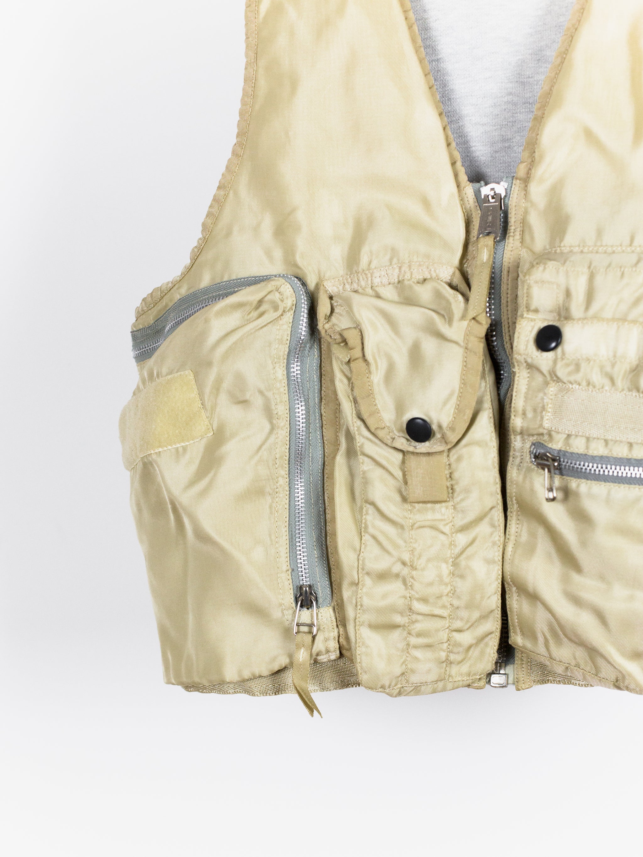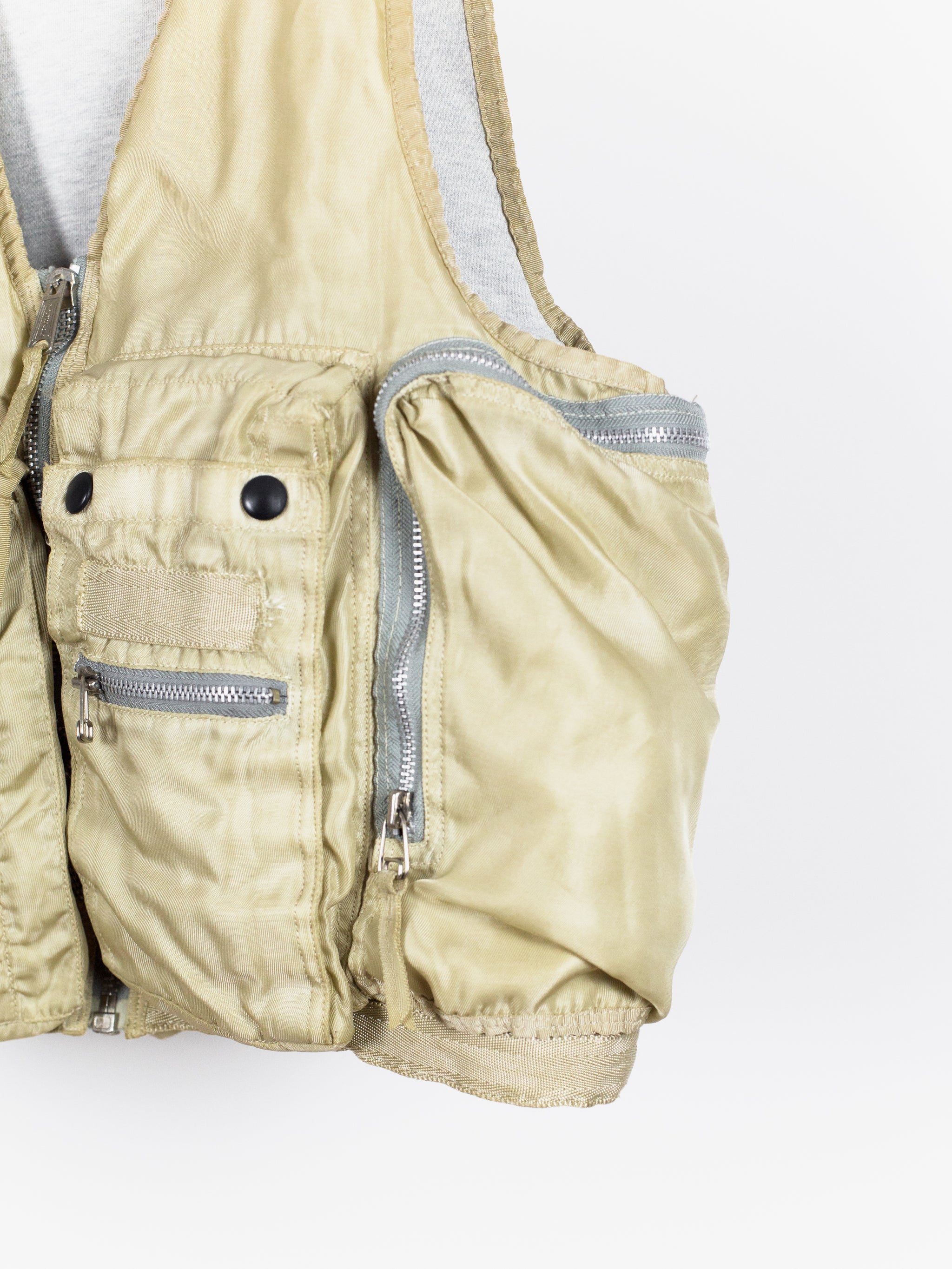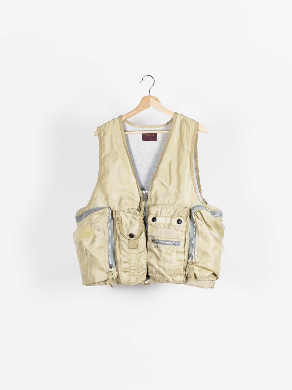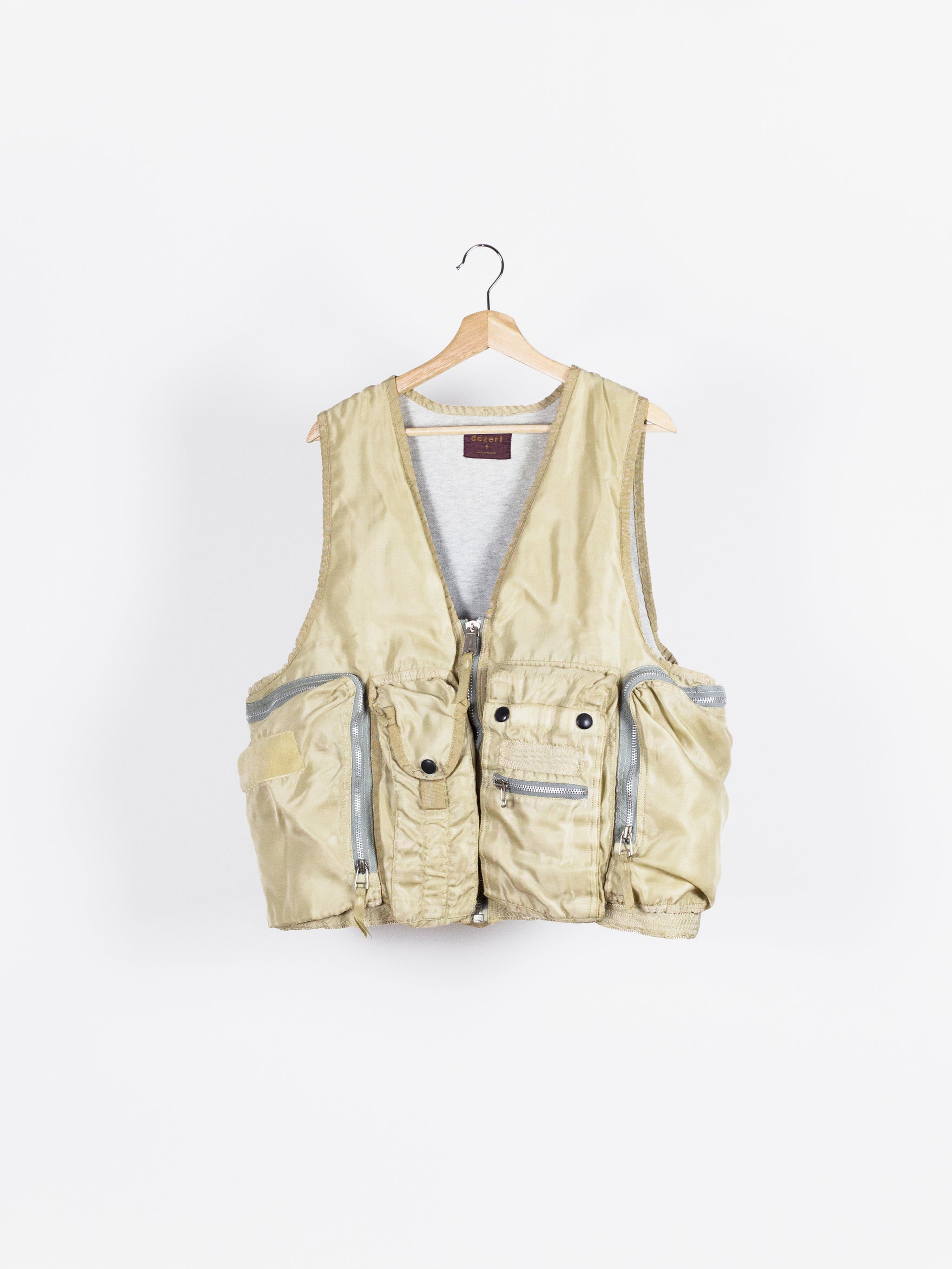 Amazing utilitarian fishing vest from Dézert, an 80s-90s era label run by ex-Comme des Garcons Homme patternmaker Shigehiko Taguchi. Smooth, drapey, gold nylon exterior and jersey sweat interior, this vest is reversible thanks to the double-sided zipper. Features 360 degree 3D pocketing around the waist and 90 degree top-and-side opening lateral pockets. Wear it layered over outerwear to add dimension or simply over a t-shirt.