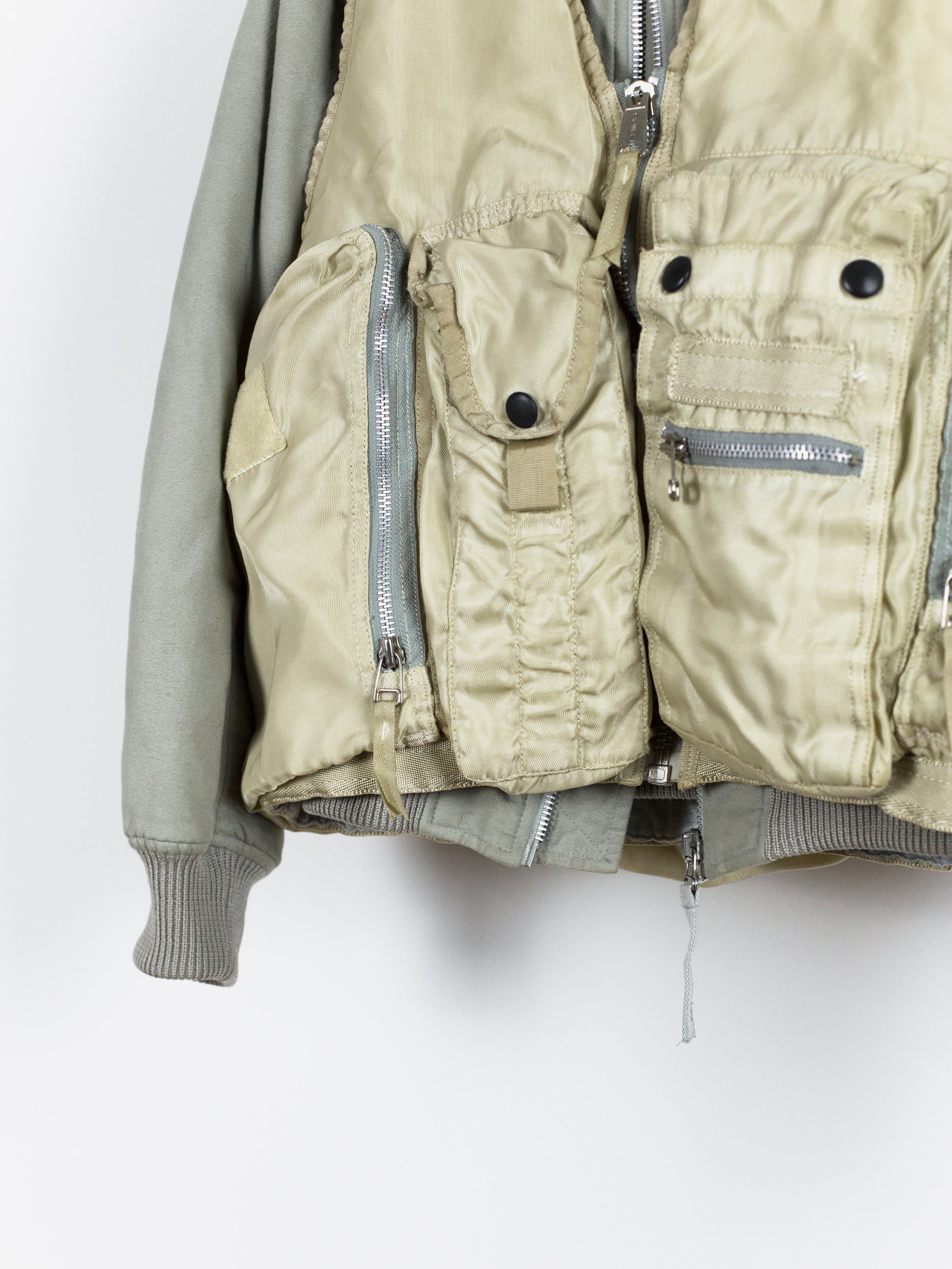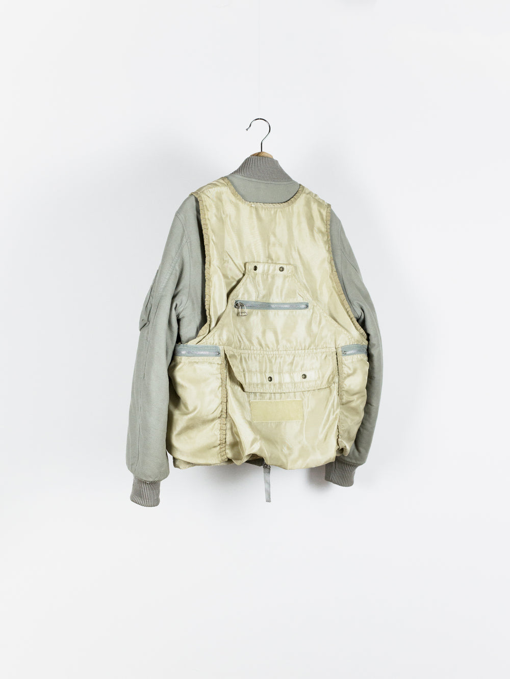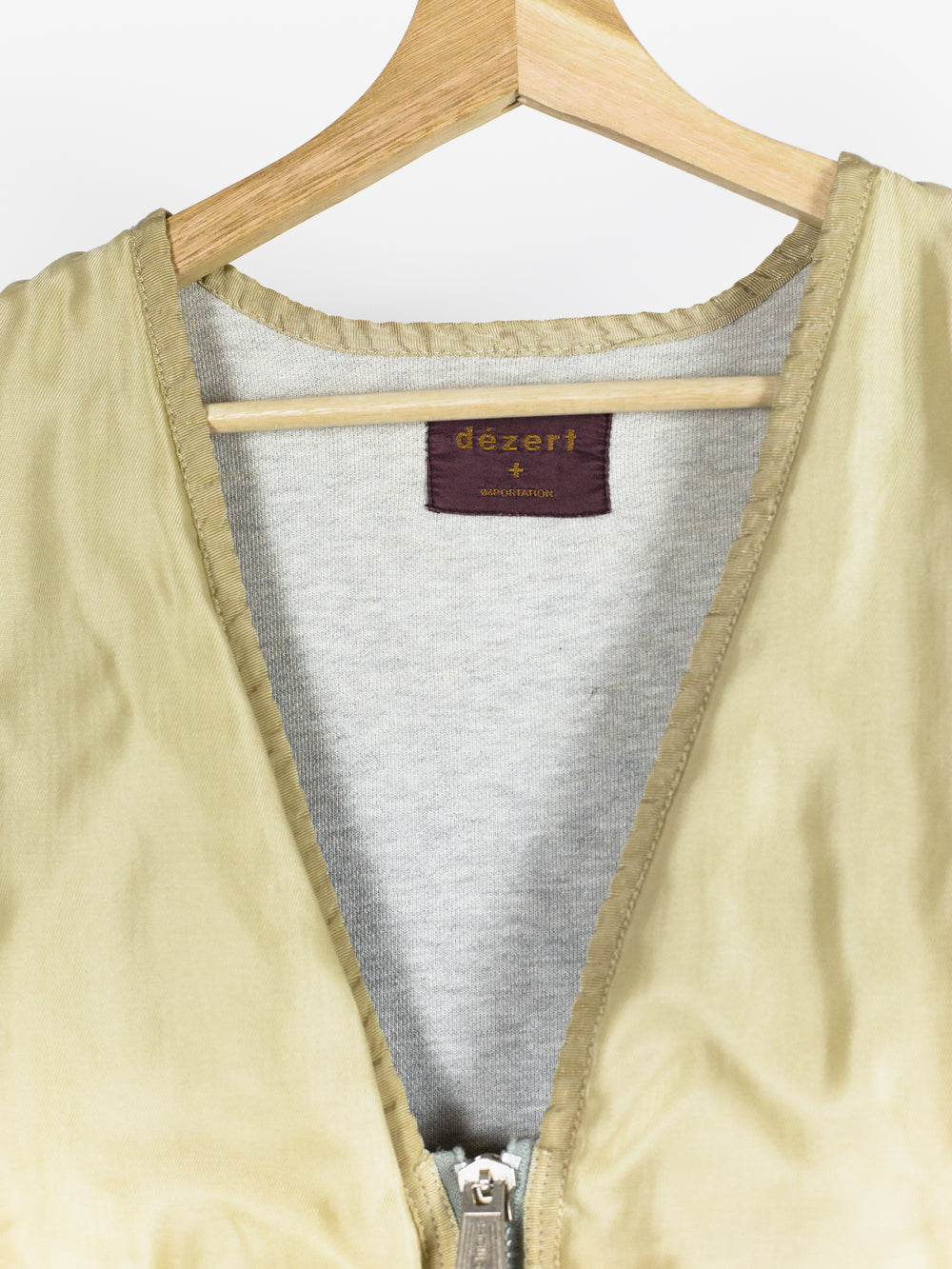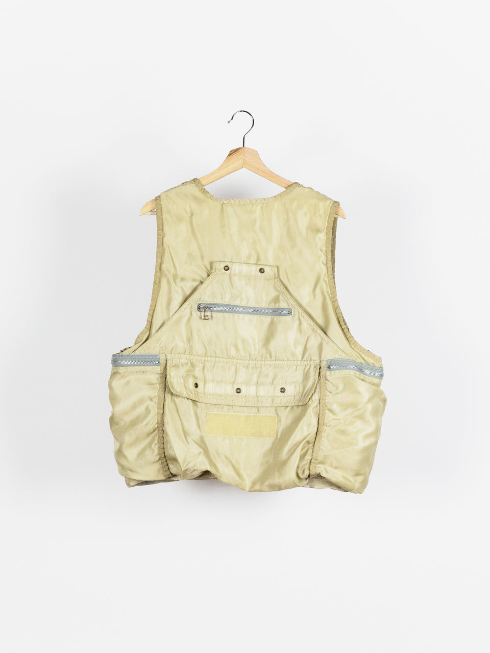 Amazing utilitarian fishing vest from Dézert, an 80s-90s era label run by ex-Comme des Garcons Homme patternmaker Shigehiko Taguchi. Smooth, drapey, gold nylon exterior and jersey sweat interior, this vest is reversible thanks to the double-sided zipper. Features 360 degree 3D pocketing around the waist and 90 degree top-and-side opening lateral pockets. Wear it layered over outerwear to add dimension or simply over a t-shirt.