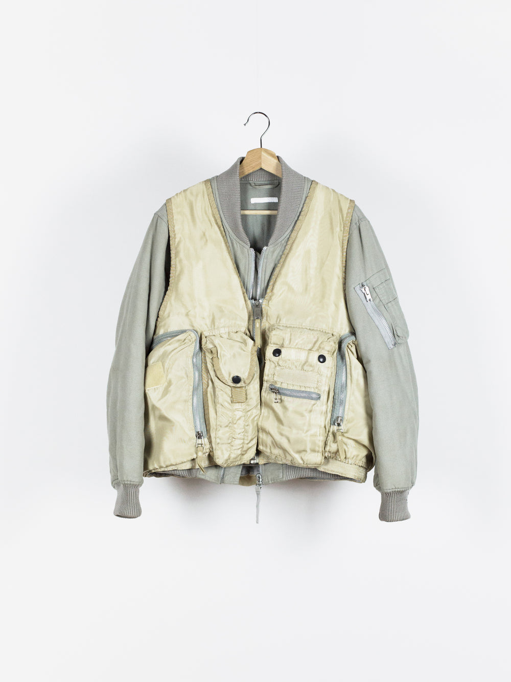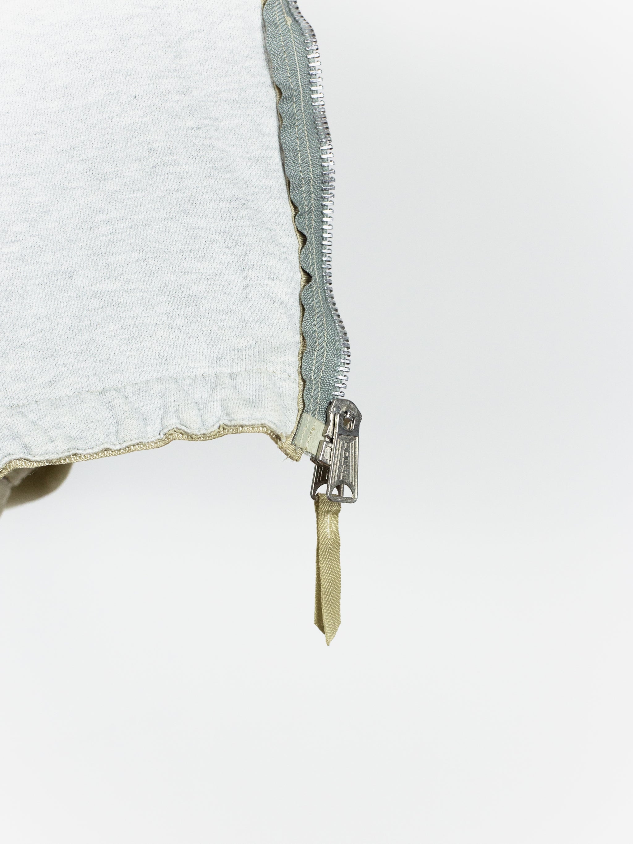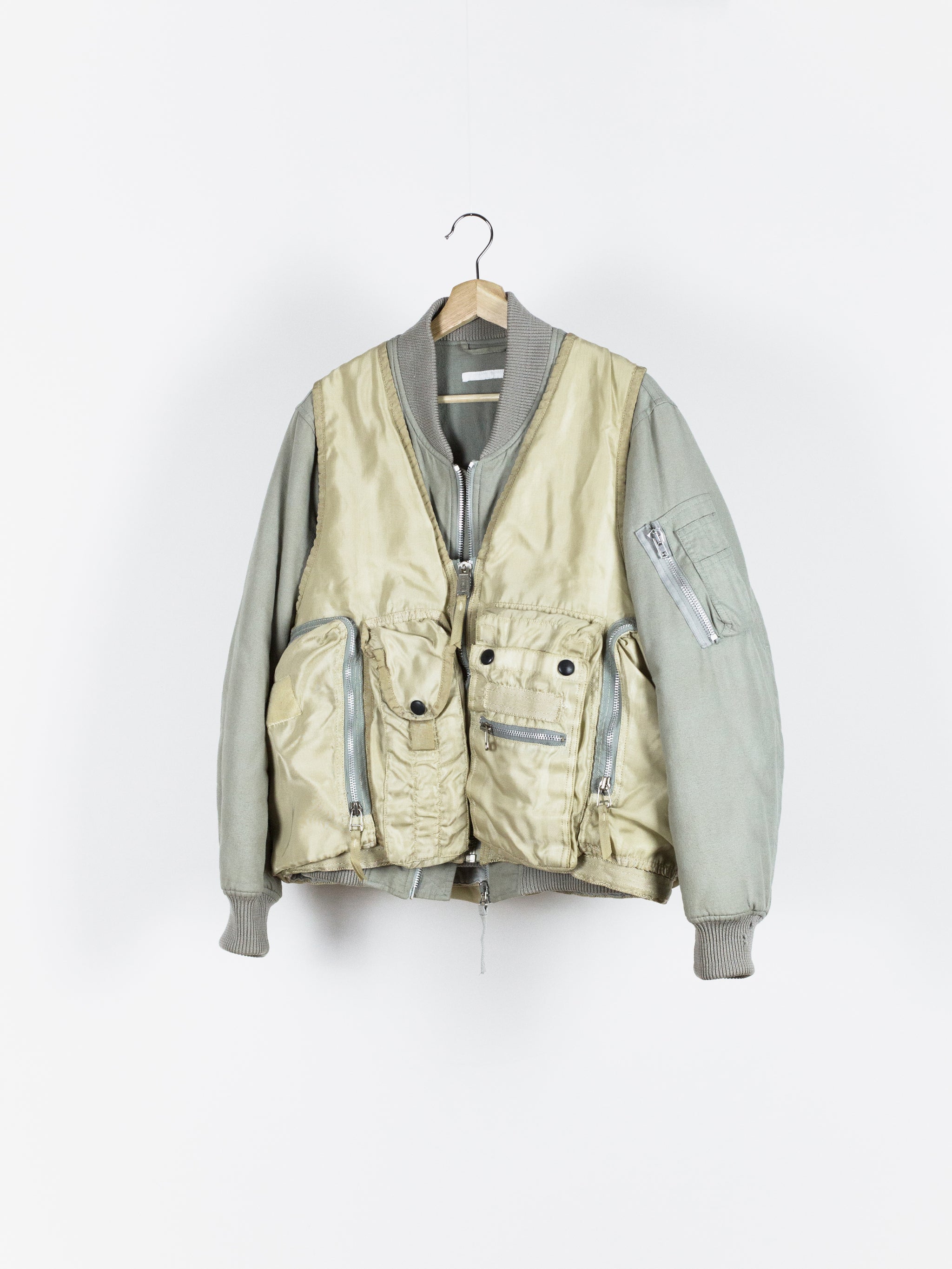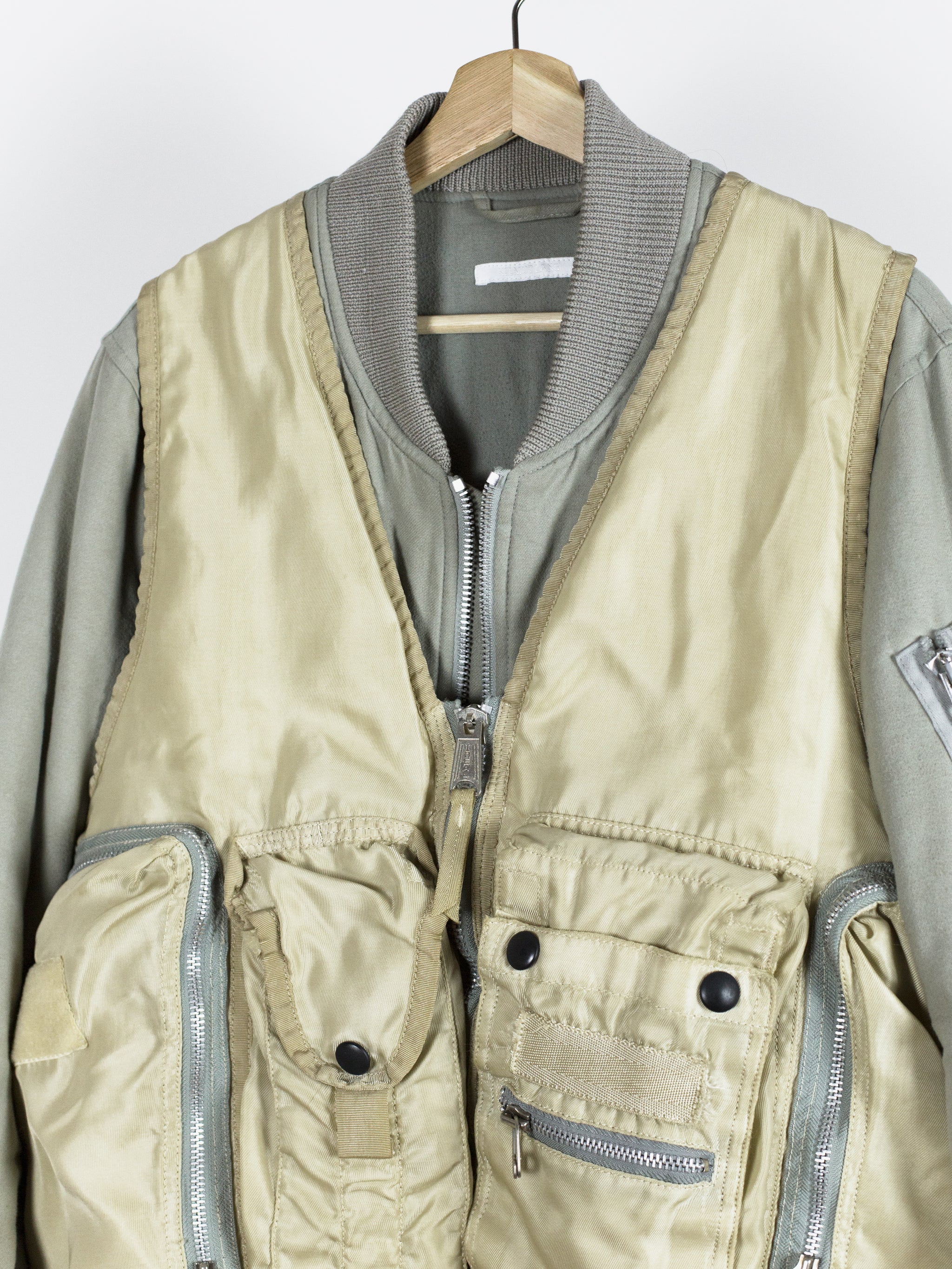 Amazing utilitarian fishing vest from Dézert, an 80s-90s era label run by ex-Comme des Garcons Homme patternmaker Shigehiko Taguchi. Smooth, drapey, gold nylon exterior and jersey sweat interior, this vest is reversible thanks to the double-sided zipper. Features 360 degree 3D pocketing around the waist and 90 degree top-and-side opening lateral pockets. Wear it layered over outerwear to add dimension or simply over a t-shirt.