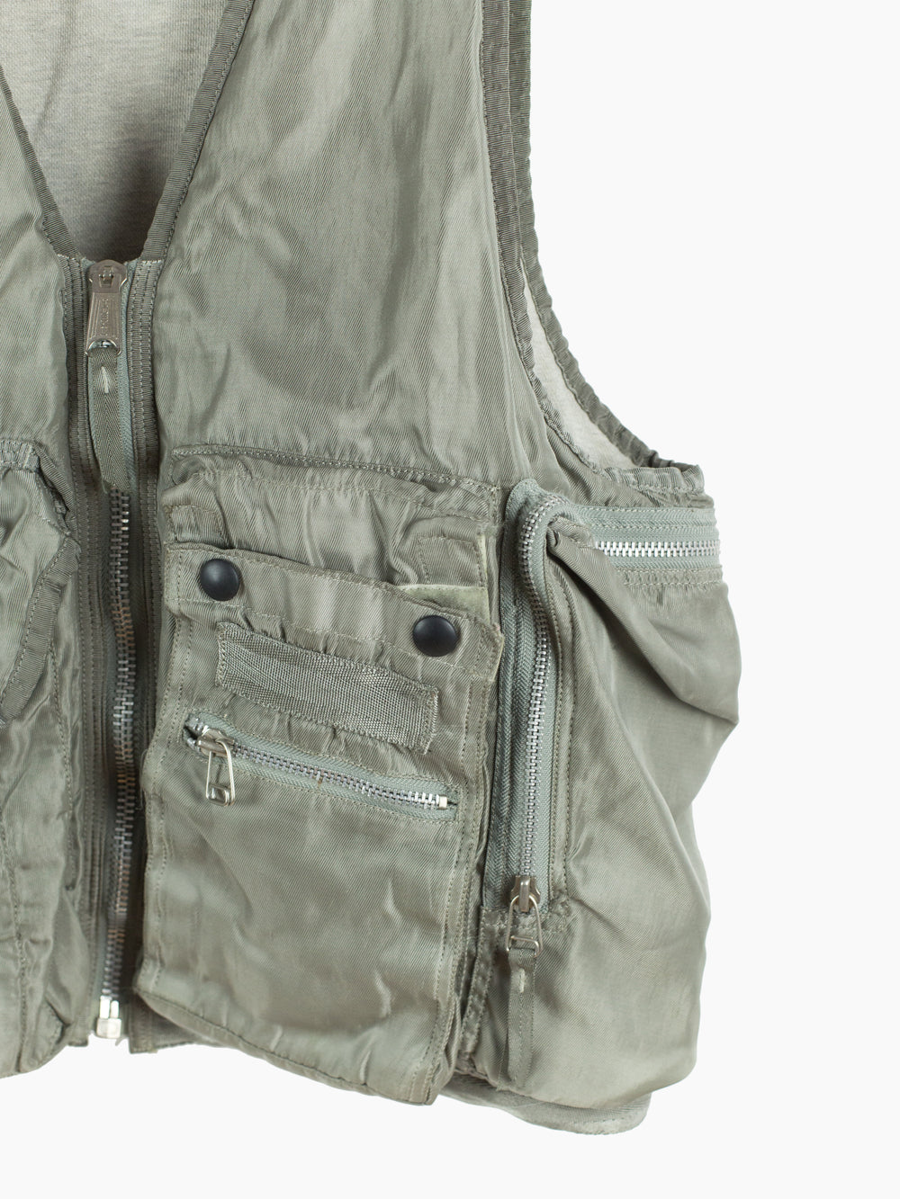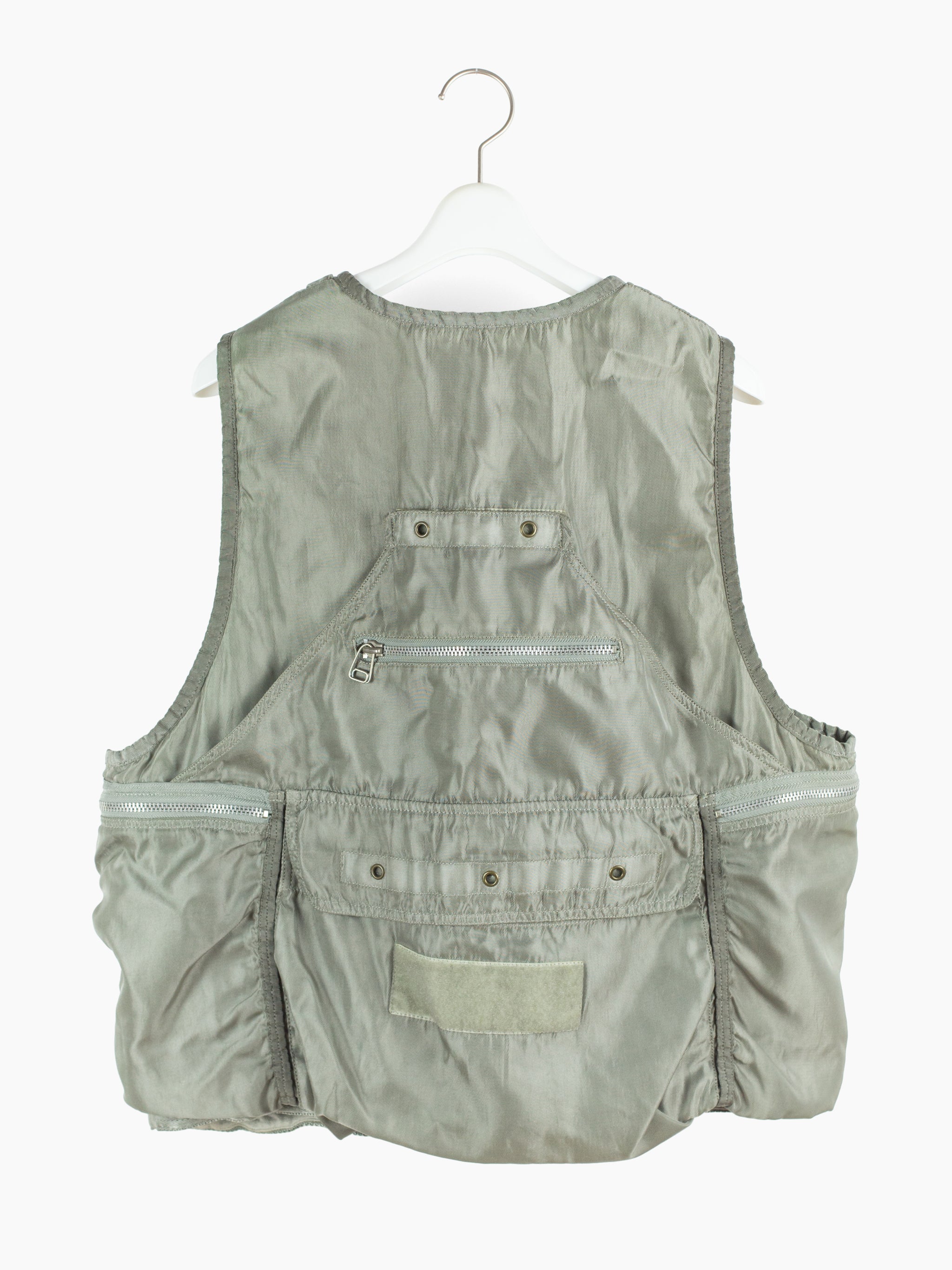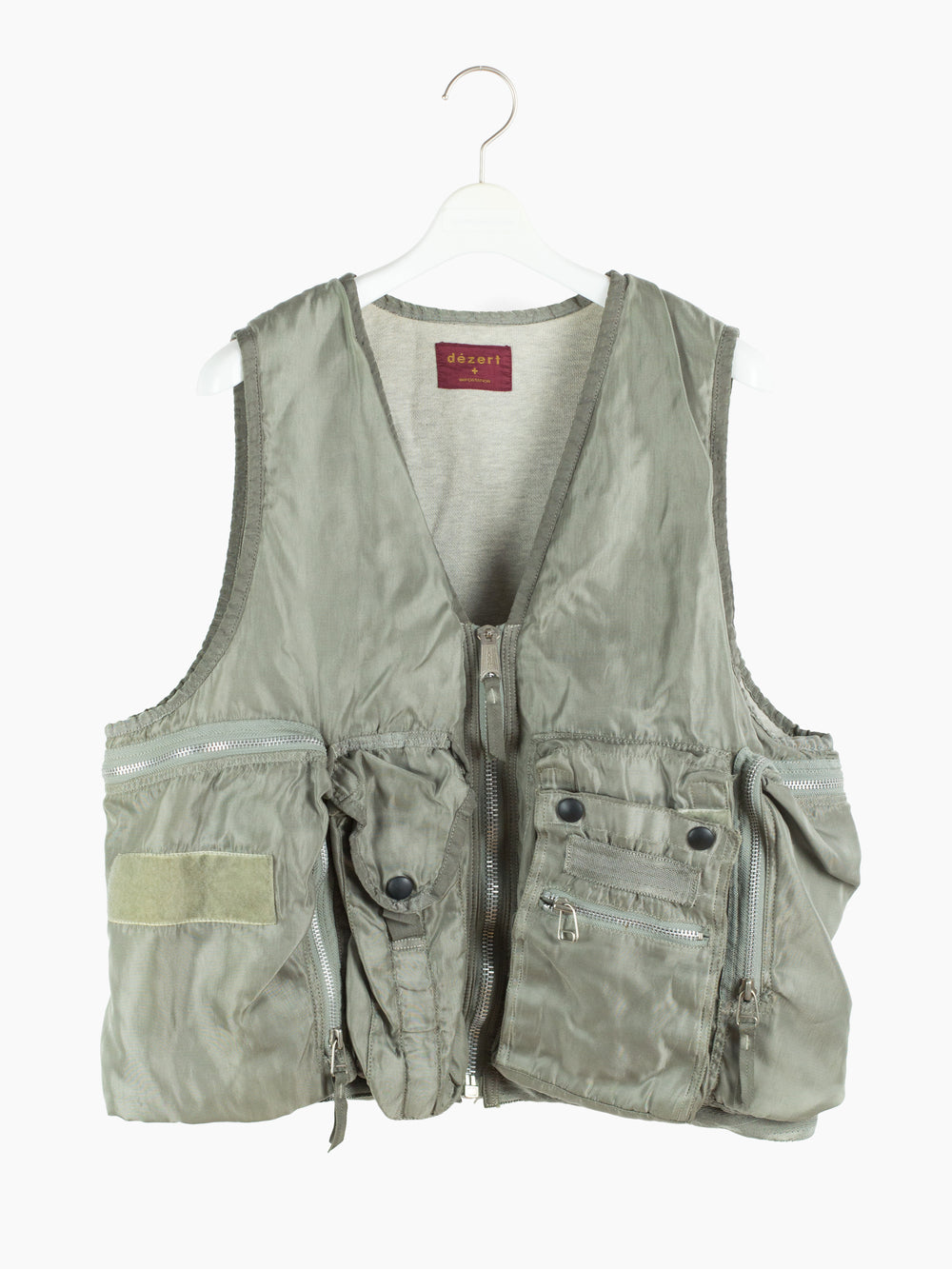 Utilitarian fishing vest from Dézert, an 80s-90s era label run by ex-Comme des Garcons Homme patternmaker Shigehiko Taguchi. Smooth, drapey, silver nylon exterior and jersey sweat interior, this vest is reversible thanks to the double-sided zipper. Features 360 degree 3D pocketing around the waist and 90 degree top-and-side opening lateral pockets. Wear it layered over outerwear to add dimension or simply over a t-shirt.