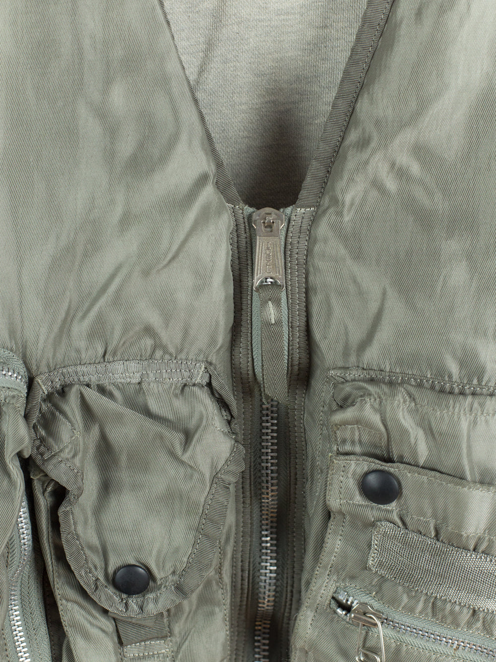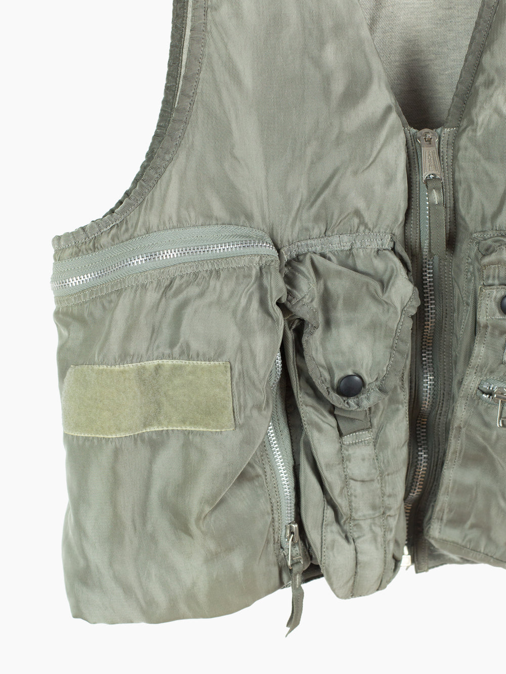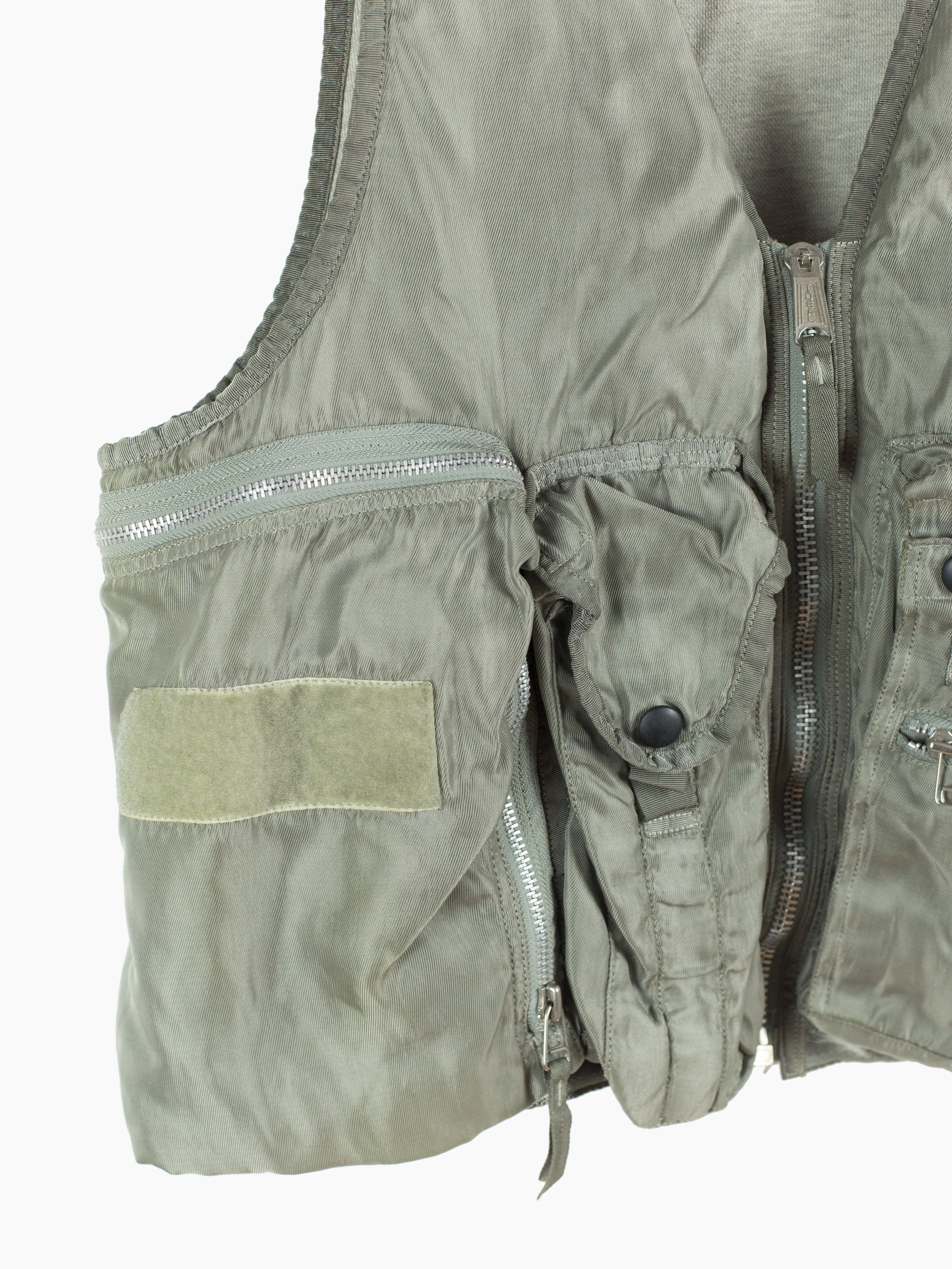 Utilitarian fishing vest from Dézert, an 80s-90s era label run by ex-Comme des Garcons Homme patternmaker Shigehiko Taguchi. Smooth, drapey, silver nylon exterior and jersey sweat interior, this vest is reversible thanks to the double-sided zipper. Features 360 degree 3D pocketing around the waist and 90 degree top-and-side opening lateral pockets. Wear it layered over outerwear to add dimension or simply over a t-shirt.