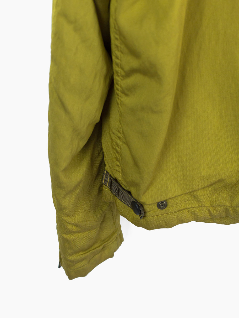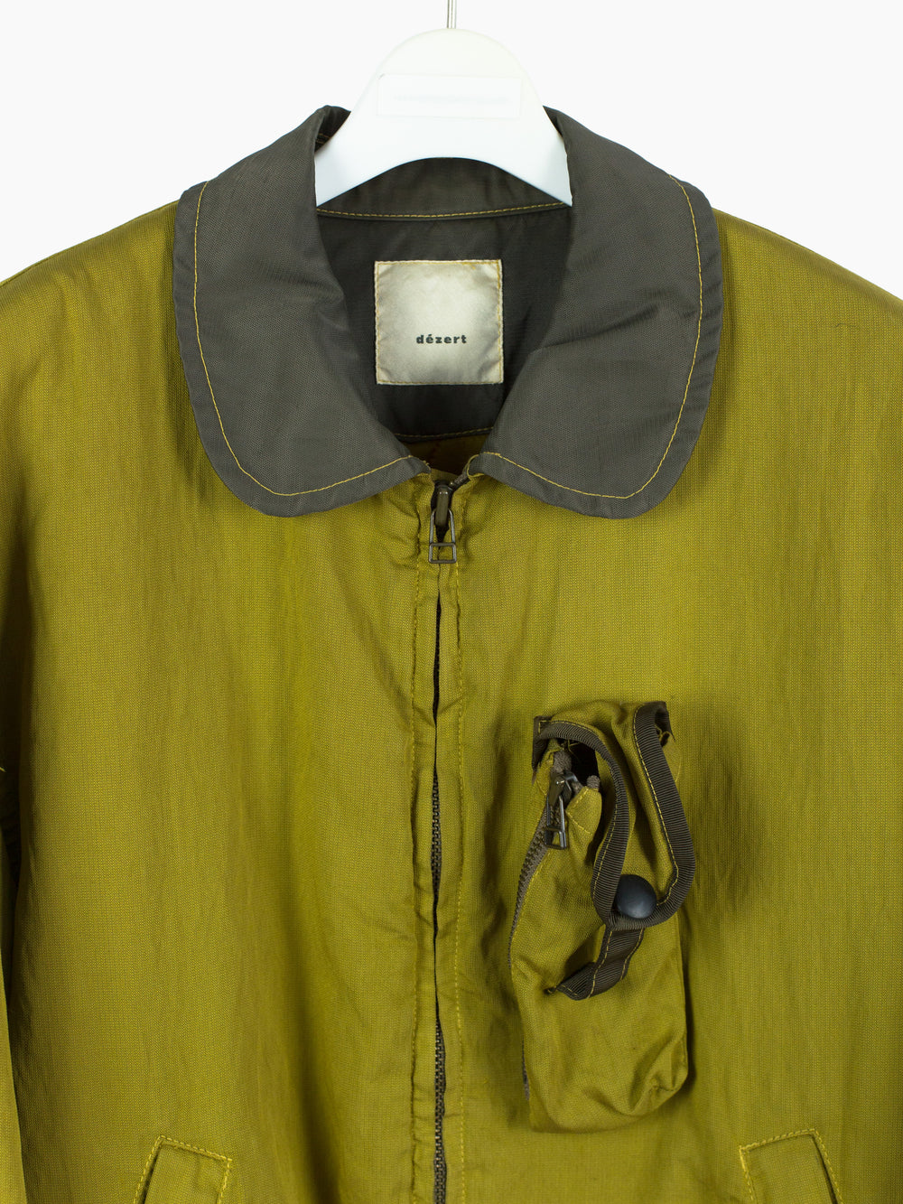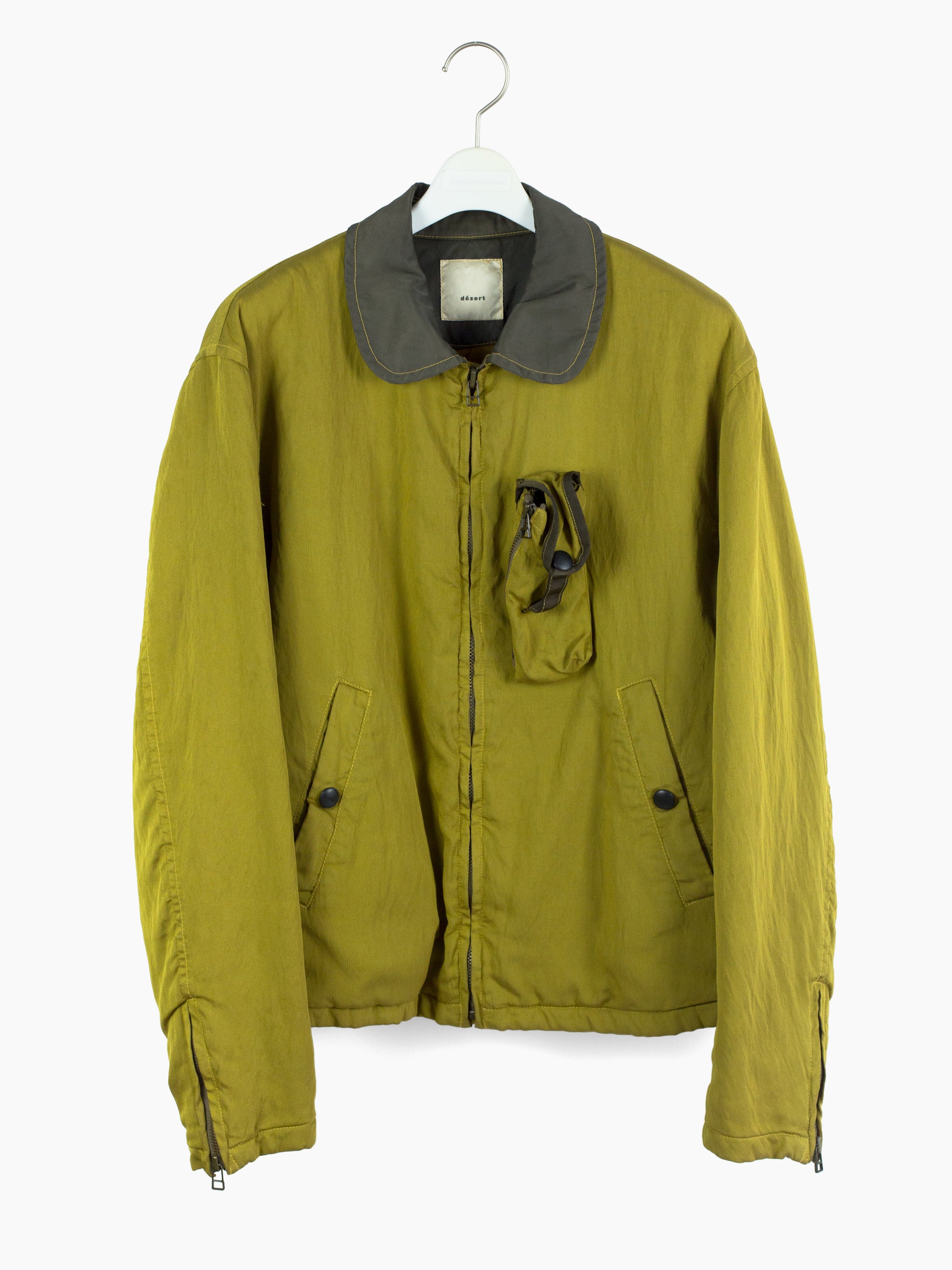 Work blouson from Dezert, in a beautiful saturated mustard yellow Rayon/Nylon blend face fabric, featuring contrast nylon club-collar and velcro + snap removable dual-entry chest pocket. The coziness of this jacket can't be overstated. The richly textured face fabric is soft to the touch and falls with a beautiful drape while the lightweight cupro quilted liner feels like being brushed by a cool breeze with light insulation that doesn't bulk up the silhouette. What results is a jacket that's both statemented in its color and versatile in its shape and styling, all while being a pleasure to wear.