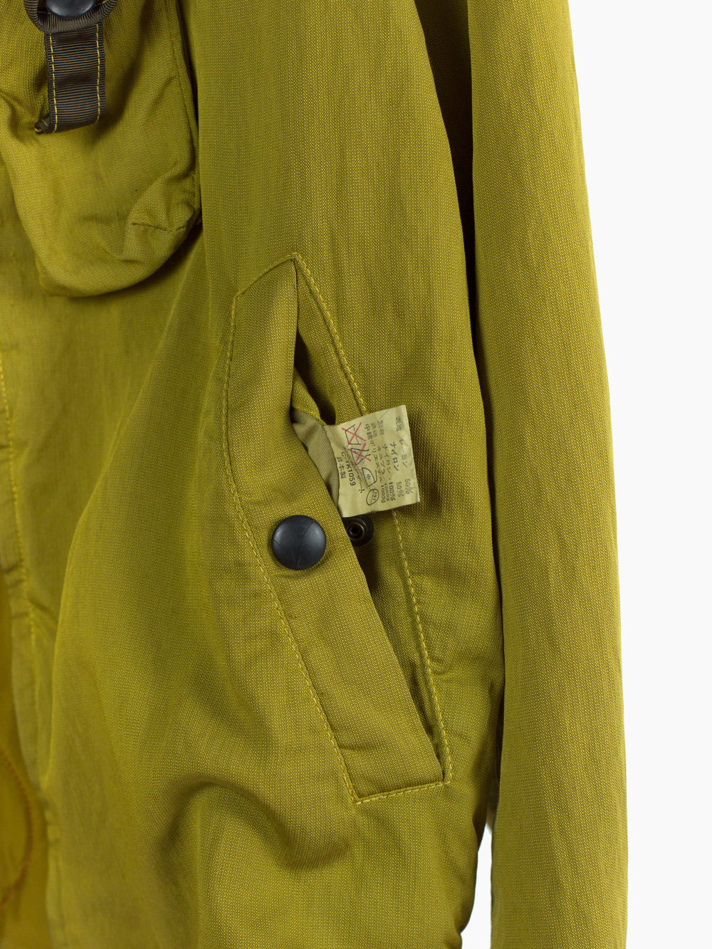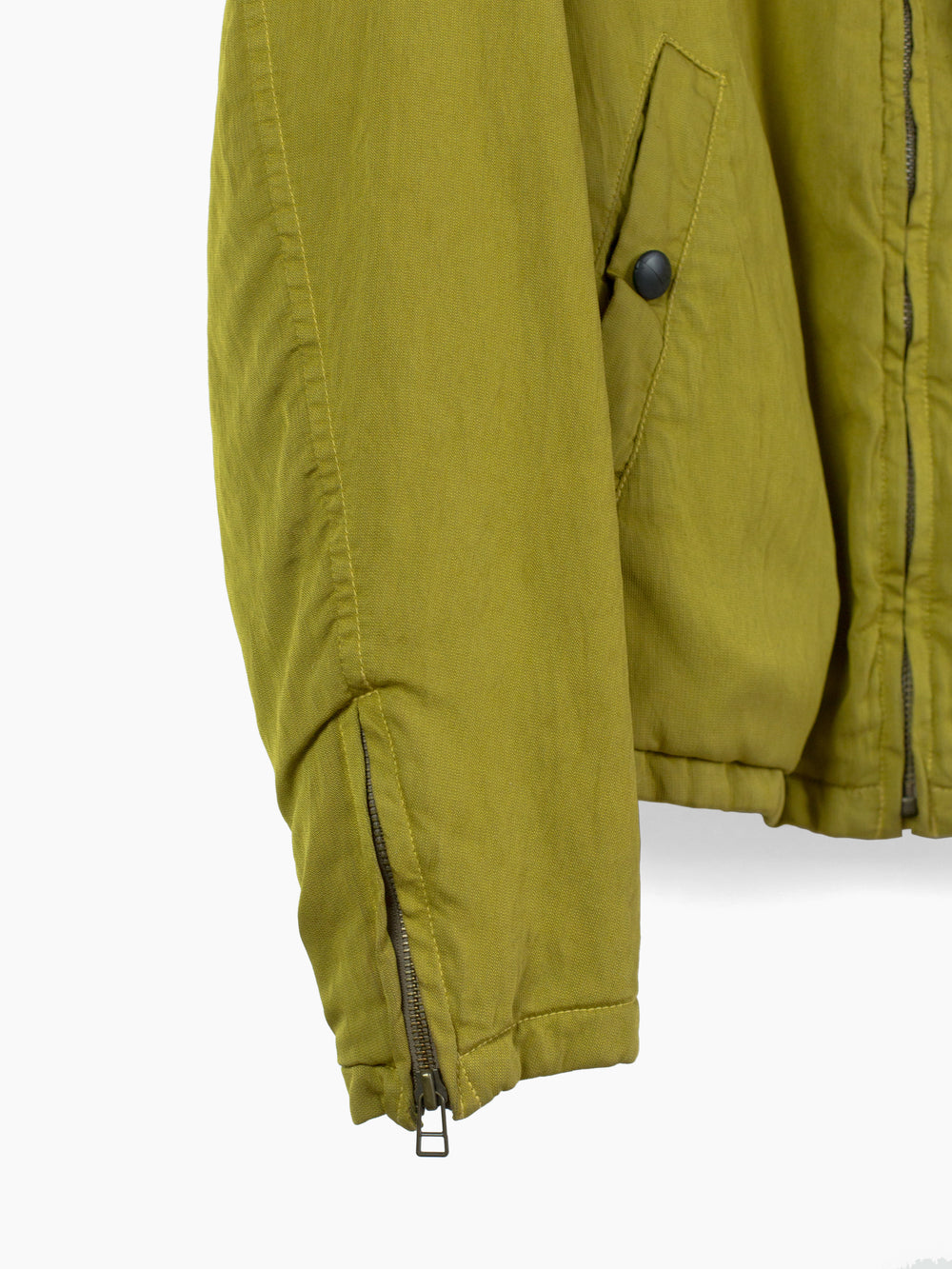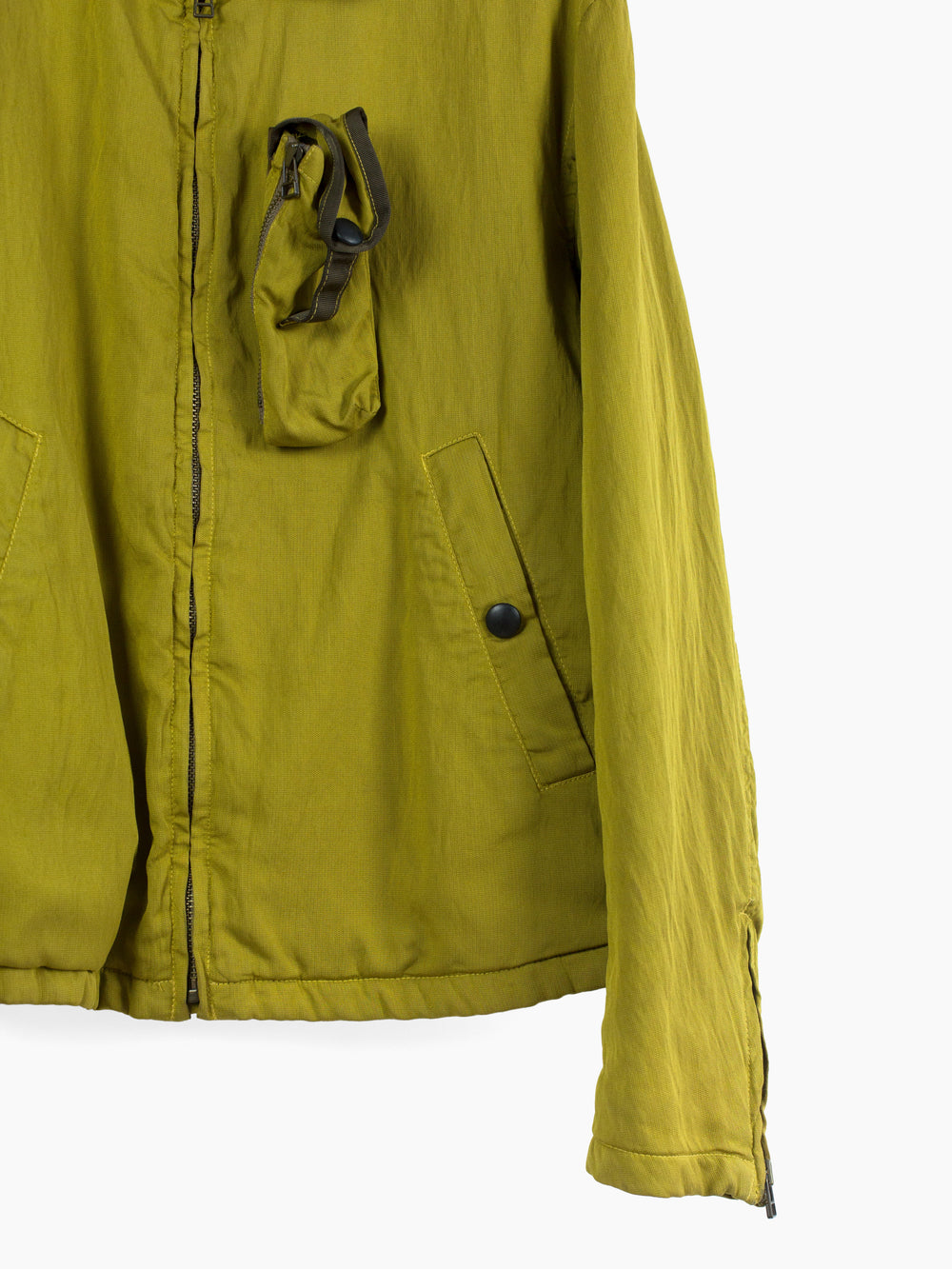 Work blouson from Dezert, in a beautiful saturated mustard yellow Rayon/Nylon blend face fabric, featuring contrast nylon club-collar and velcro + snap removable dual-entry chest pocket. The coziness of this jacket can't be overstated. The richly textured face fabric is soft to the touch and falls with a beautiful drape while the lightweight cupro quilted liner feels like being brushed by a cool breeze with light insulation that doesn't bulk up the silhouette. What results is a jacket that's both statemented in its color and versatile in its shape and styling, all while being a pleasure to wear.