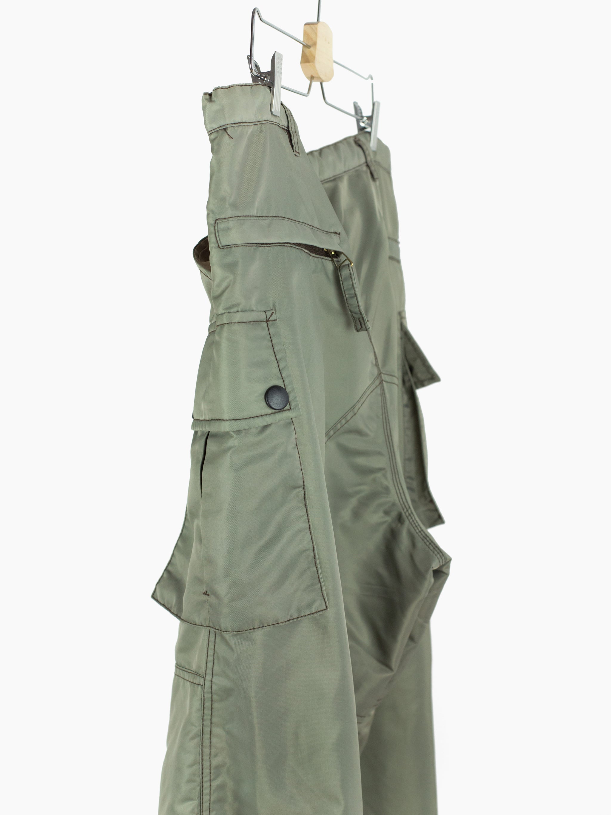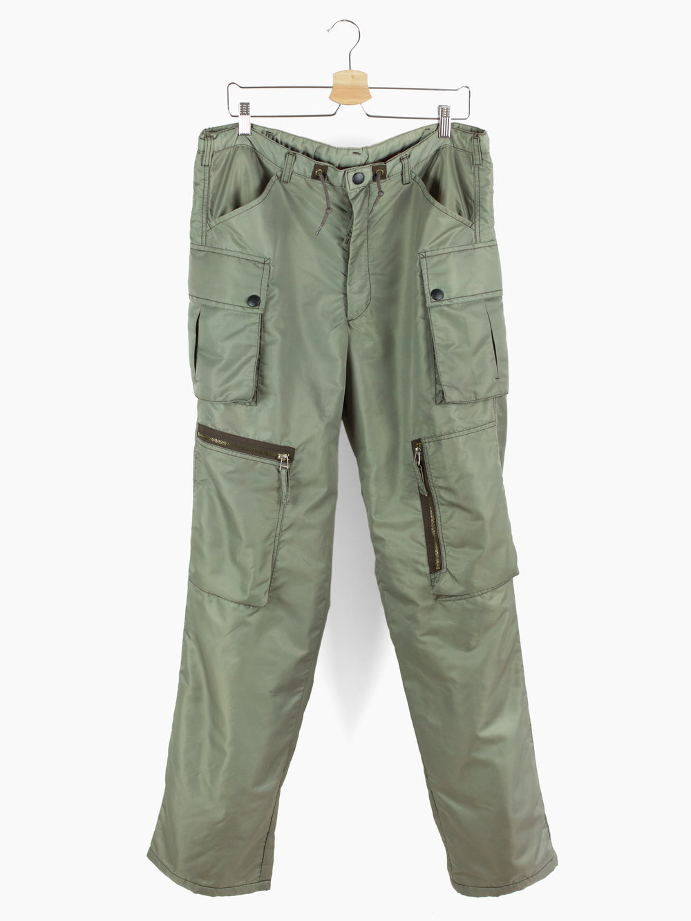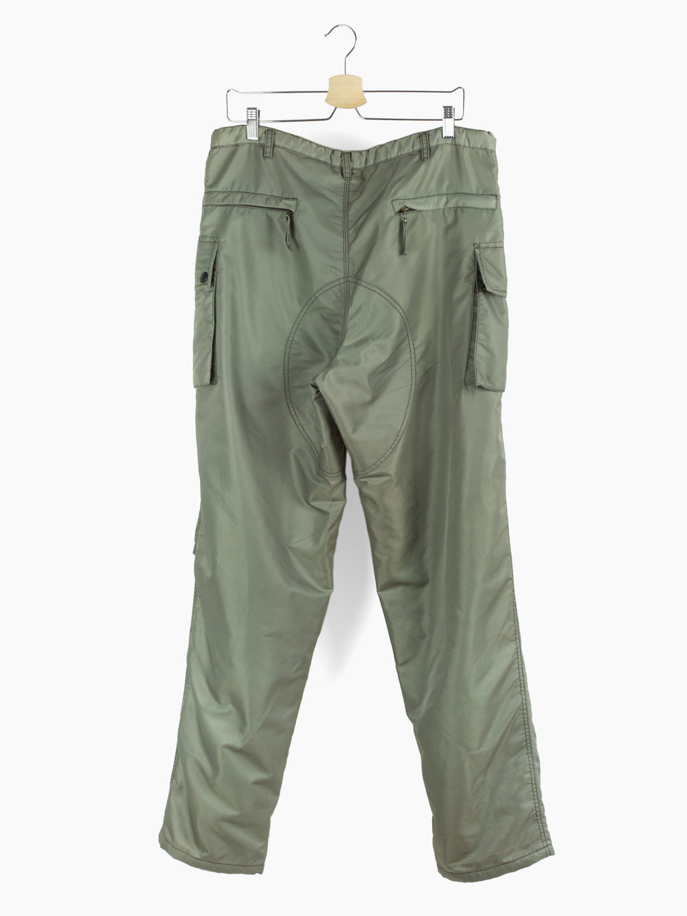 Military style flight/cargo pants from Japanese brand Dézert, featuring an array of 6 pockets along the front. Drop waist pockets lead into pleated flap-closed patch pockets at the hips and gusseted zipper-entry flight pant-style pockets at the thigh. The whole pant is rendered in a supple olive nylon that has a subtle sheen and features full red quilted lining for warmth and comfort. Finished with belt loops and drawcord cinch at waist, zipper fly, and two zippered back pockets