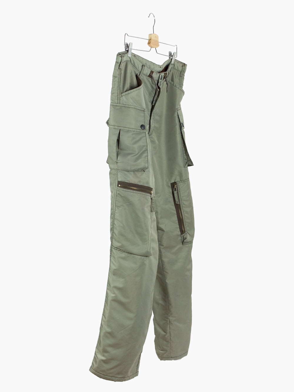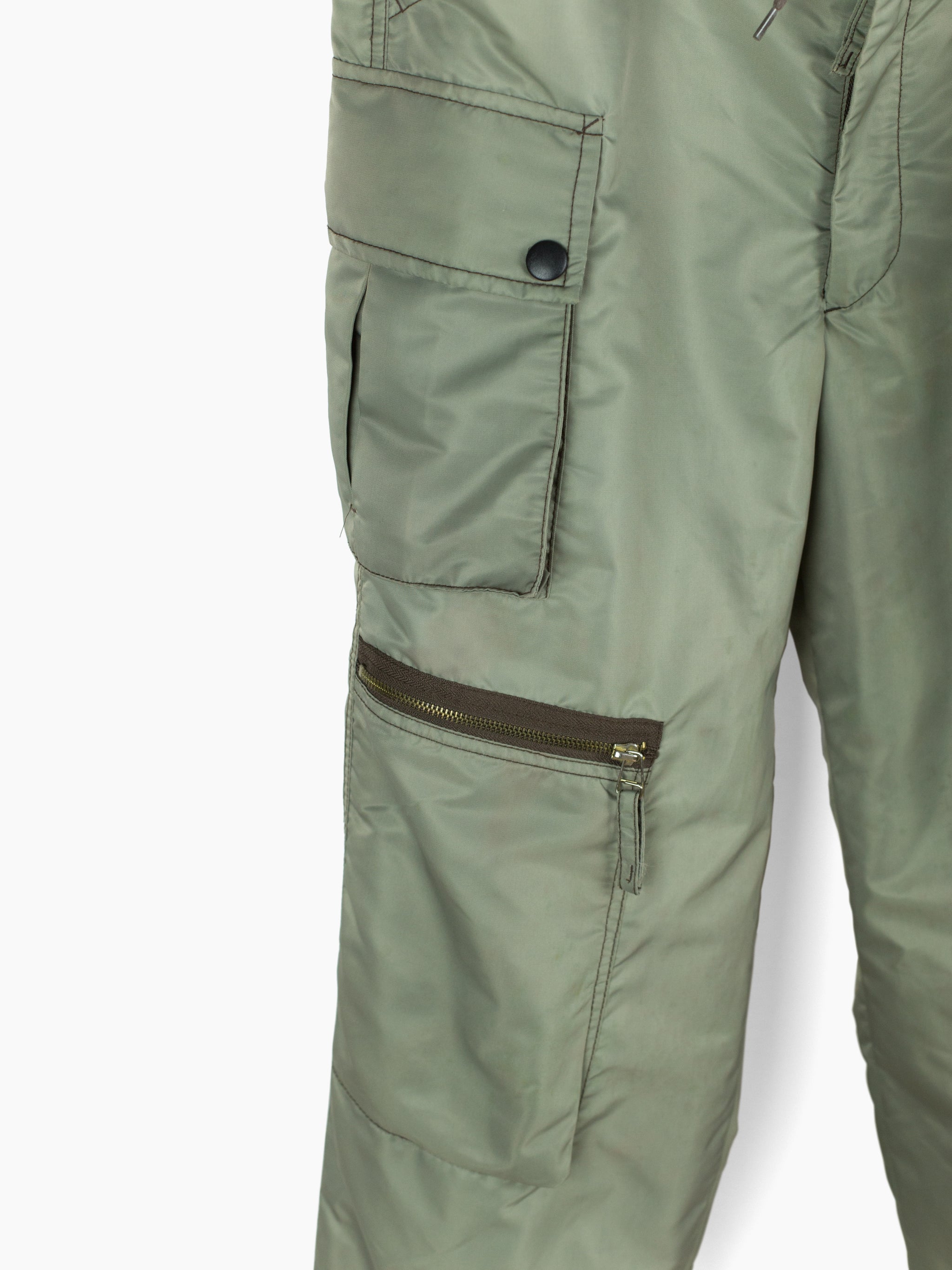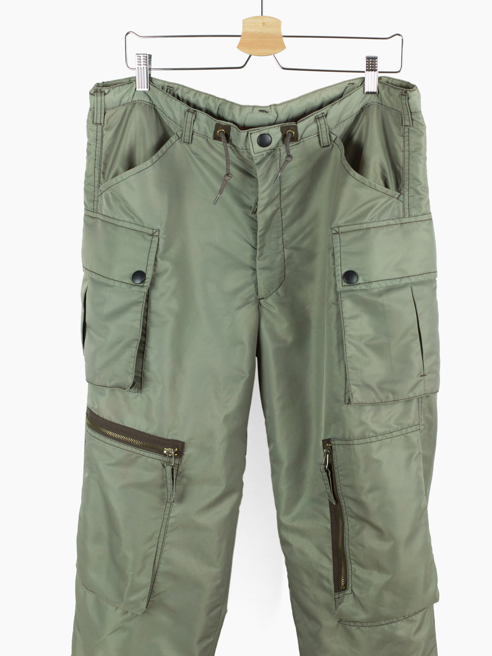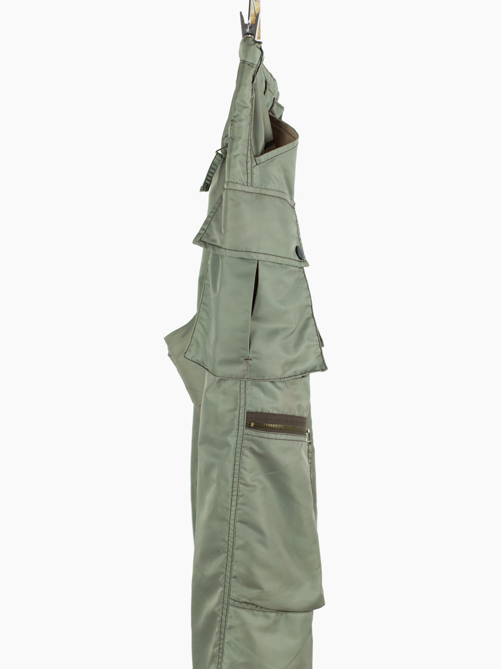 Military style flight/cargo pants from Japanese brand Dézert, featuring an array of 6 pockets along the front. Drop waist pockets lead into pleated flap-closed patch pockets at the hips and gusseted zipper-entry flight pant-style pockets at the thigh. The whole pant is rendered in a supple olive nylon that has a subtle sheen and features full red quilted lining for warmth and comfort. Finished with belt loops and drawcord cinch at waist, zipper fly, and two zippered back pockets