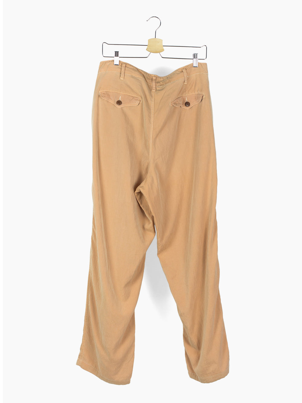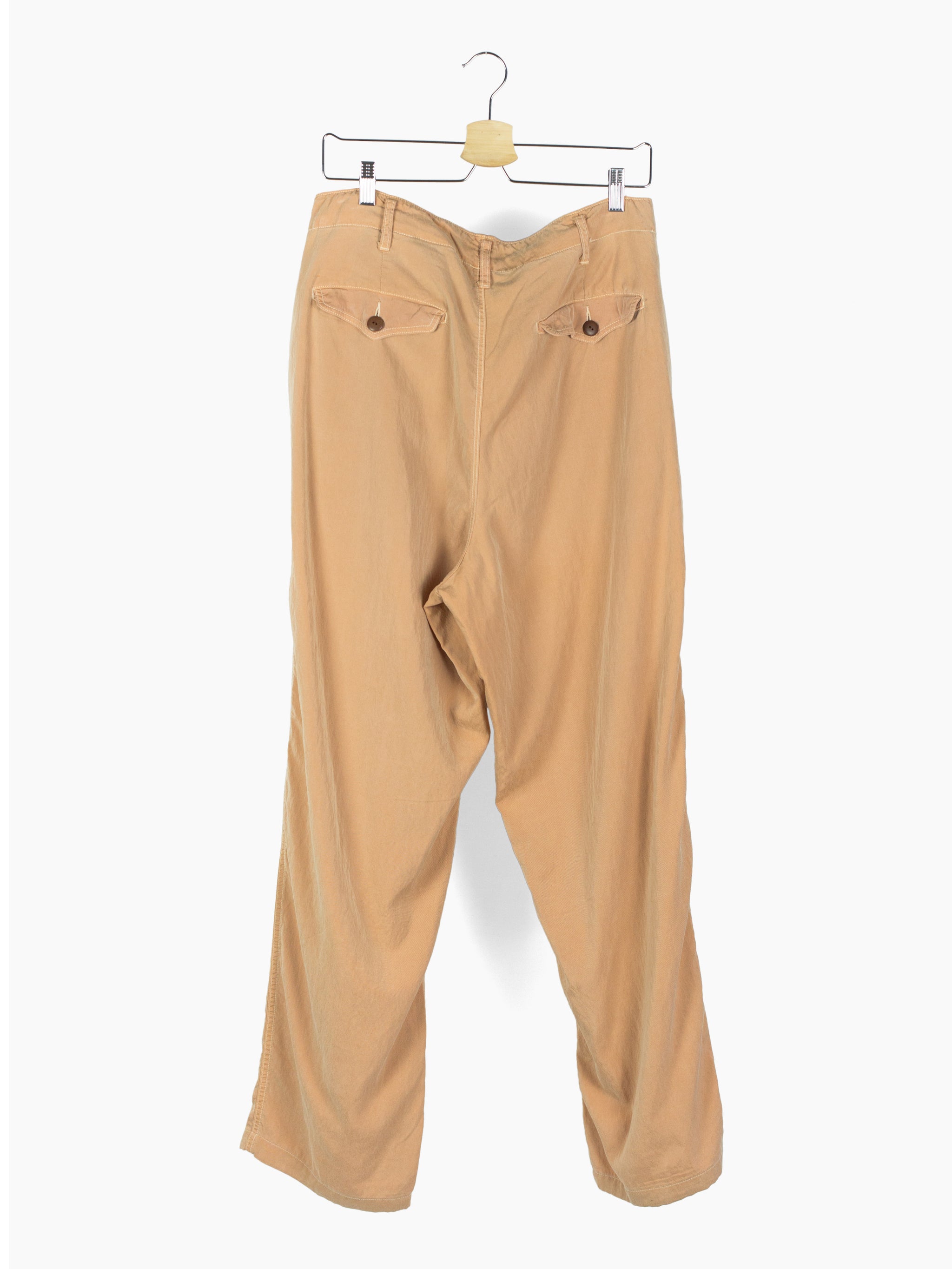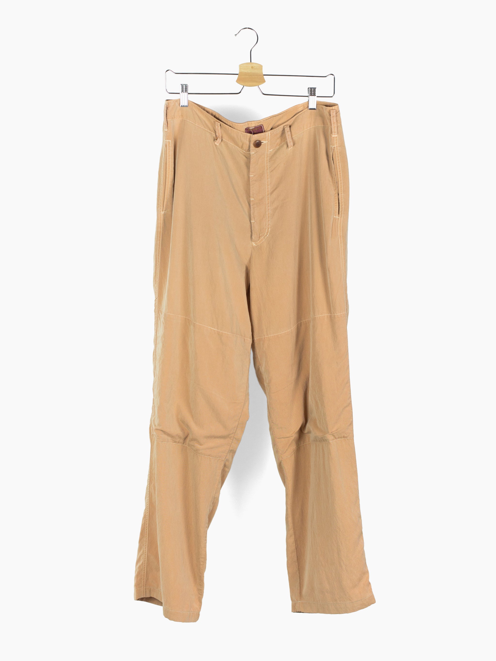 A beautiful slightly iridescent rayon blend fabric is the Dézert touch on these trousers, applying a supple and luxurious fabric to a menswear/workwear staple like a double knee pant. The other details remain archetypical and perfectly finished--welt waist pockets are set right on the side seam, fly features spaced decorative bartacks, knees are topstitched down, with a elegant straight leg cut that highlights the drape of the fabric. Finished with two button-flap-closed back pockets, zipper fly, and button waist closure.