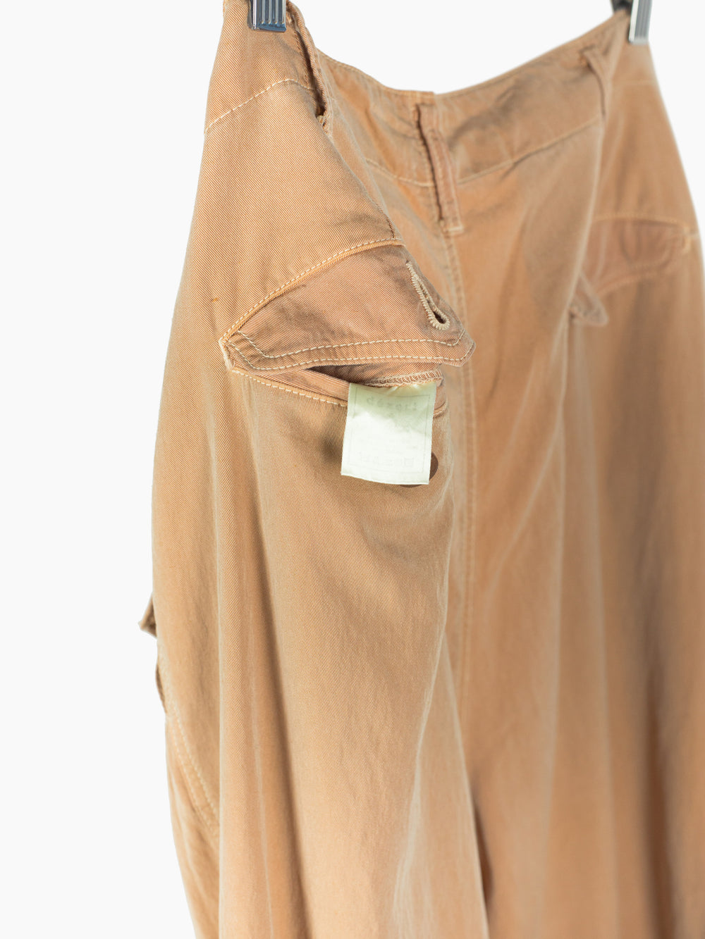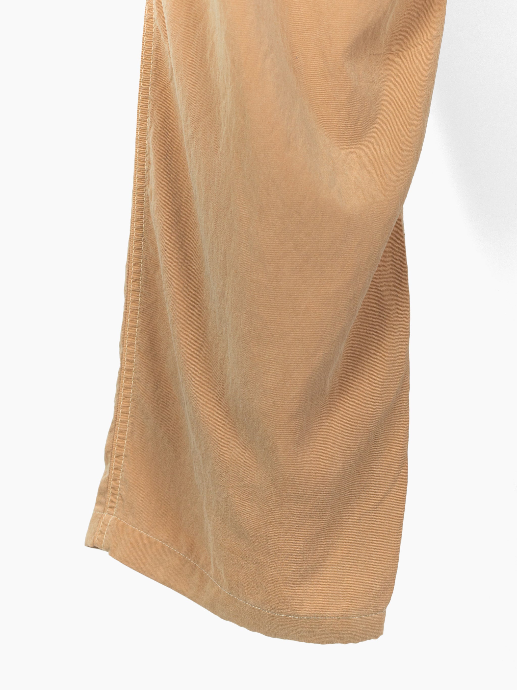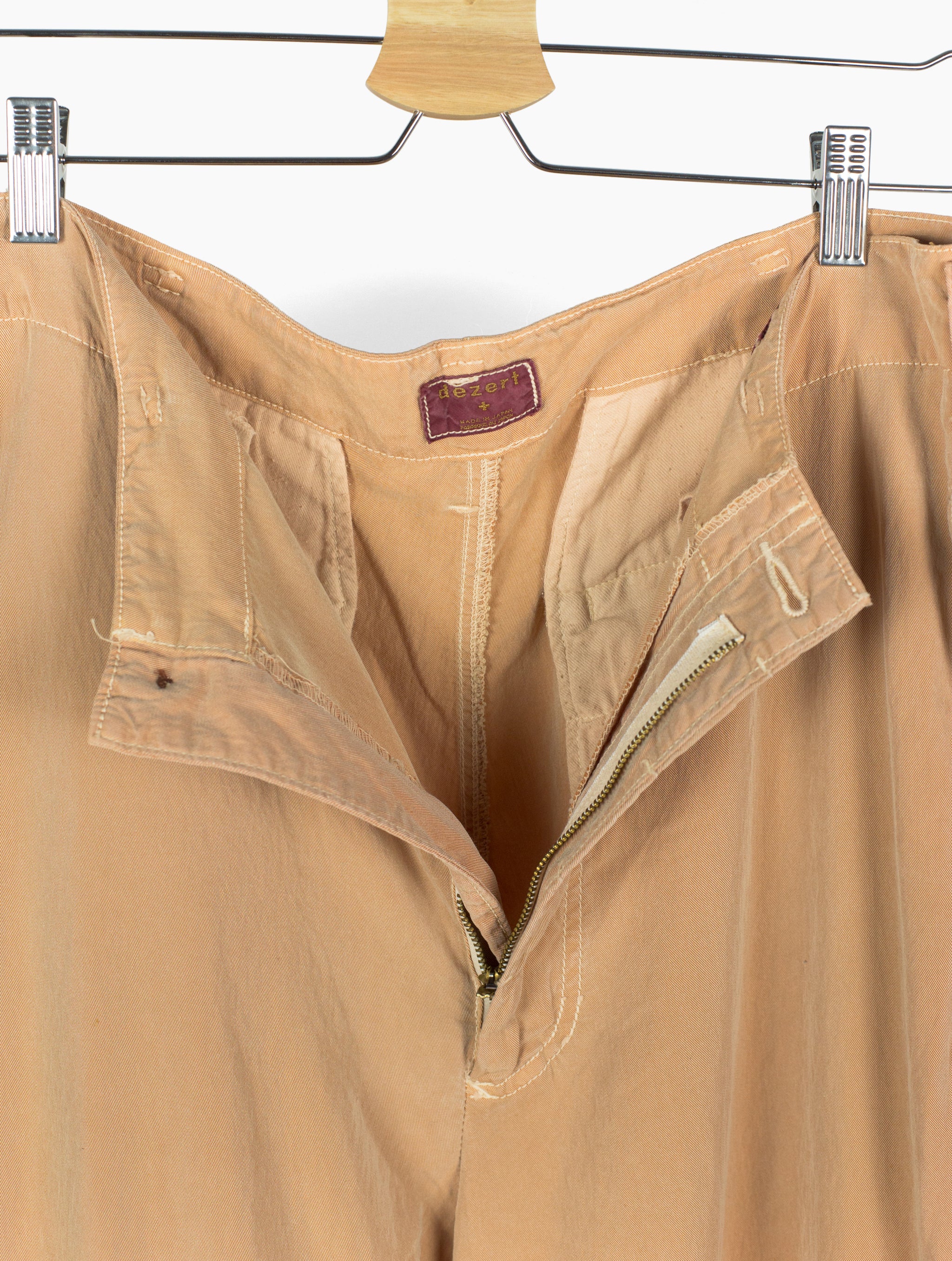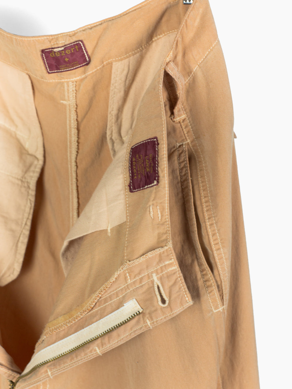 A beautiful slightly iridescent rayon blend fabric is the Dézert touch on these trousers, applying a supple and luxurious fabric to a menswear/workwear staple like a double knee pant. The other details remain archetypical and perfectly finished--welt waist pockets are set right on the side seam, fly features spaced decorative bartacks, knees are topstitched down, with a elegant straight leg cut that highlights the drape of the fabric. Finished with two button-flap-closed back pockets, zipper fly, and button waist closure.
