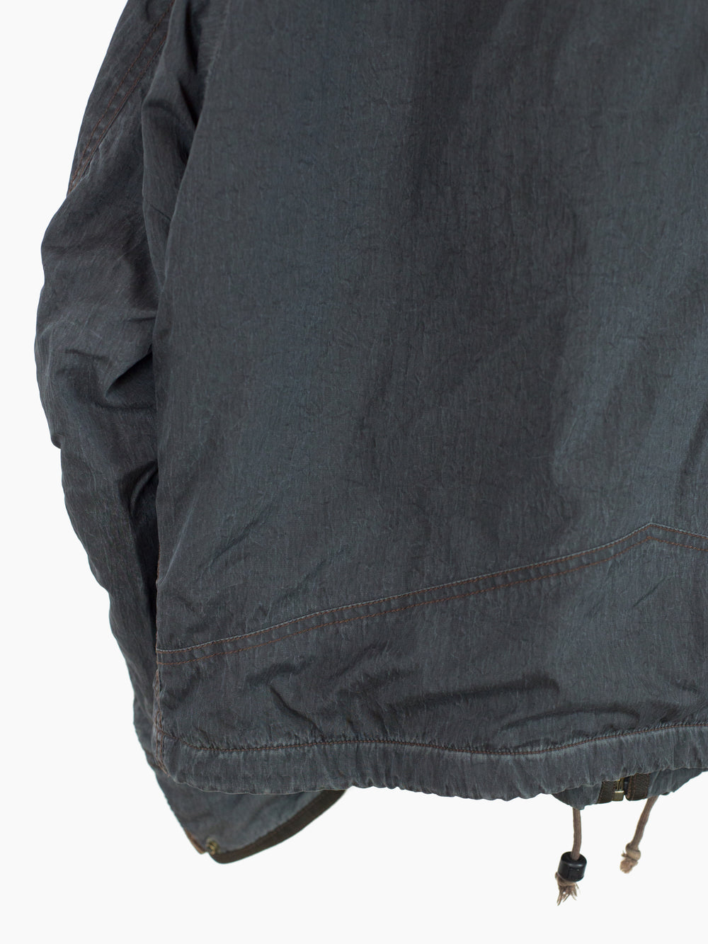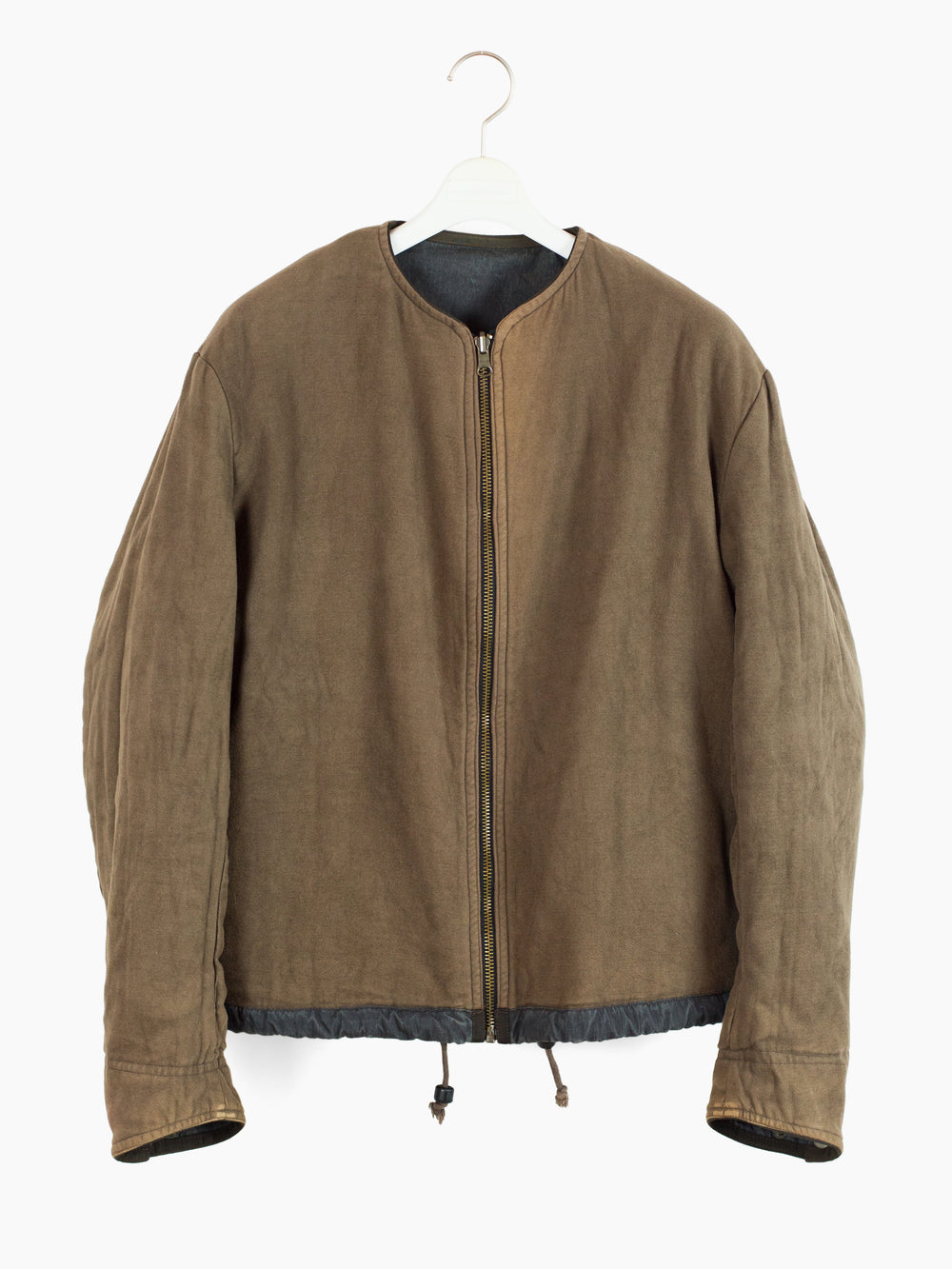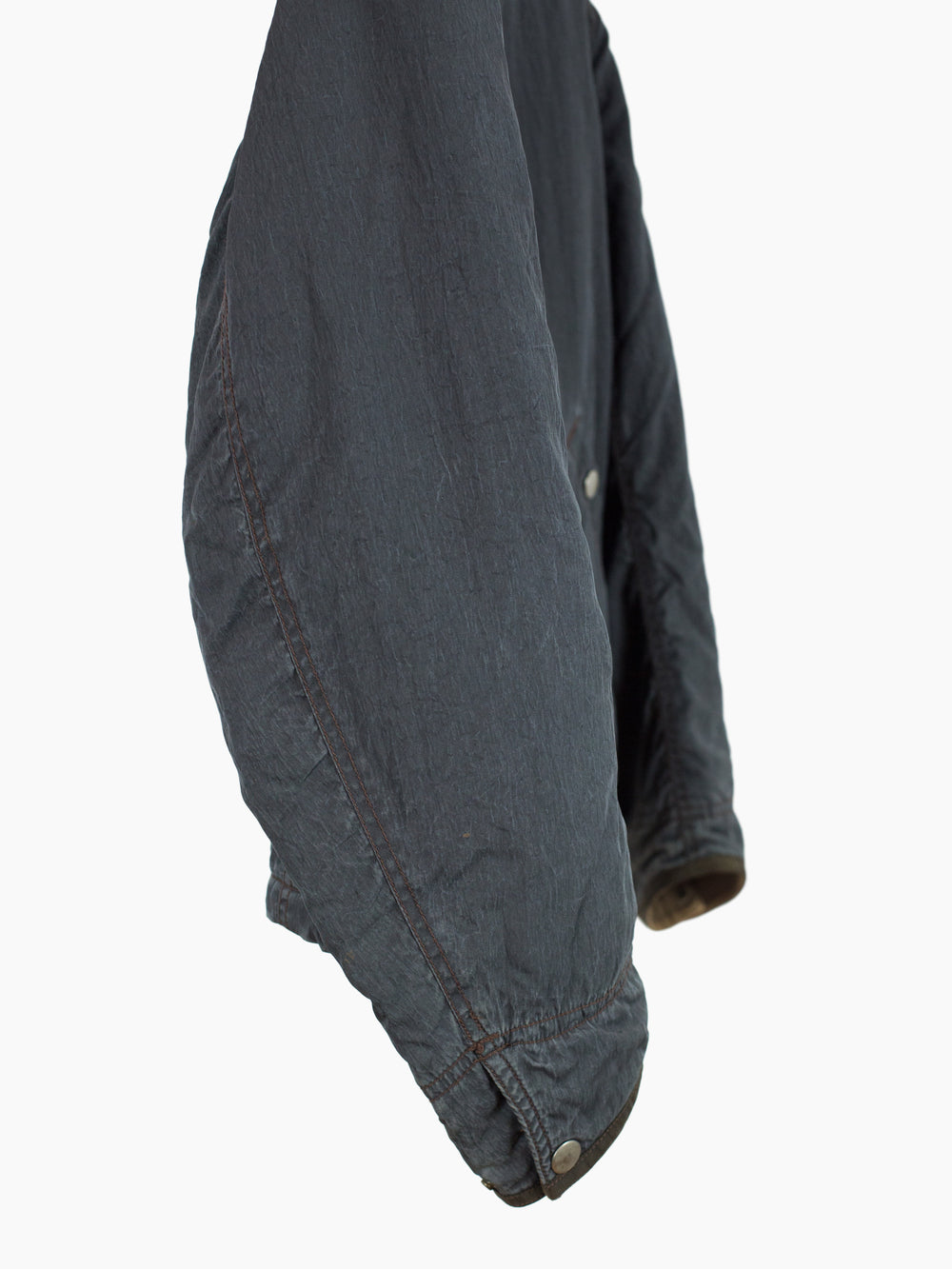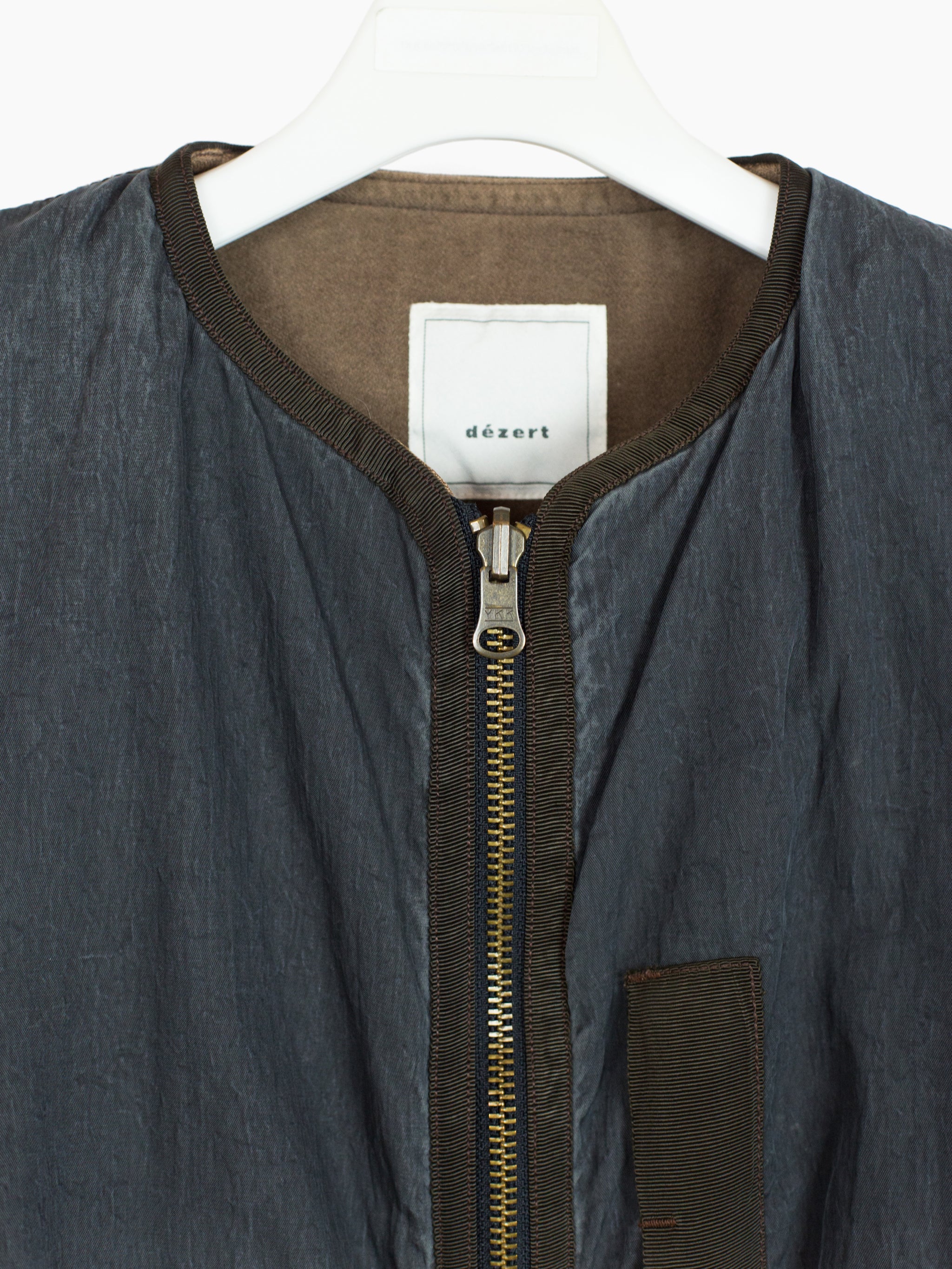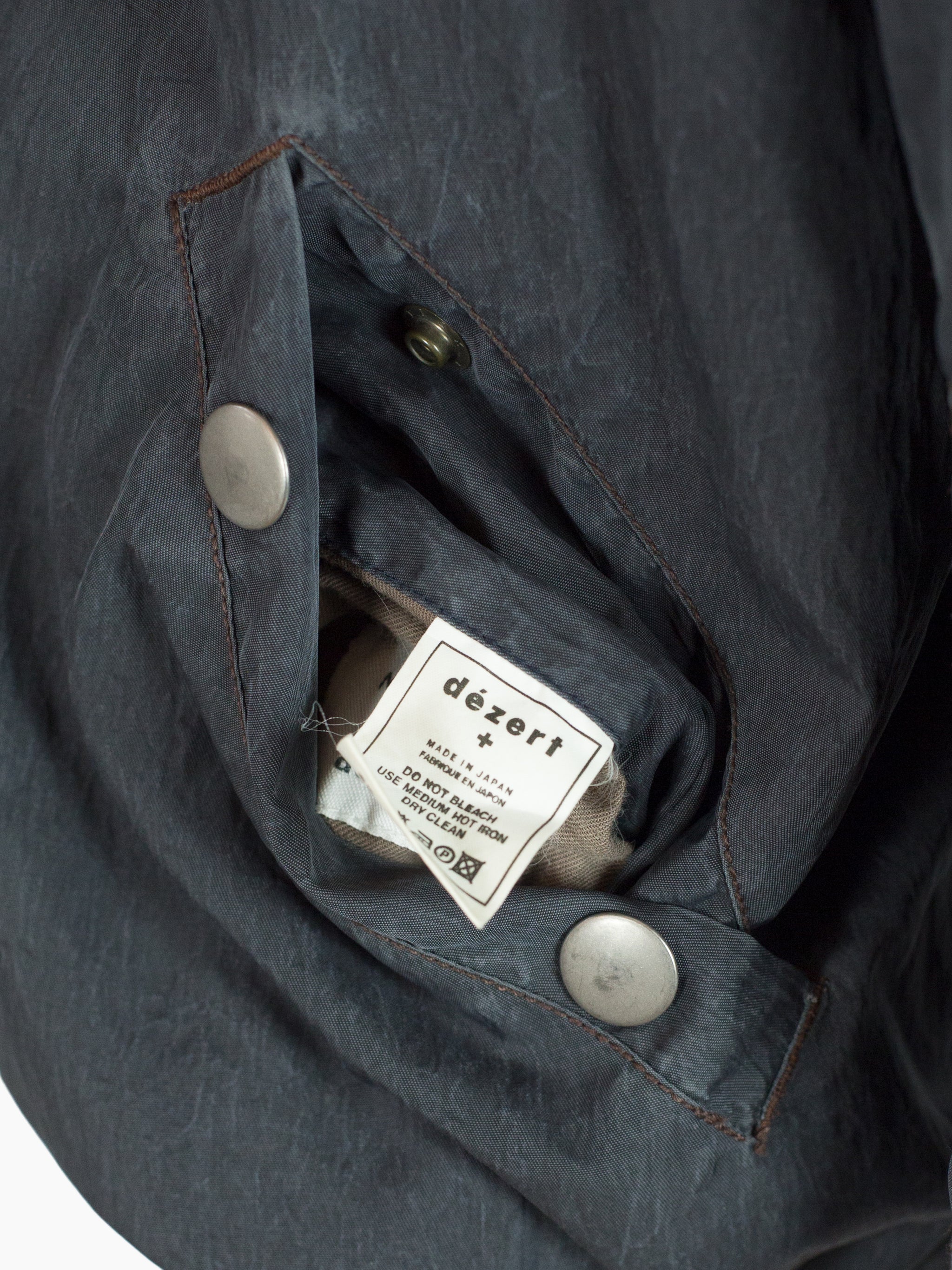 Fully reversible liner-style bomber/biker hybrid from 80s/90s menswear experts Dézert. Washed crinkle nylon outer face in steel blue displays rich color depth, with contrast brown stitching and trims balancing cold and warm tones--in effect inviting more color possibilities when styling. Brown grograin at center front extends around the neck, accentuating the collarless liner style. Bomber details emerge in the form of snap-closed waist welt pockets and nylon tape at wearer's left chest, as well as a double darted back and boxy cut in the body. The inside is cut in a minimalist brown brushed cotton/rayon blend reminiscent of a light moleskin.