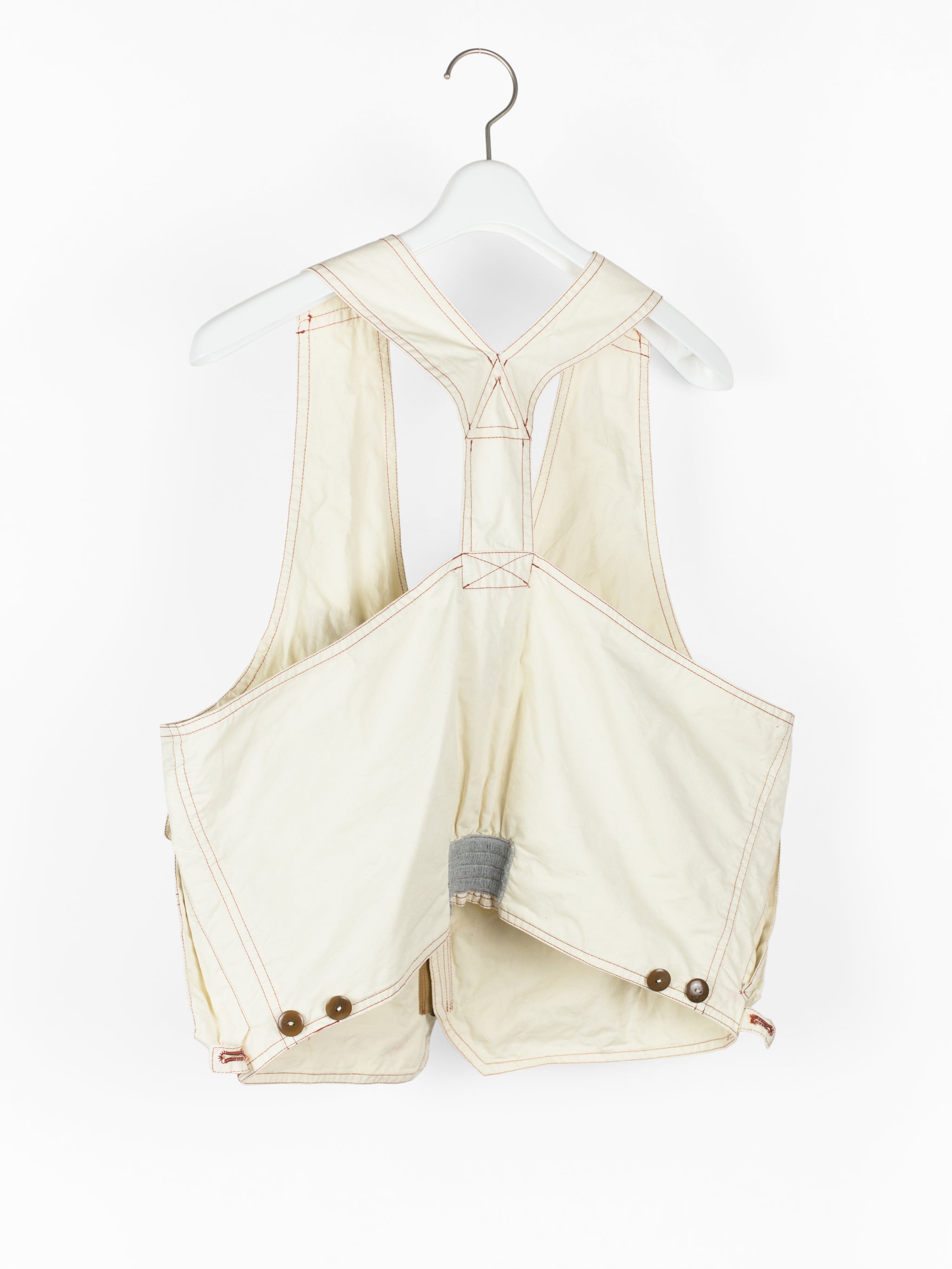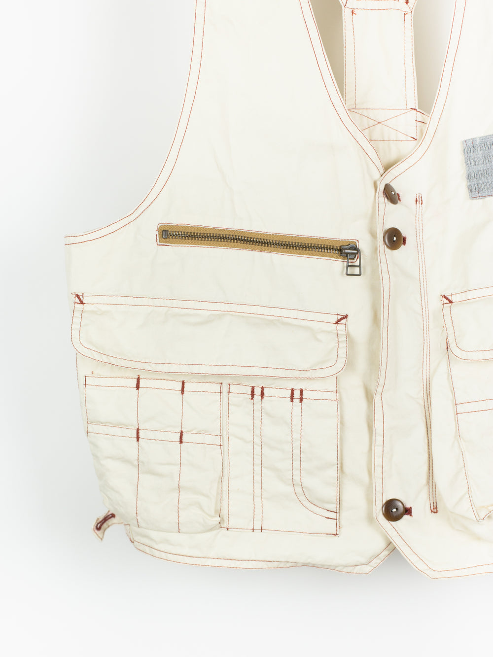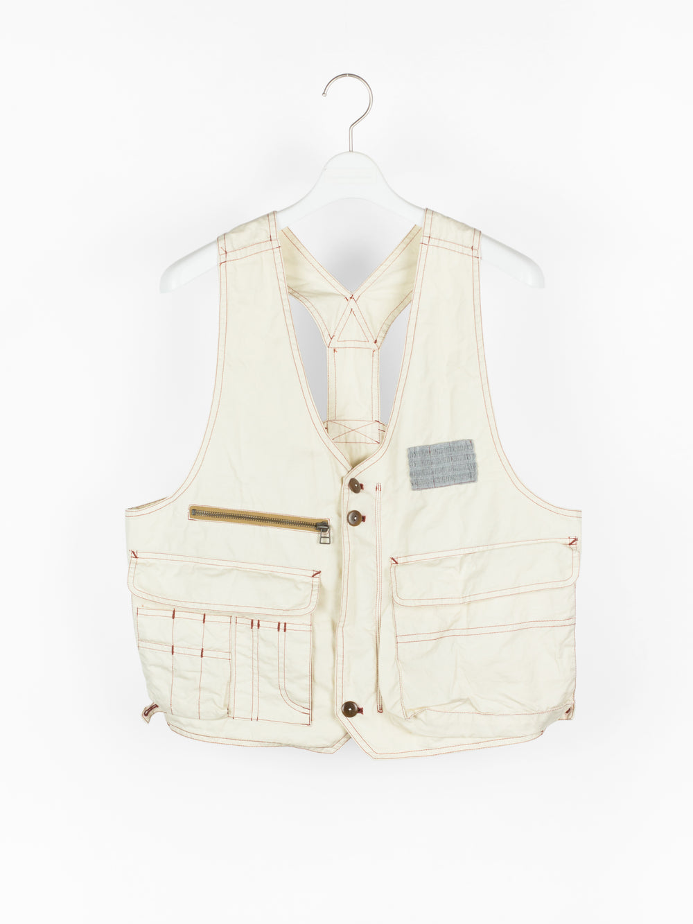 Light cotton poplin cargo vest from Shigehiko Taguchi, featuring an array of zippered and flap-closed cargo pockets. Amazingly easy to wear and fun to layer with. The lightness means its great for spring/summer. Button + zipper closure at the front with snap waist cinches. Contrast red thread brings some welcome contrast.