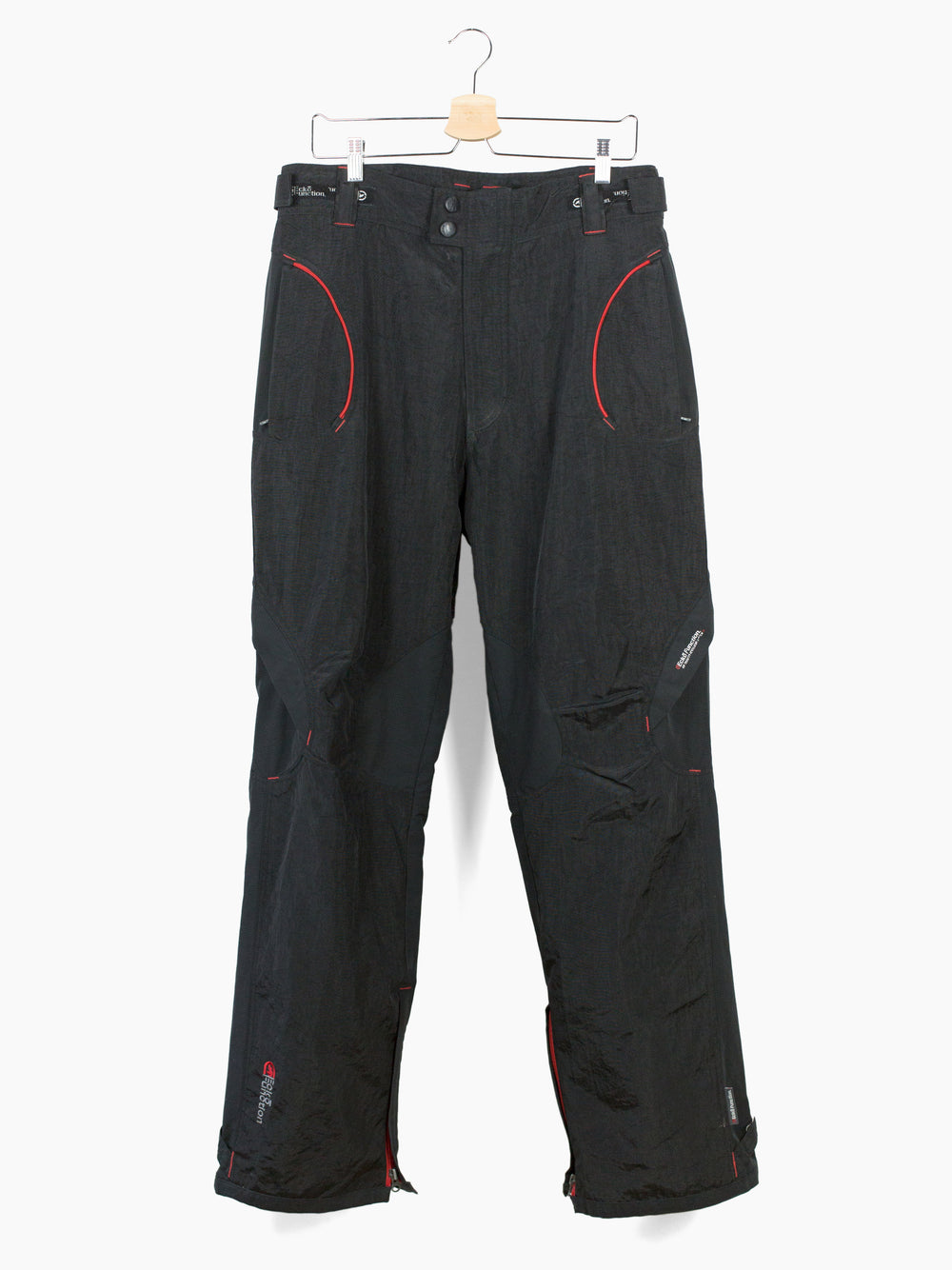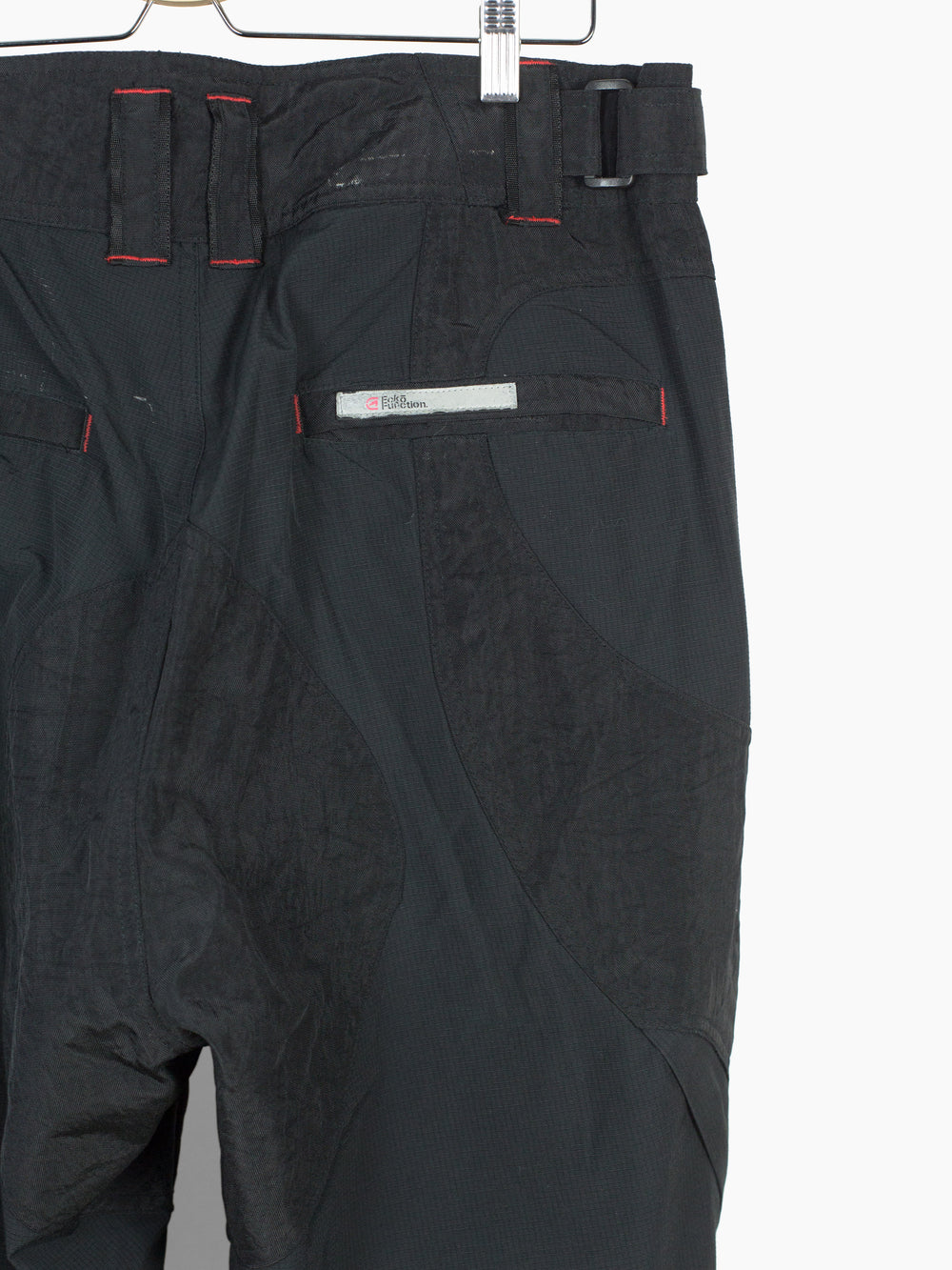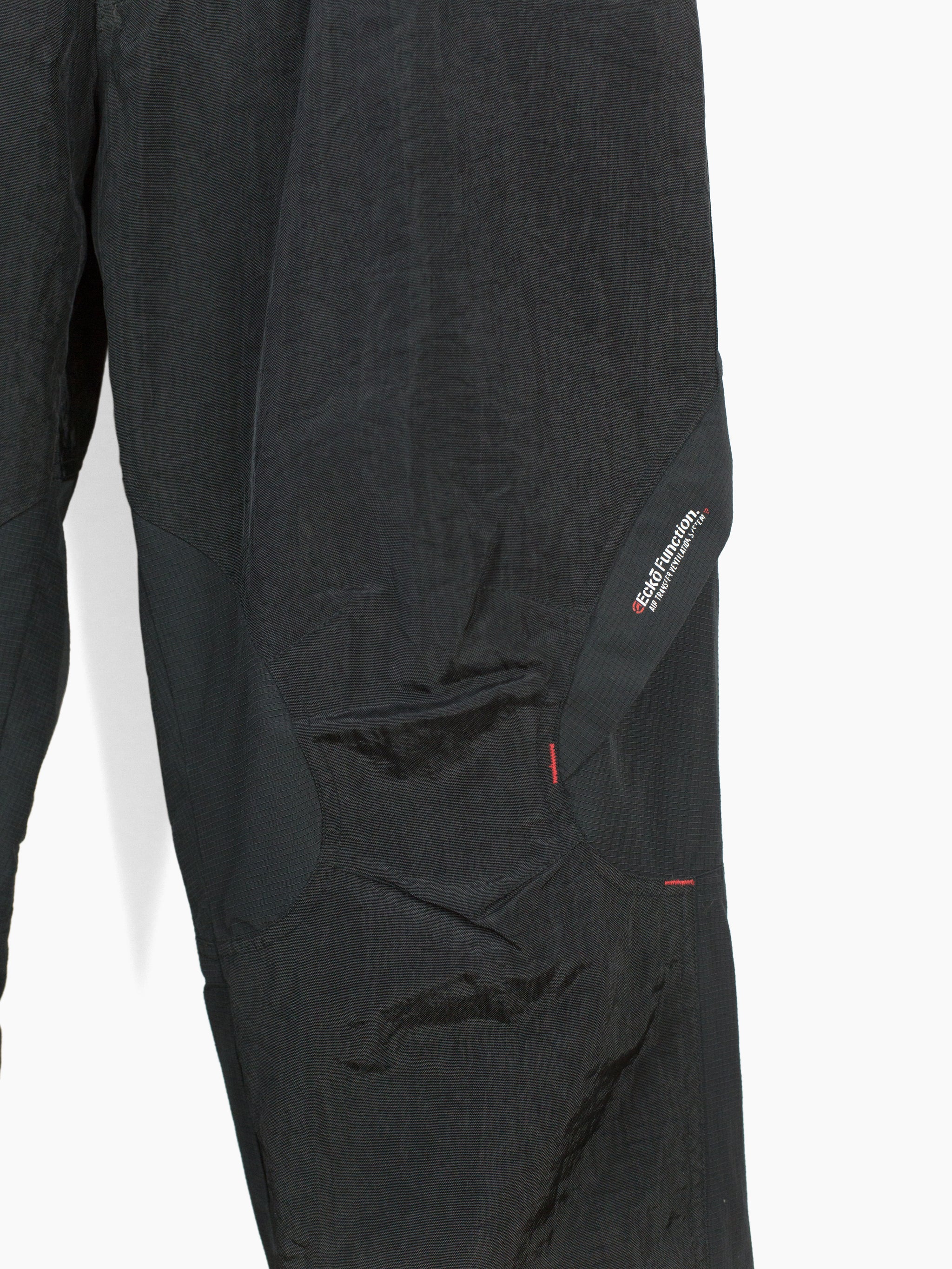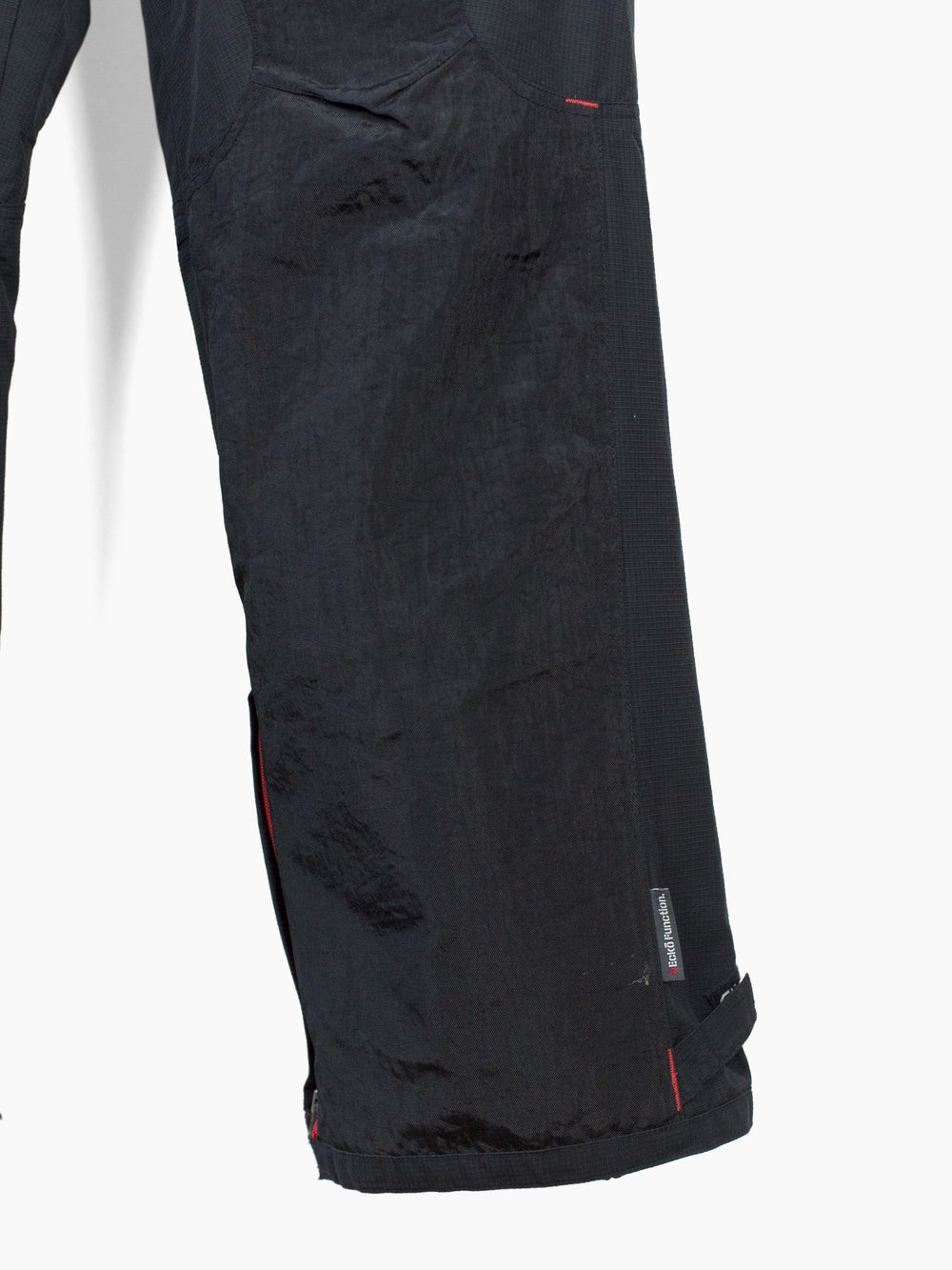 Mechanical legwear from early 2000s Ecko Function, featuring canted articulated knees and directional elliptical panelling throughout in contrast crinkle/ripstop nylon blends. Red coil zipper "piping" as accents. Zippered mesh vents are tucked under flaps at outer lateral knees to adjust climate and comfort. Instep-zippered hem features inner snowboard-style gaiter, itself openable with velcro + snap.