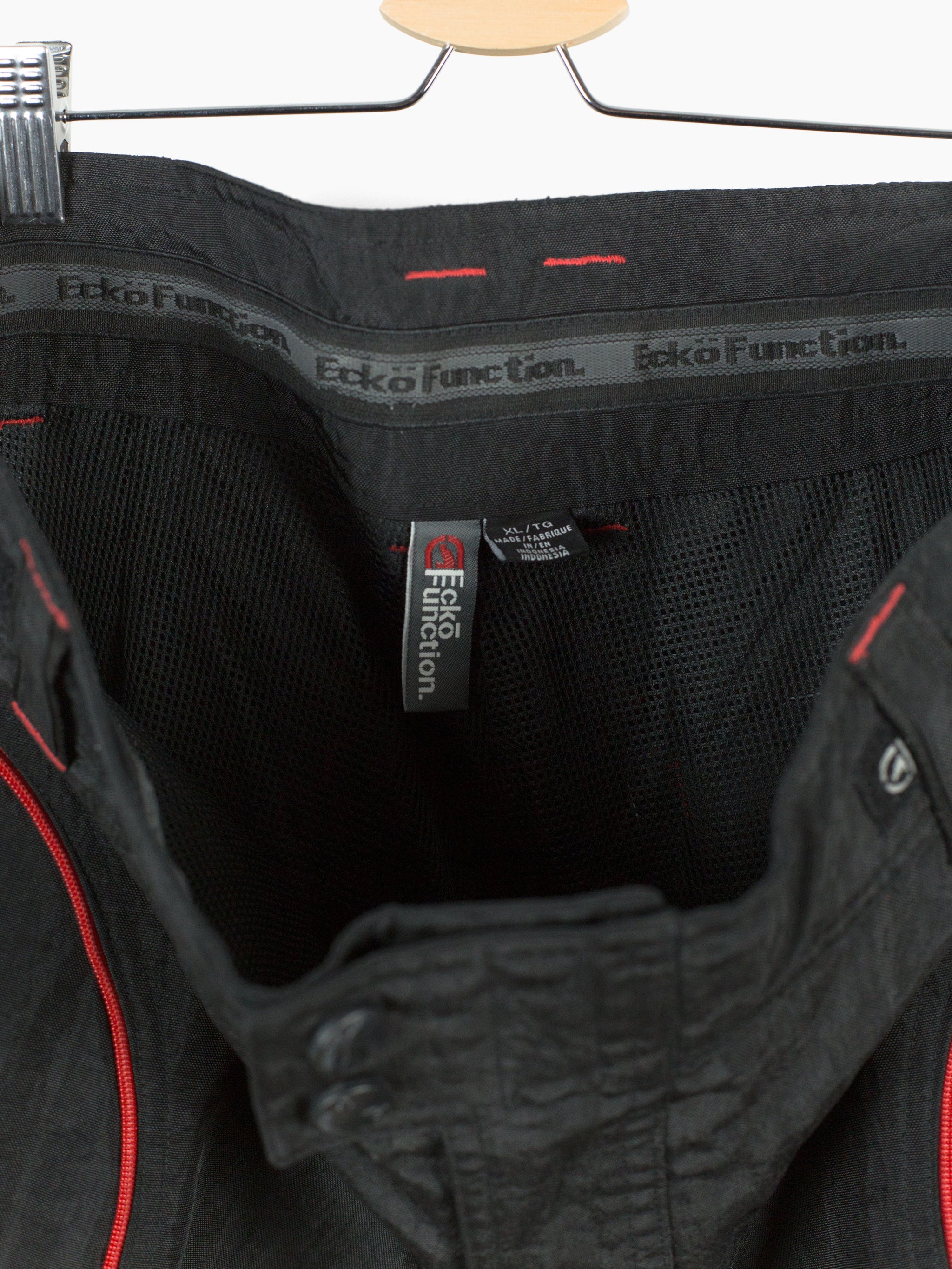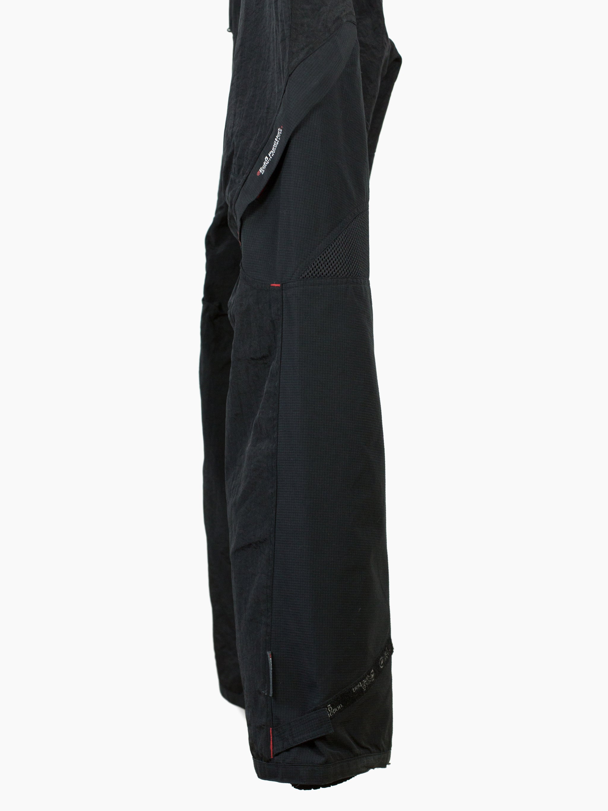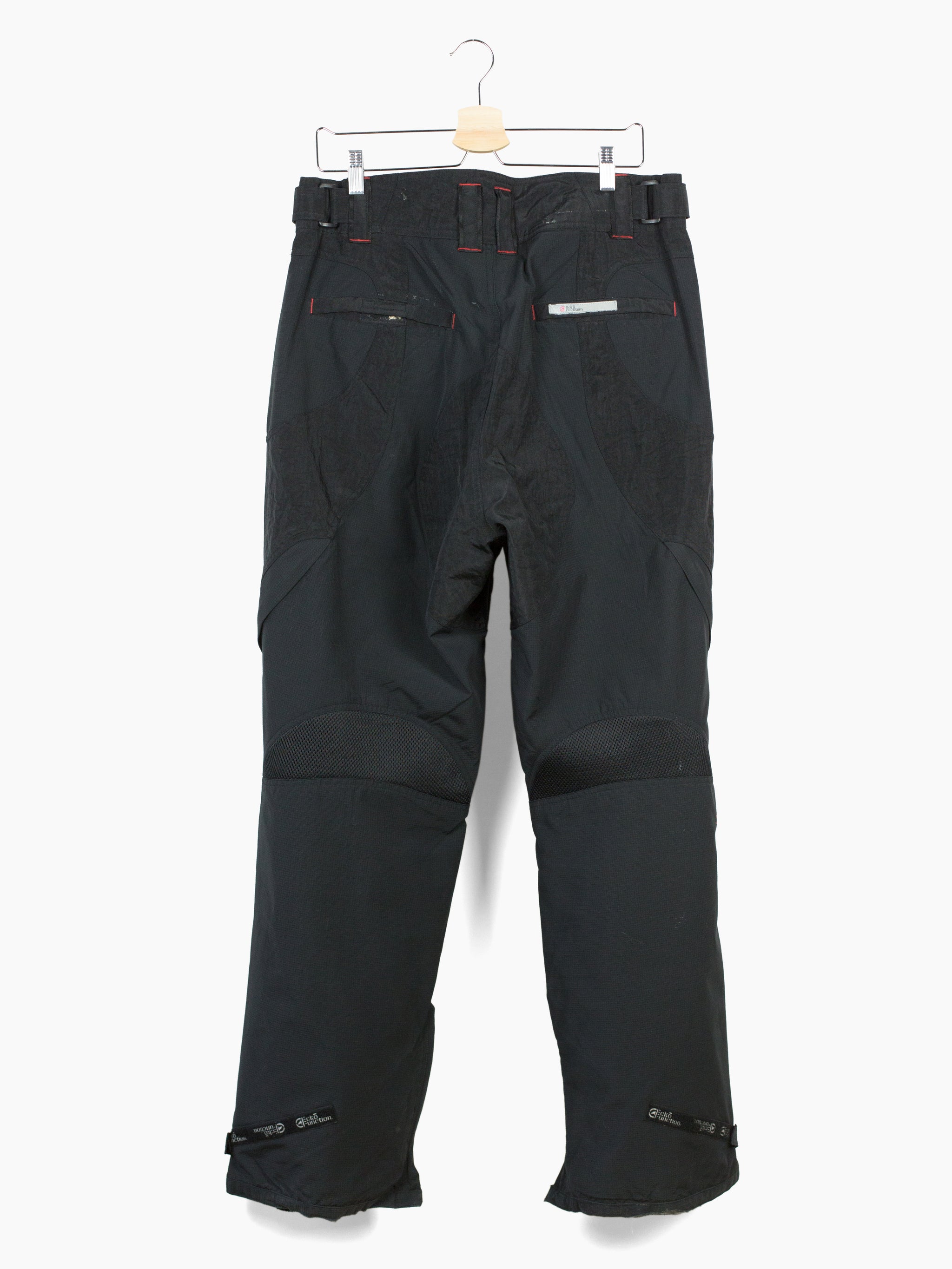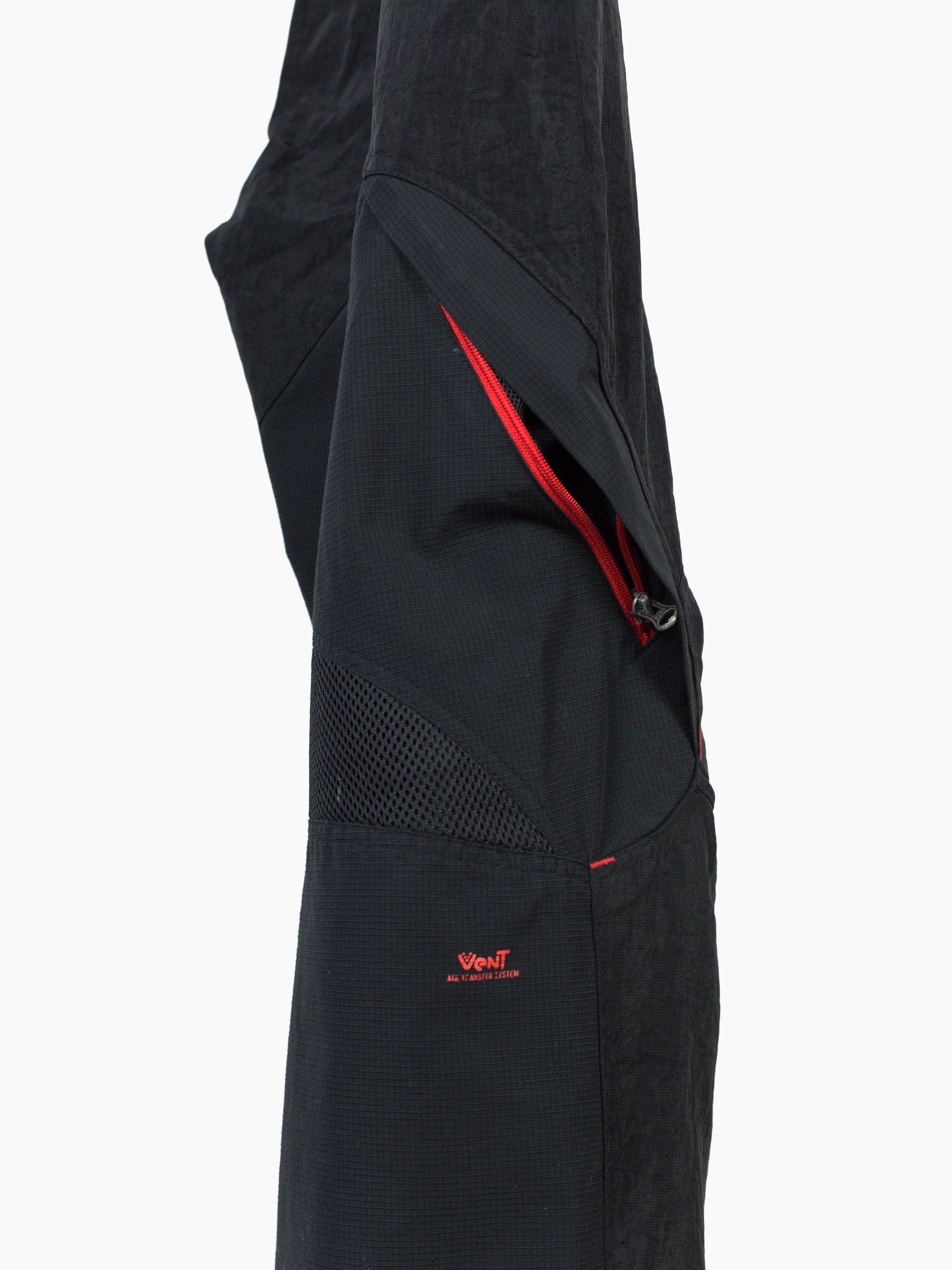 Mechanical legwear from early 2000s Ecko Function, featuring canted articulated knees and directional elliptical panelling throughout in contrast crinkle/ripstop nylon blends. Red coil zipper "piping" as accents. Zippered mesh vents are tucked under flaps at outer lateral knees to adjust climate and comfort. Instep-zippered hem features inner snowboard-style gaiter, itself openable with velcro + snap.