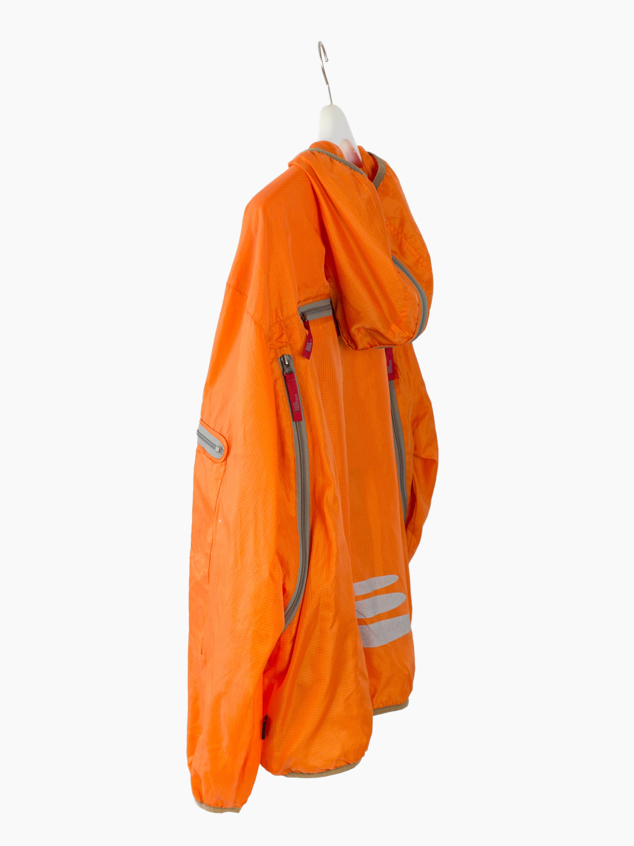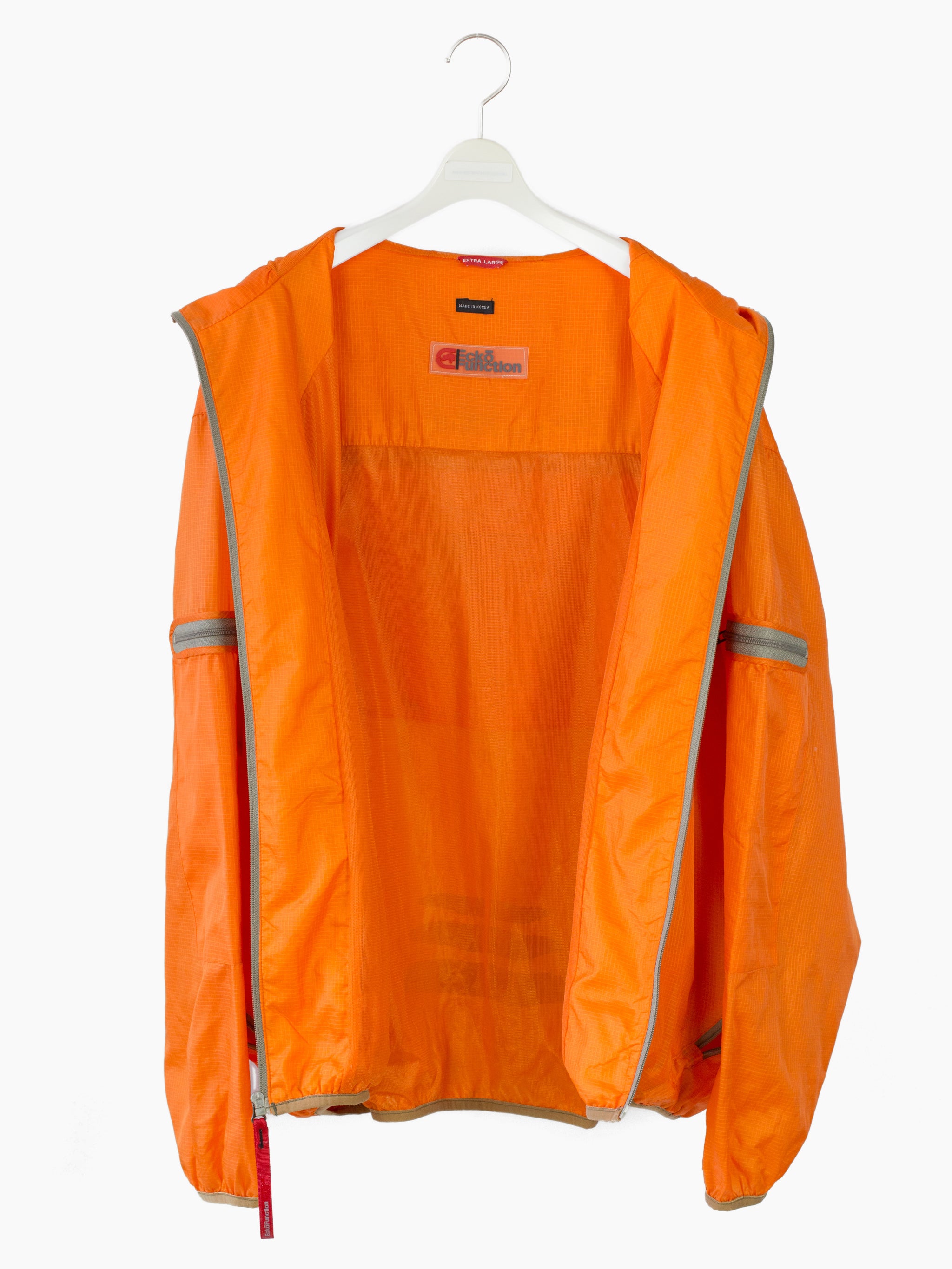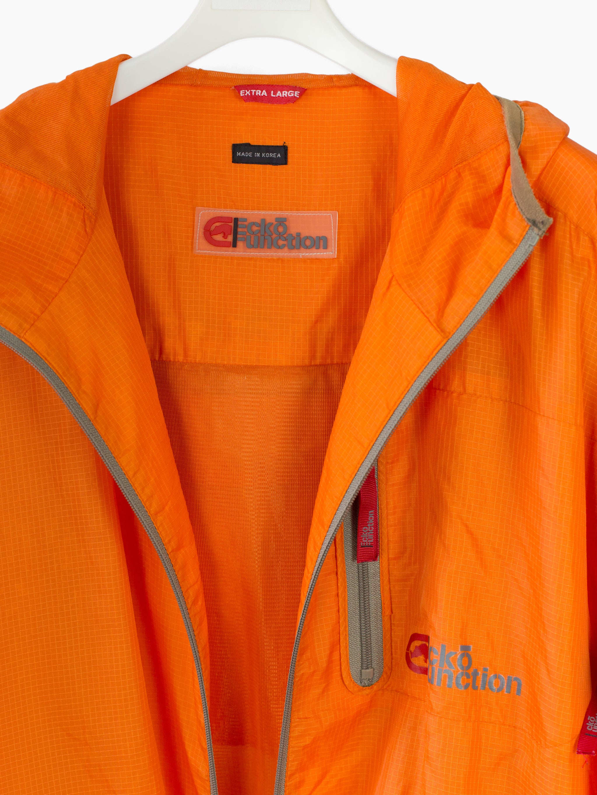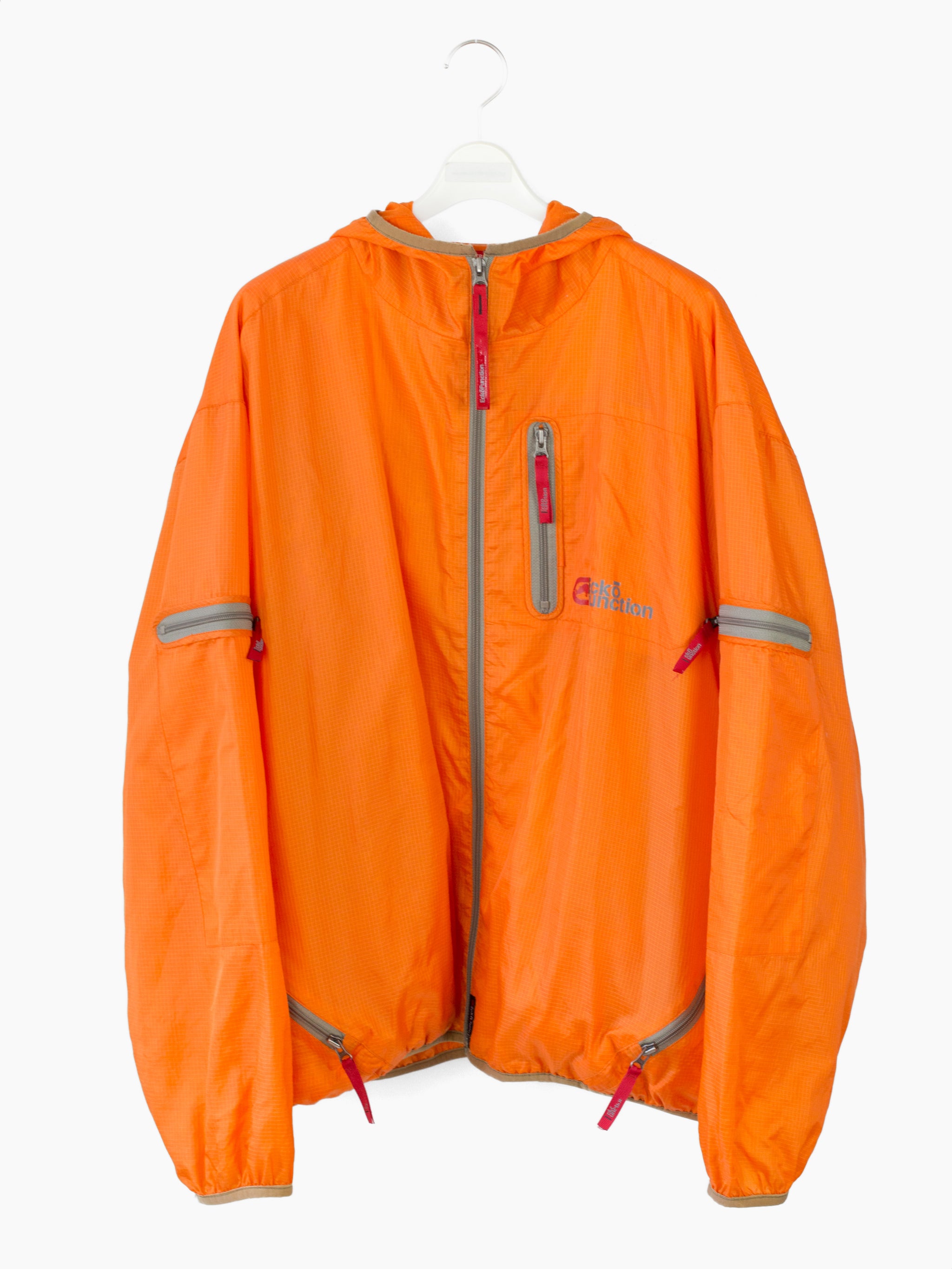 Ripstop nylon tracksuit from early 2000s Ecko Function, featuring contrast khaki/grey zippers and vented detailing. On the jacket, zippers arc around the lateral body from mid back to waist and serve as both sizeable mesh-lined vents and hand pockets. There are additional zippered accents in the form of two large sleeve pockets, large stow pocket at upper back, chest pocket, and center vent at the hood. The entire jacket is mesh-lined for next-to-skin comfort with elasticated trims at cuffs, waist, and collar.