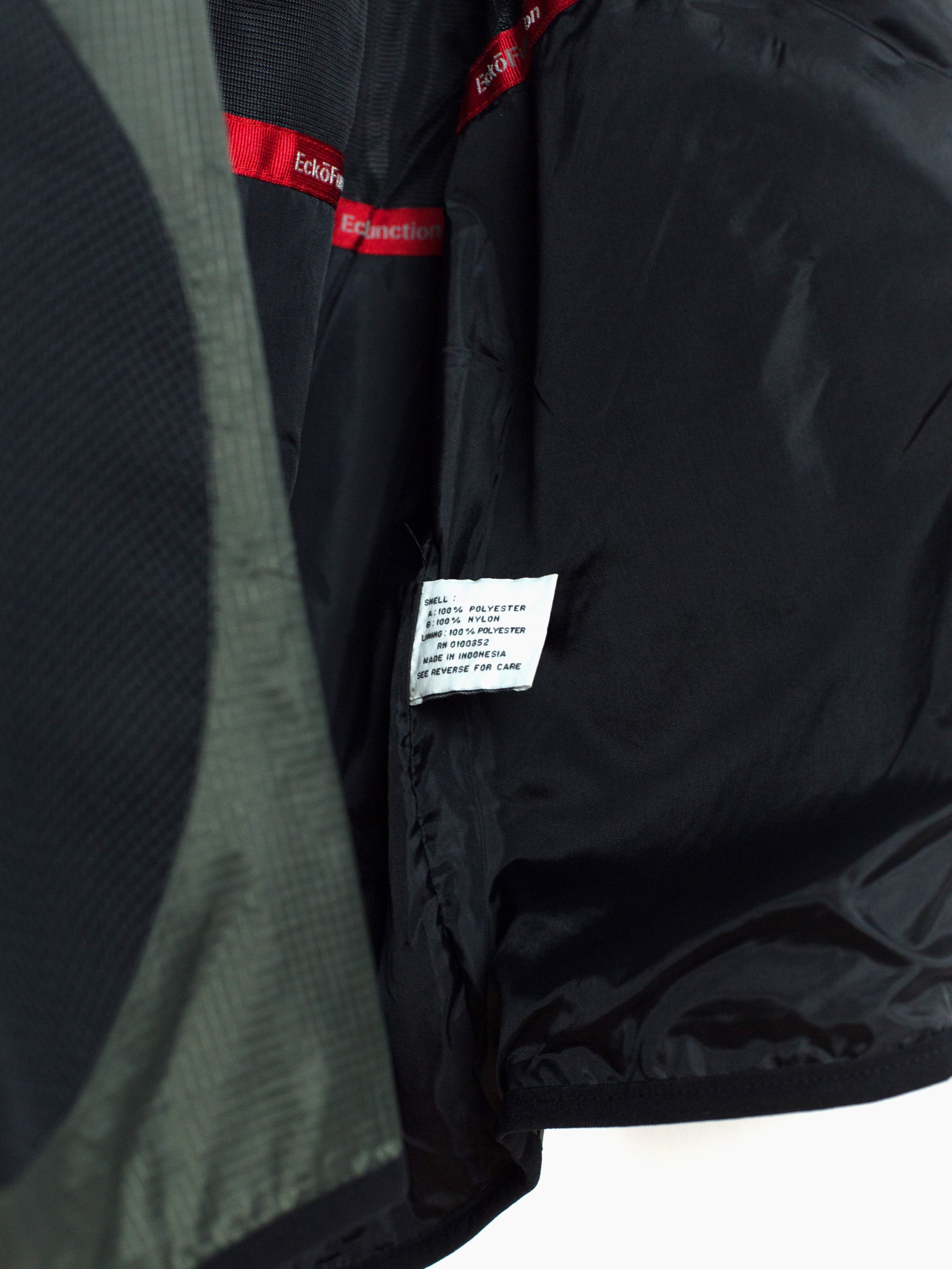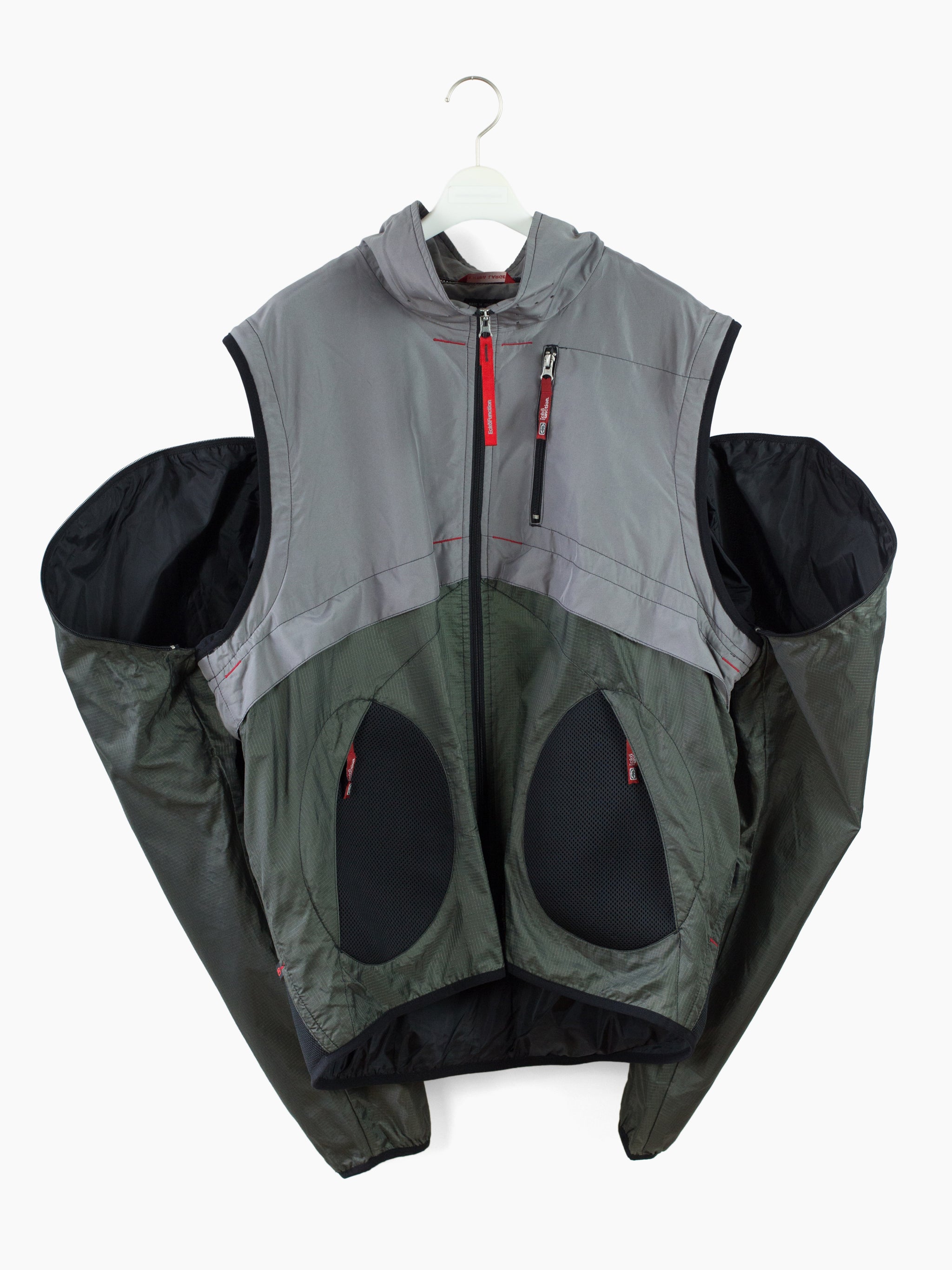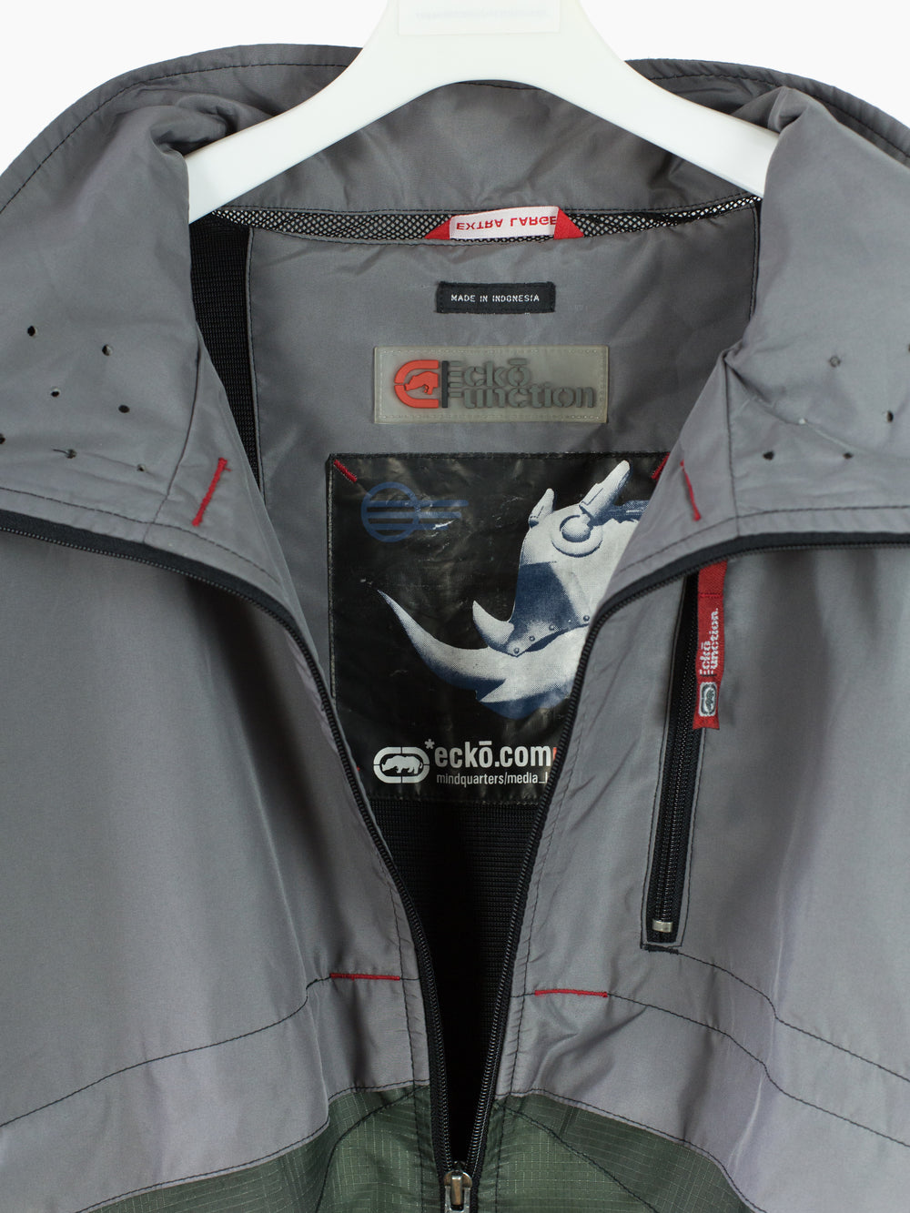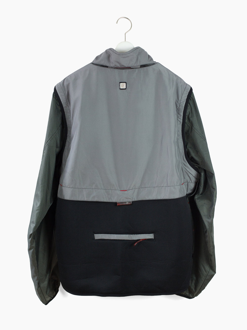 Retrofuturistic streetwear-technical, embodied in this convertible Ecko Function shell jacket. Statement detail is undoubtedly the ovular zippered waist pockets, cut from spacer mesh to create a forward aesthetic that points towards alien eggs, rocket exhaust nozzles, or blearing sound systems. The rest of the jacket is composed of a 2-tone grey nylon face fabric for varying shades of metallic/mechanical and features laser-cut vent holes at the collar (+ articulated mesh insert at back of neck). Fully removable sleeves increase versatility when it comes to styling and personal climate control. Finished with single zippered chest pocket and zippered back dump pocket, and mesh lined through the entire body.