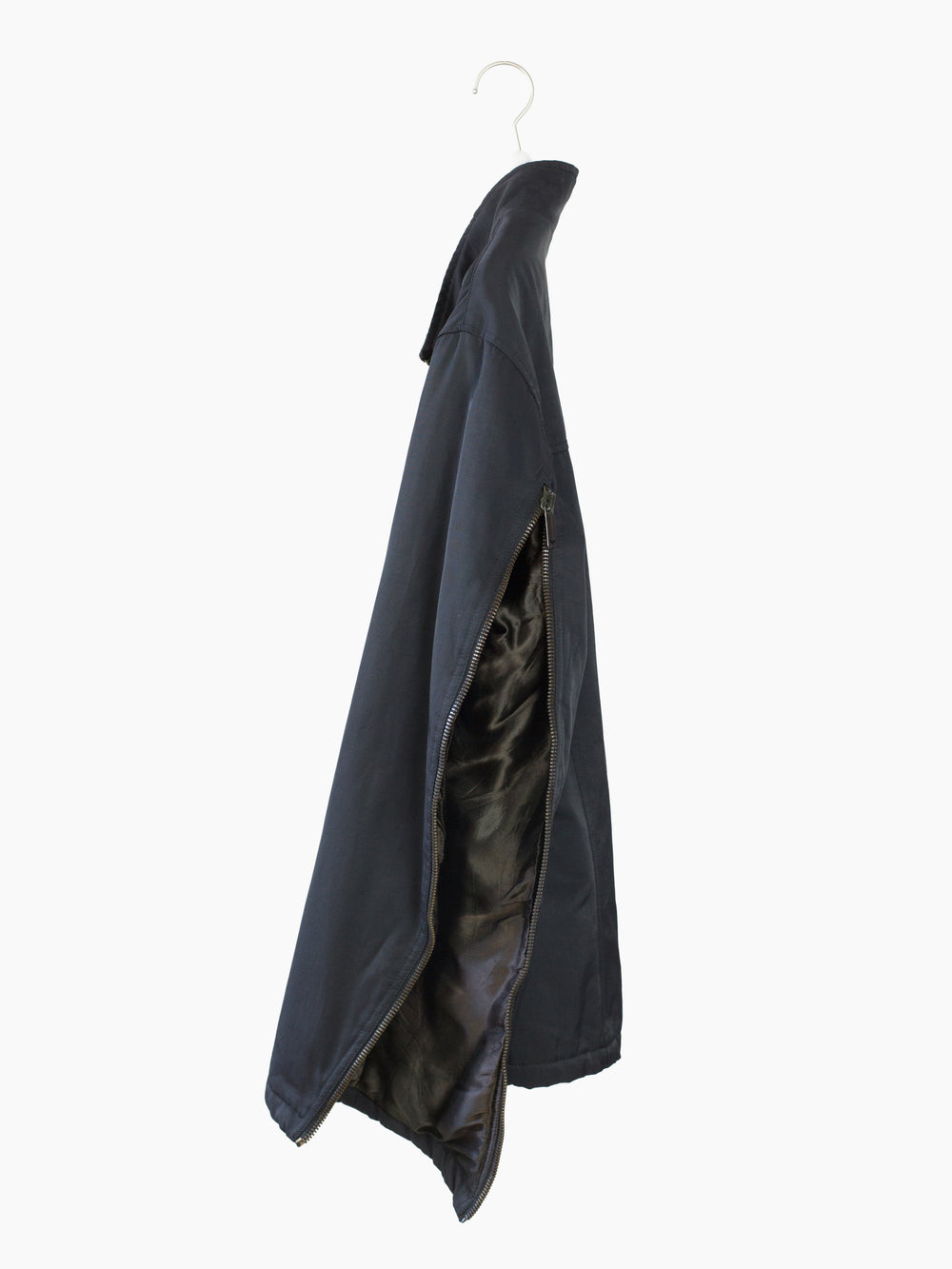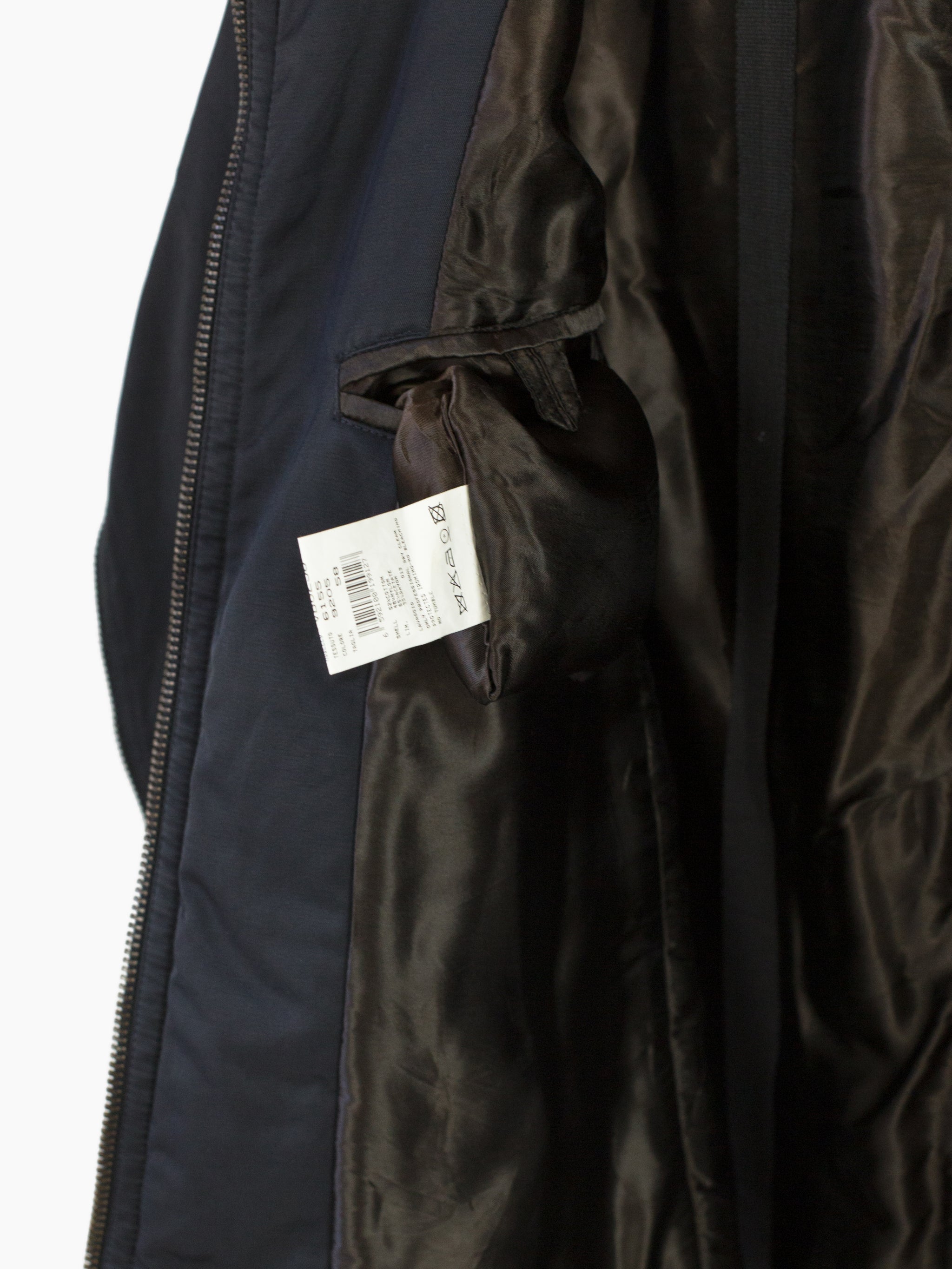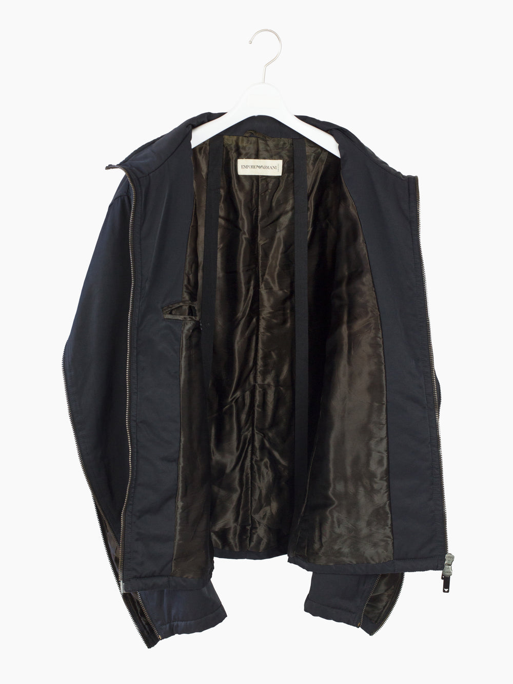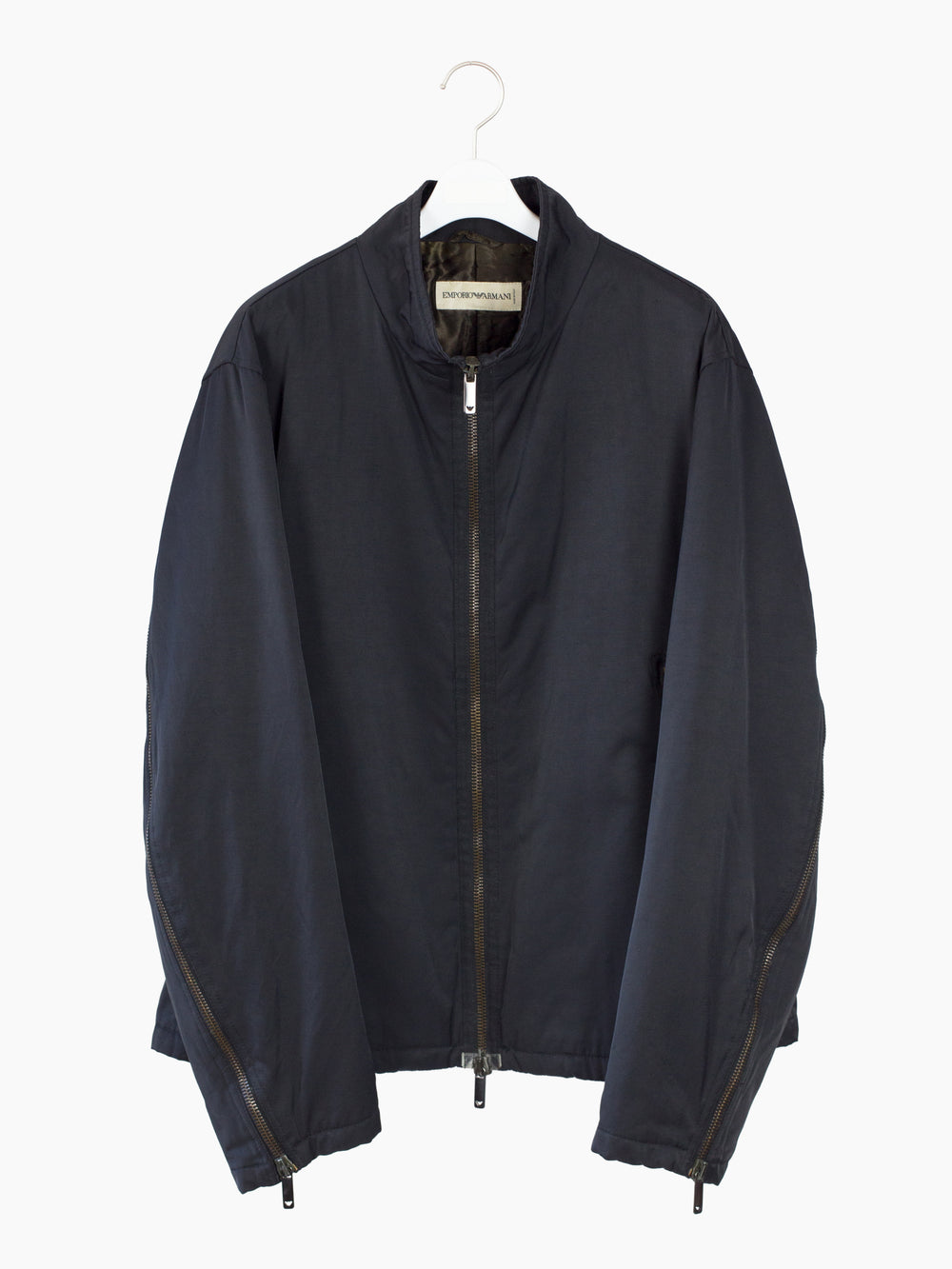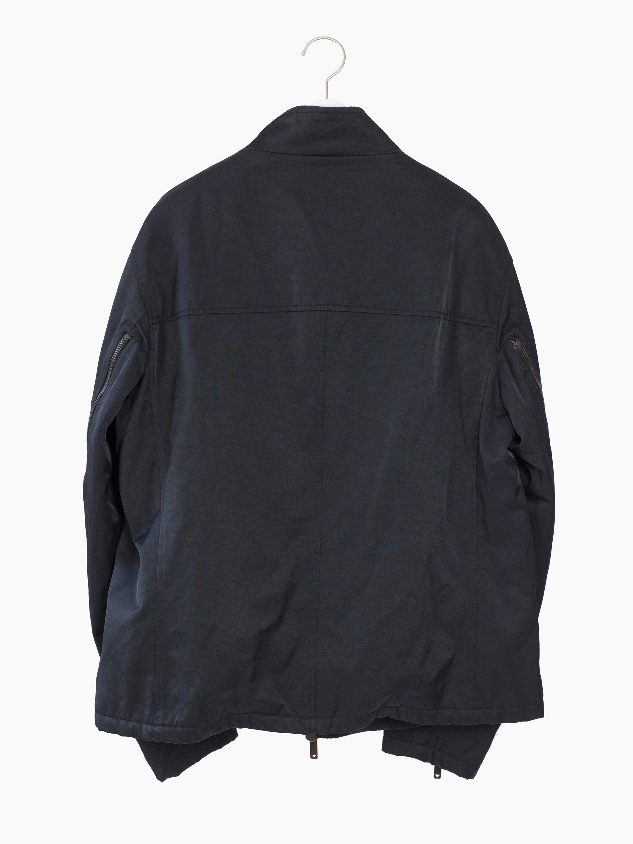 Zip-up jacket from Armani, featuring statement rear sleeve zippers that open the arms up to the armpits for a cape-like look. Slightly lustrous cotton/nylon blend face fabric balances luxury and utility. Silk-hand acetate blend lining and light insulation for 3-season wearability and comfort. Finished with two-way front zipper closure and two zippered waist pockets. Interior shoulder strap system allows the jacket to be worn as a backpack.