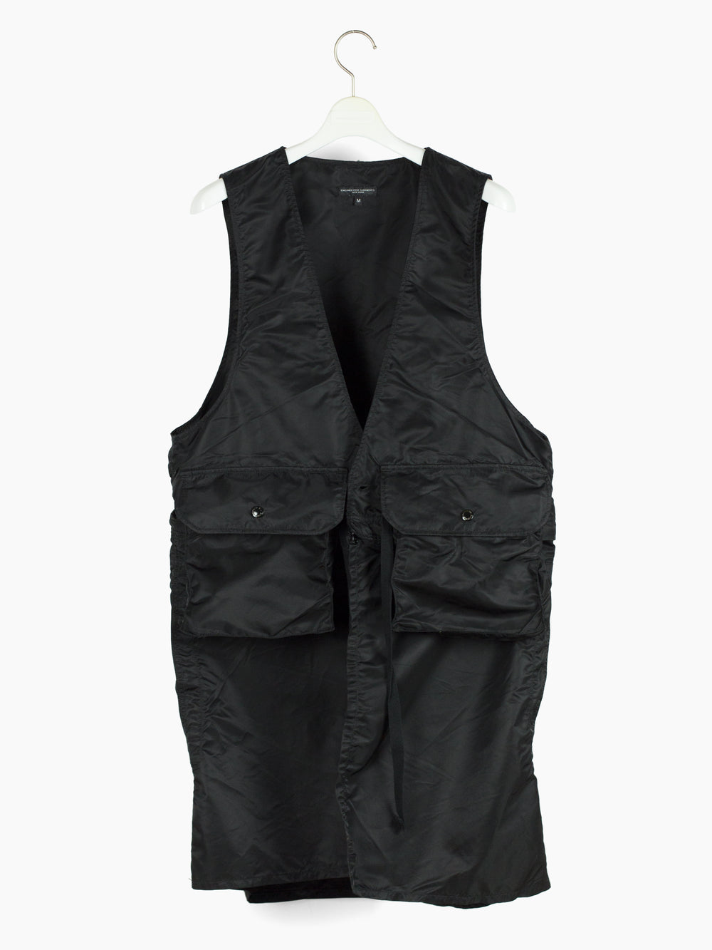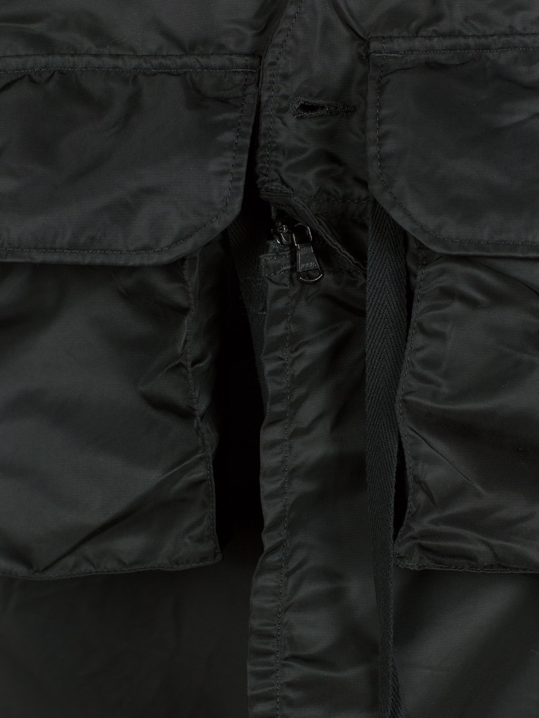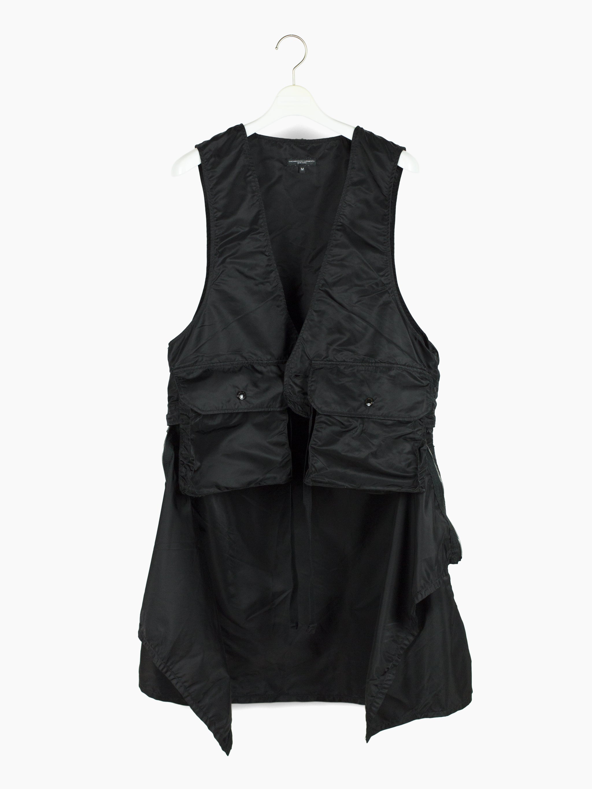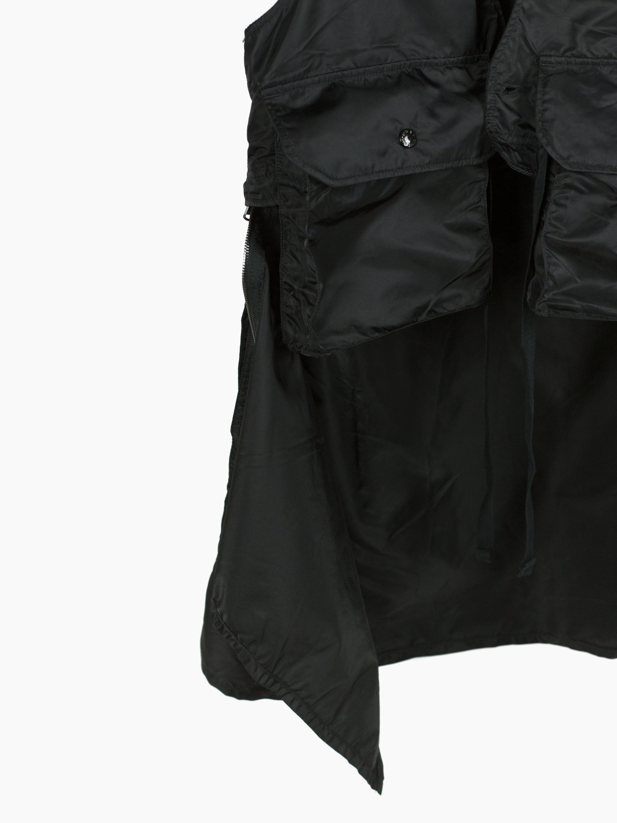 Here is an Engineered Garments game vest rendered in an uncharacteristic black bomber nylon satin, cut with a zipper-detachable skirt panel that allows for a multitude of styling options. Zip the front open and let the underlayer drape at the sides or remove it fully for a more streamlined vest look. The long layer provides coverage against wind and rain while the gusseted cargo pockets provide ample storage for whatever belongings one has to carry with them.