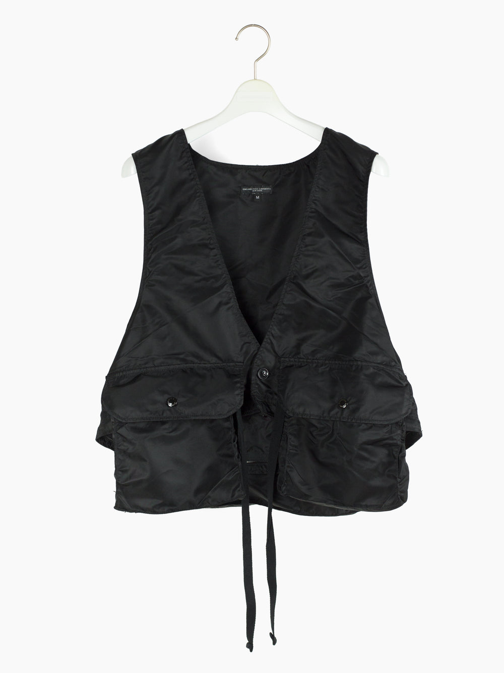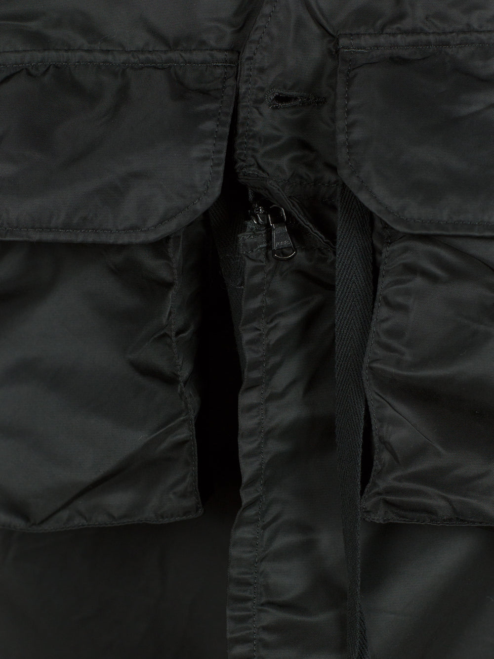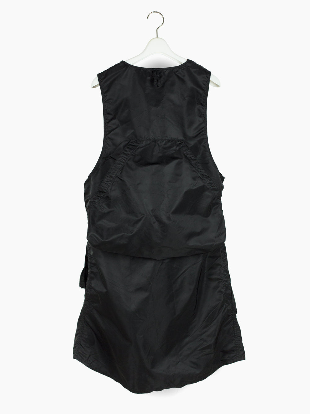 Here is an Engineered Garments game vest rendered in an uncharacteristic black bomber nylon satin, cut with a zipper-detachable skirt panel that allows for a multitude of styling options. Zip the front open and let the underlayer drape at the sides or remove it fully for a more streamlined vest look. The long layer provides coverage against wind and rain while the gusseted cargo pockets provide ample storage for whatever belongings one has to carry with them.