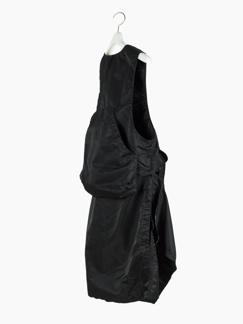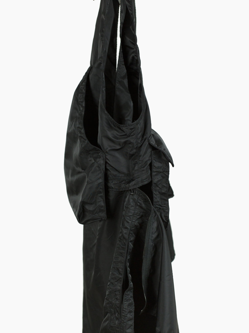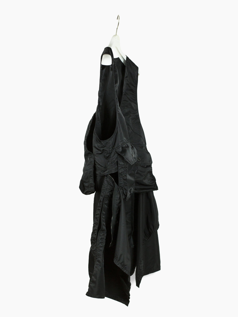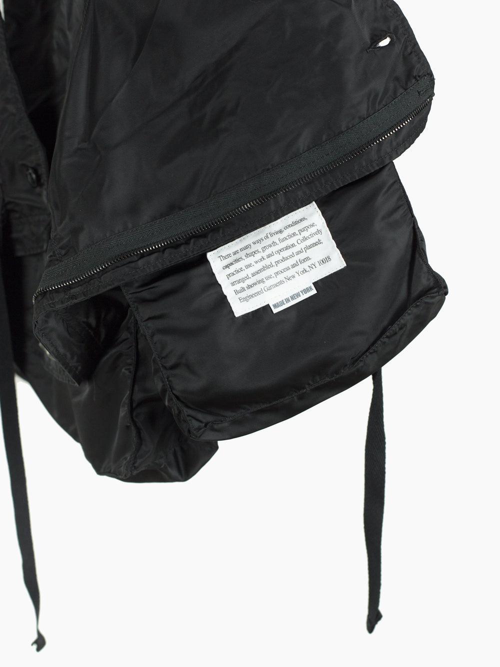 Here is an Engineered Garments game vest rendered in an uncharacteristic black bomber nylon satin, cut with a zipper-detachable skirt panel that allows for a multitude of styling options. Zip the front open and let the underlayer drape at the sides or remove it fully for a more streamlined vest look. The long layer provides coverage against wind and rain while the gusseted cargo pockets provide ample storage for whatever belongings one has to carry with them.