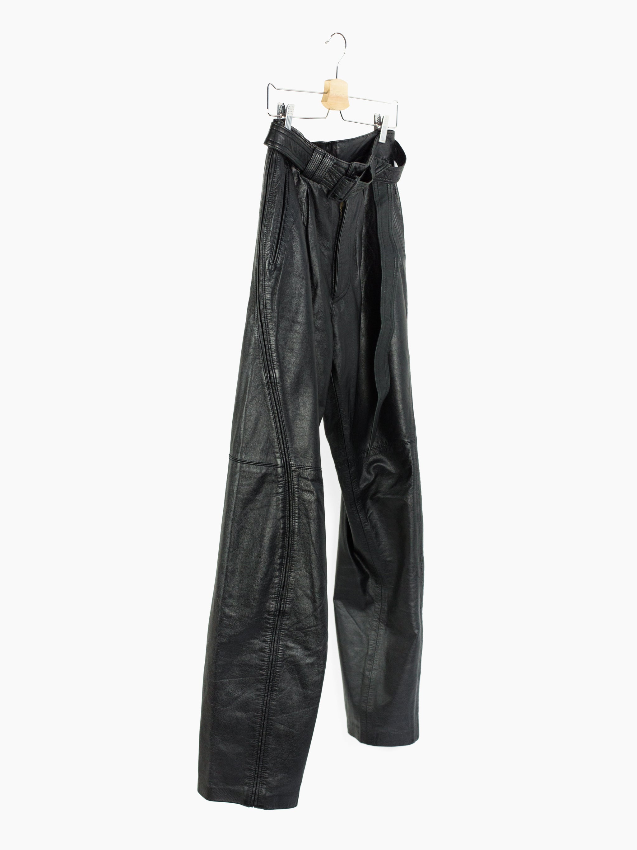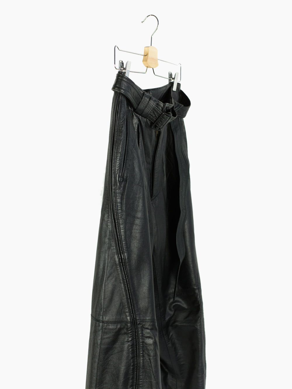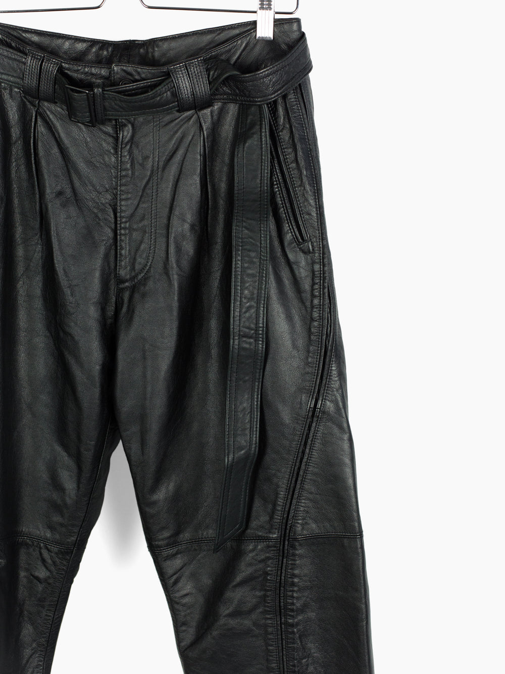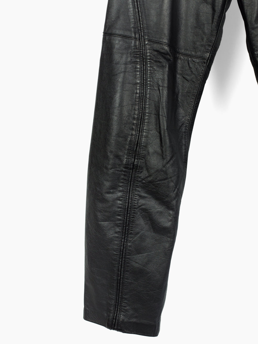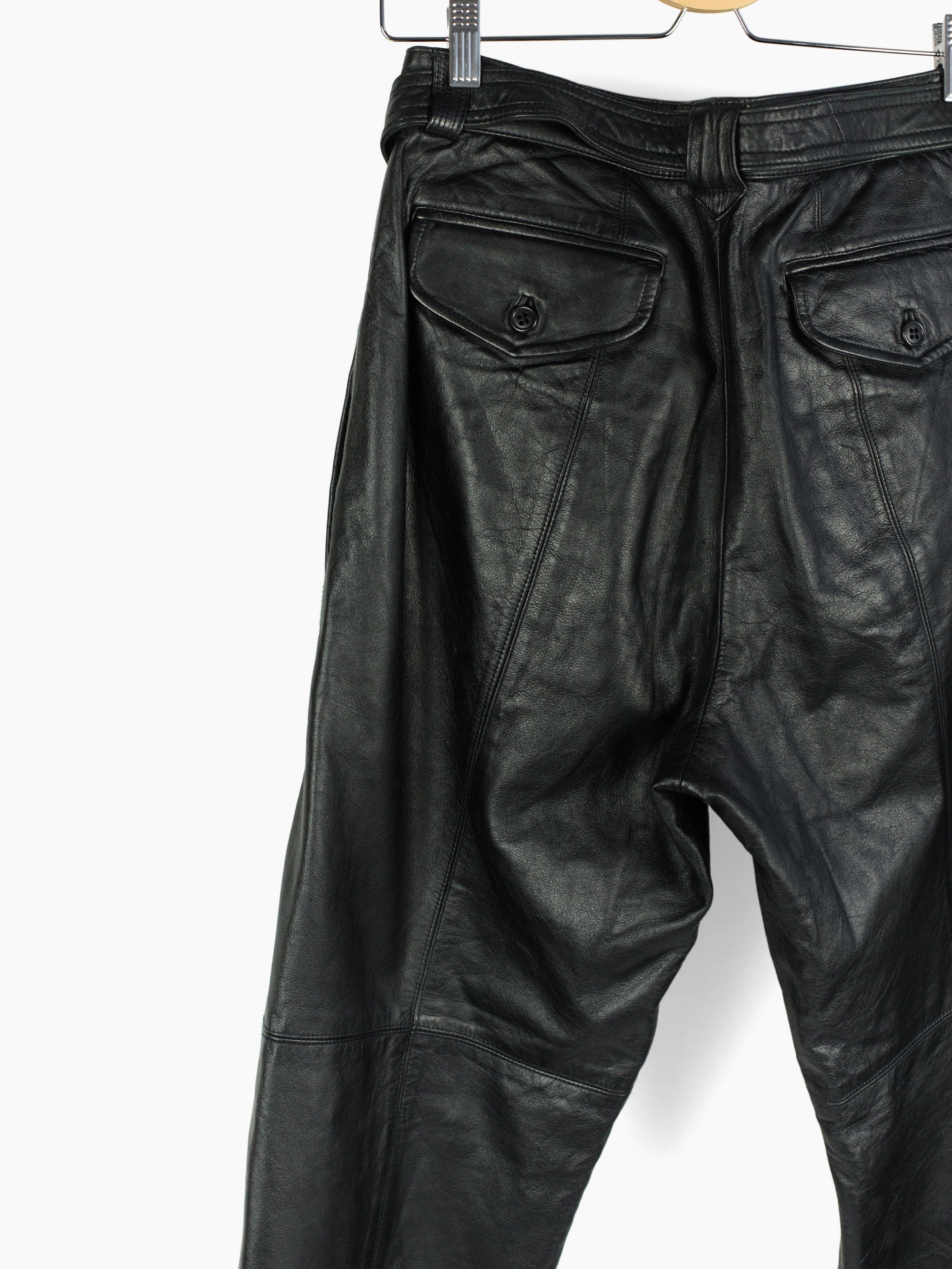 Black Cowhide leather moto trousers from Japanese brand Ficce (by Yoshiyuki Konishi), featuring statement curved leg paneling that wraps around the lateral waist towards the front to create a dark, futuristic look. Rectilinear topstitched panel lines break up the garment visually and create a beautiful contrast in 'line weight' compared to the central curved joint. Single inverted box pleat at each side of the waist creates an elegantly voluminous top block.
