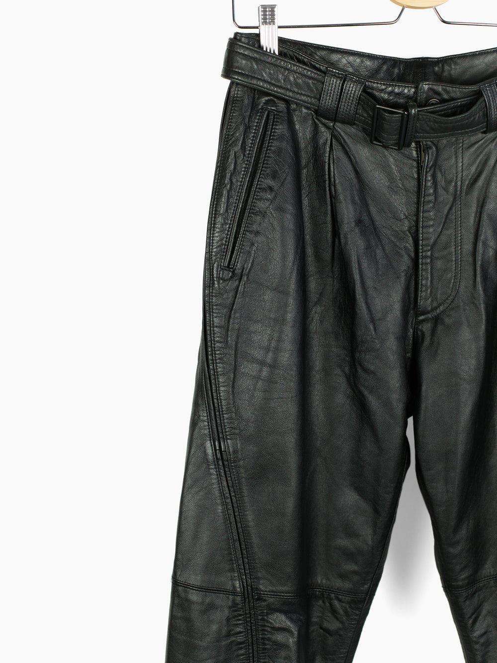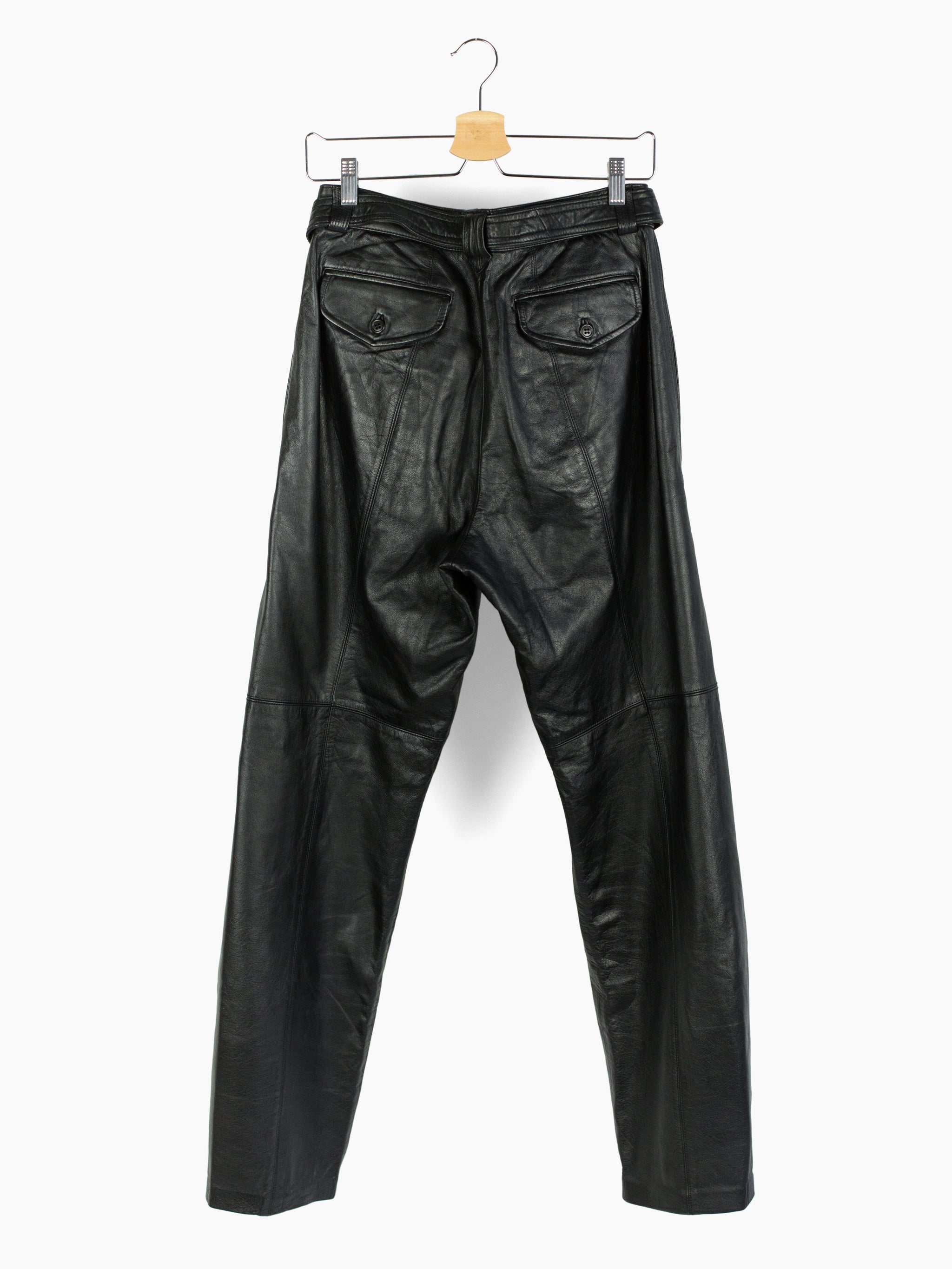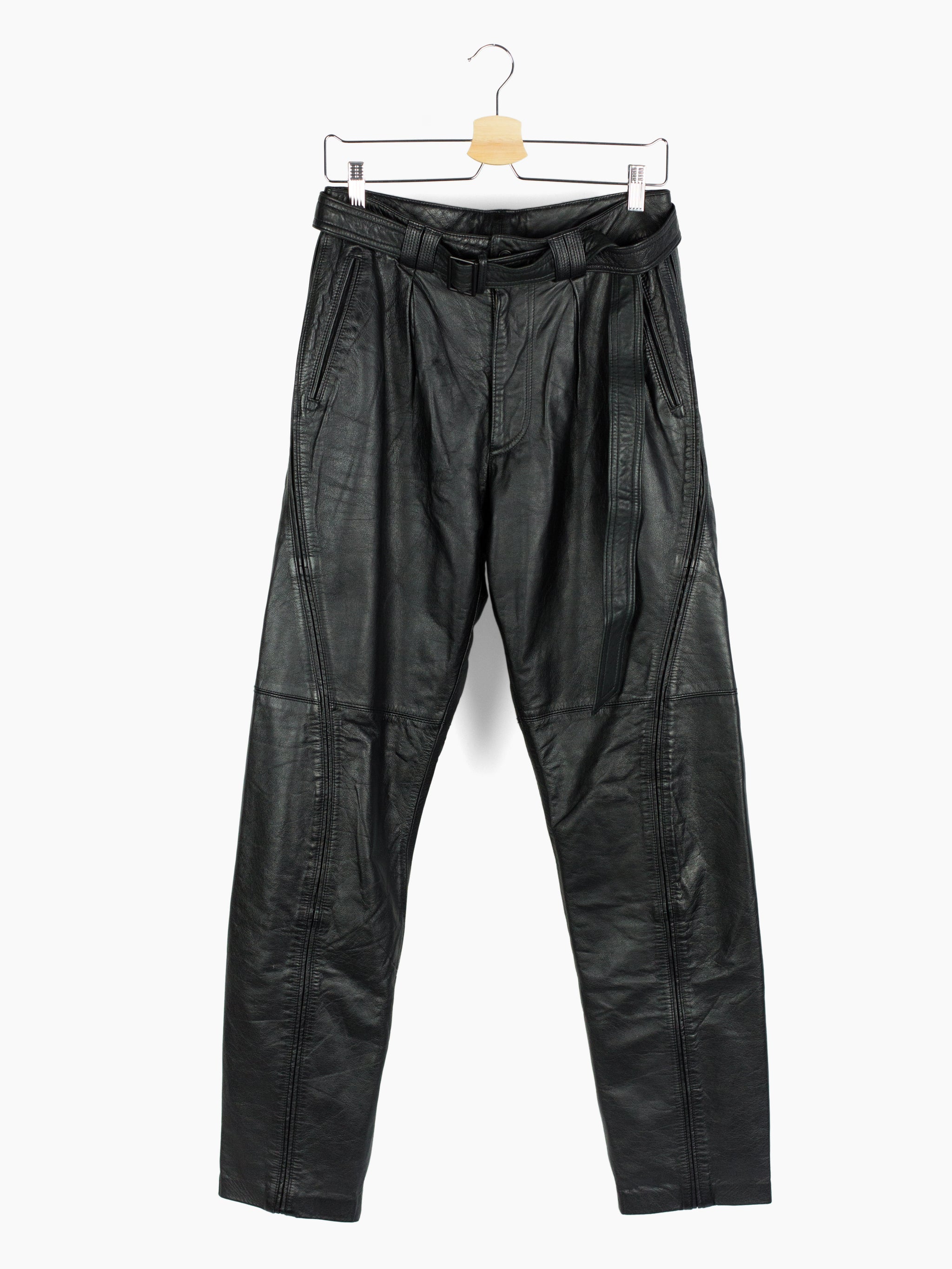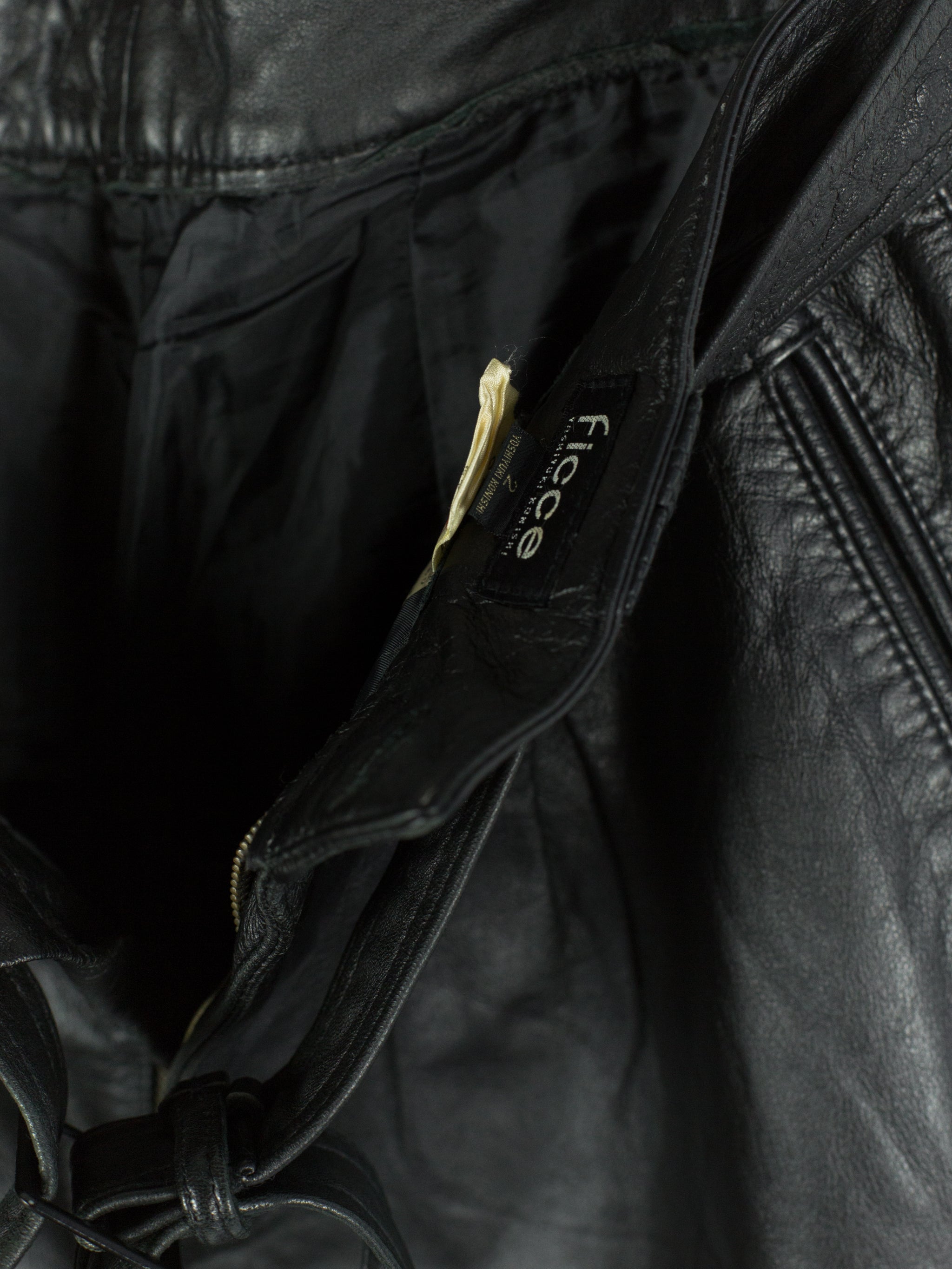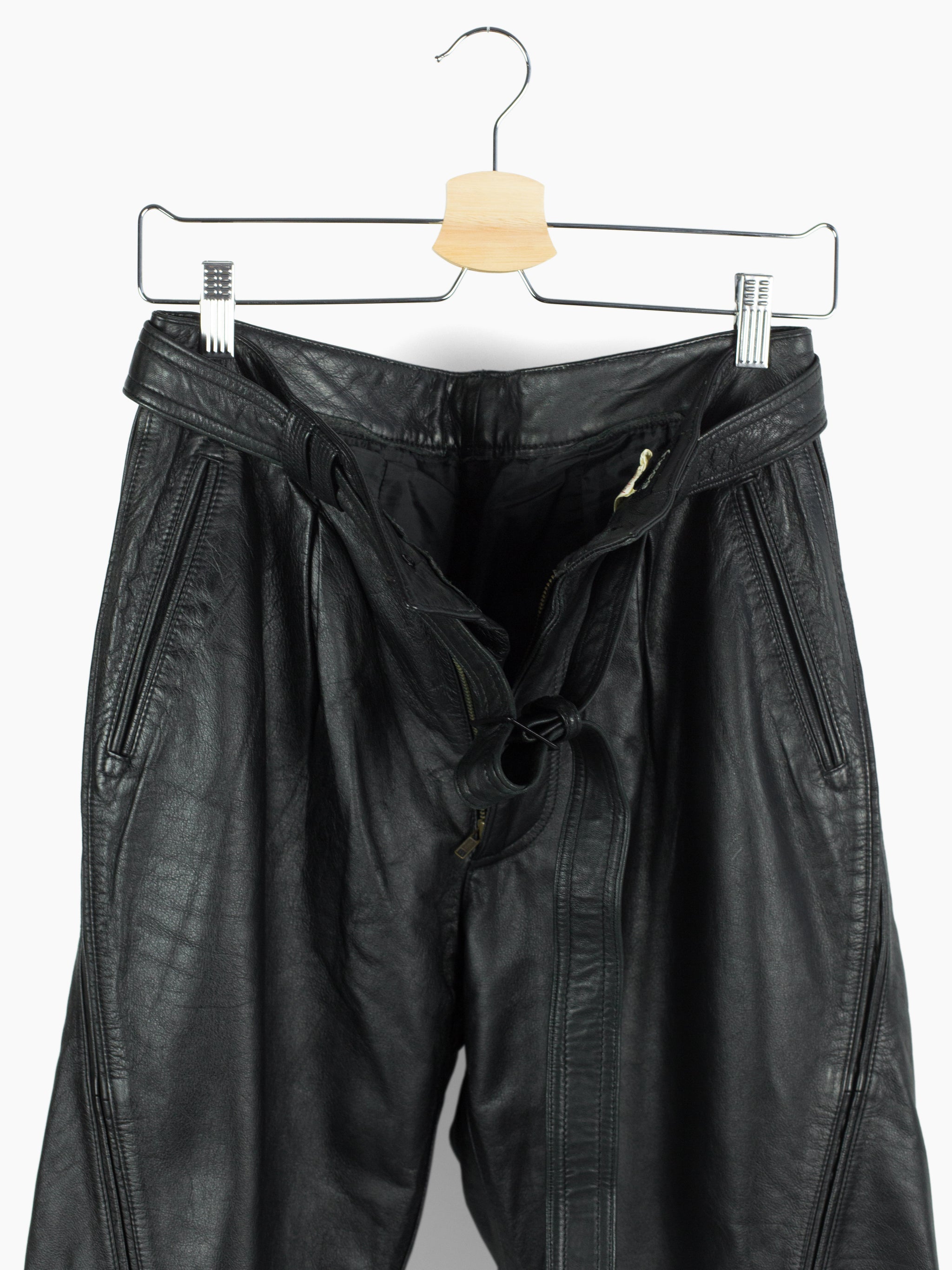 Black Cowhide leather moto trousers from Japanese brand Ficce (by Yoshiyuki Konishi), featuring statement curved leg paneling that wraps around the lateral waist towards the front to create a dark, futuristic look. Rectilinear topstitched panel lines break up the garment visually and create a beautiful contrast in 'line weight' compared to the central curved joint. Single inverted box pleat at each side of the waist creates an elegantly voluminous top block.