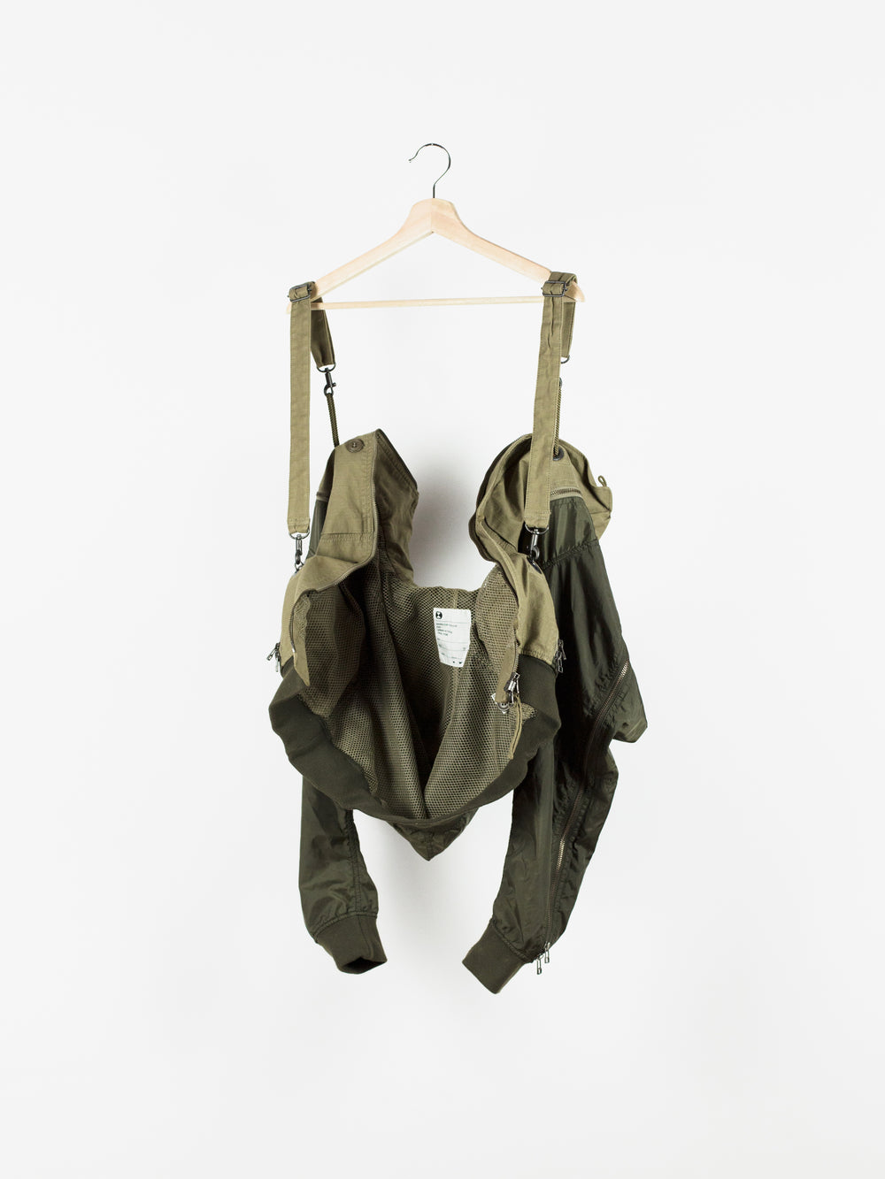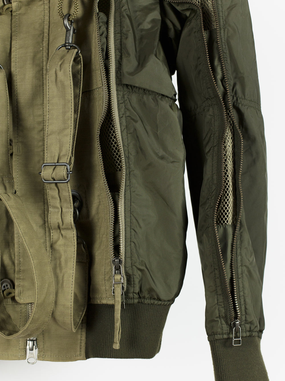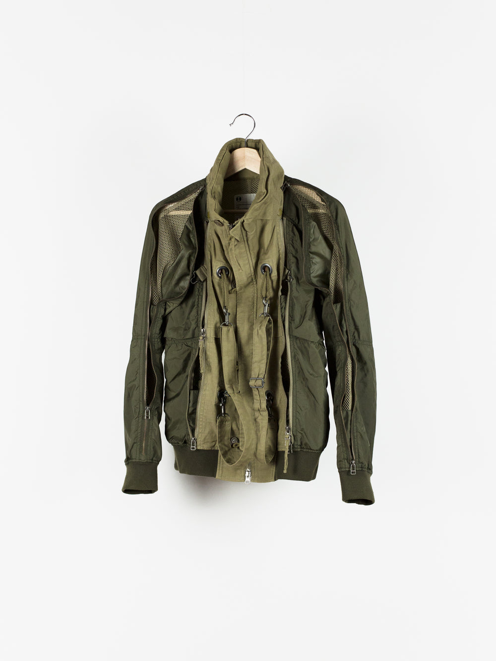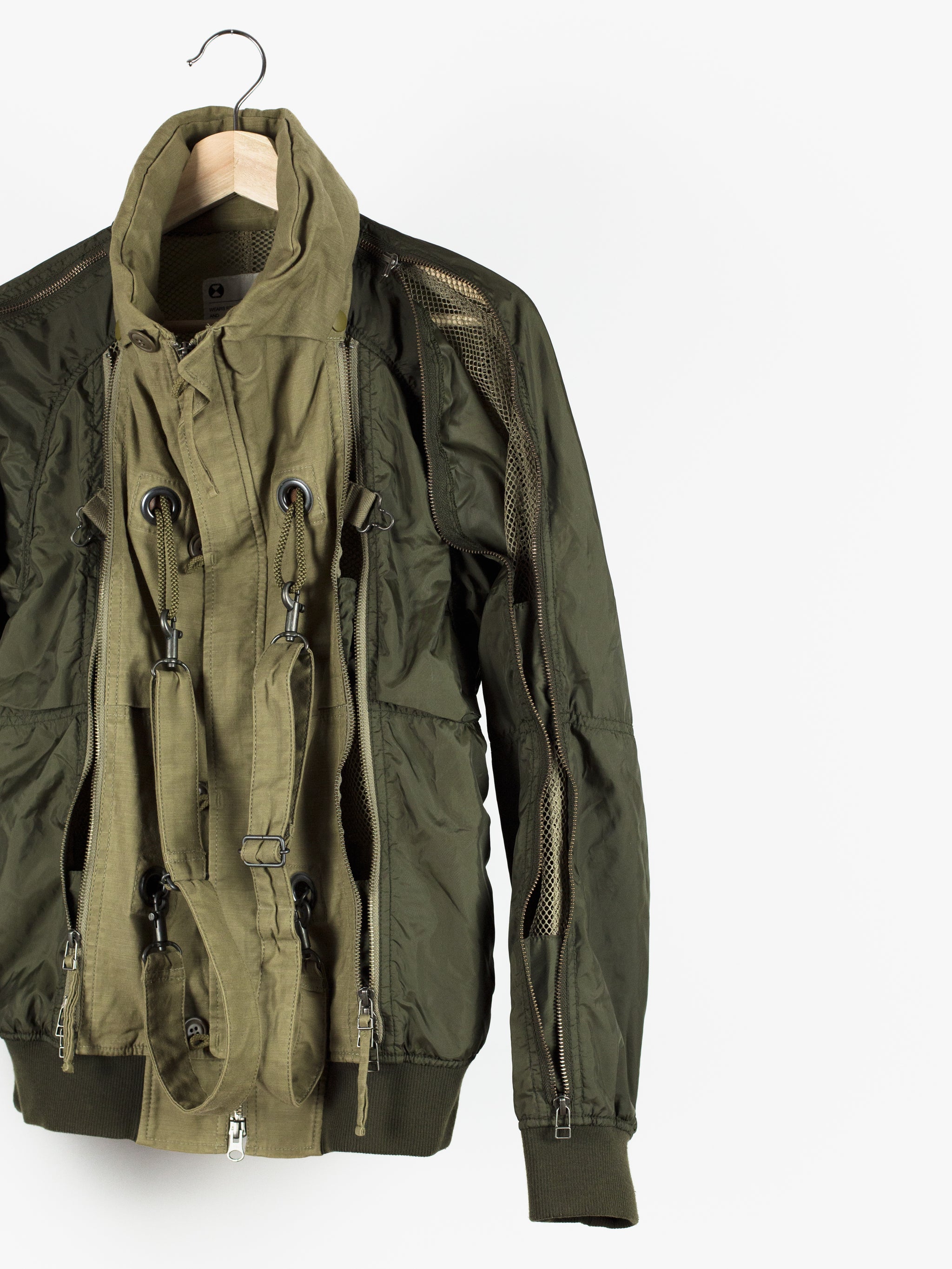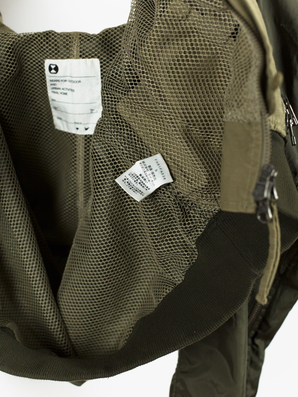 Final Home 90s bomber jacket outfitted with a wealth of utilitarian detailing. Two full length zippers along the front body divide the durable khaki cotton center from lighter nylon taffeta on the edges and open to mesh-lined pocketing. Zippers running from the neck and down the arms are openable to full mesh lining as well, allowing for the jacket to be fully ventilated during warmer weather. Metal hardware threaded through oversized grommets serve as attachment points for removable backpack carry straps draped along the front of the jacket. The high collar is constructed folded over itself, giving it a 3D sculptural quality and creating a space for the hood to be stowed. Finished with rib knit cuffs/hem and center front zipper.