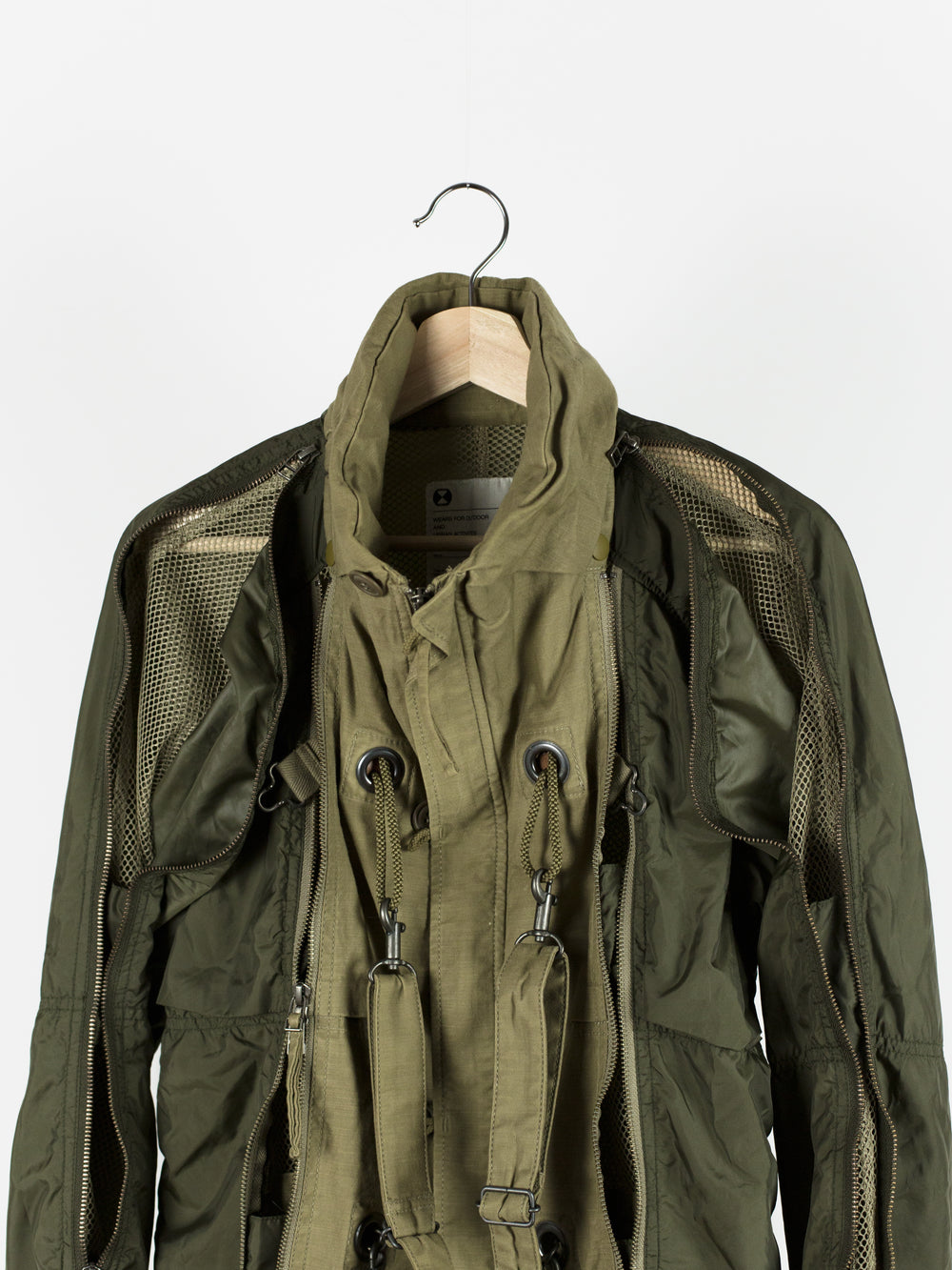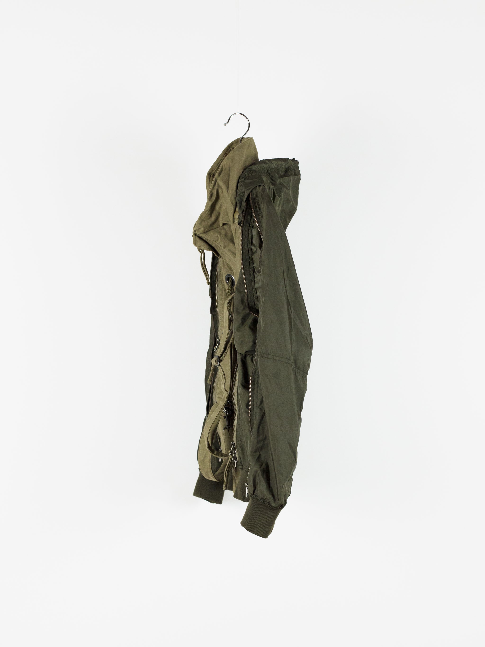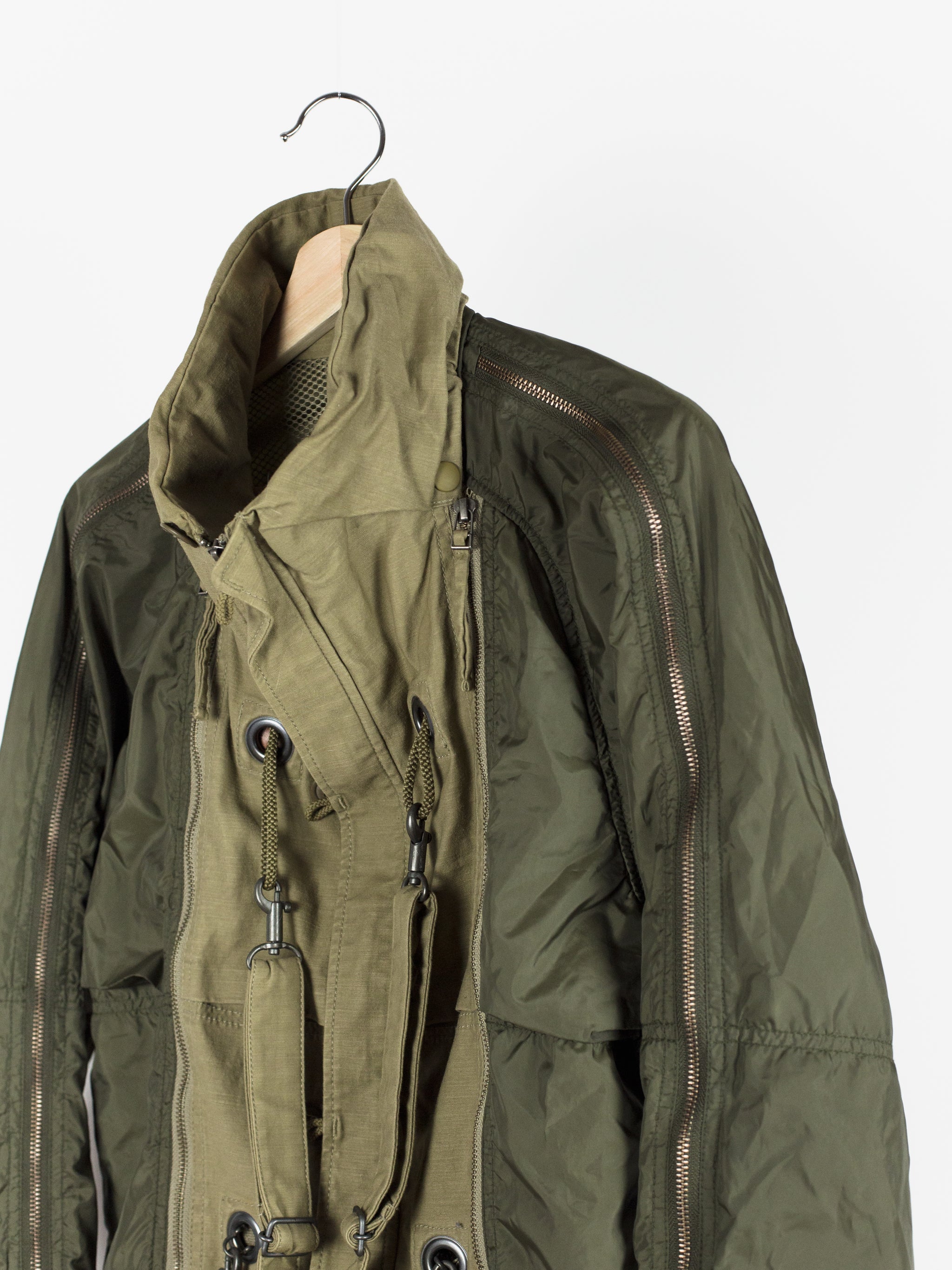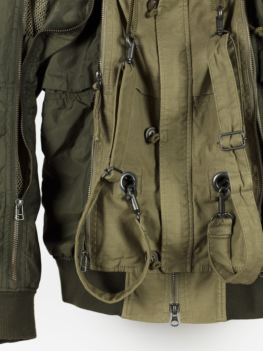 Final Home 90s bomber jacket outfitted with a wealth of utilitarian detailing. Two full length zippers along the front body divide the durable khaki cotton center from lighter nylon taffeta on the edges and open to mesh-lined pocketing. Zippers running from the neck and down the arms are openable to full mesh lining as well, allowing for the jacket to be fully ventilated during warmer weather. Metal hardware threaded through oversized grommets serve as attachment points for removable backpack carry straps draped along the front of the jacket. The high collar is constructed folded over itself, giving it a 3D sculptural quality and creating a space for the hood to be stowed. Finished with rib knit cuffs/hem and center front zipper.