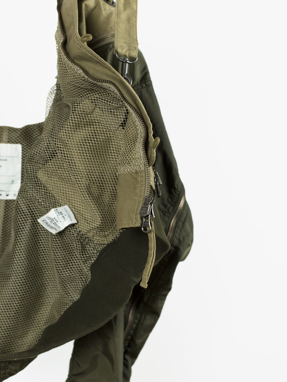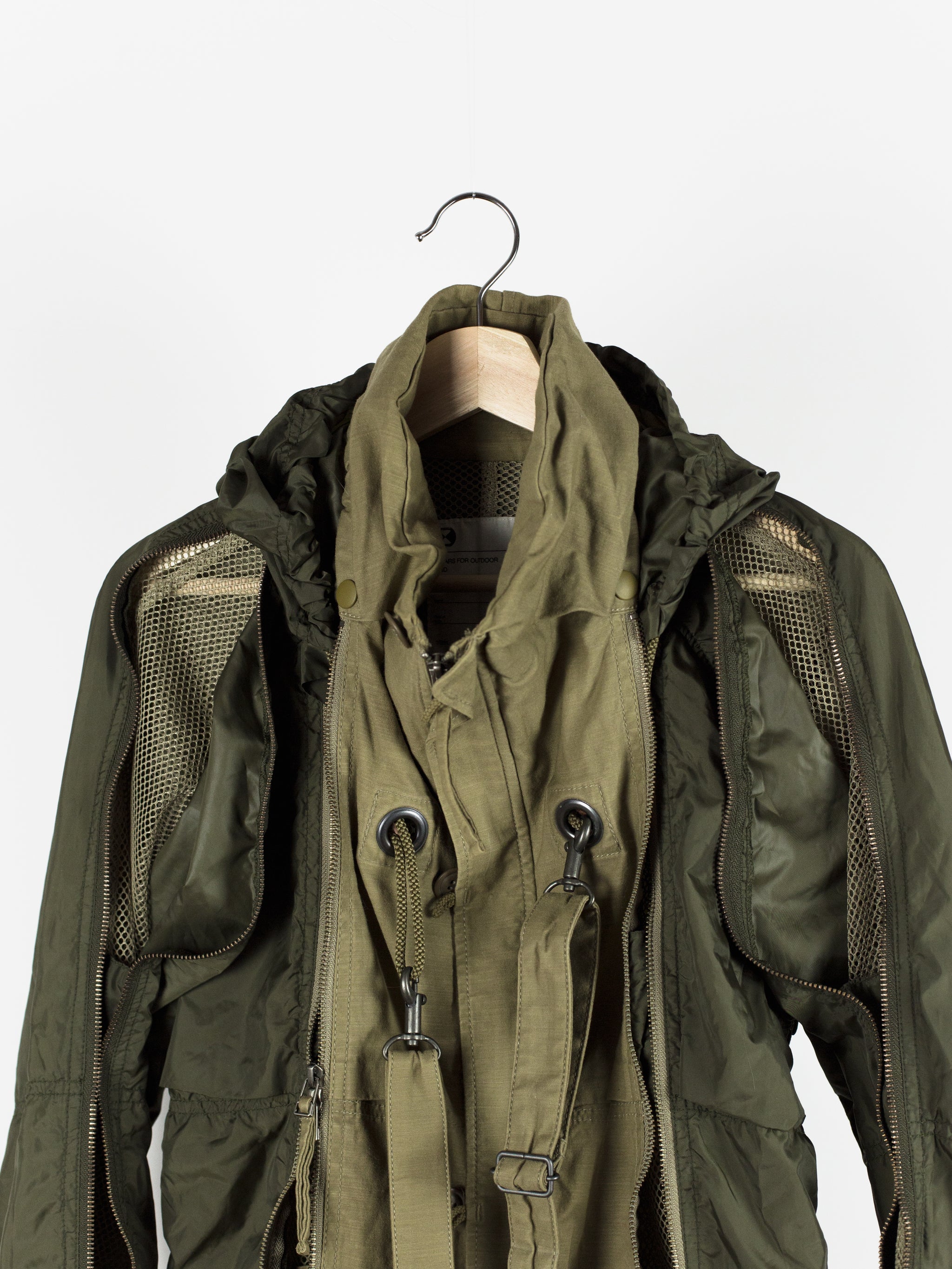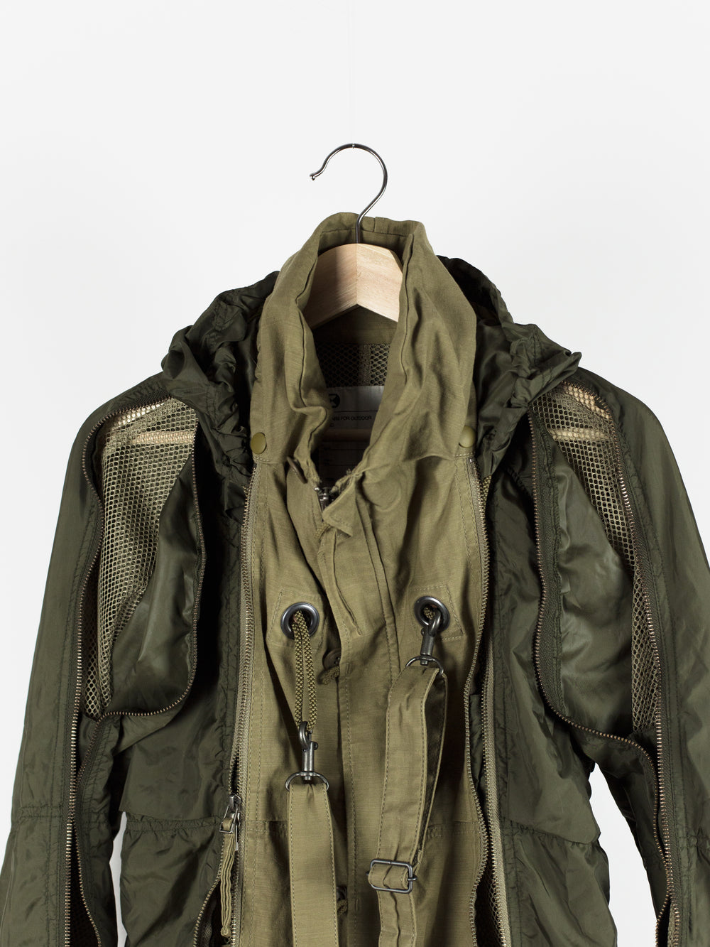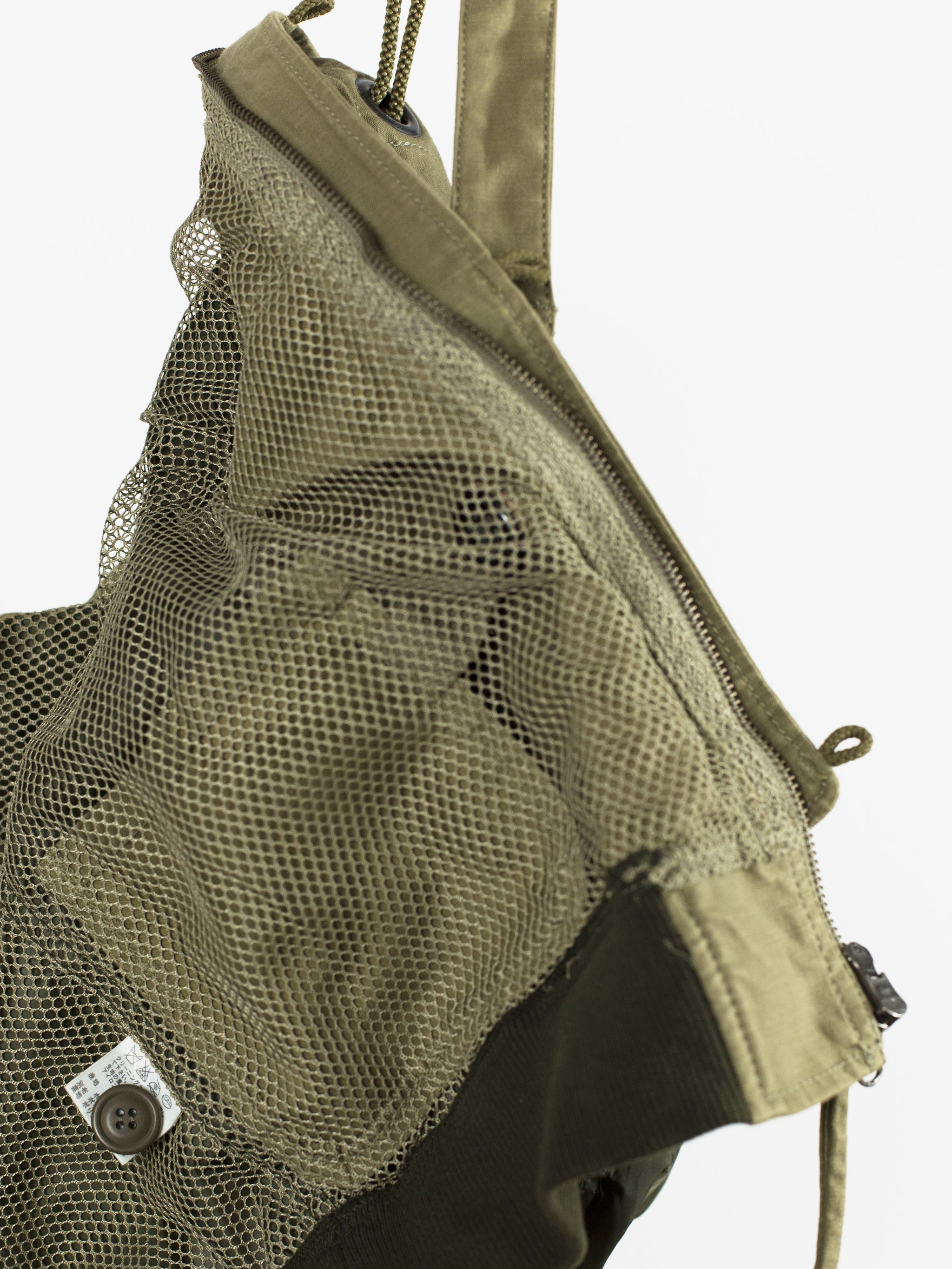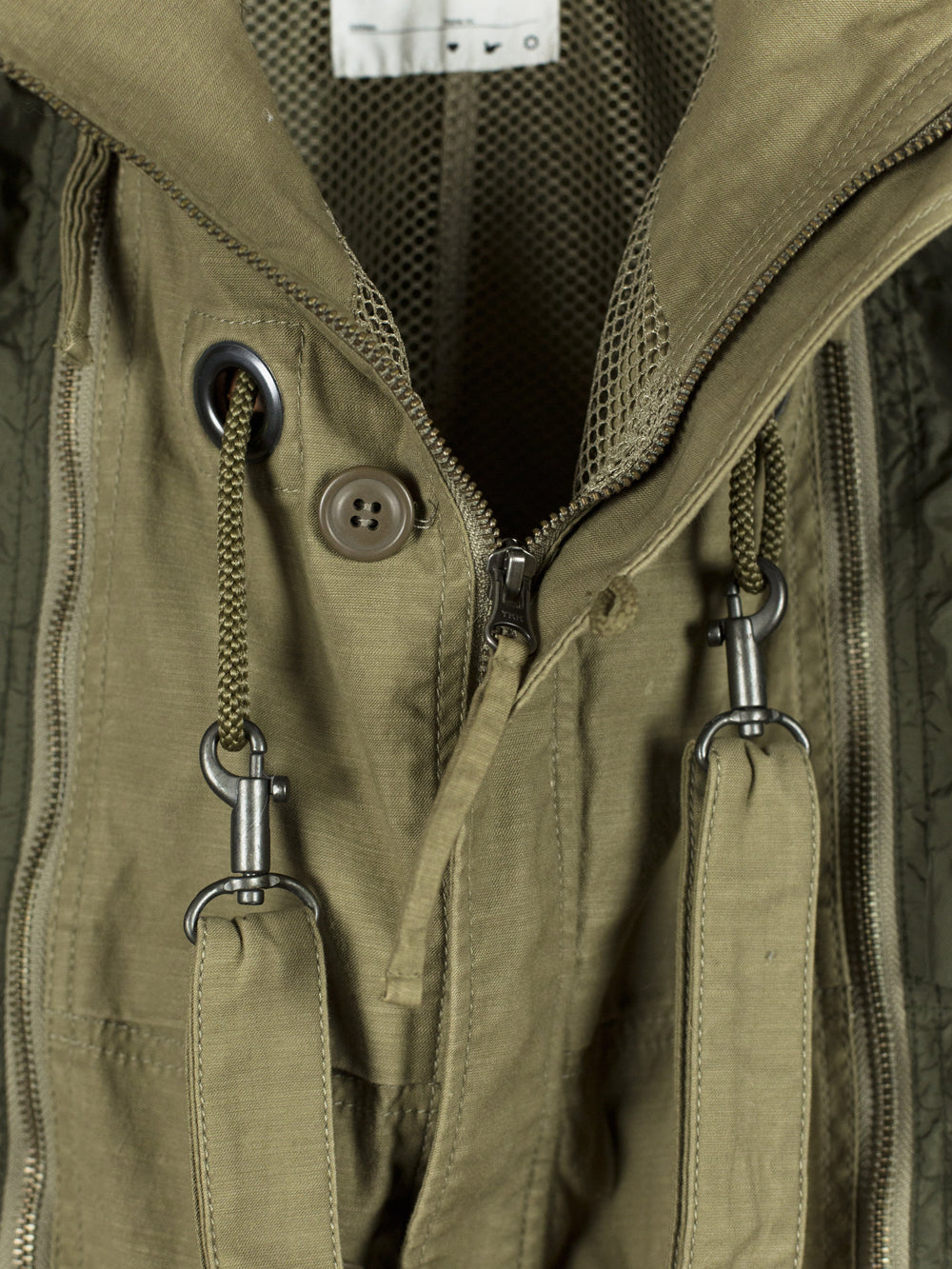Final Home 90s bomber jacket outfitted with a wealth of utilitarian detailing. Two full length zippers along the front body divide the durable khaki cotton center from lighter nylon taffeta on the edges and open to mesh-lined pocketing. Zippers running from the neck and down the arms are openable to full mesh lining as well, allowing for the jacket to be fully ventilated during warmer weather. Metal hardware threaded through oversized grommets serve as attachment points for removable backpack carry straps draped along the front of the jacket. The high collar is constructed folded over itself, giving it a 3D sculptural quality and creating a space for the hood to be stowed. Finished with rib knit cuffs/hem and center front zipper.