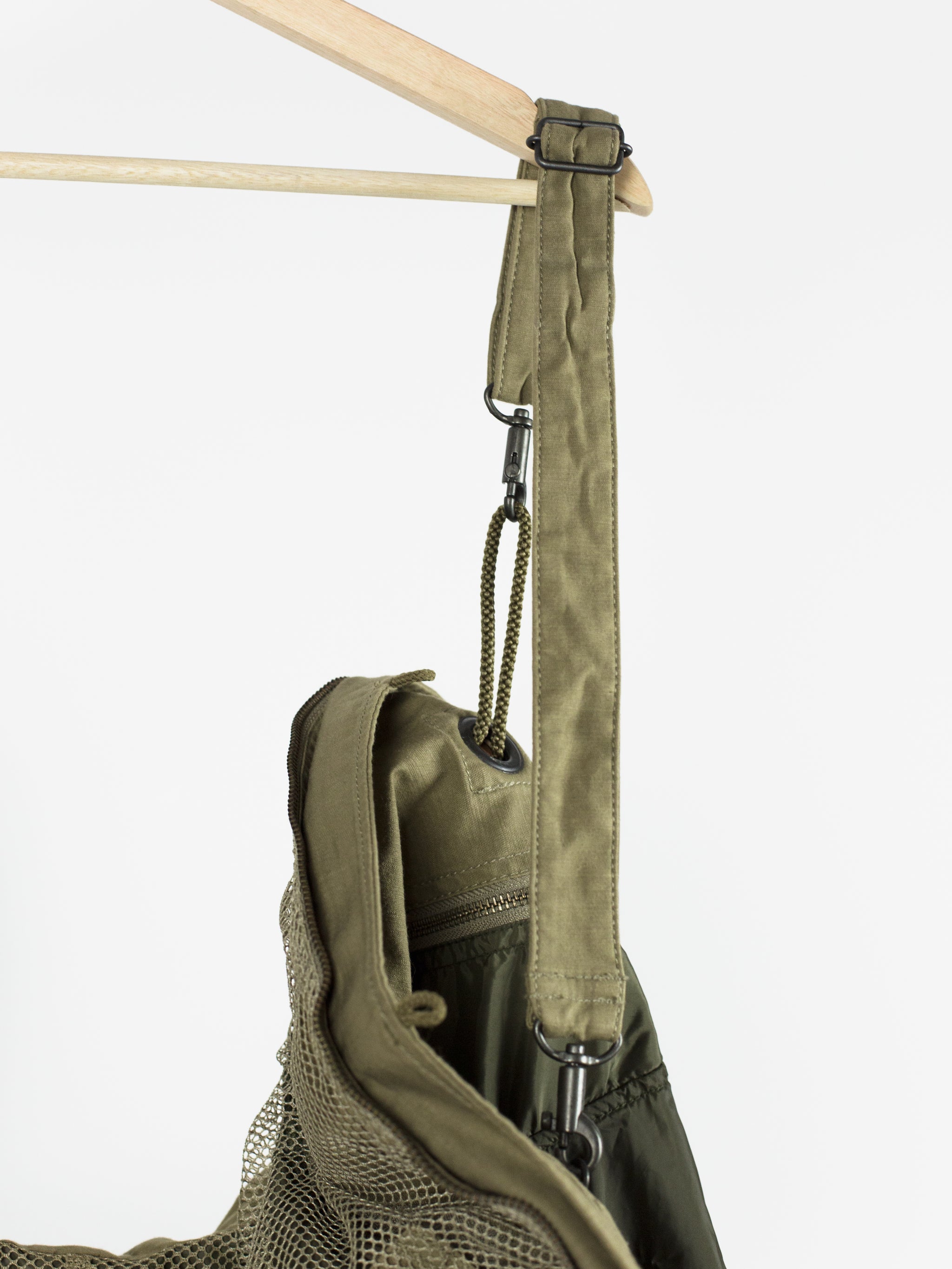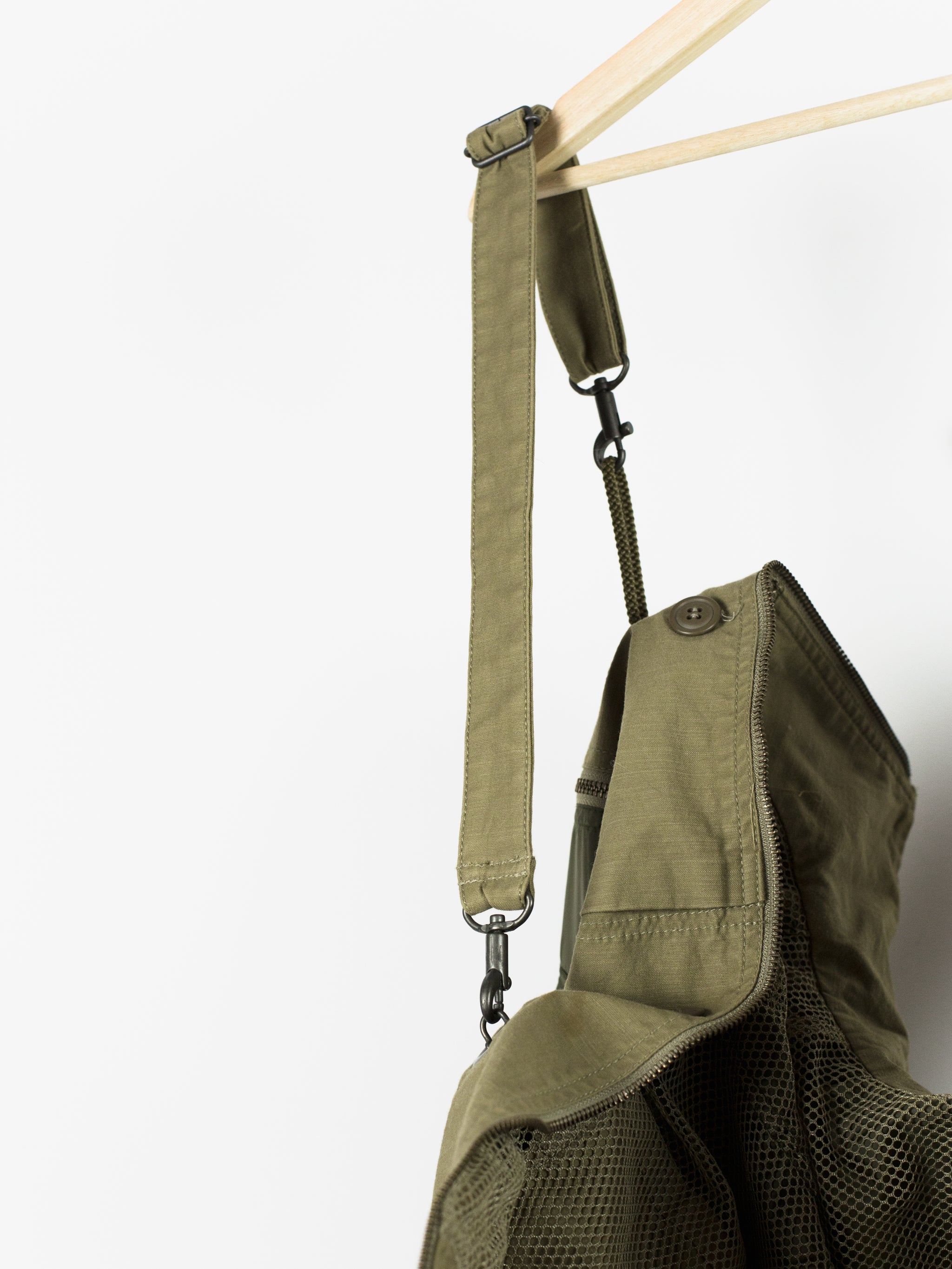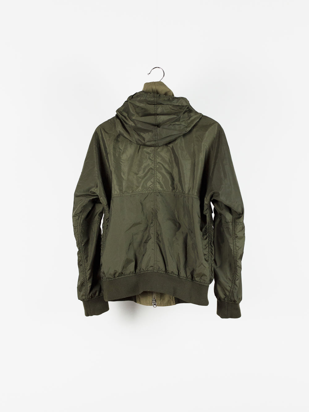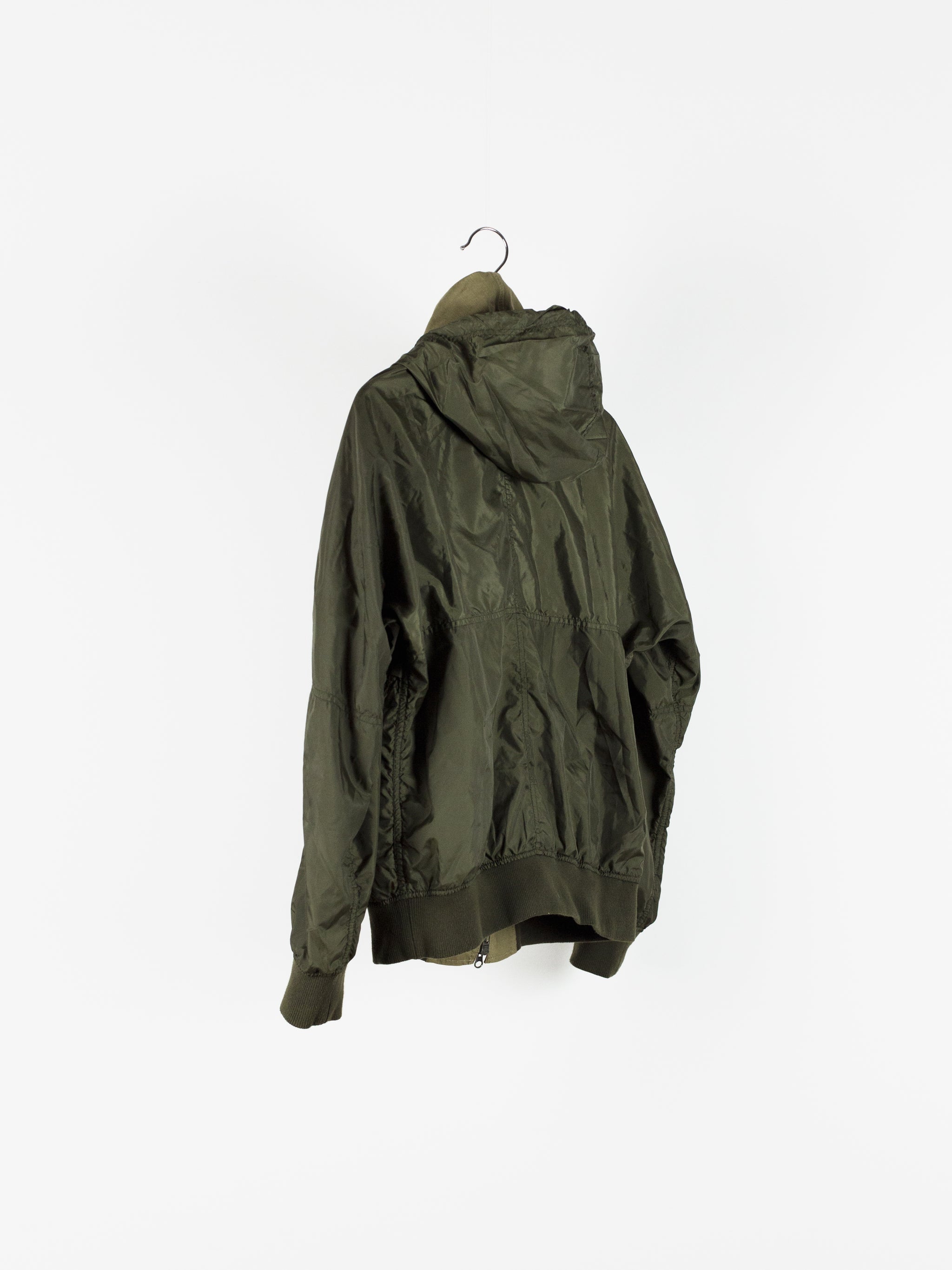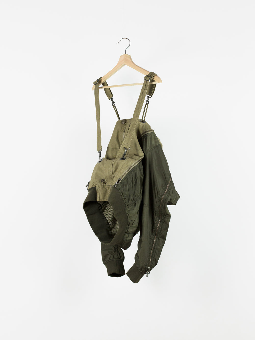 Final Home 90s bomber jacket outfitted with a wealth of utilitarian detailing. Two full length zippers along the front body divide the durable khaki cotton center from lighter nylon taffeta on the edges and open to mesh-lined pocketing. Zippers running from the neck and down the arms are openable to full mesh lining as well, allowing for the jacket to be fully ventilated during warmer weather. Metal hardware threaded through oversized grommets serve as attachment points for removable backpack carry straps draped along the front of the jacket. The high collar is constructed folded over itself, giving it a 3D sculptural quality and creating a space for the hood to be stowed. Finished with rib knit cuffs/hem and center front zipper.
