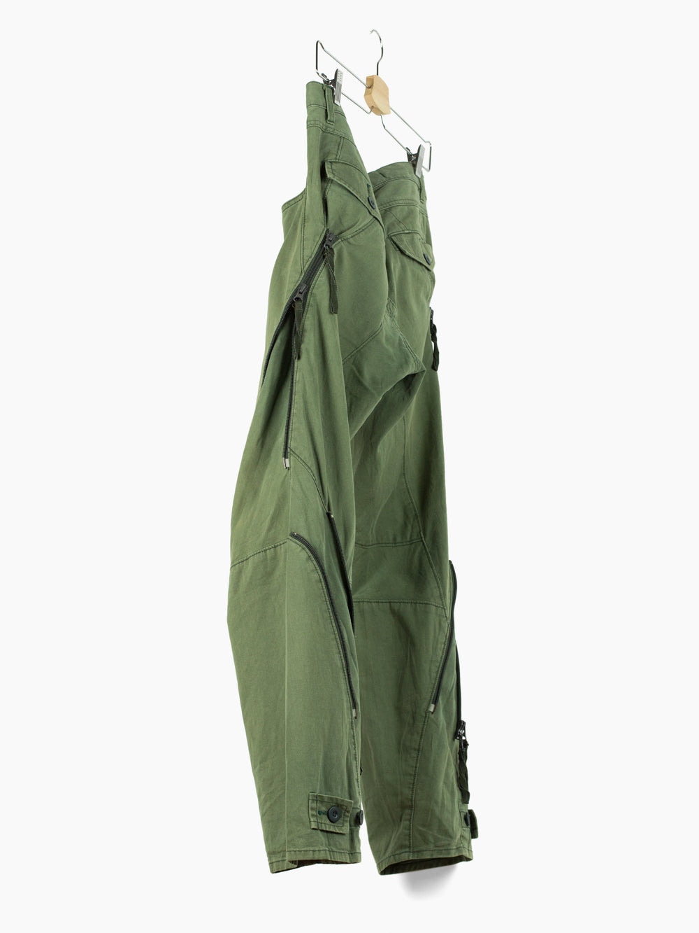 A hybrid twist on a punk bondage pant and articulated motorcycle pant, Kosuke Tsumura uses iconic design elements of the former to sculpt the articulation and function of the latter. Here the vertical cinching zippers usually found at the back of thighs and calves on punk bondage pants are bent, curved and angled so they twist laterally around the legs, allowing the wearer to create a darted and articulated leg shape.