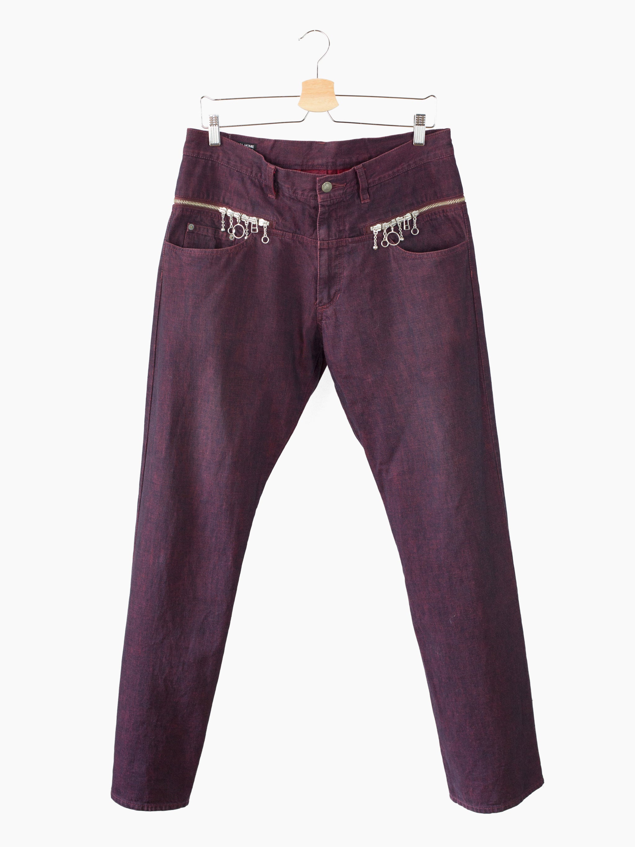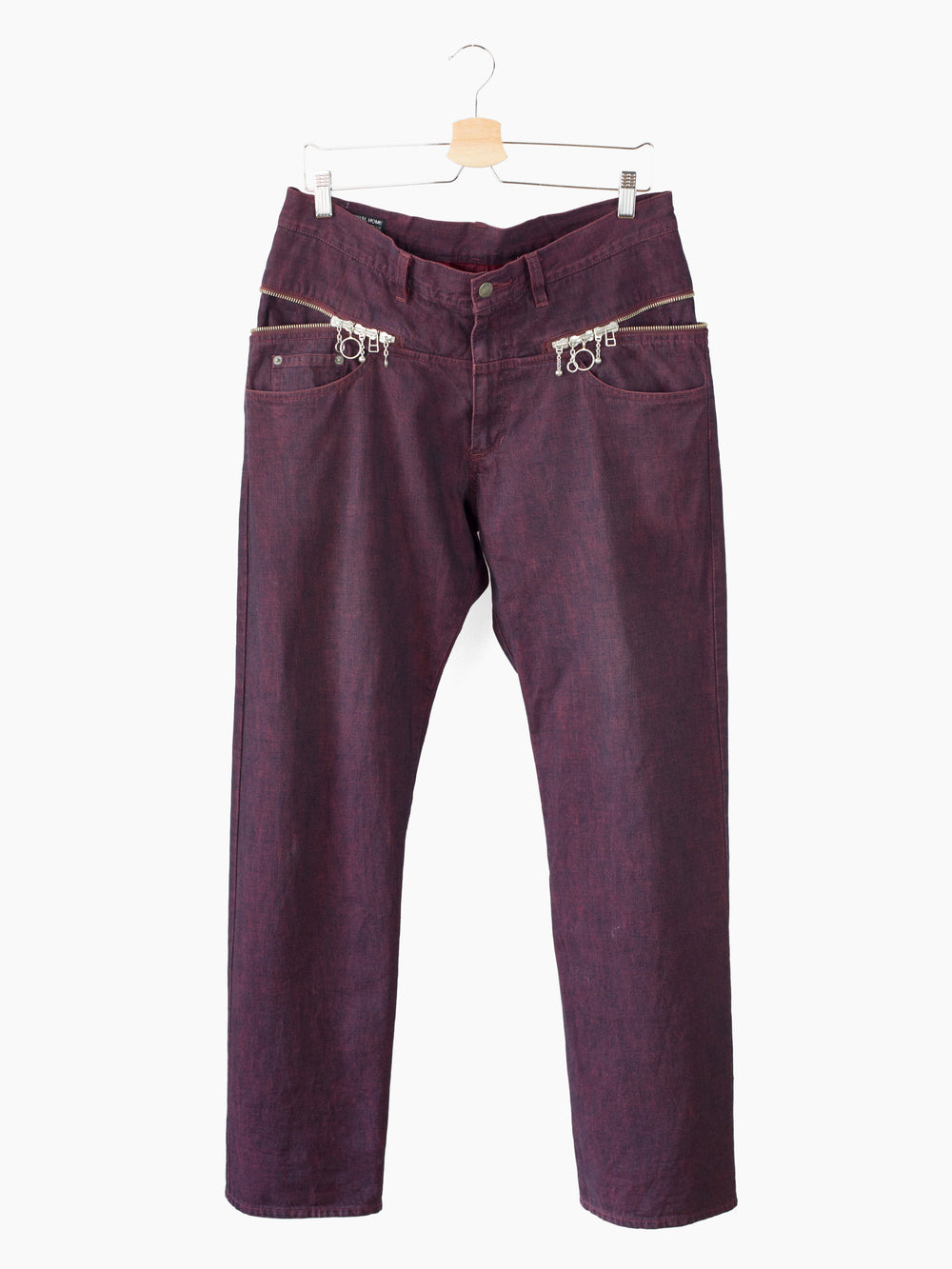 Utility jeans from Final Home, featuring the label’s signature “double” waist in the form of top zipper cargo pockets that wrap laterally around the hips providing ample gardening-pant style carrying capacity. On each track there are 6 zippers that let the wearer calibrate which sections are open/closed. Varying pulls turn functional ephemera into something artfully ornamental. Below the zipper detailing a traditional set of jeans detailing like J pockets, fly, and patch back pockets add aesthetic versatility. The fabric is a mid weight denim that blends red and blue fibers to read purple/burgundy.