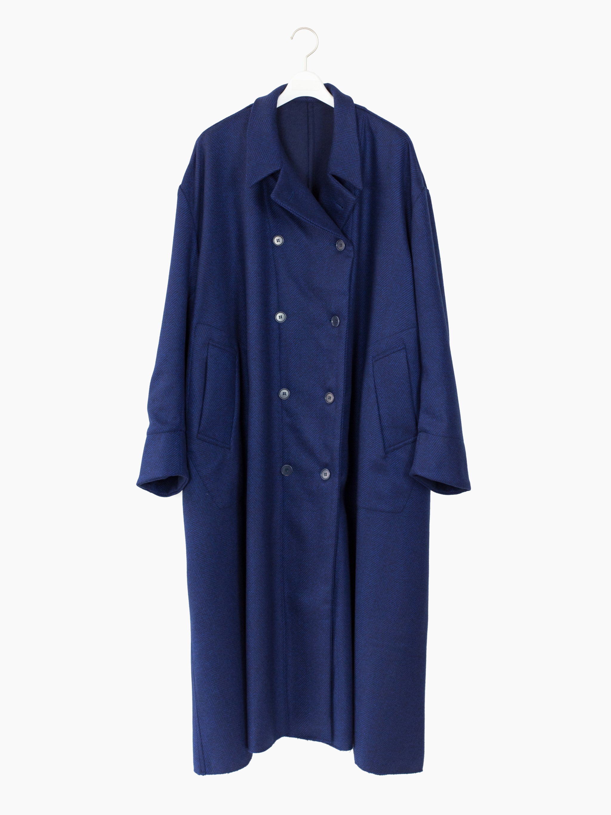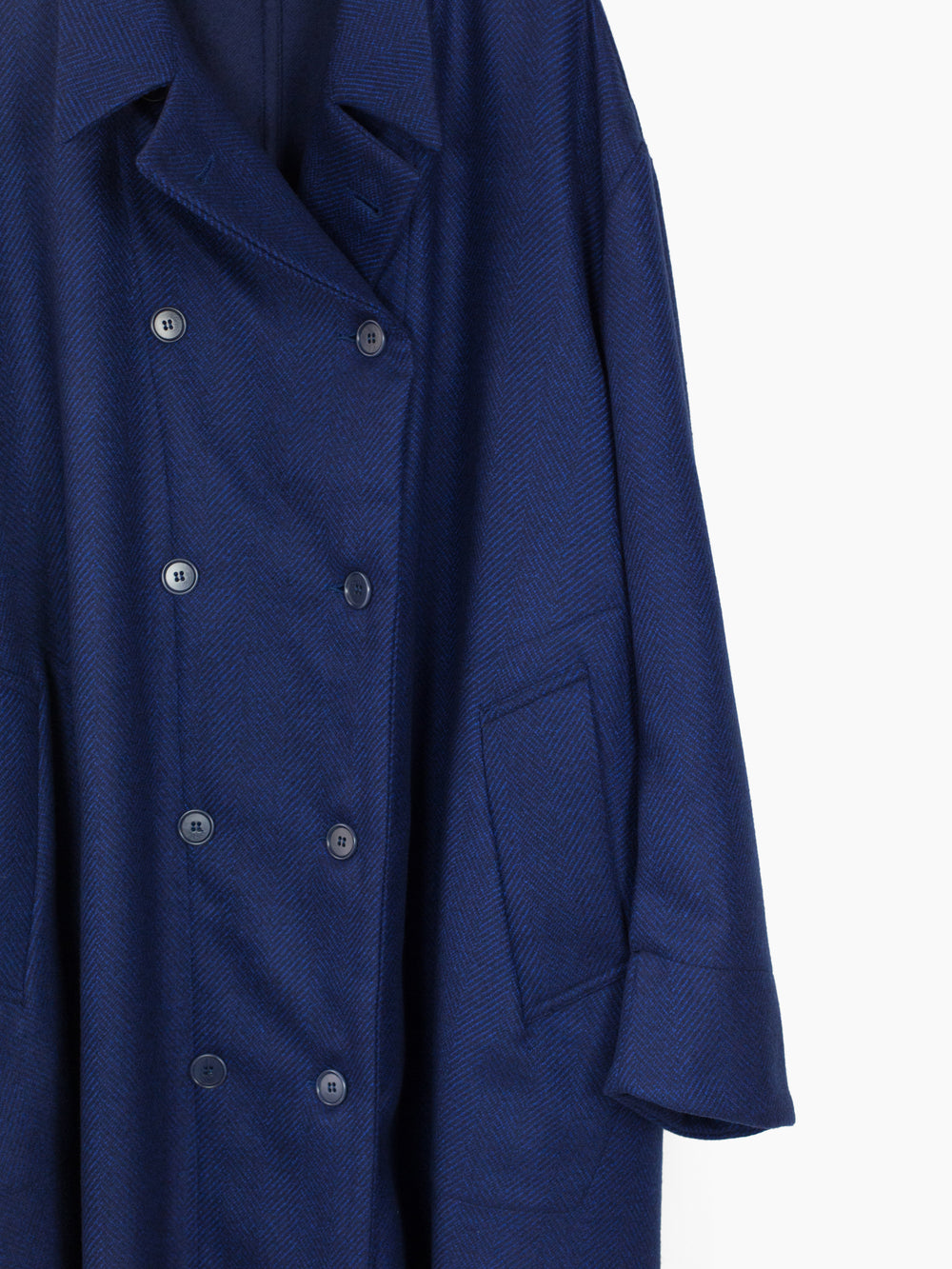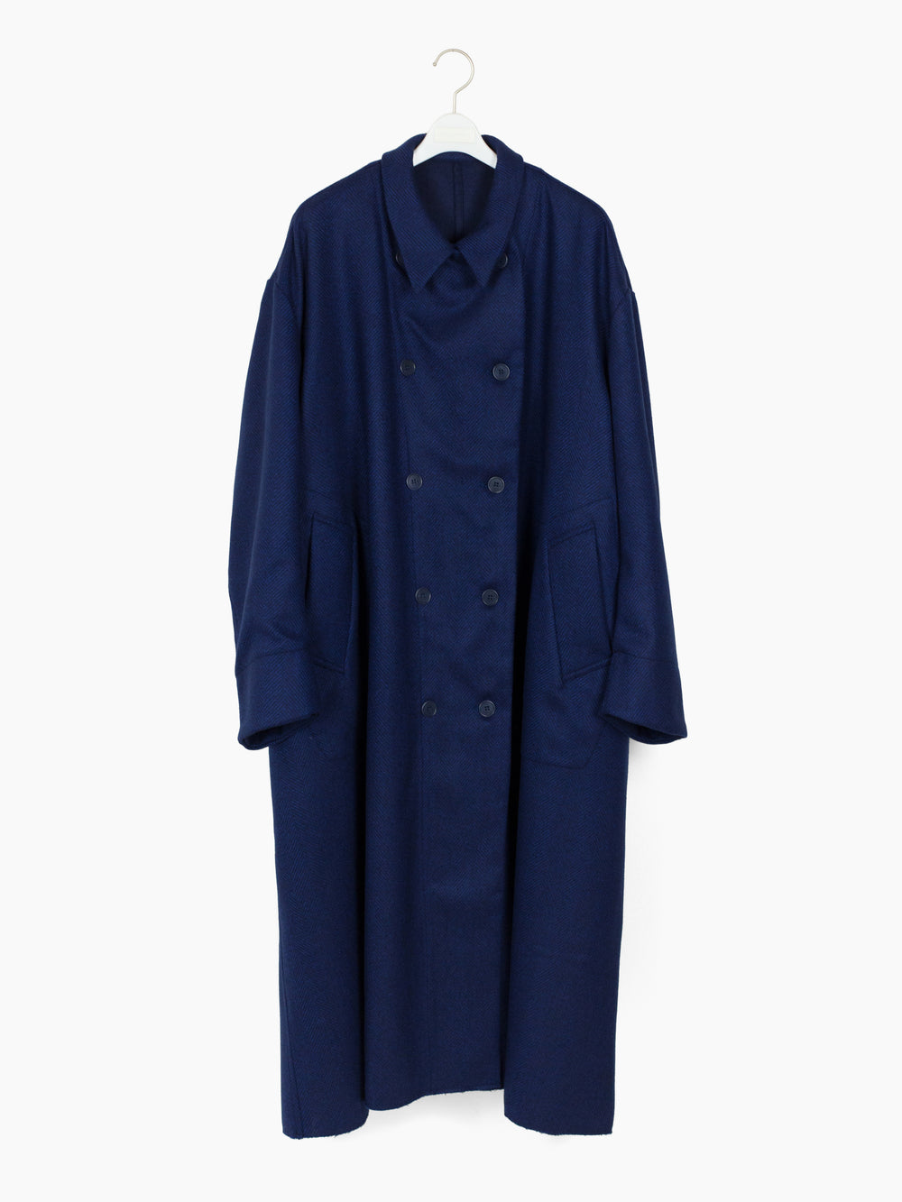 Maxi-length double-breasted coat in a weighty, fluid Loro Piana Herringbone coating. 2-tone blue/black yarns yield a rich navy with a wealth of textural detail. Cut oversized and long in the body, cocoon-like with swaths of fabric draped around the wearer that move with a slow, sweeping, sober drama. Tailored sleeves hang down sharp, cutting in the silhouette at the sides and introducing a balanced and necessary sleekness.