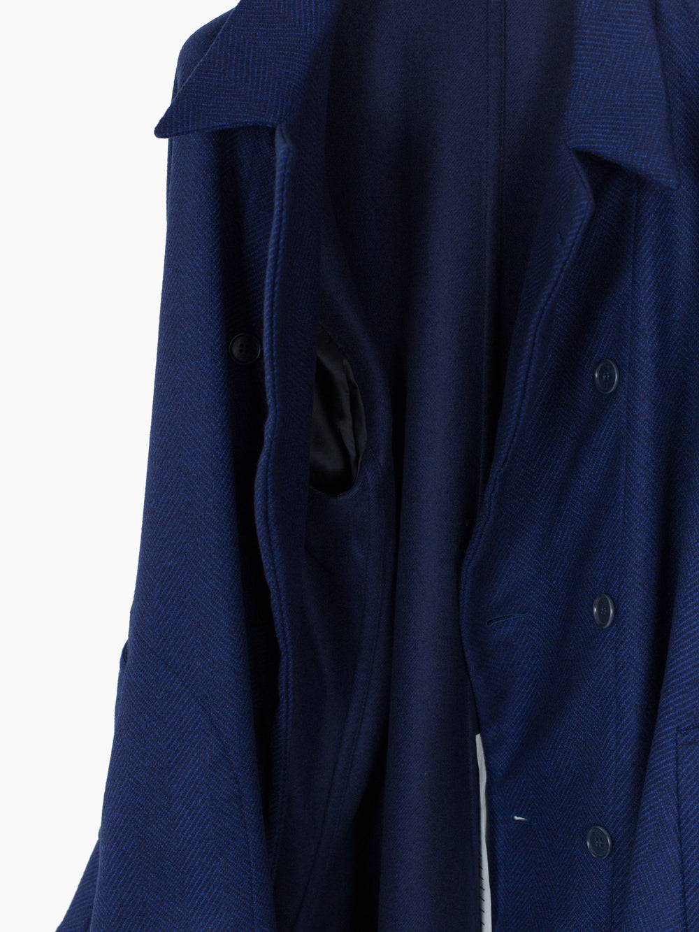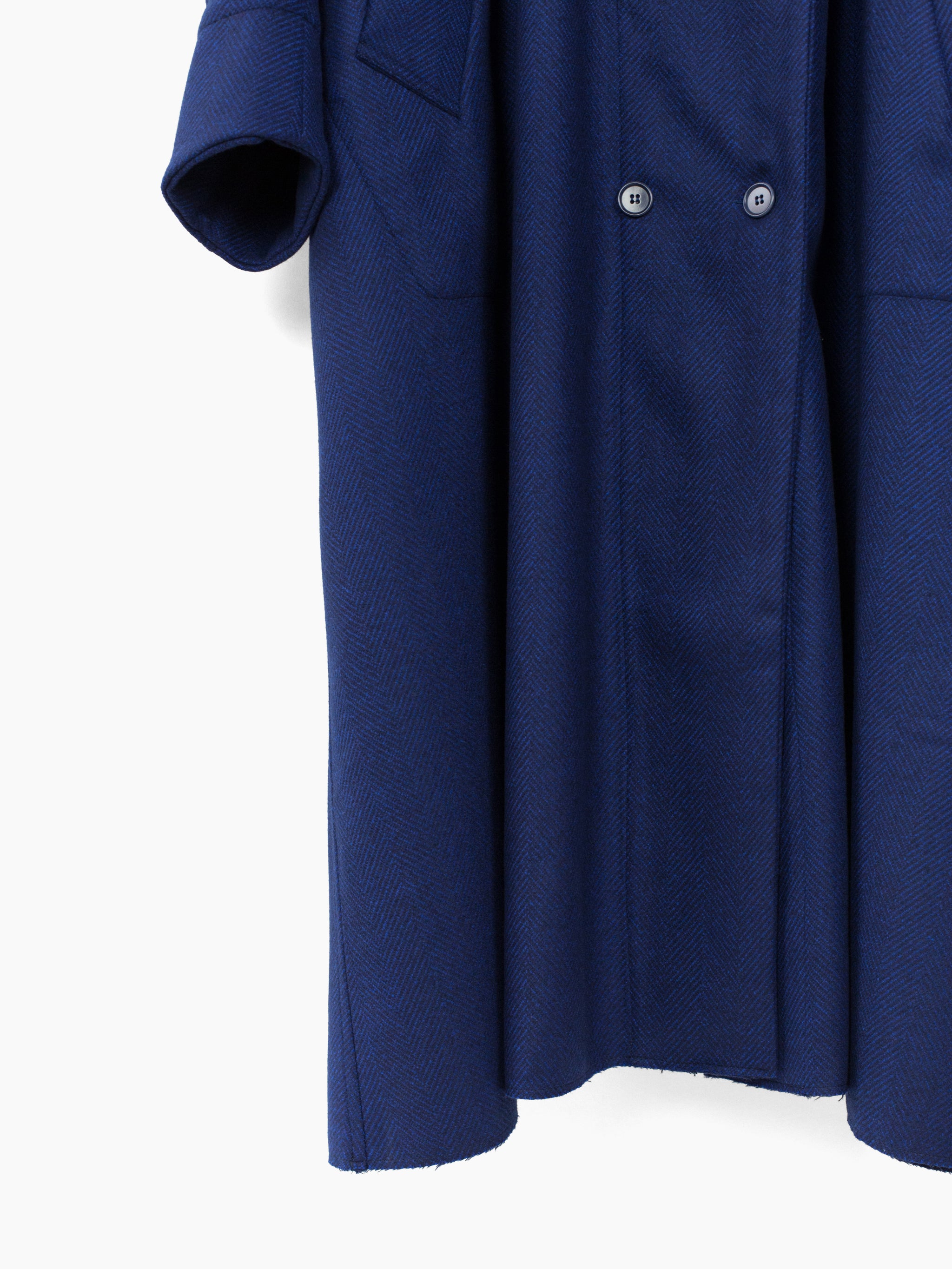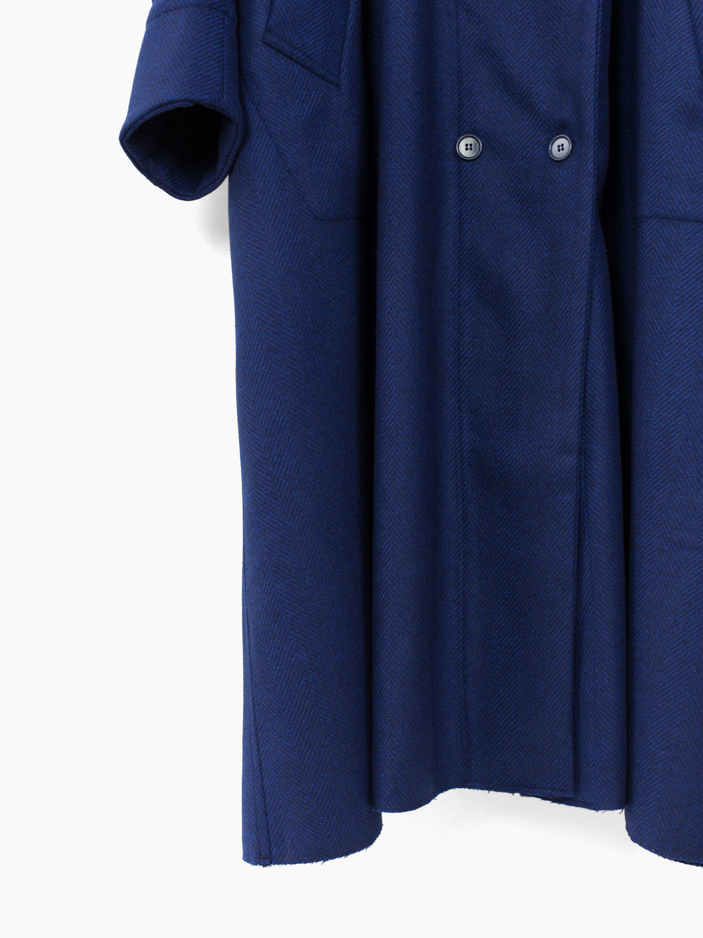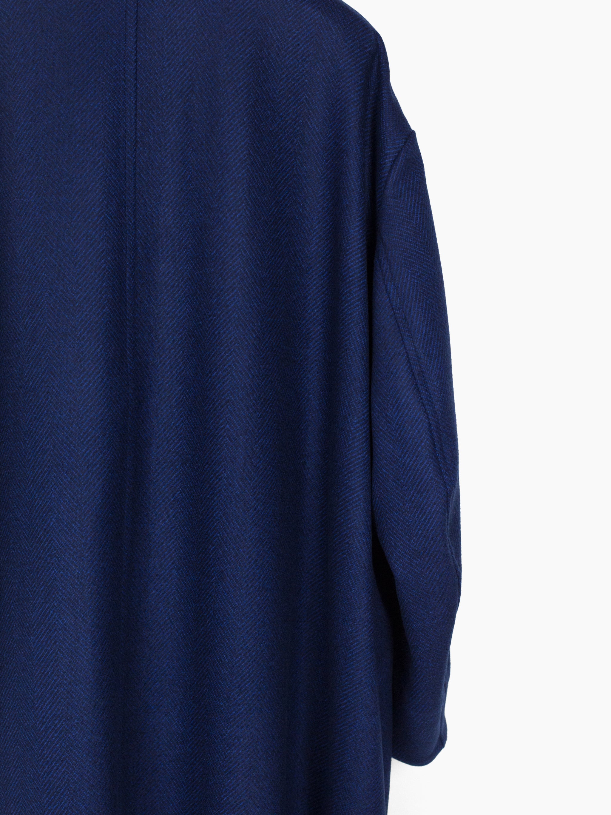 Maxi-length double-breasted coat in a weighty, fluid Loro Piana Herringbone coating. 2-tone blue/black yarns yield a rich navy with a wealth of textural detail. Cut oversized and long in the body, cocoon-like with swaths of fabric draped around the wearer that move with a slow, sweeping, sober drama. Tailored sleeves hang down sharp, cutting in the silhouette at the sides and introducing a balanced and necessary sleekness.