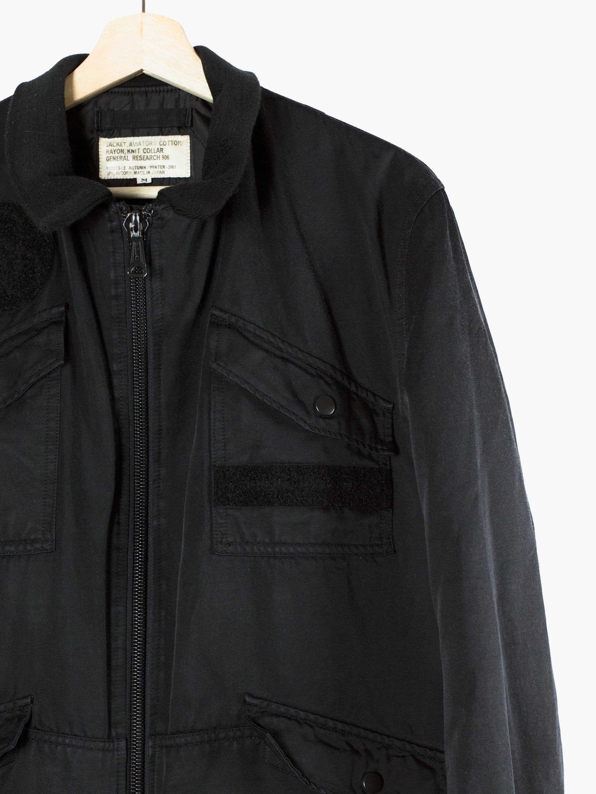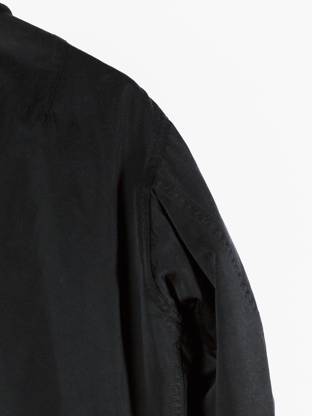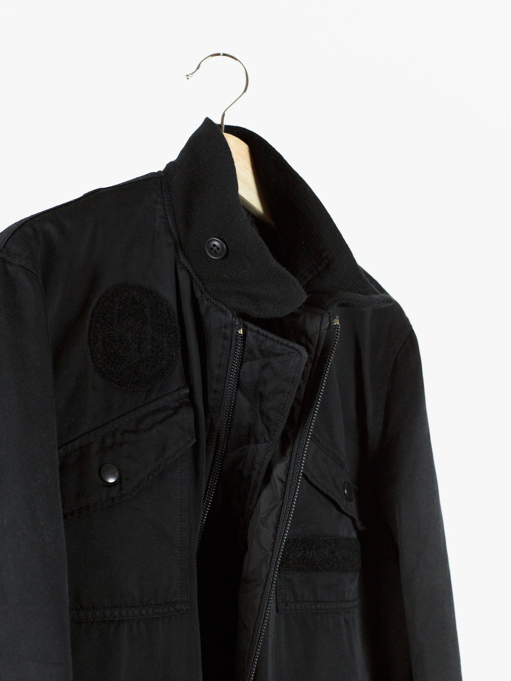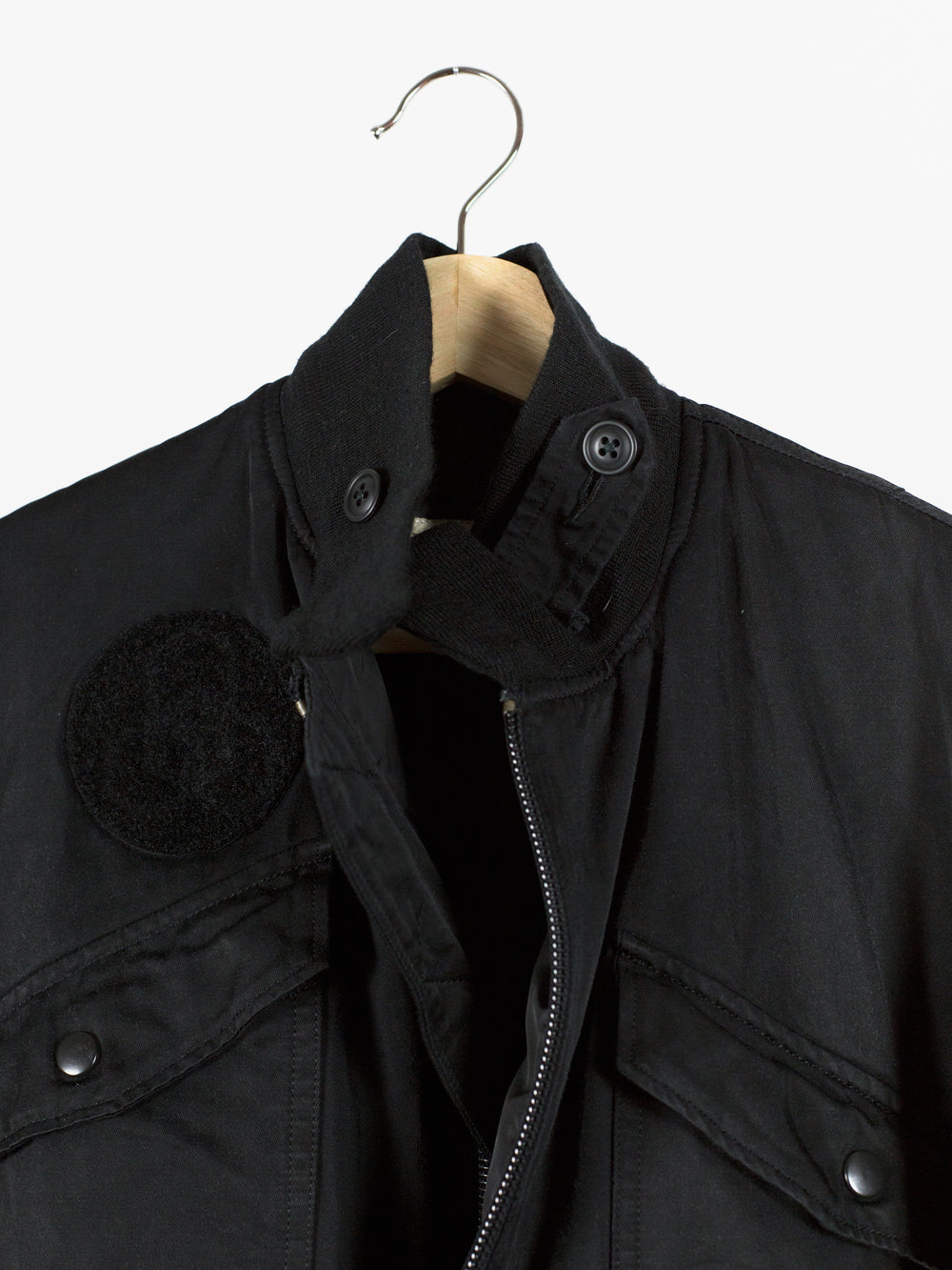 Kobayashi Setsumasa's original 'General Research' line founded in 1993 served as a precursor to the contemporary Mountain Research. The label focuses on developing clothing that is utilitarian, functional, and well-equipped for daily life. This black flight jacket encapsulates that ideal with a sleek, streamlined cut featuring a slim body, tailored sleeves. 4 diagonally flap-closed pockets along the front body and asymmetrically placed blank velcro patches nod to military flight jackets. Thick banded velcro cuffs and a dropped inner zip placket seal out the wind and a quilted polyester batting interior keeps the wearer warm without bulk. The concise feature set is visually interesting yet perfectly usable while the cotton-rayon blend face fabric lends a soft and supple hand. All the elements come together as a no-nonsense, versatile, yet sharp piece of outerwear that is a pleasure to wear.