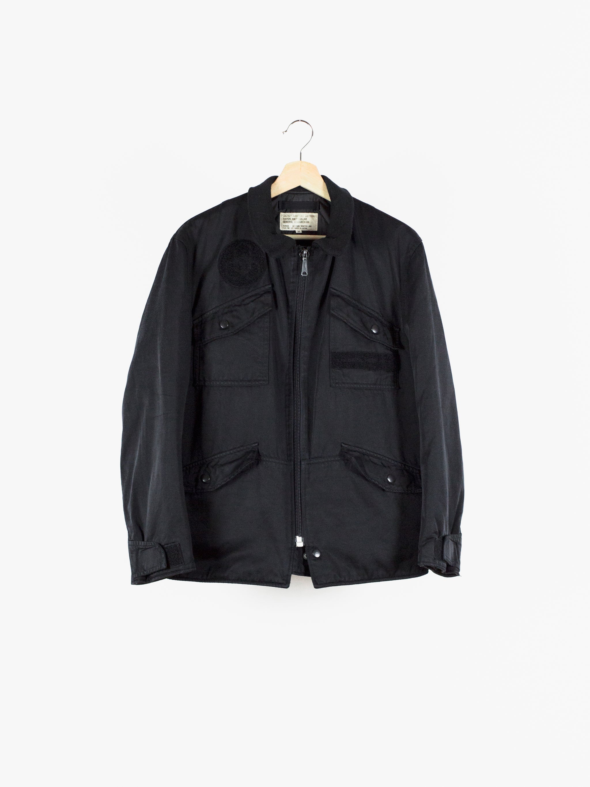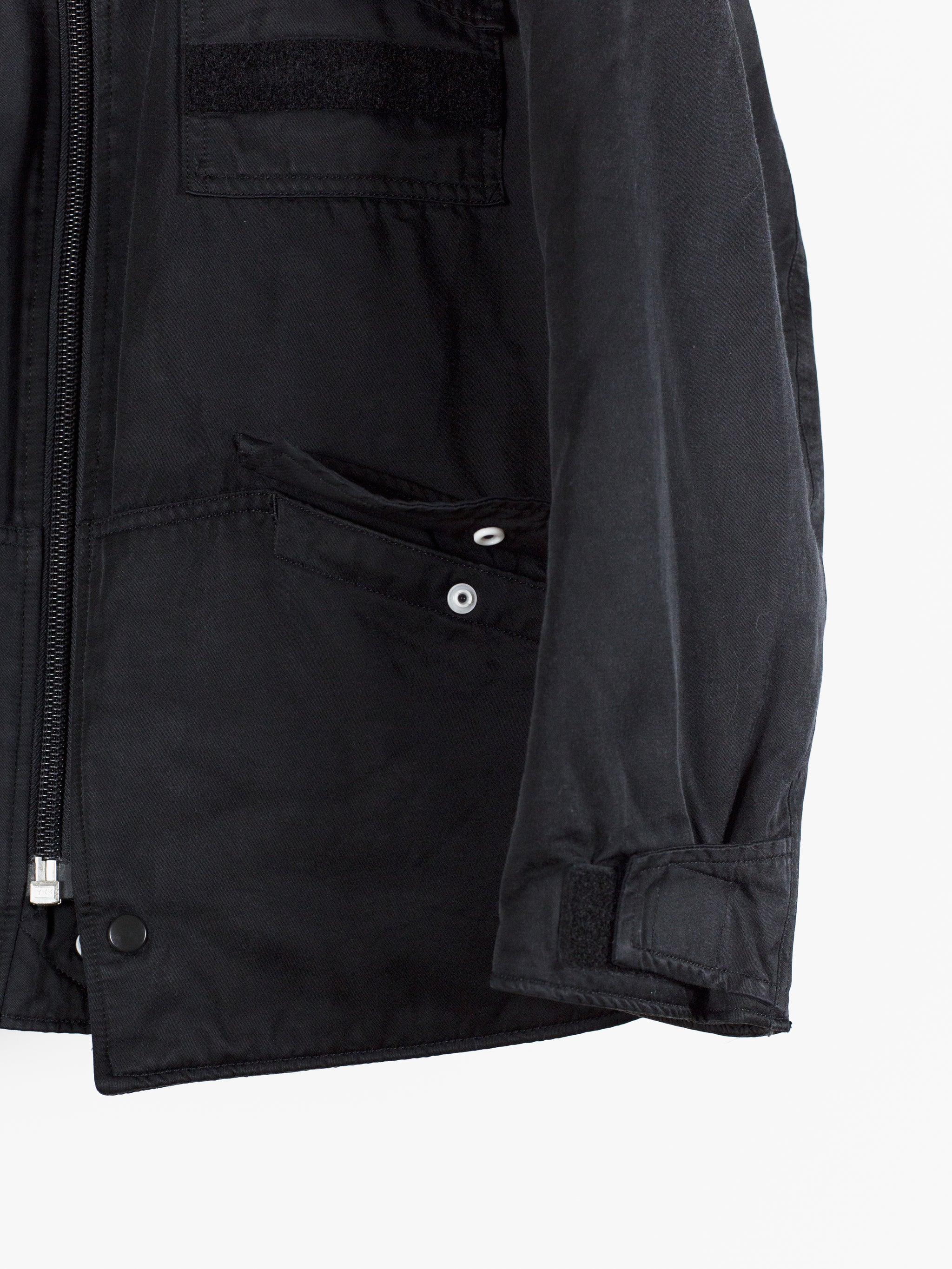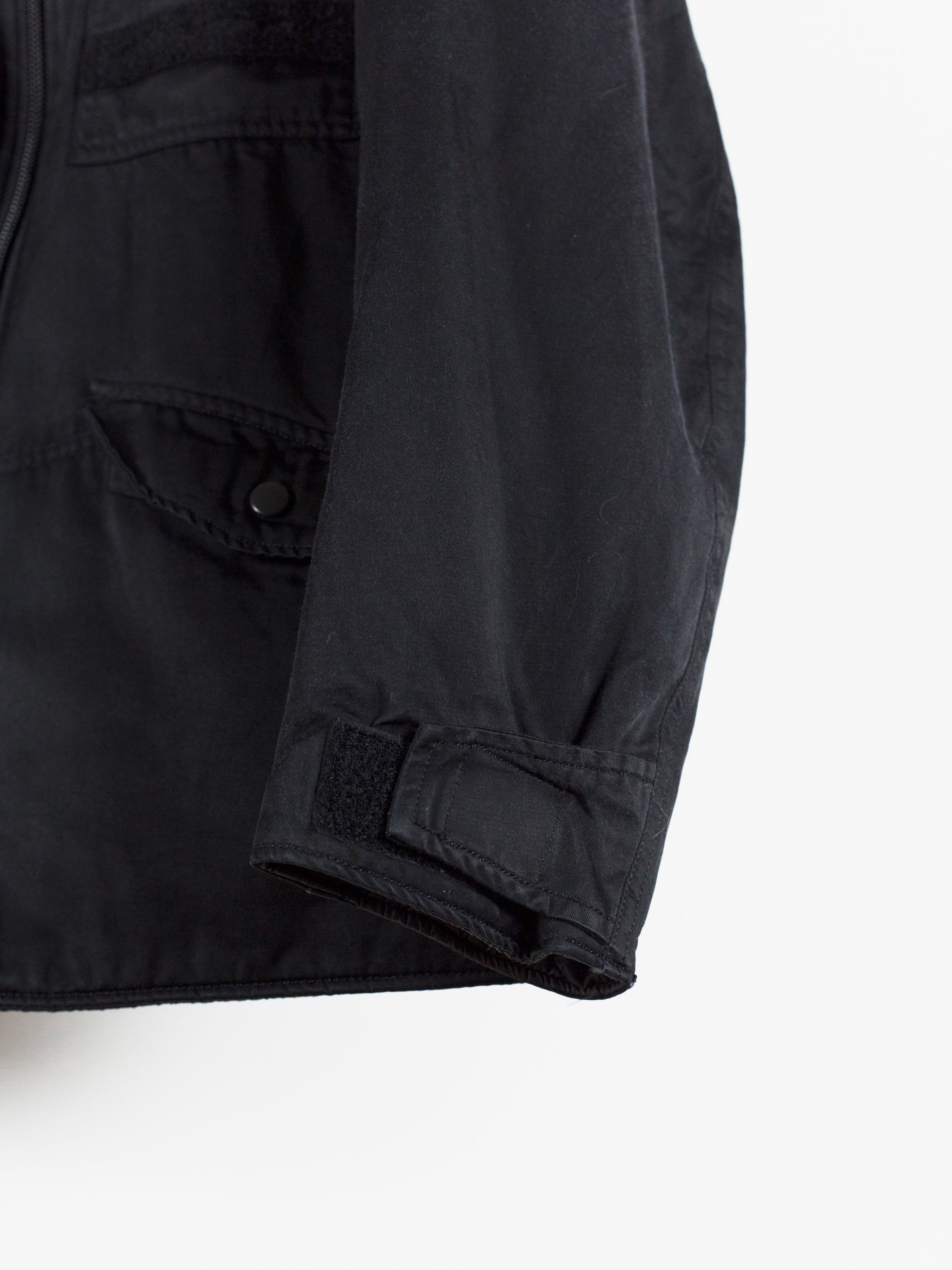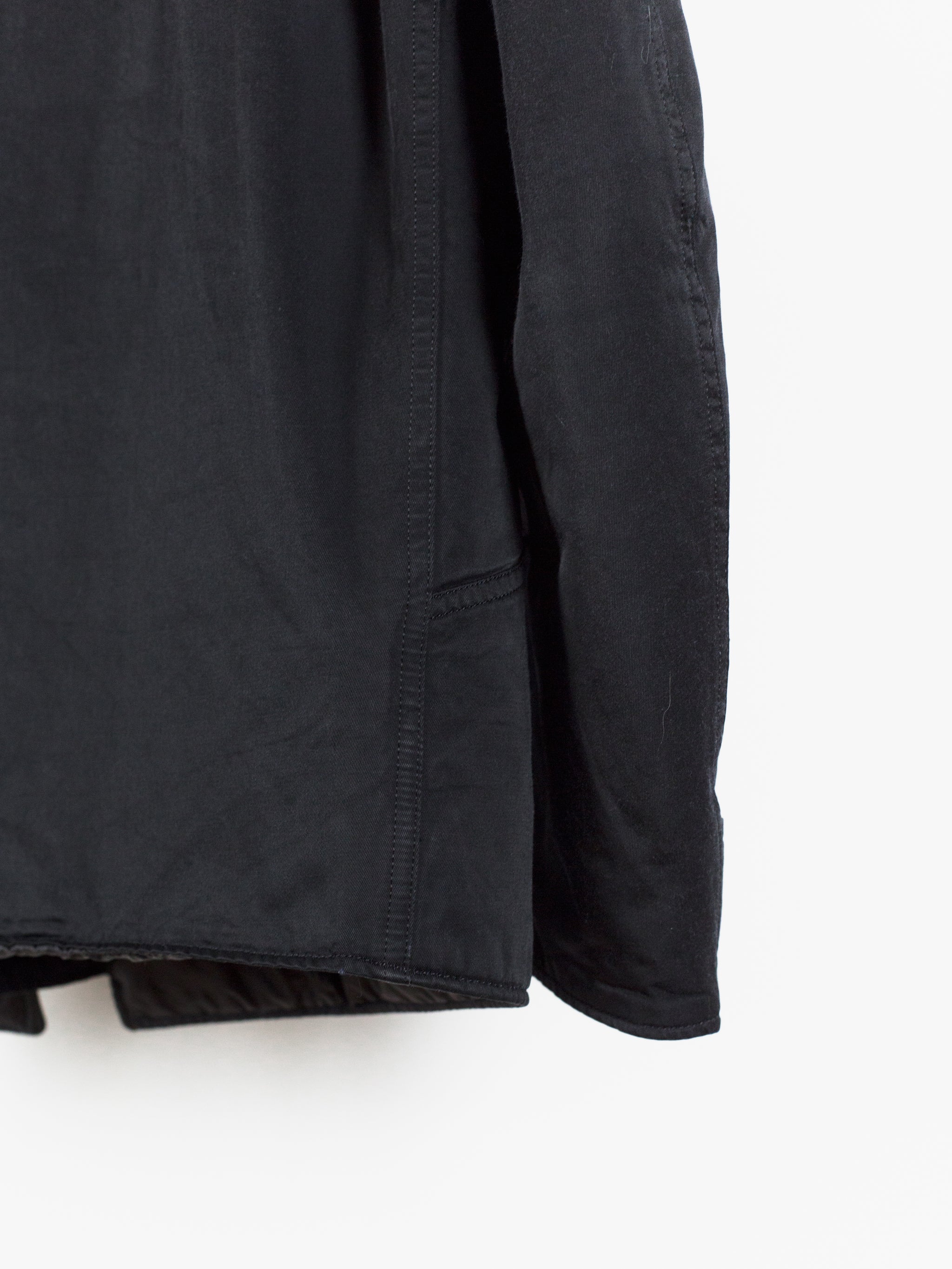 Kobayashi Setsumasa's original 'General Research' line founded in 1993 served as a precursor to the contemporary Mountain Research. The label focuses on developing clothing that is utilitarian, functional, and well-equipped for daily life. This black flight jacket encapsulates that ideal with a sleek, streamlined cut featuring a slim body, tailored sleeves. 4 diagonally flap-closed pockets along the front body and asymmetrically placed blank velcro patches nod to military flight jackets. Thick banded velcro cuffs and a dropped inner zip placket seal out the wind and a quilted polyester batting interior keeps the wearer warm without bulk. The concise feature set is visually interesting yet perfectly usable while the cotton-rayon blend face fabric lends a soft and supple hand. All the elements come together as a no-nonsense, versatile, yet sharp piece of outerwear that is a pleasure to wear.