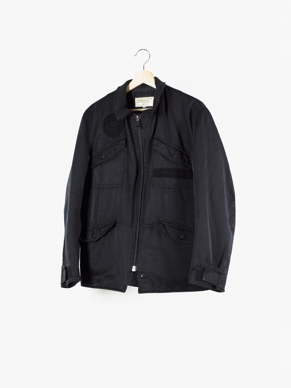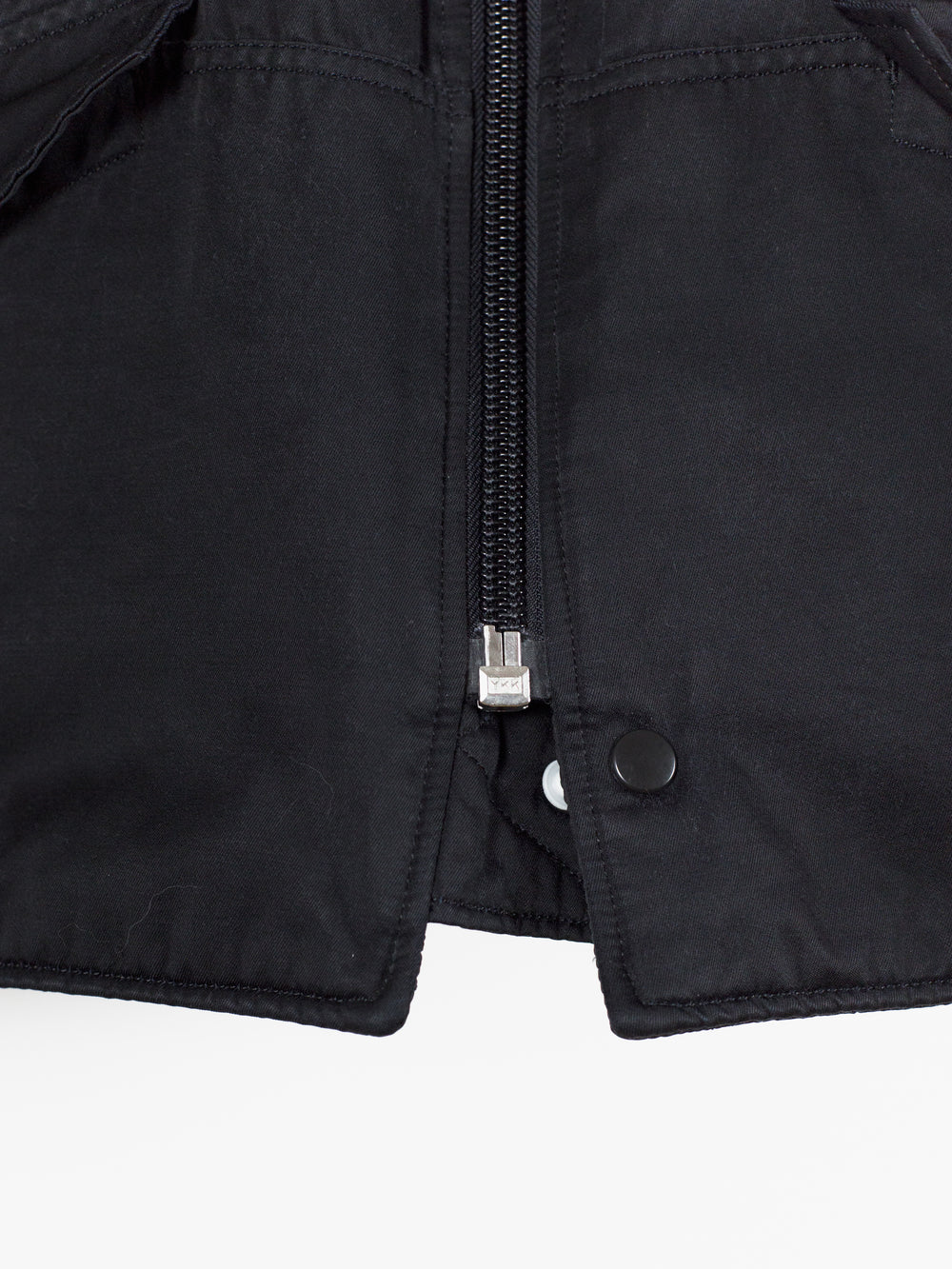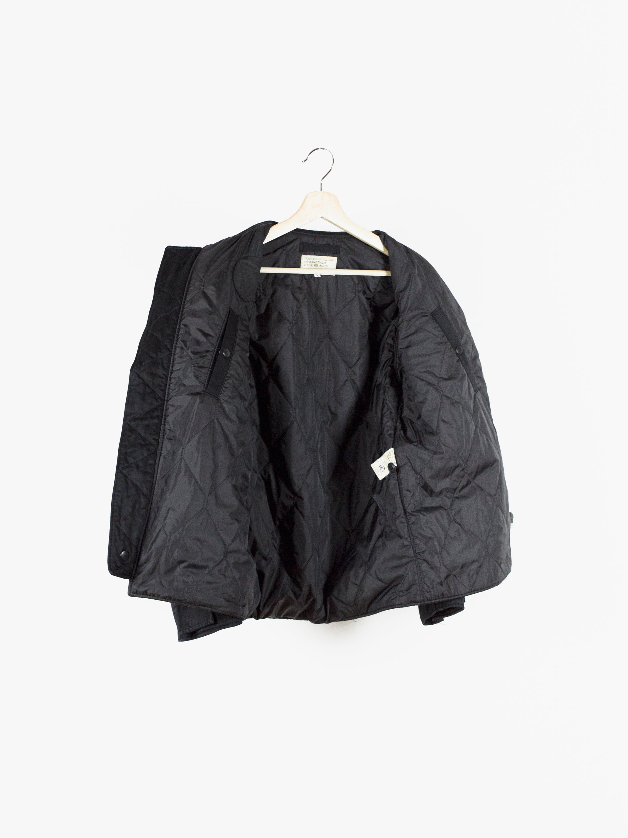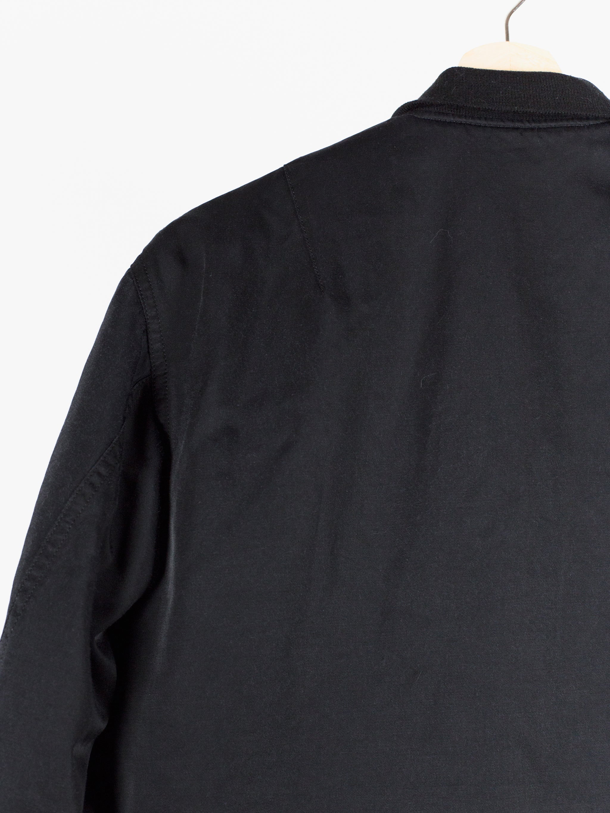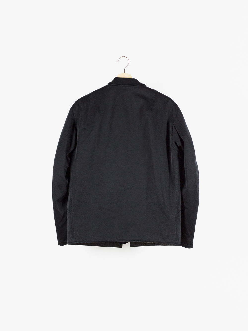 Kobayashi Setsumasa's original 'General Research' line founded in 1993 served as a precursor to the contemporary Mountain Research. The label focuses on developing clothing that is utilitarian, functional, and well-equipped for daily life. This black flight jacket encapsulates that ideal with a sleek, streamlined cut featuring a slim body, tailored sleeves. 4 diagonally flap-closed pockets along the front body and asymmetrically placed blank velcro patches nod to military flight jackets. Thick banded velcro cuffs and a dropped inner zip placket seal out the wind and a quilted polyester batting interior keeps the wearer warm without bulk. The concise feature set is visually interesting yet perfectly usable while the cotton-rayon blend face fabric lends a soft and supple hand. All the elements come together as a no-nonsense, versatile, yet sharp piece of outerwear that is a pleasure to wear.