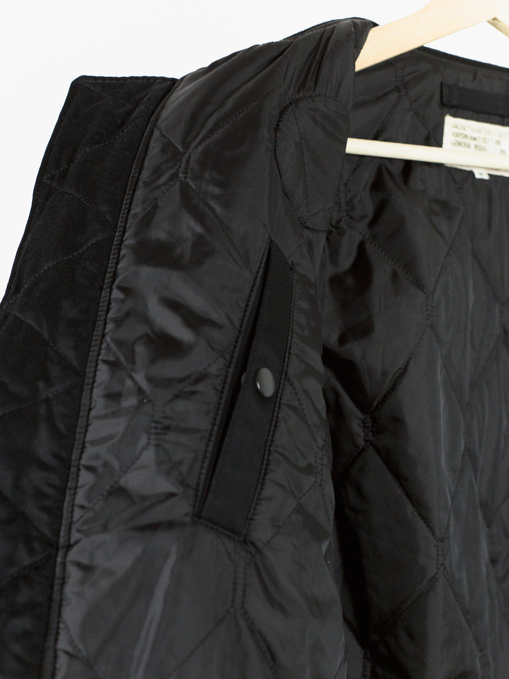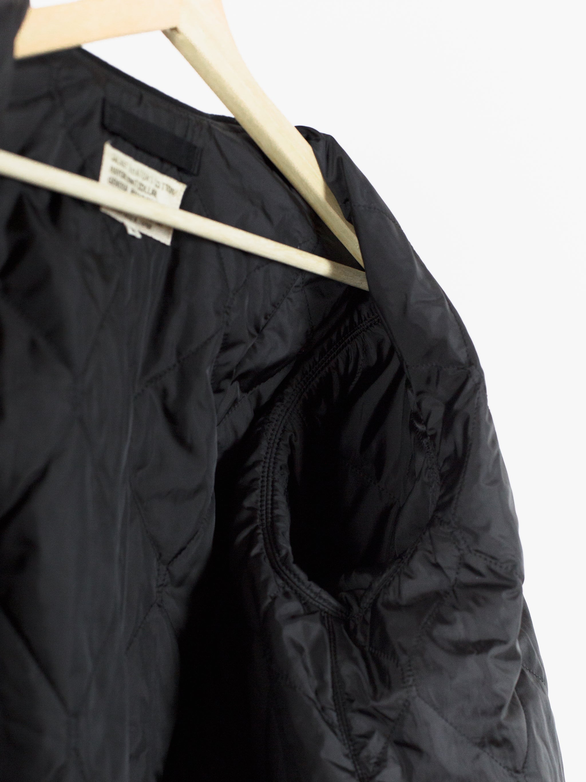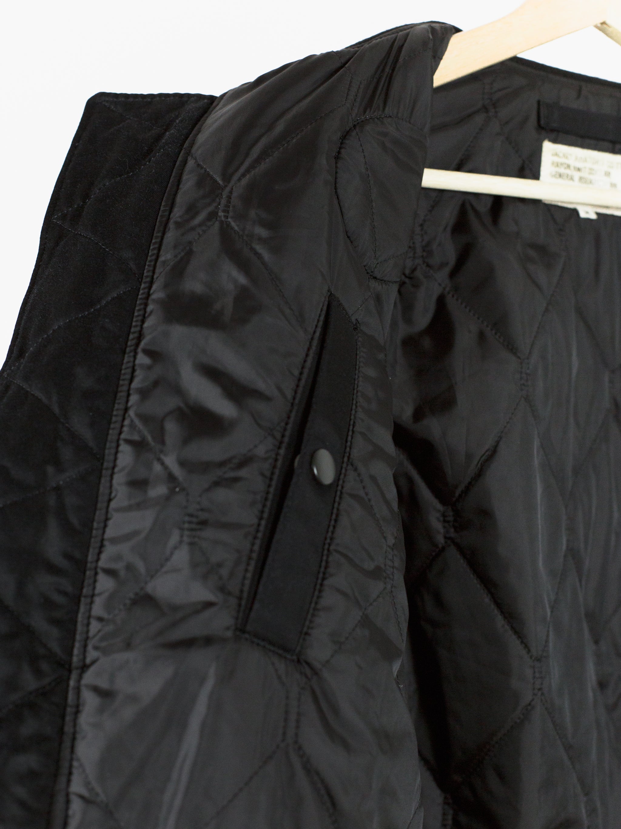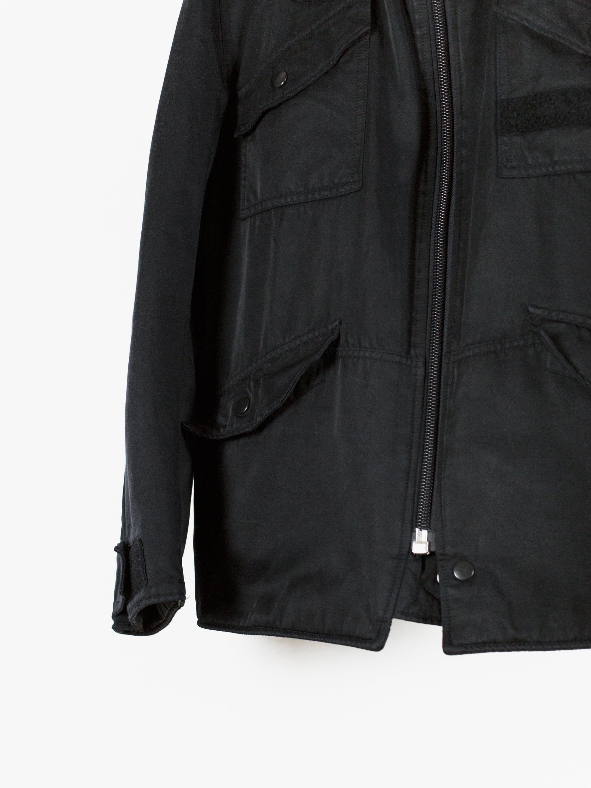 Kobayashi Setsumasa's original 'General Research' line founded in 1993 served as a precursor to the contemporary Mountain Research. The label focuses on developing clothing that is utilitarian, functional, and well-equipped for daily life. This black flight jacket encapsulates that ideal with a sleek, streamlined cut featuring a slim body, tailored sleeves. 4 diagonally flap-closed pockets along the front body and asymmetrically placed blank velcro patches nod to military flight jackets. Thick banded velcro cuffs and a dropped inner zip placket seal out the wind and a quilted polyester batting interior keeps the wearer warm without bulk. The concise feature set is visually interesting yet perfectly usable while the cotton-rayon blend face fabric lends a soft and supple hand. All the elements come together as a no-nonsense, versatile, yet sharp piece of outerwear that is a pleasure to wear.