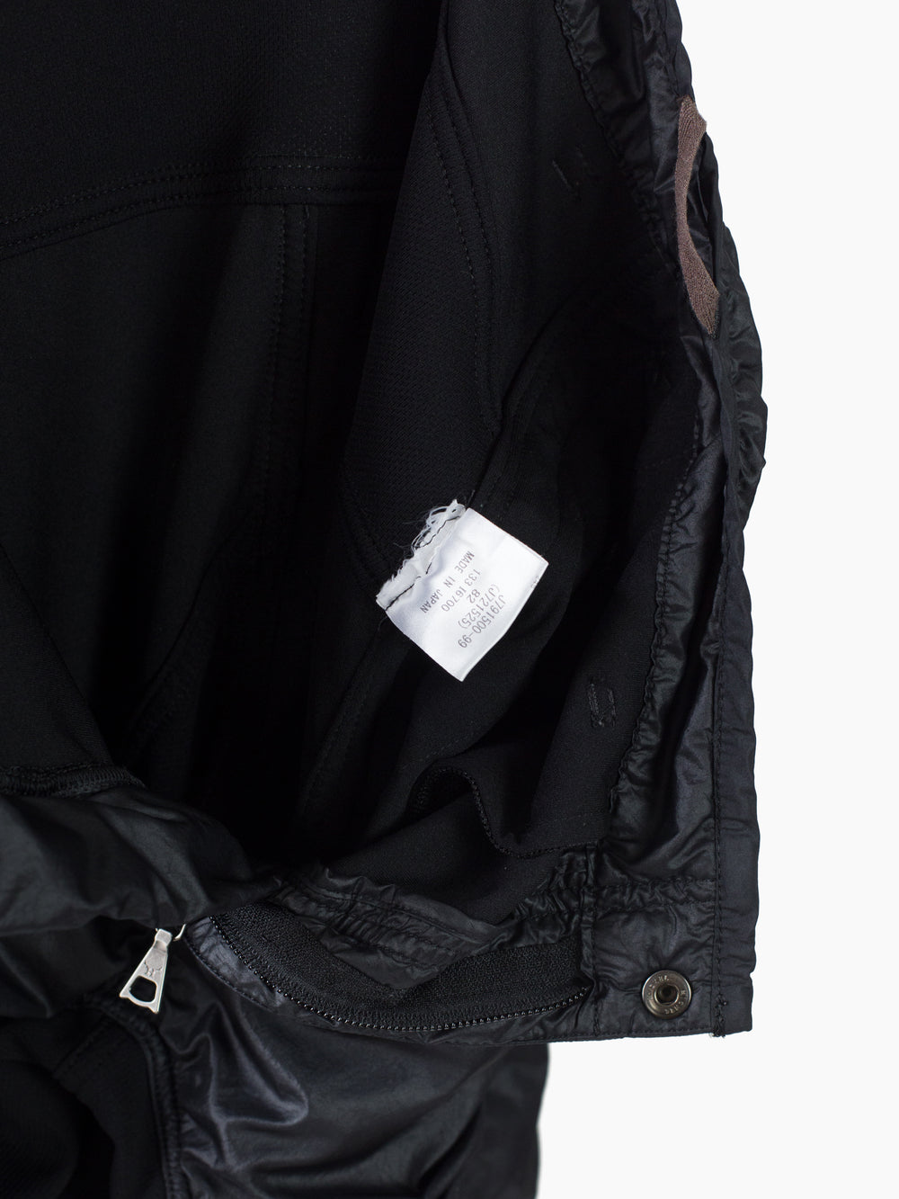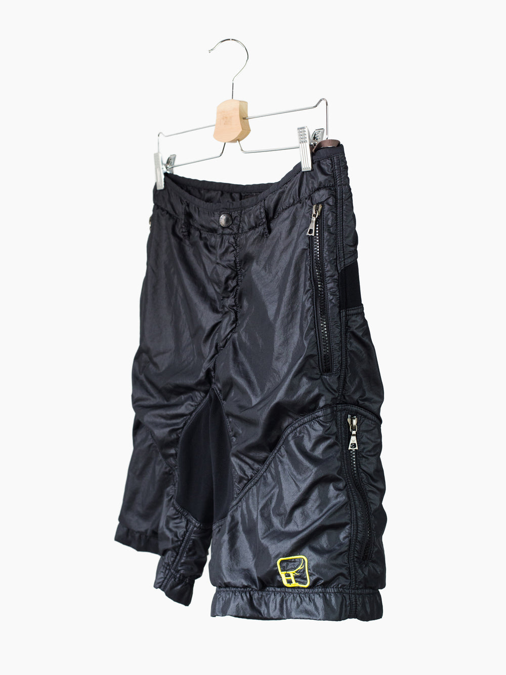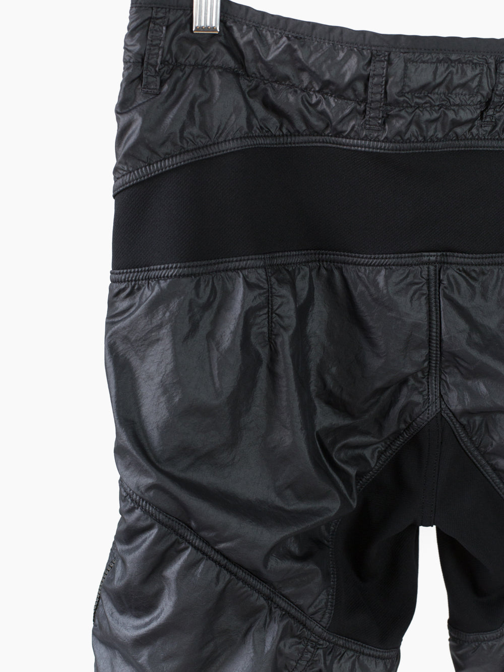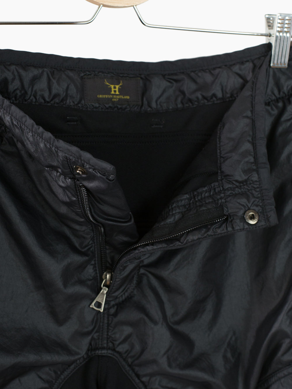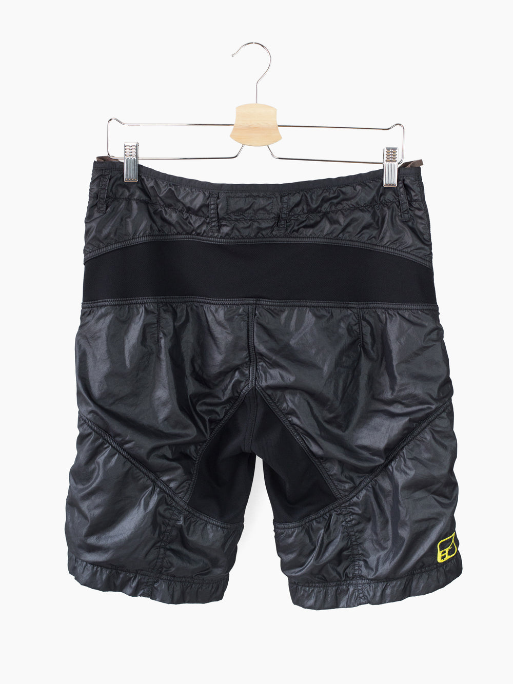 Coated polyester shorts with inset mesh panels at crotch and yoke, drawing from motorcycle gear for its flexibility, and zoned ventilation. Features two waist pockets and single rear-facing side thigh cargo pocket at wearer's left, all outfitted with custom Griffin branded YKK zippers. Two bold hits of electric yellow Hartland insignia embroidery decorate the lateral legs, alternating front and back. All coated poly panels are lined in a technical stretch doubleweave for enhanced next-to-skin comfort and structure.