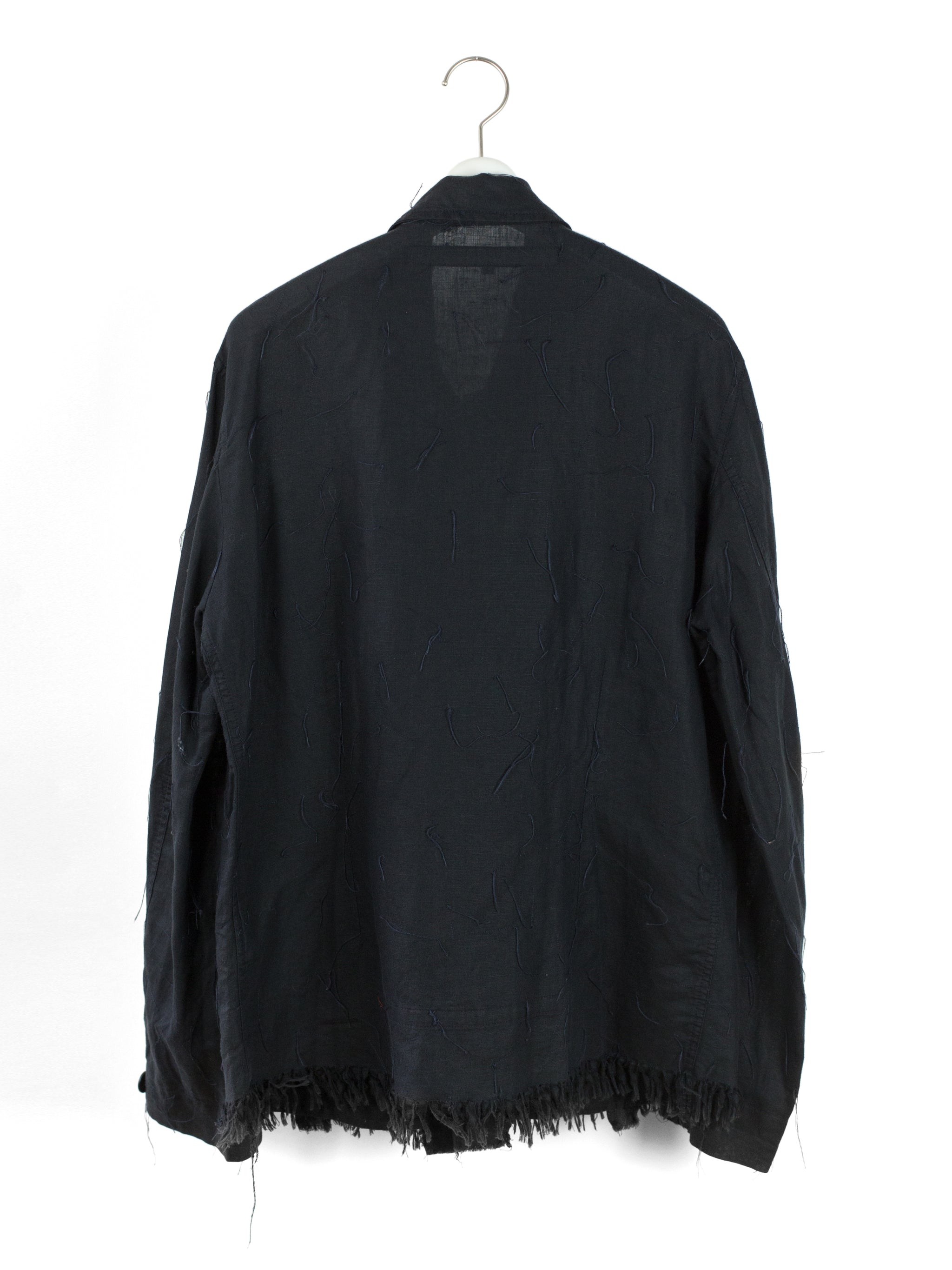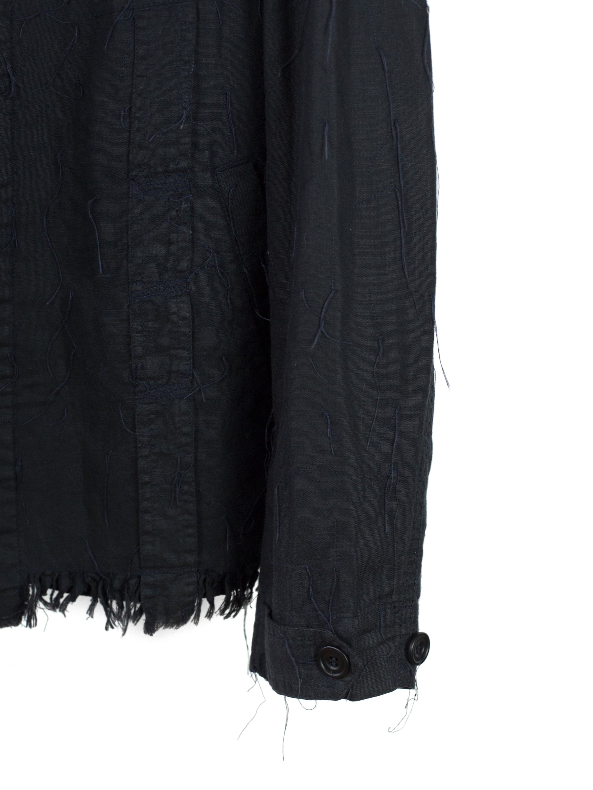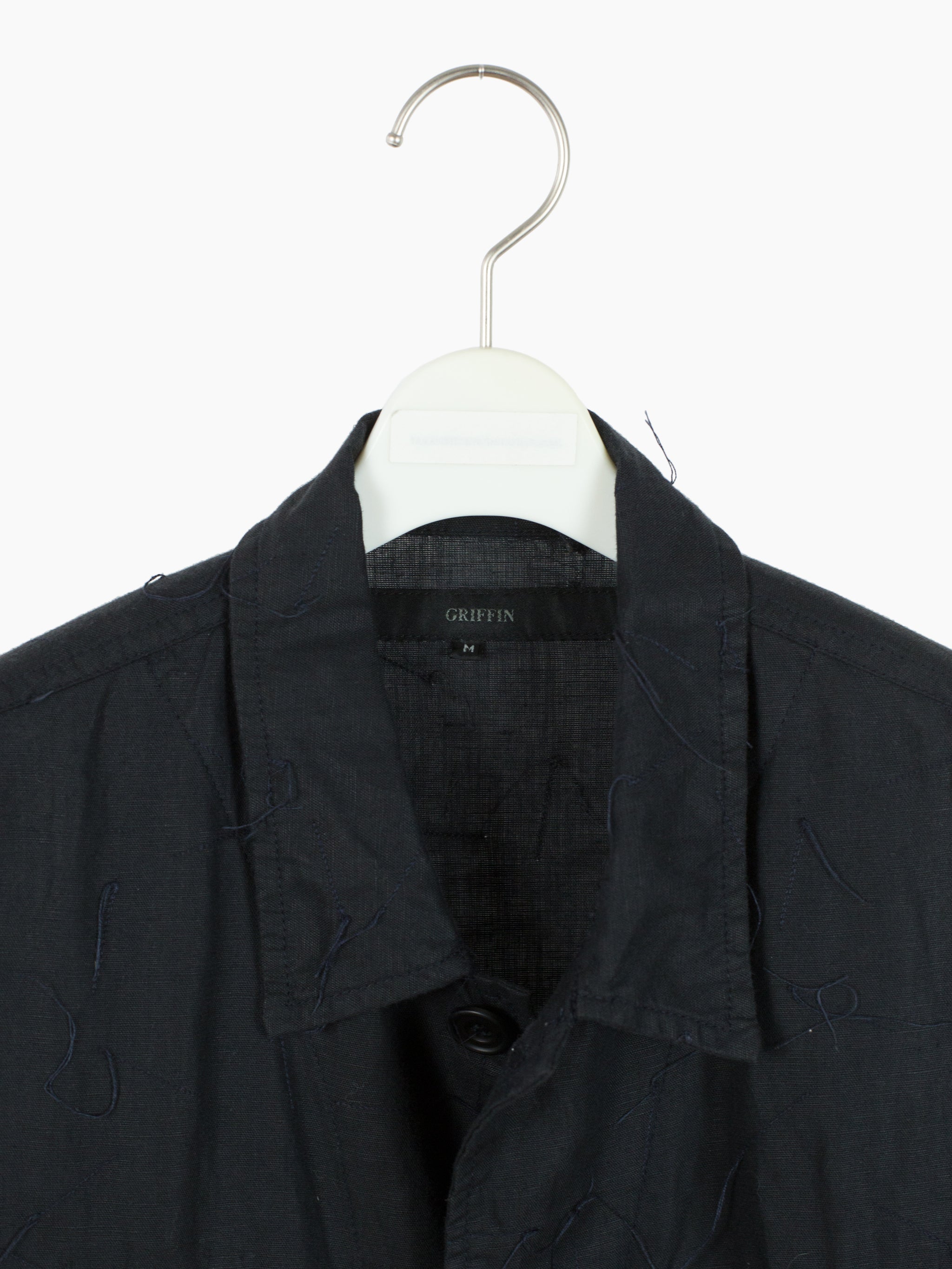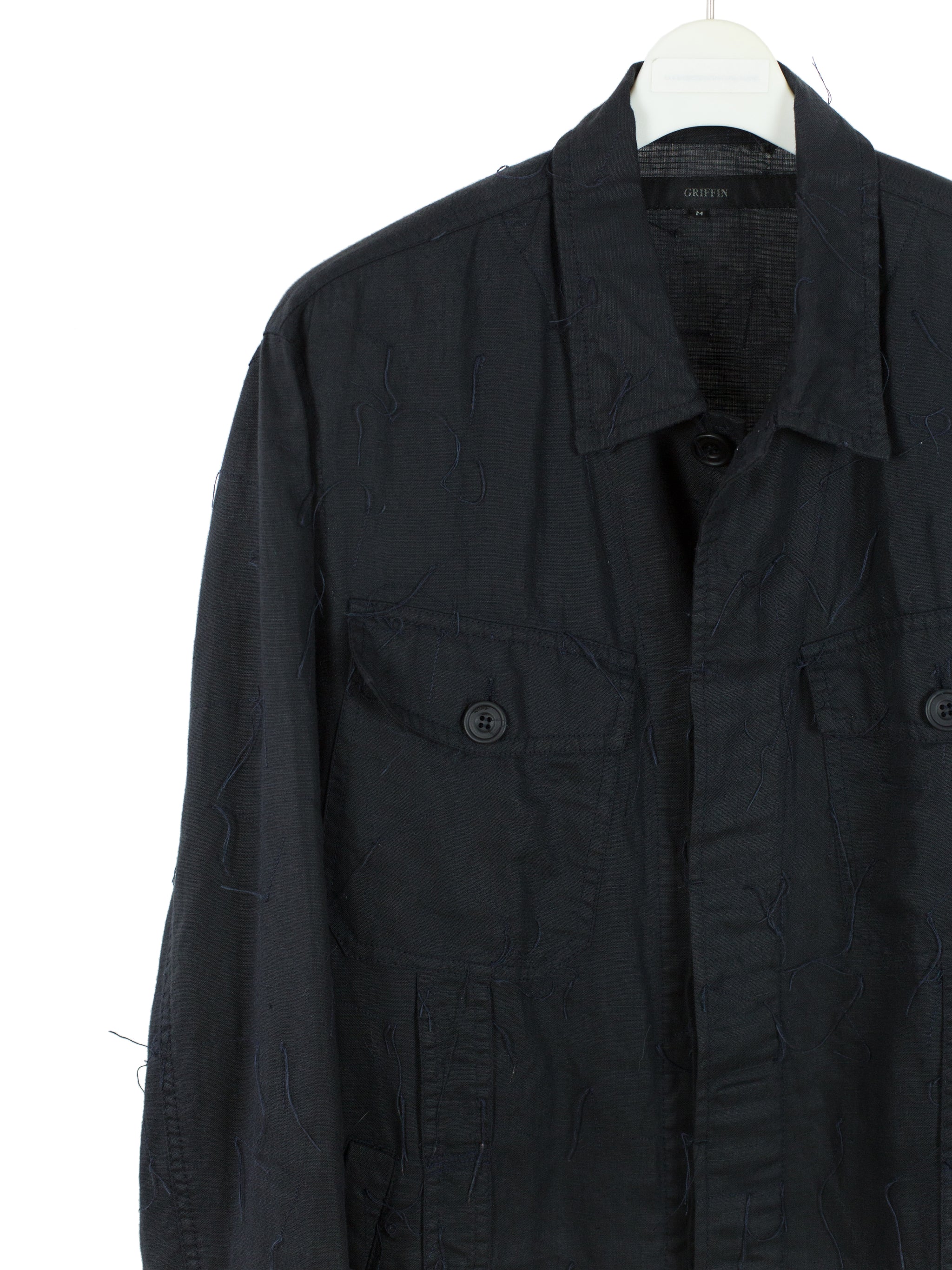 Denim-style shirt jacket from Griffin, featuring a fringed, cutoff hem and a dimensional textile that is adorned with trailing stitching. Hidden center placket brings a cleanliness that drives focus to the texture, framed with two parallel bands in lieu of a Type III trucker's front v-stitched panelling. These bands are stitched with open loops, becoming sites for stylistic intervention--places to hang tassels or keys off of, openings to loop belts through, there are a wealth of possibilities to be discovered by the wearer. Finished with two flap-closed chest pockets, two lower waist welt pockets, and button-closed cuffs.