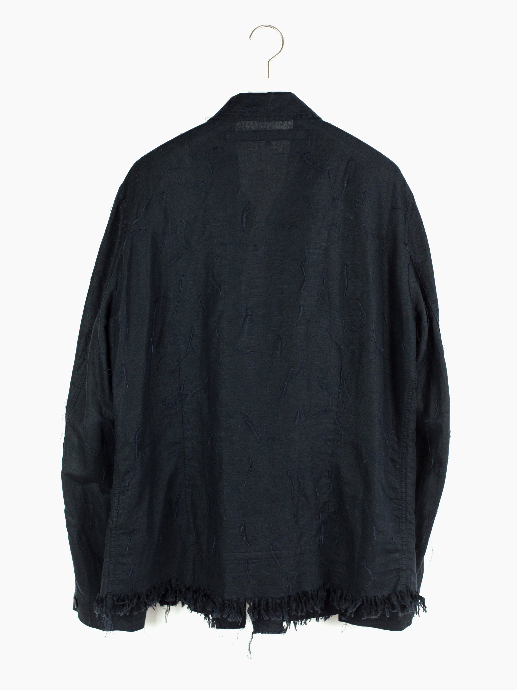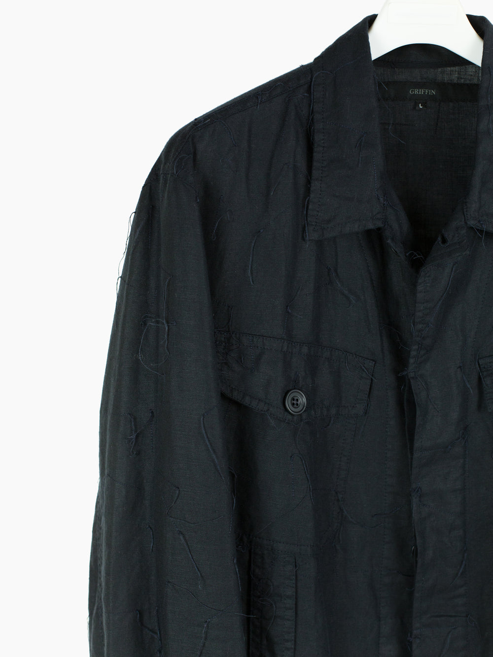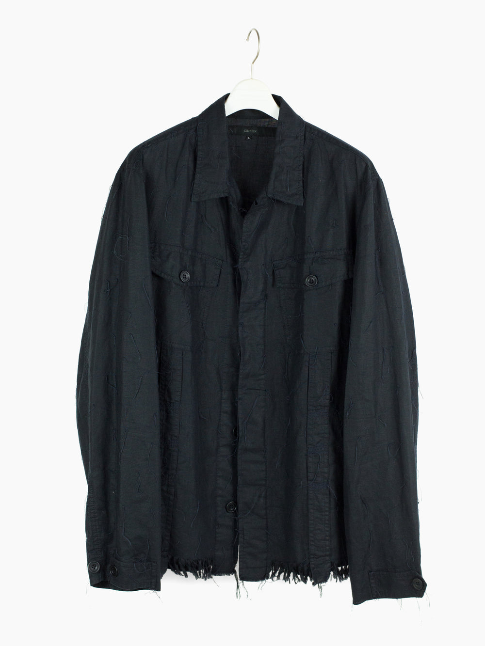 Denim-style shirt jacket from Griffin, featuring a fringed, cutoff hem and a dimensional textile that is adorned with trailing stitching. Hidden center placket brings a cleanliness that drives focus to the texture, framed with two parallel bands in lieu of a Type III trucker's front v-stitched panelling. These bands are stitched with open loops, becoming sites for stylistic intervention--places to hang tassels or keys off of, openings to loop belts through, there are a wealth of possibilities to be discovered by the wearer. Finished with two flap-closed chest pockets, two lower waist welt pockets, and button-closed cuffs.