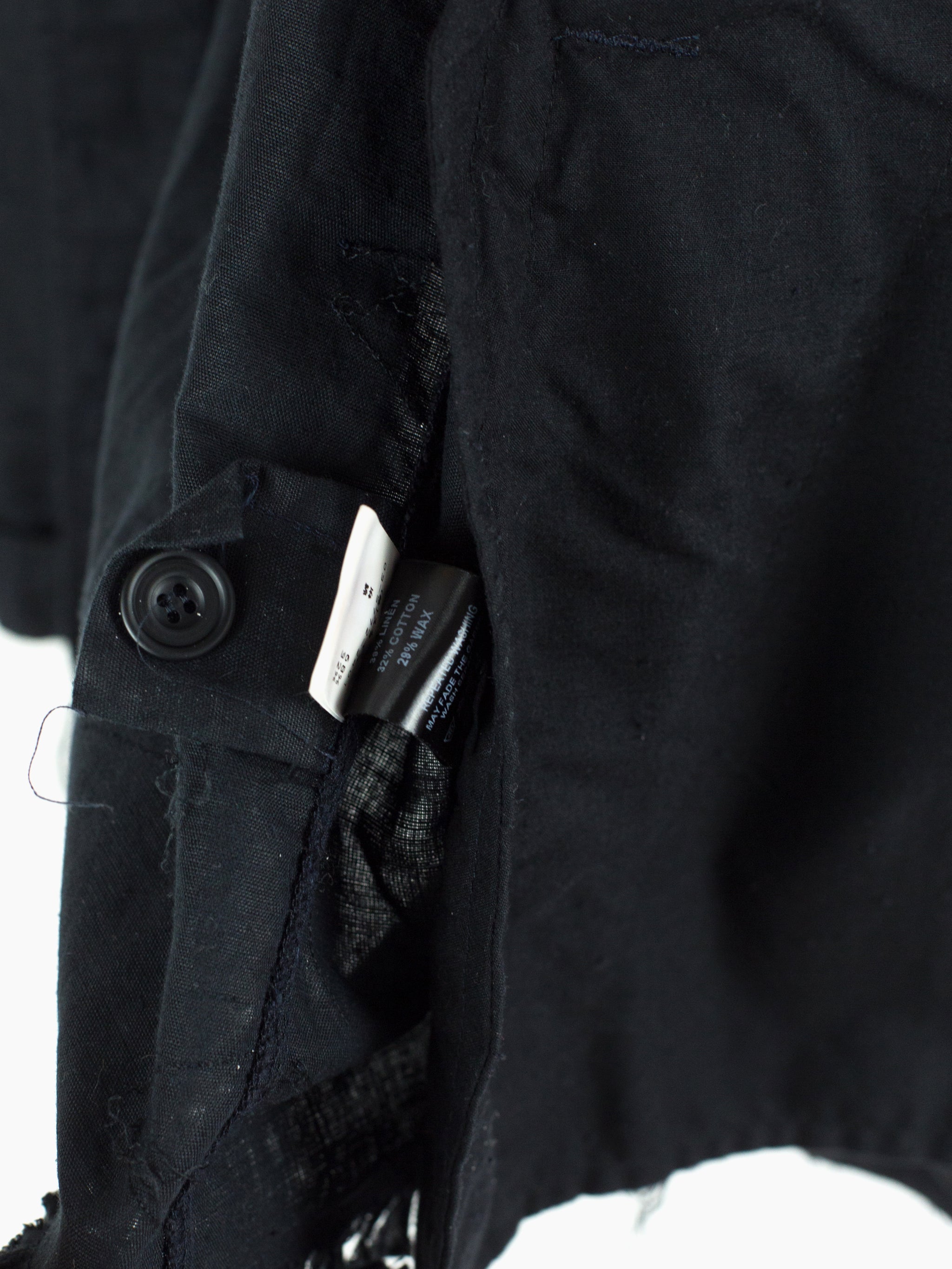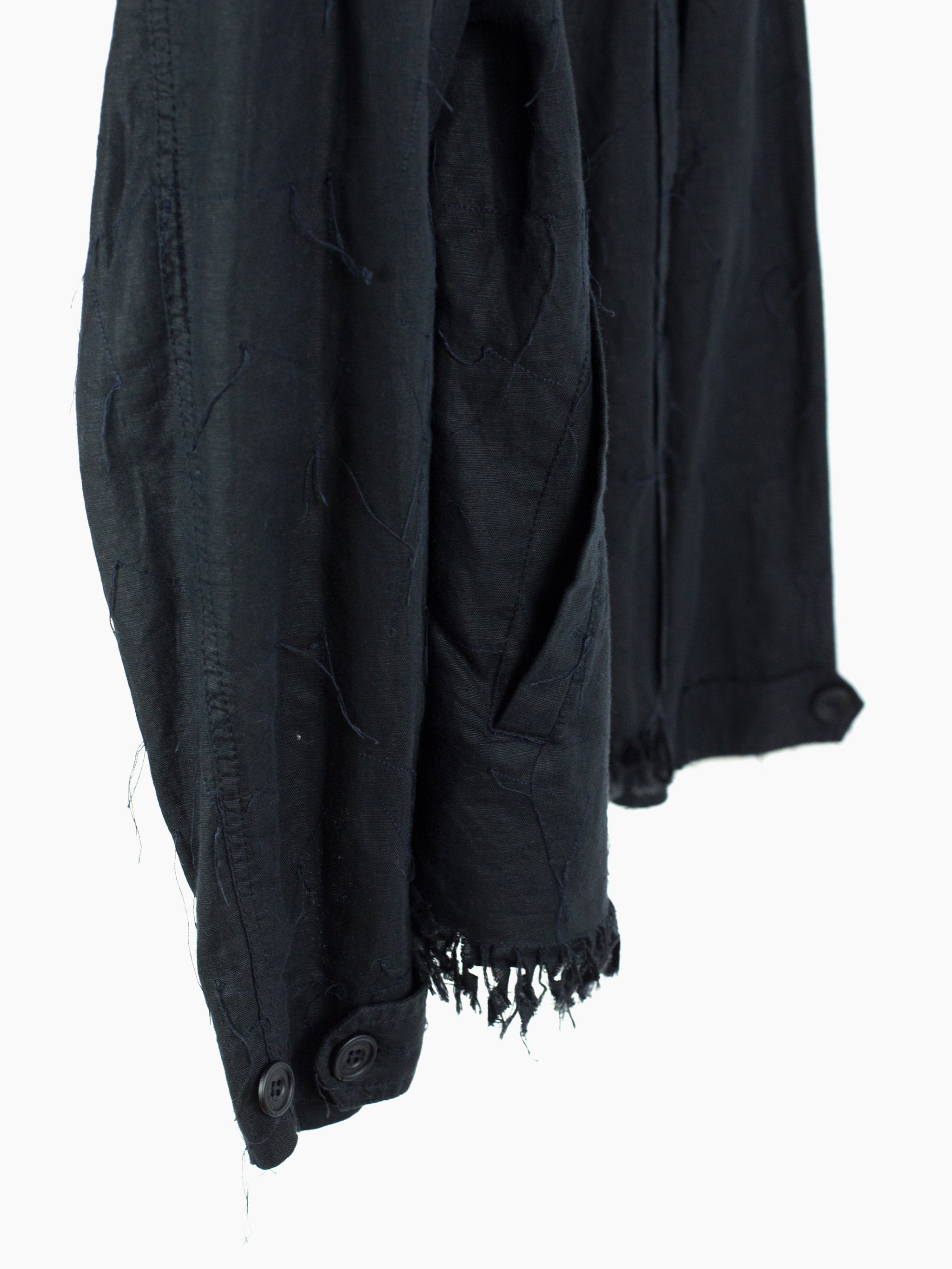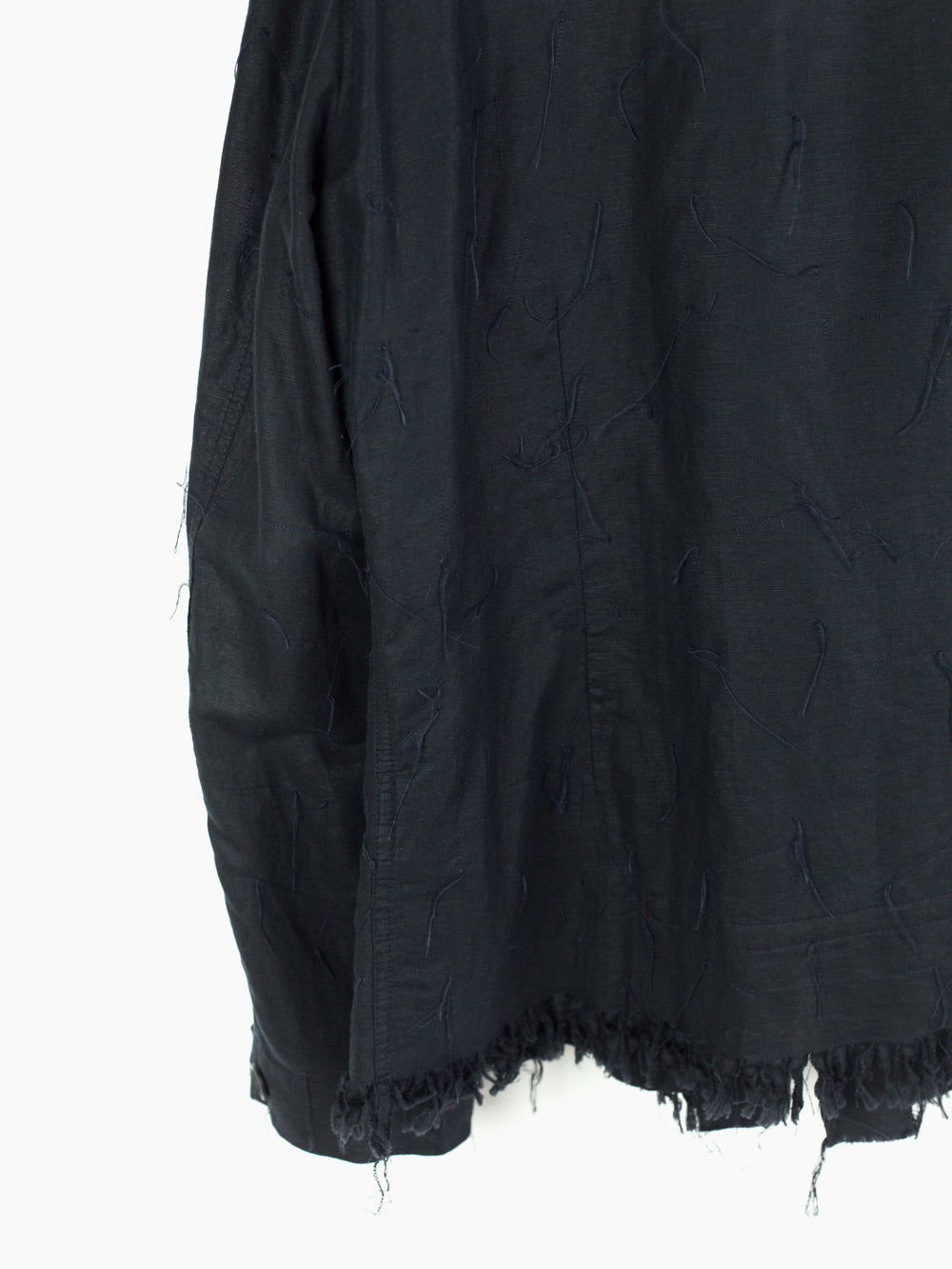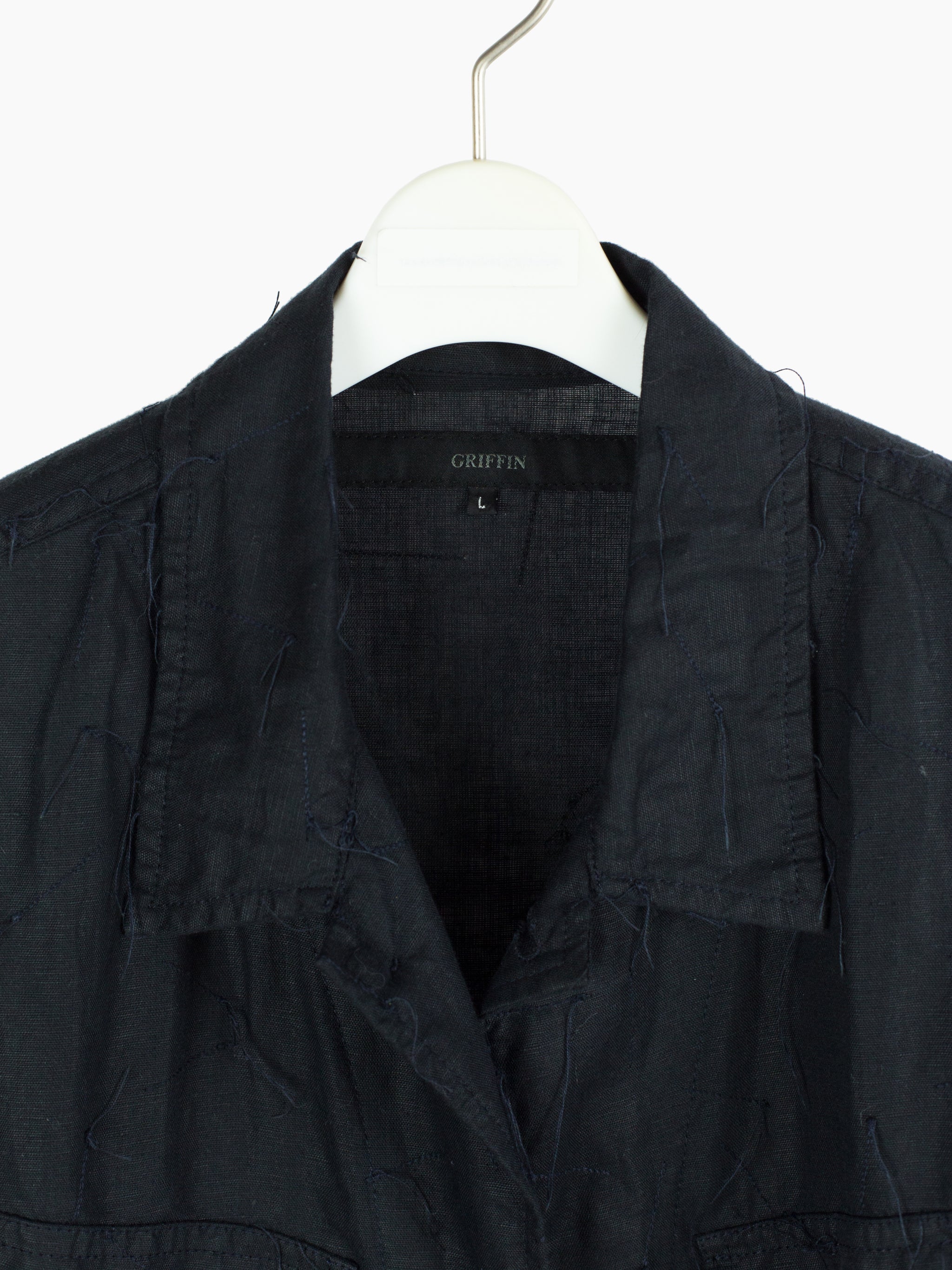 Denim-style shirt jacket from Griffin, featuring a fringed, cutoff hem and a dimensional textile that is adorned with trailing stitching. Hidden center placket brings a cleanliness that drives focus to the texture, framed with two parallel bands in lieu of a Type III trucker's front v-stitched panelling. These bands are stitched with open loops, becoming sites for stylistic intervention--places to hang tassels or keys off of, openings to loop belts through, there are a wealth of possibilities to be discovered by the wearer. Finished with two flap-closed chest pockets, two lower waist welt pockets, and button-closed cuffs.