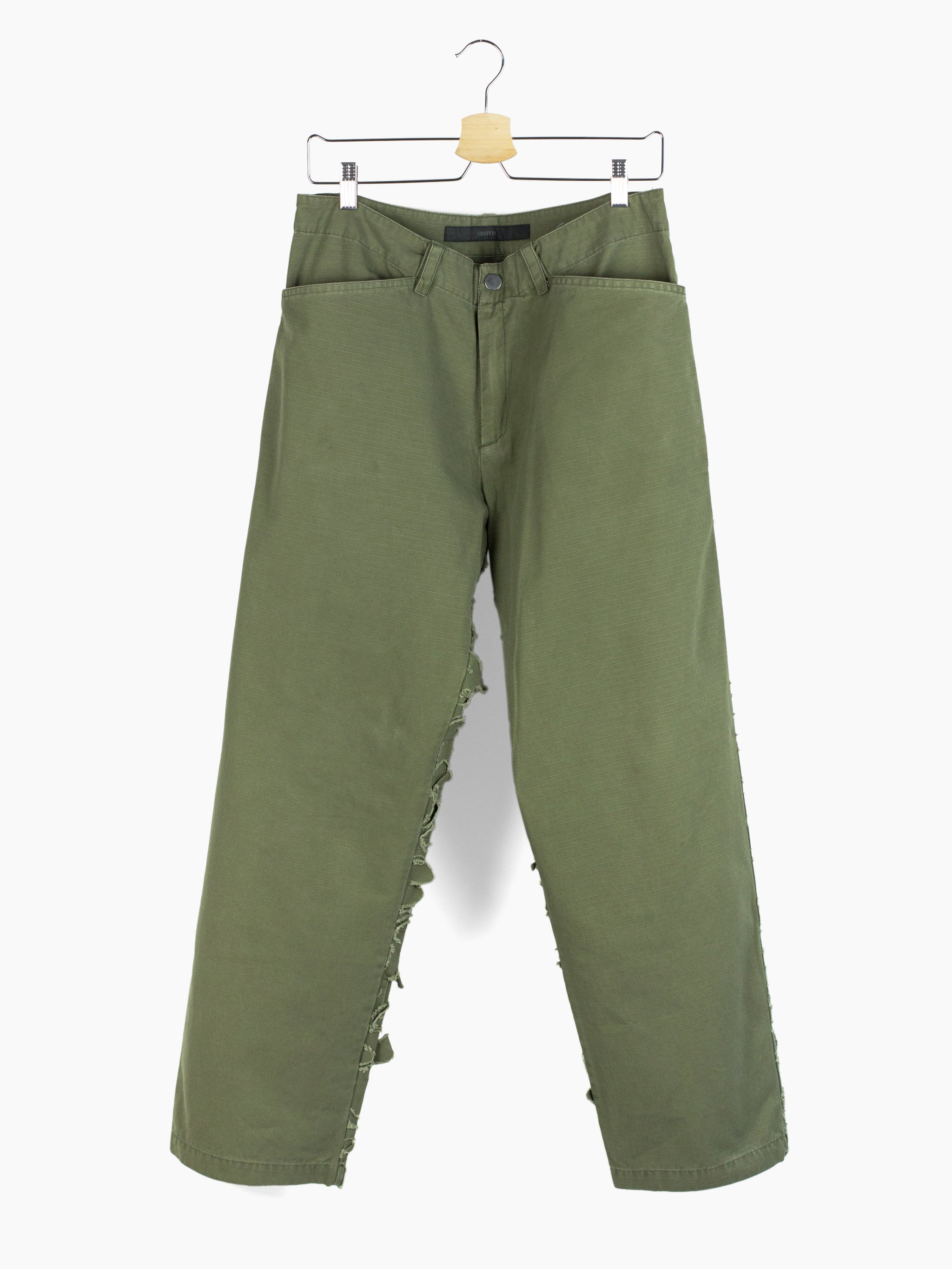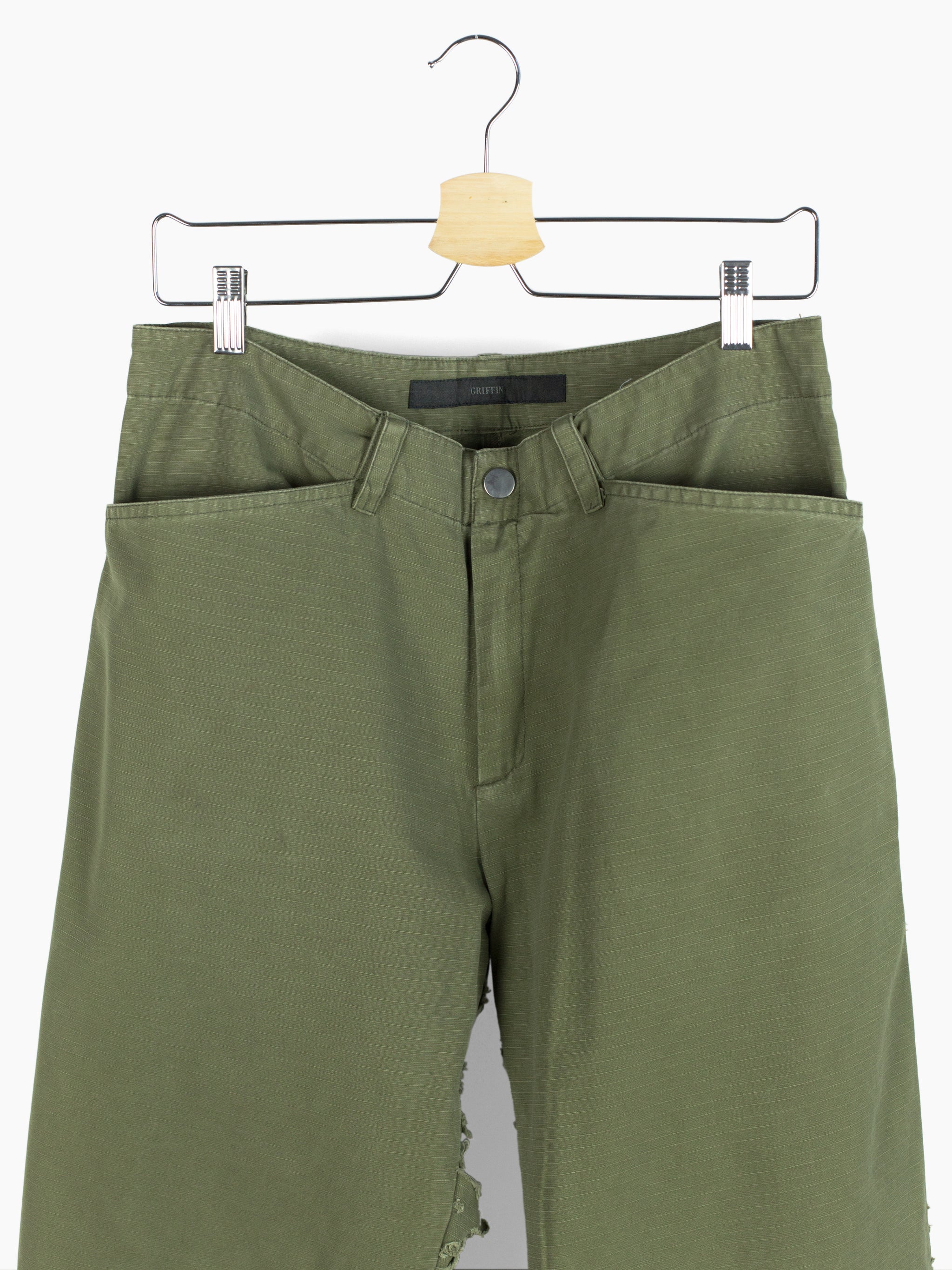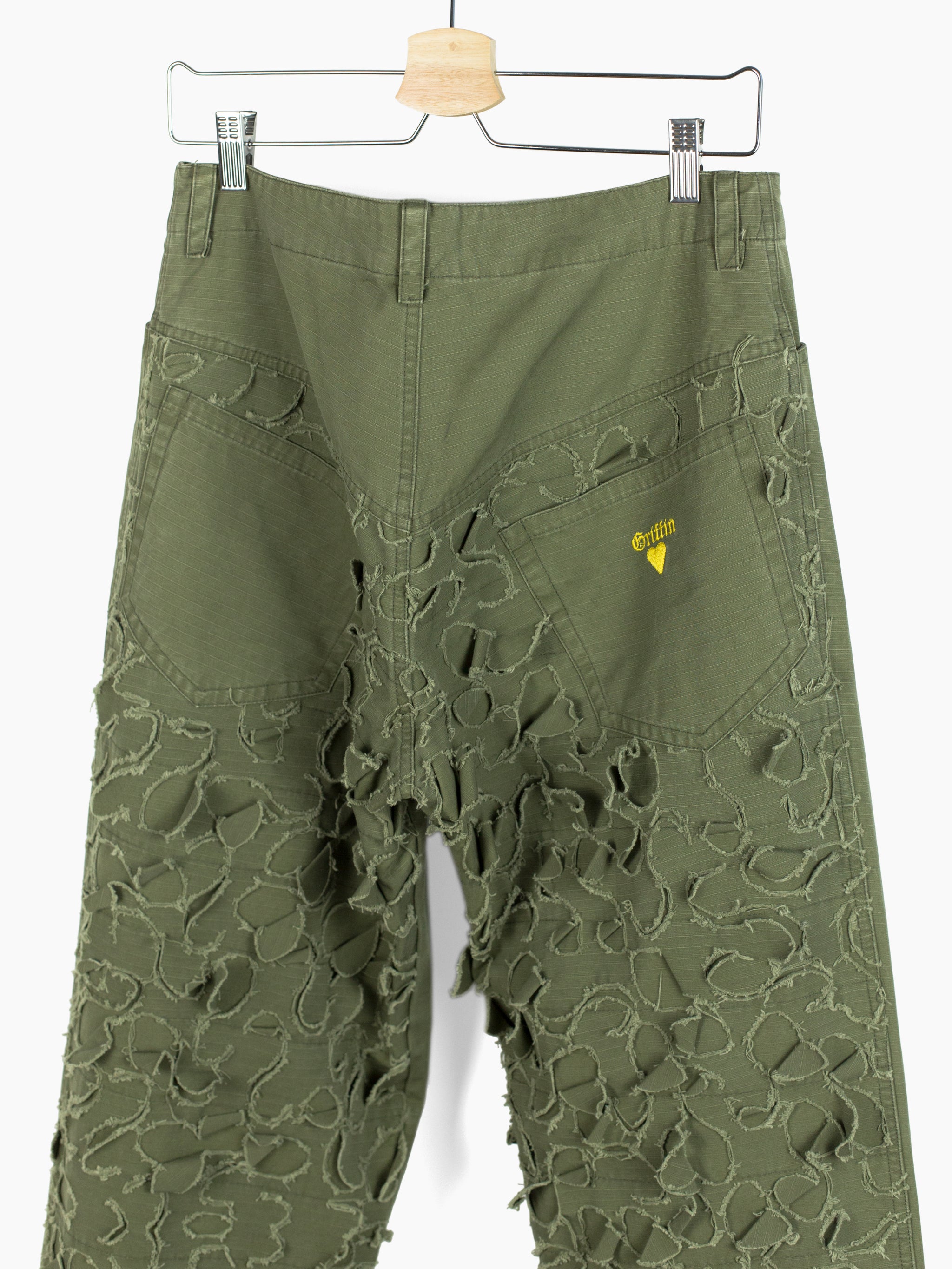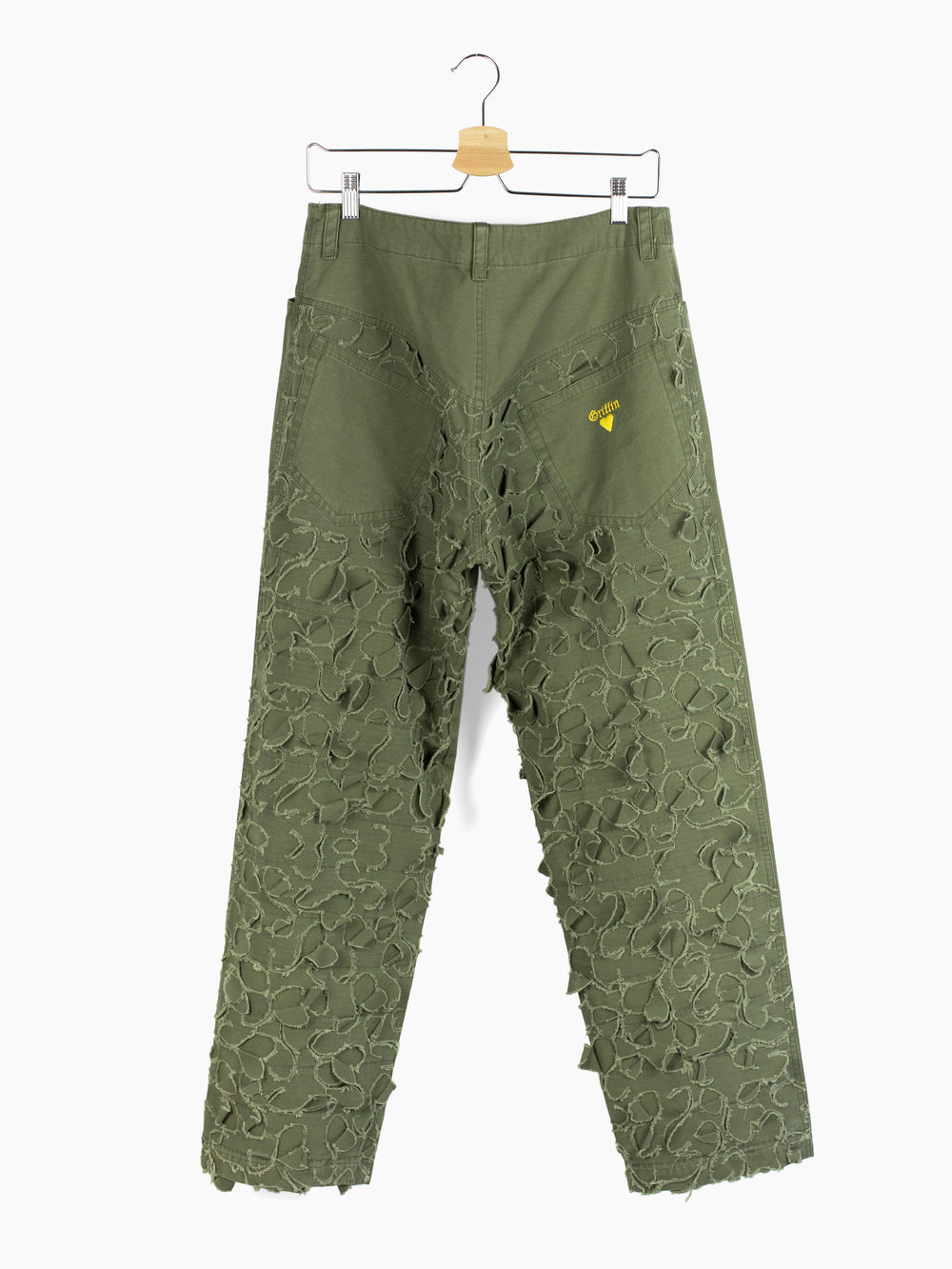 Bladecut Trousers from Griffin, featuring a pared-down jean-style construction in the pockets, yoke, and back patch pockets with a loose, slightly tapered leg. Nearly the whole back of the leg features 3D military die-cut netting stitched onto an additional layer of fabric for opacity and wearability.